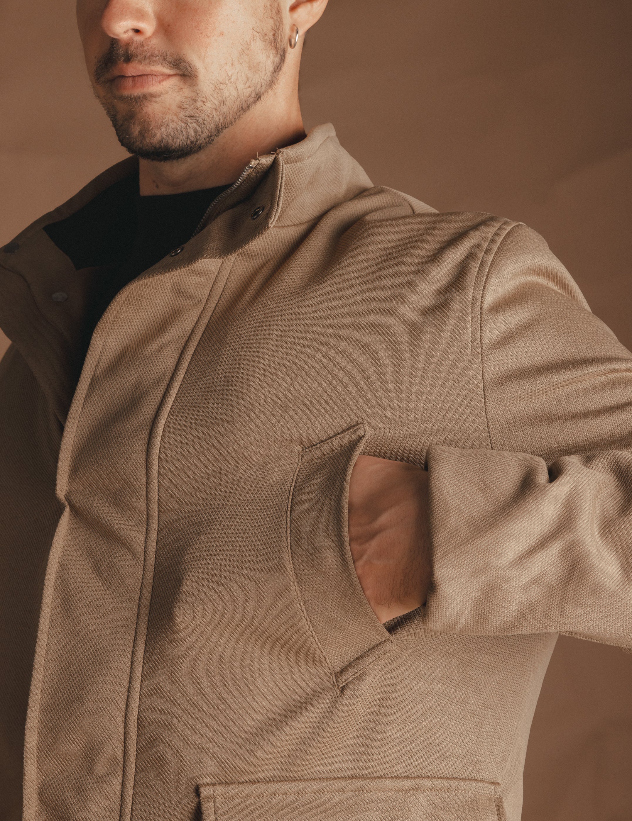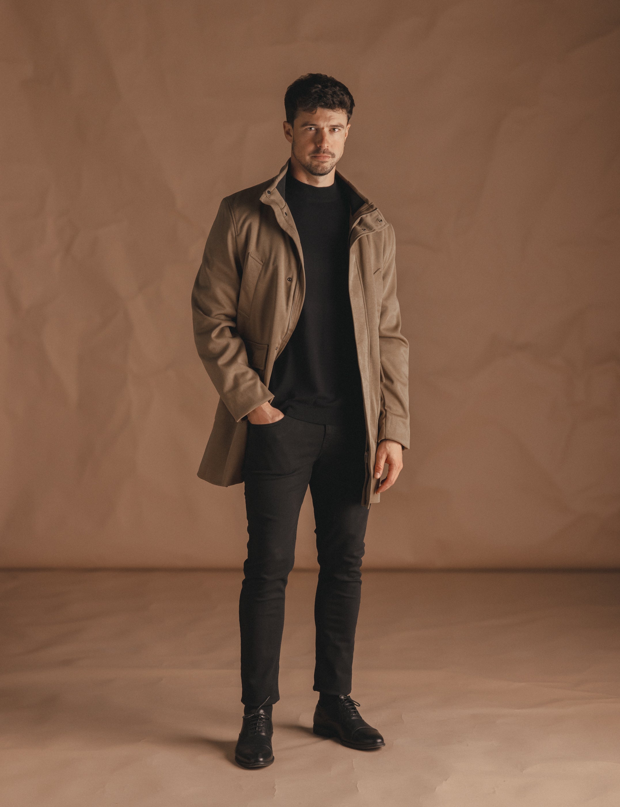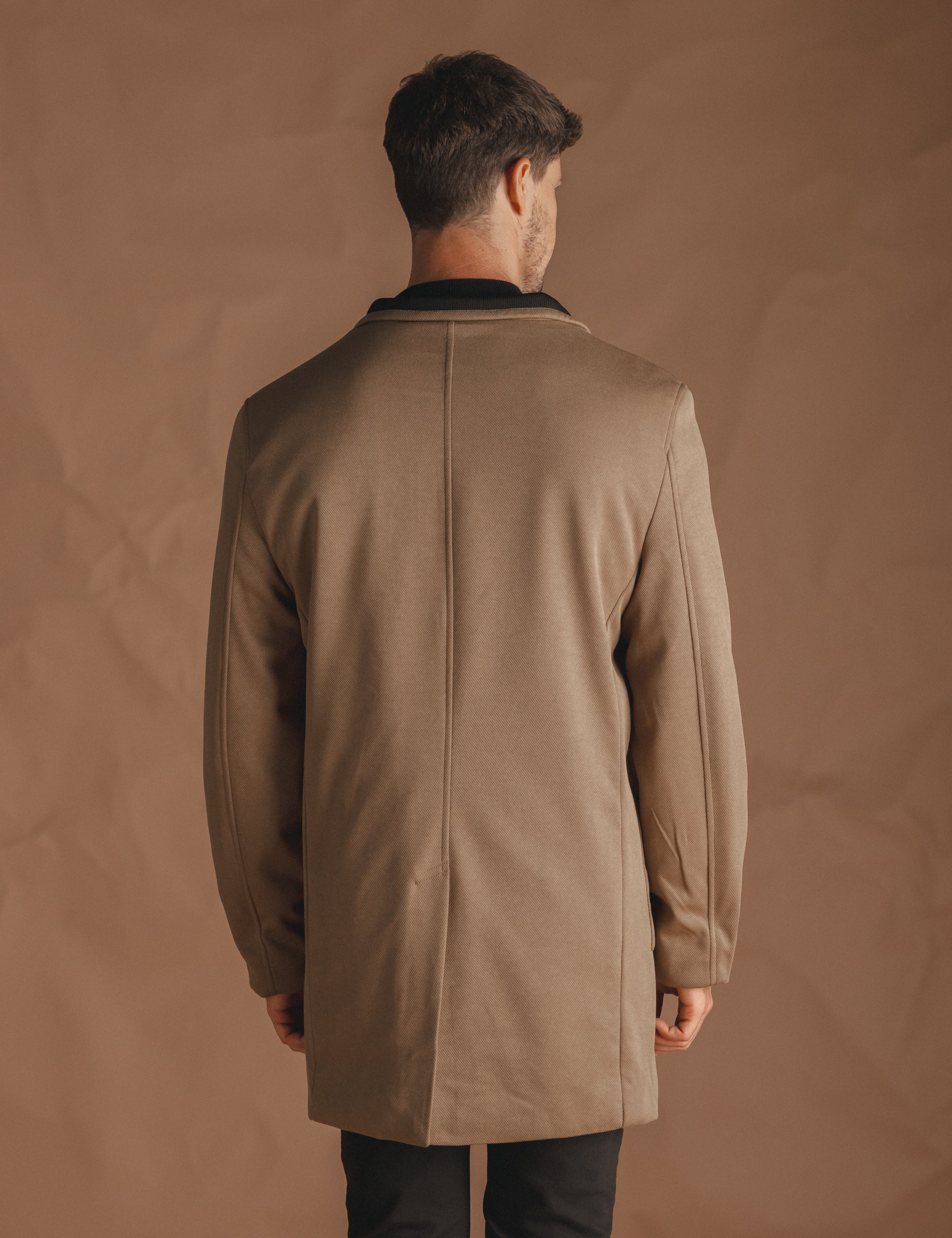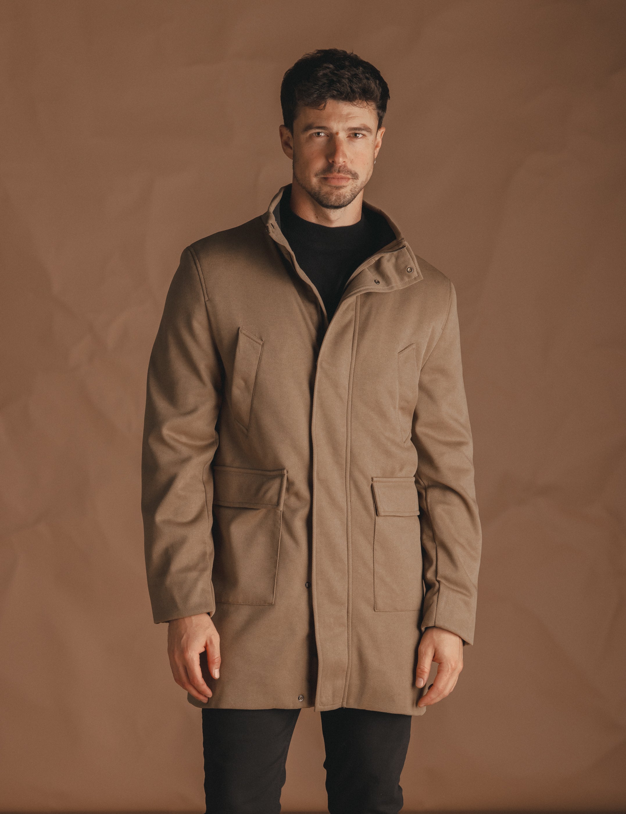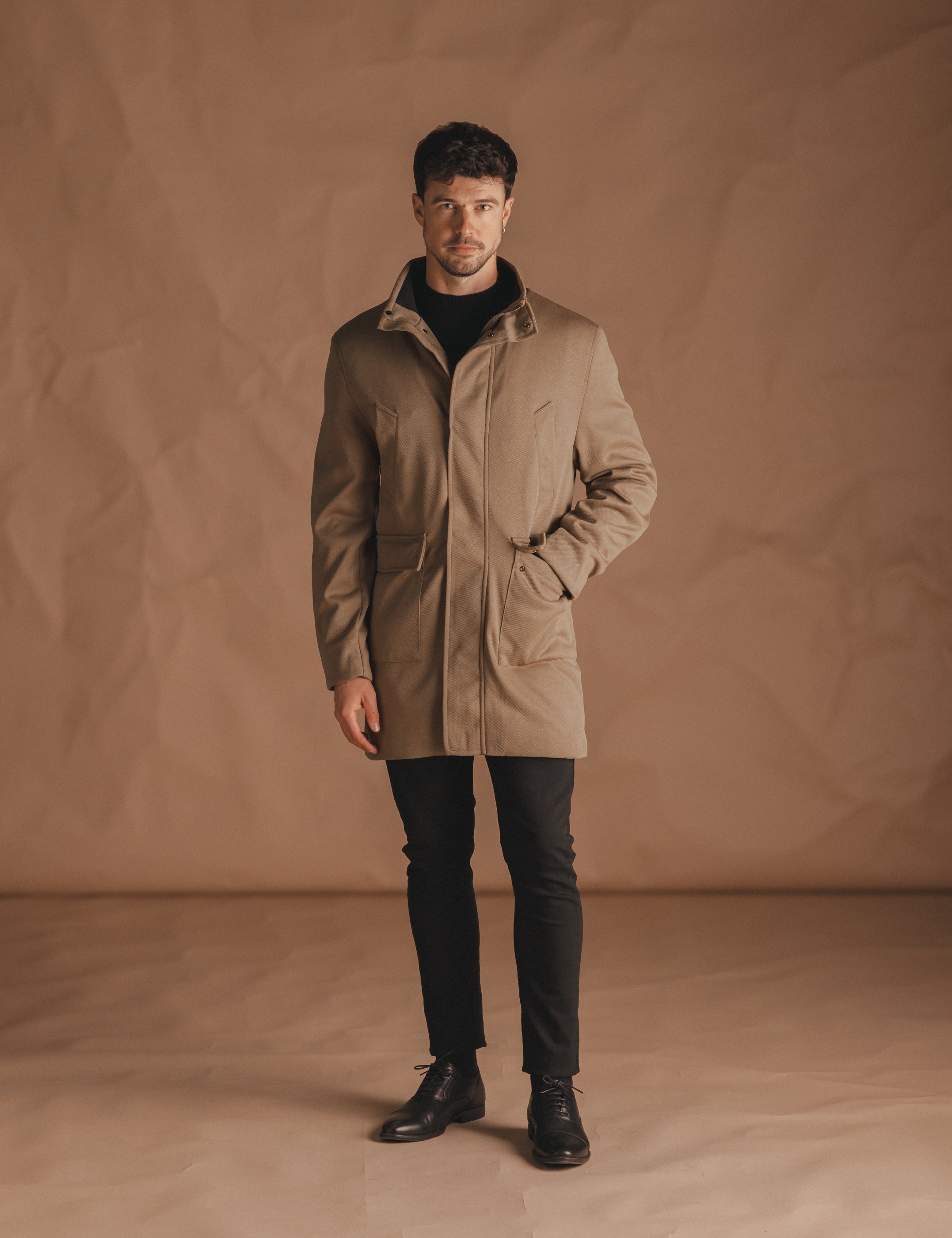 Abrigo cámel para hombre de paño con cuello chimenea. Cierre central mediante cremallera y botones de crochetes, dos bolsillos a la altura de la cintura y uno a la altura del pecho.