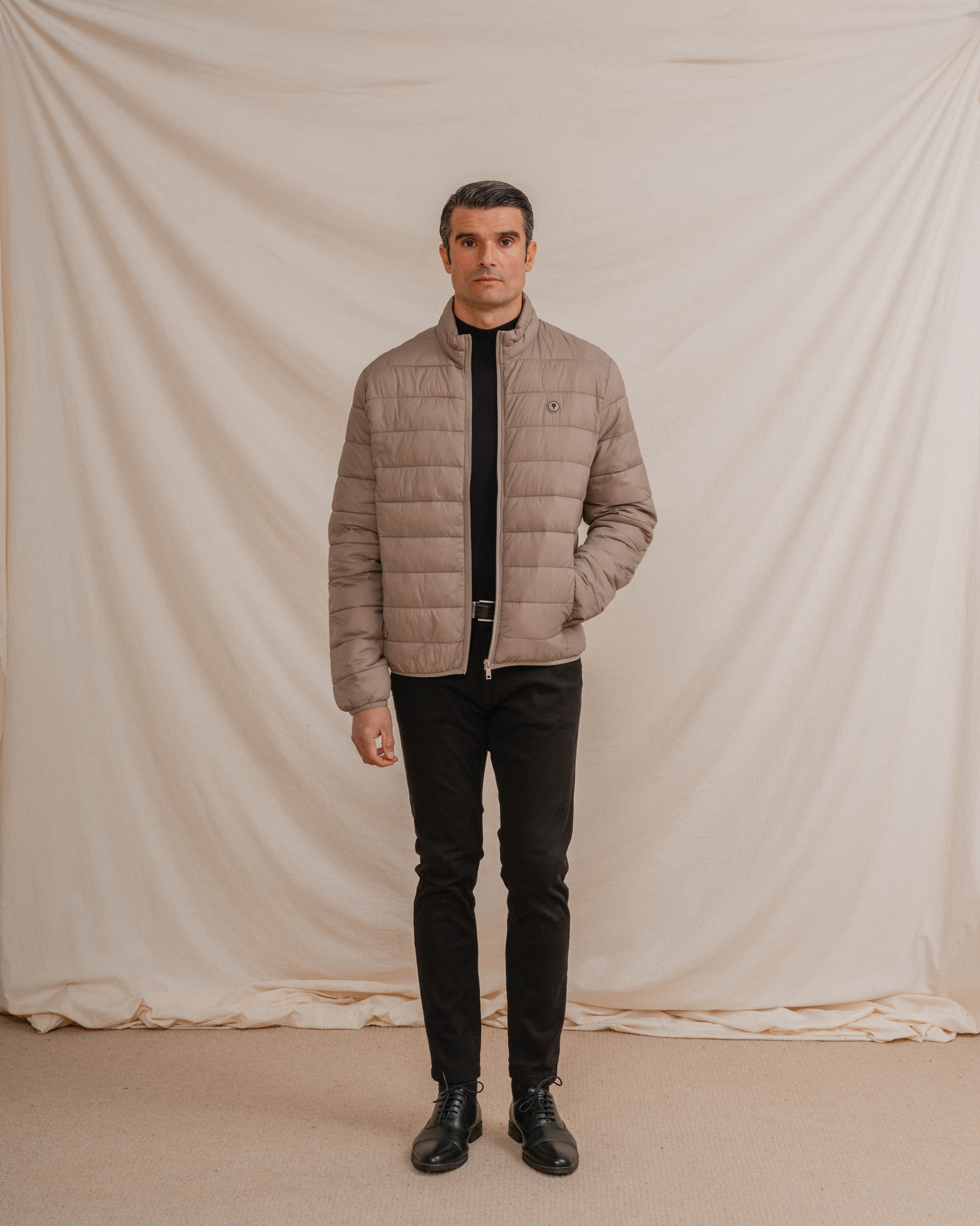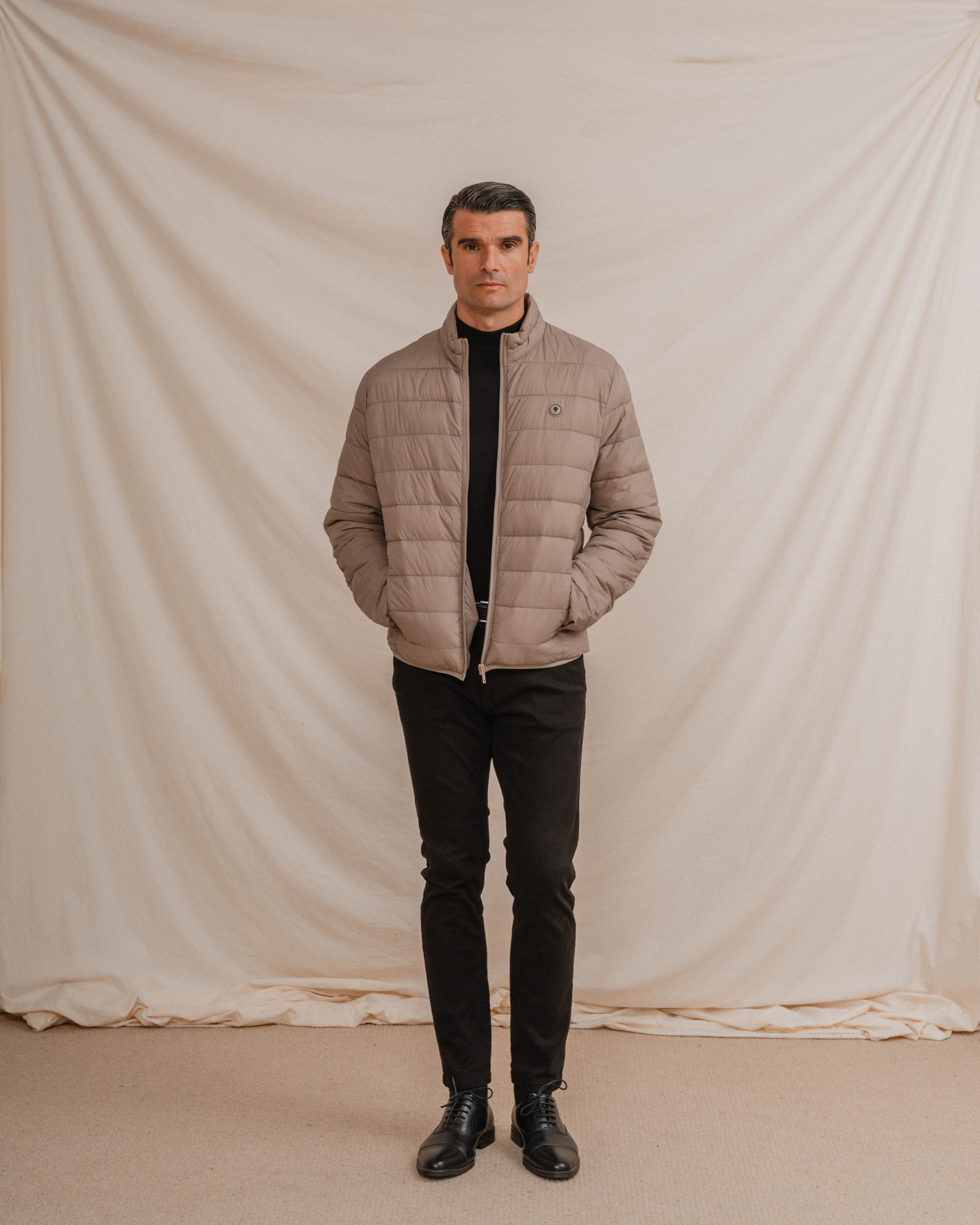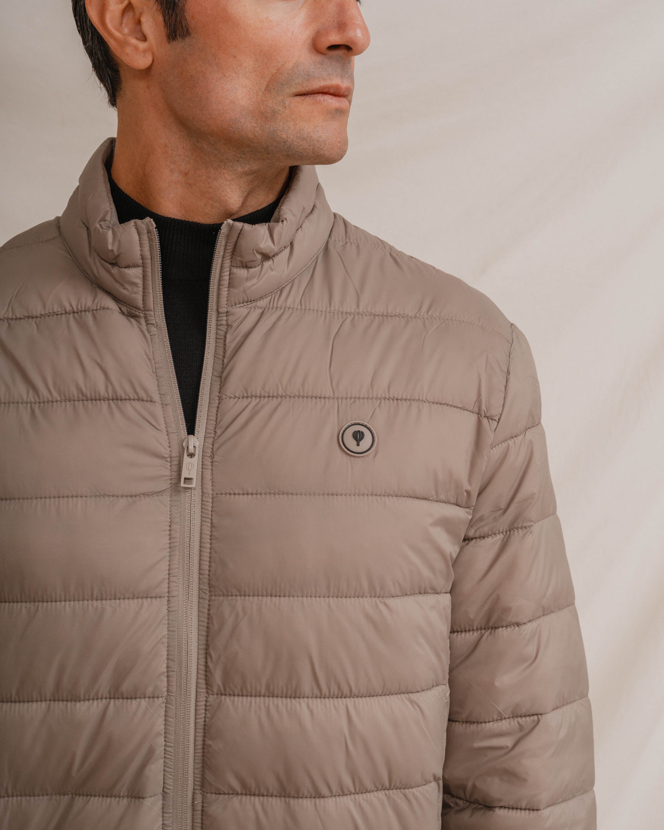 Acolchado para hombre en color beige. Cuello chimenea y cierre central mediante cremallera. Dos bolsillos laterales y logo en la parte frontal a la altura del pecho.