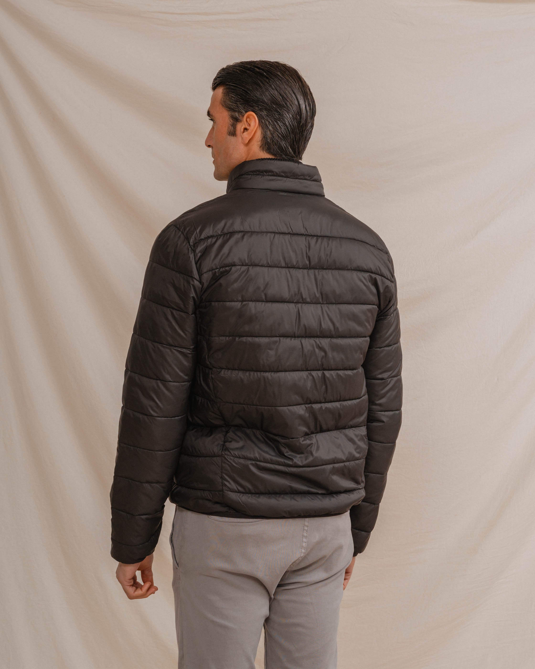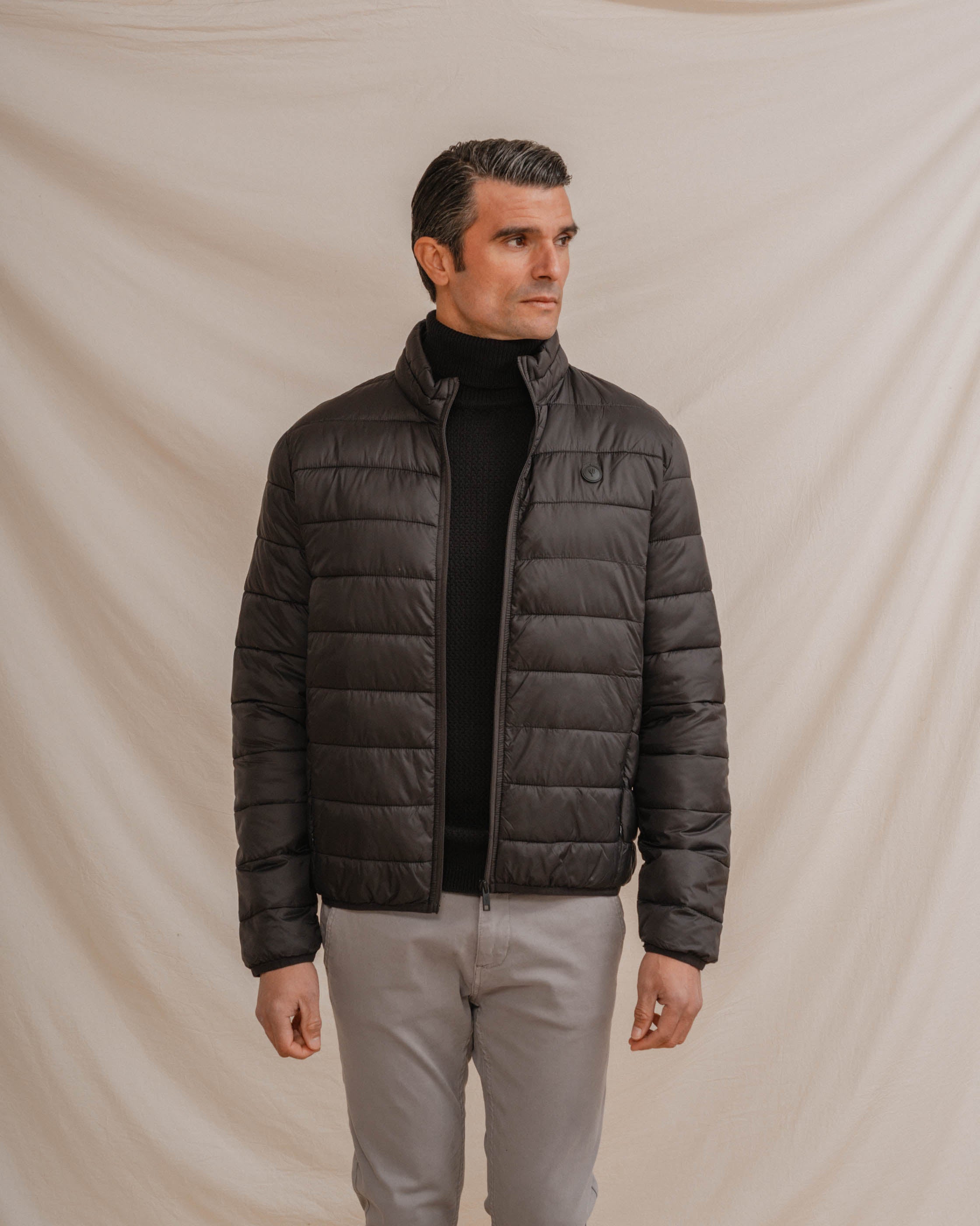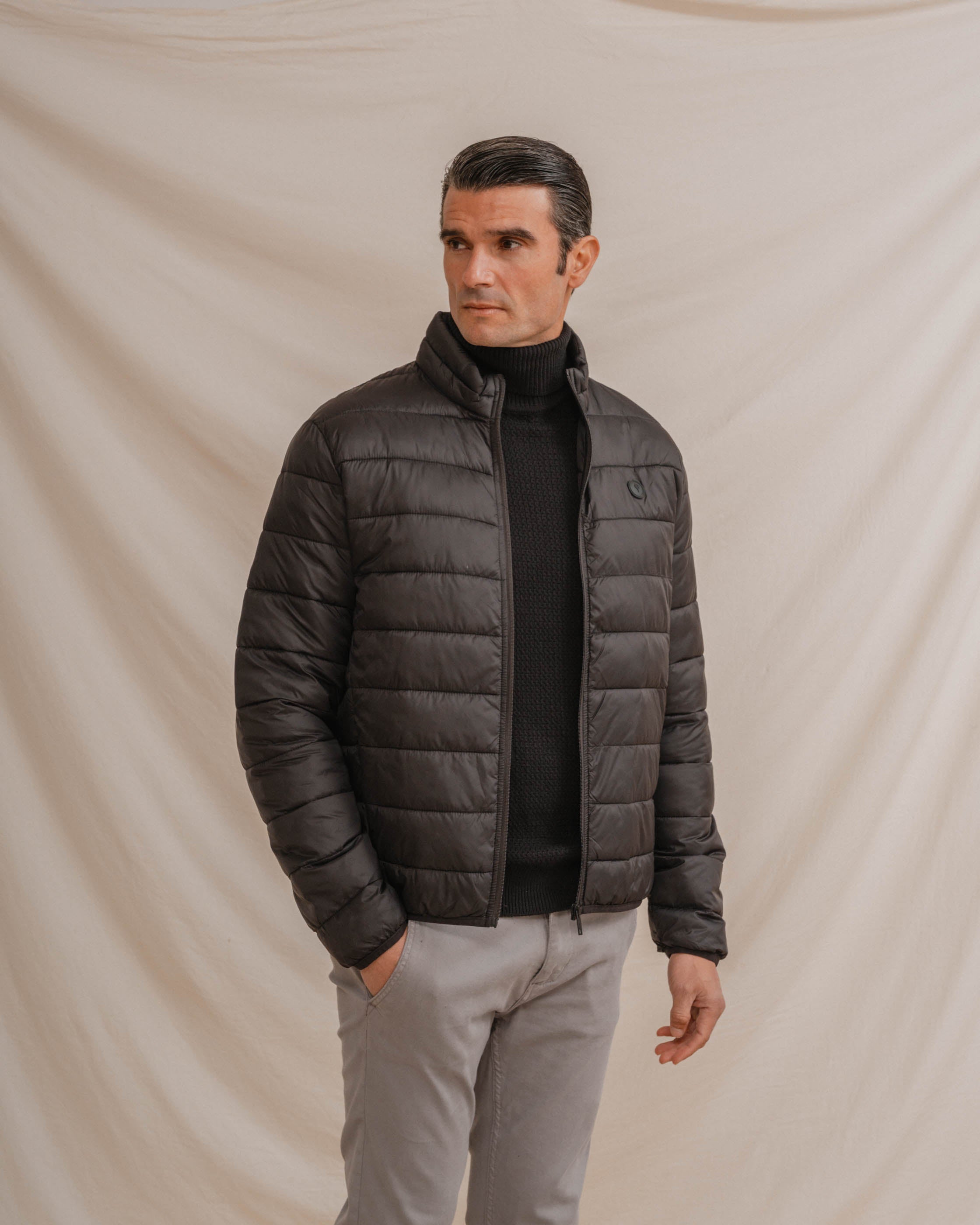 Acolchado para hombre en color negro. Cuello chimenea y cierre central mediante cremallera. Dos bolsillos laterales y logo en la parte frontal a la altura del pecho.
