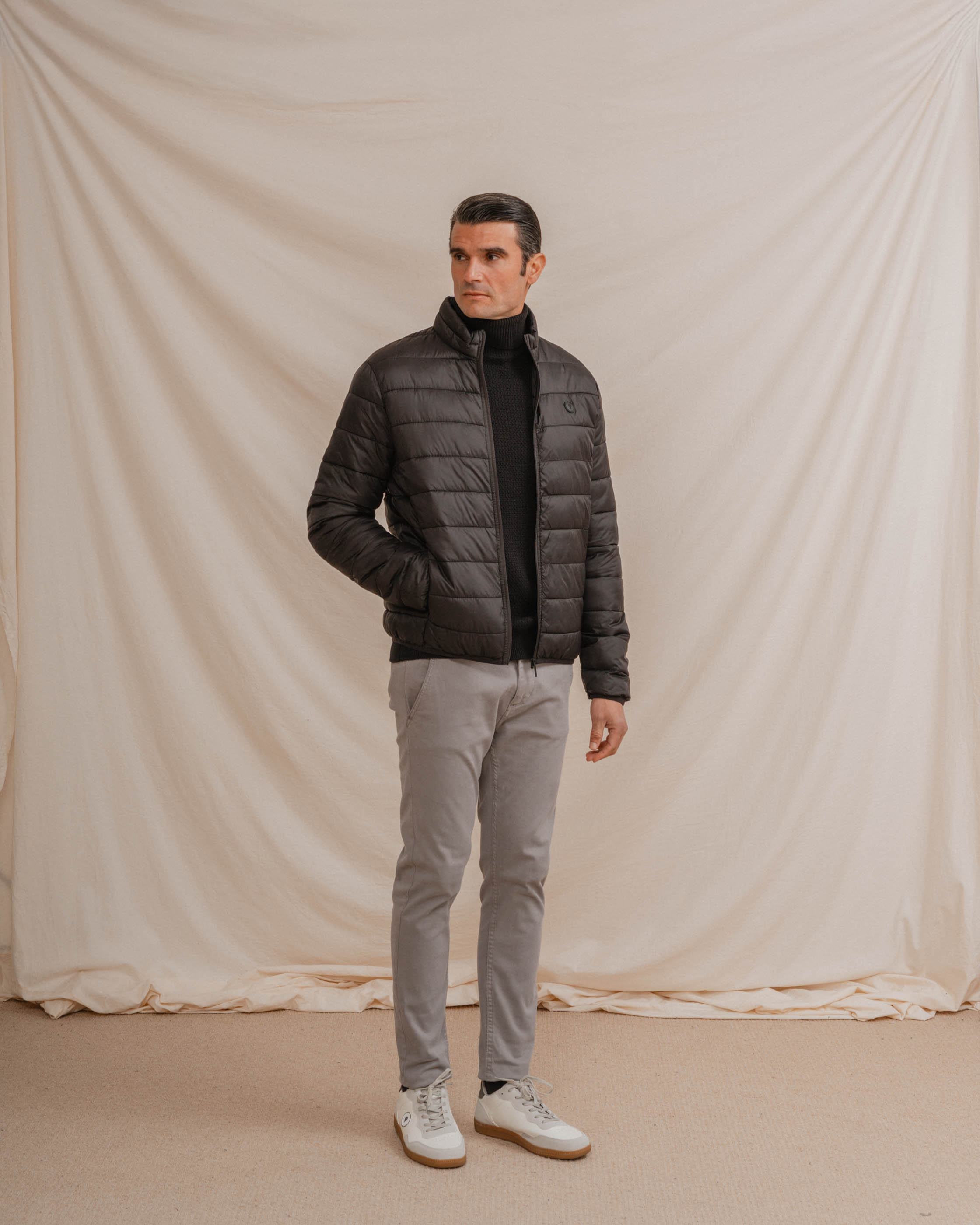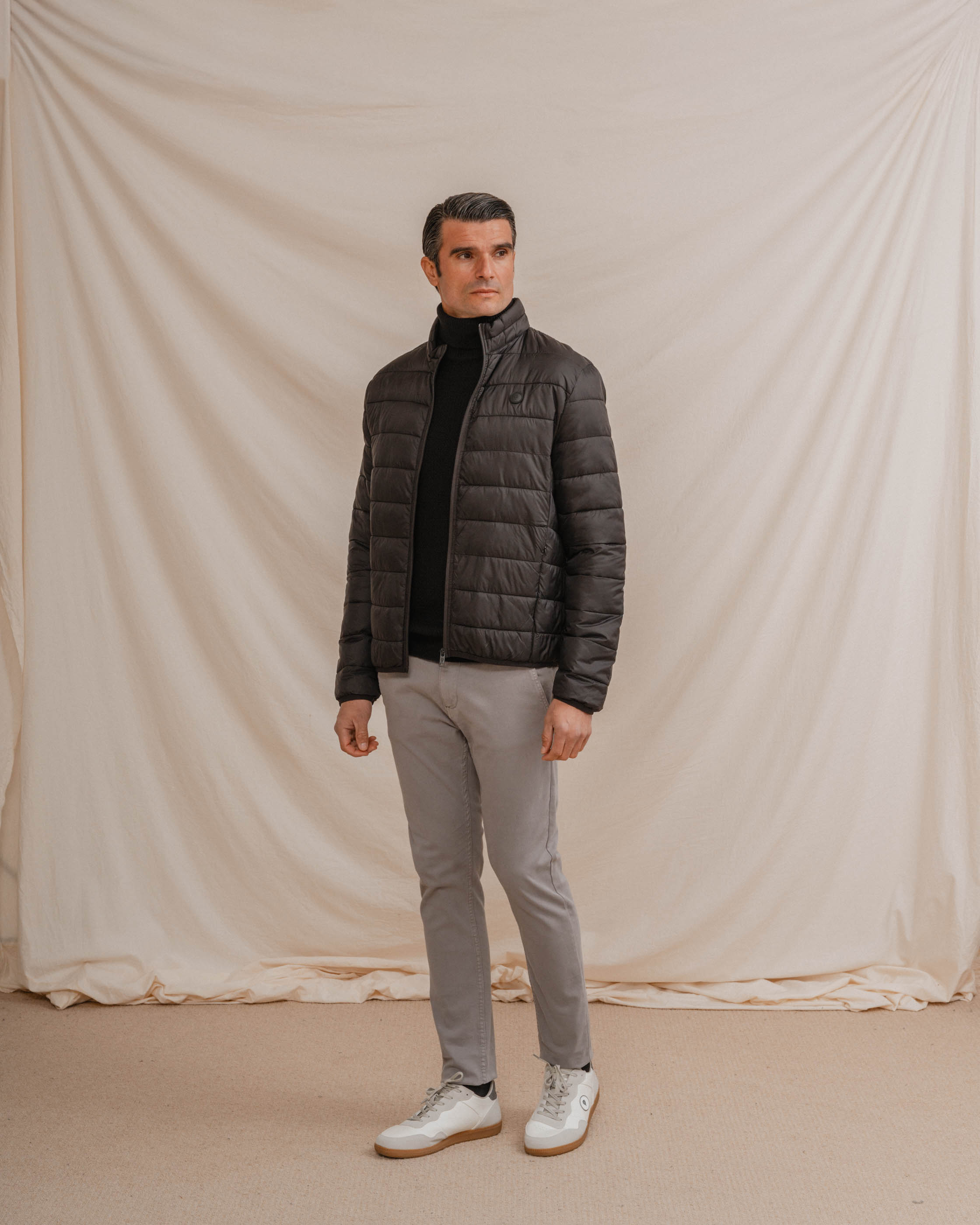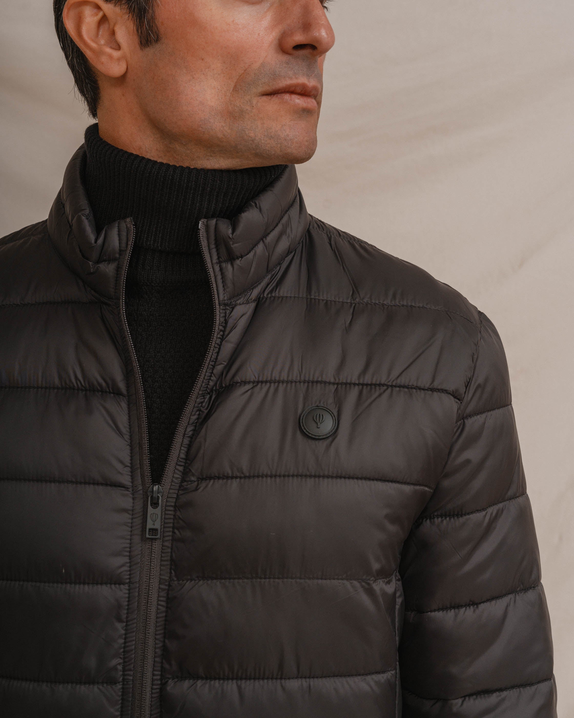 Acolchado para hombre en color negro. Cuello chimenea y cierre central mediante cremallera. Dos bolsillos laterales y logo en la parte frontal a la altura del pecho.