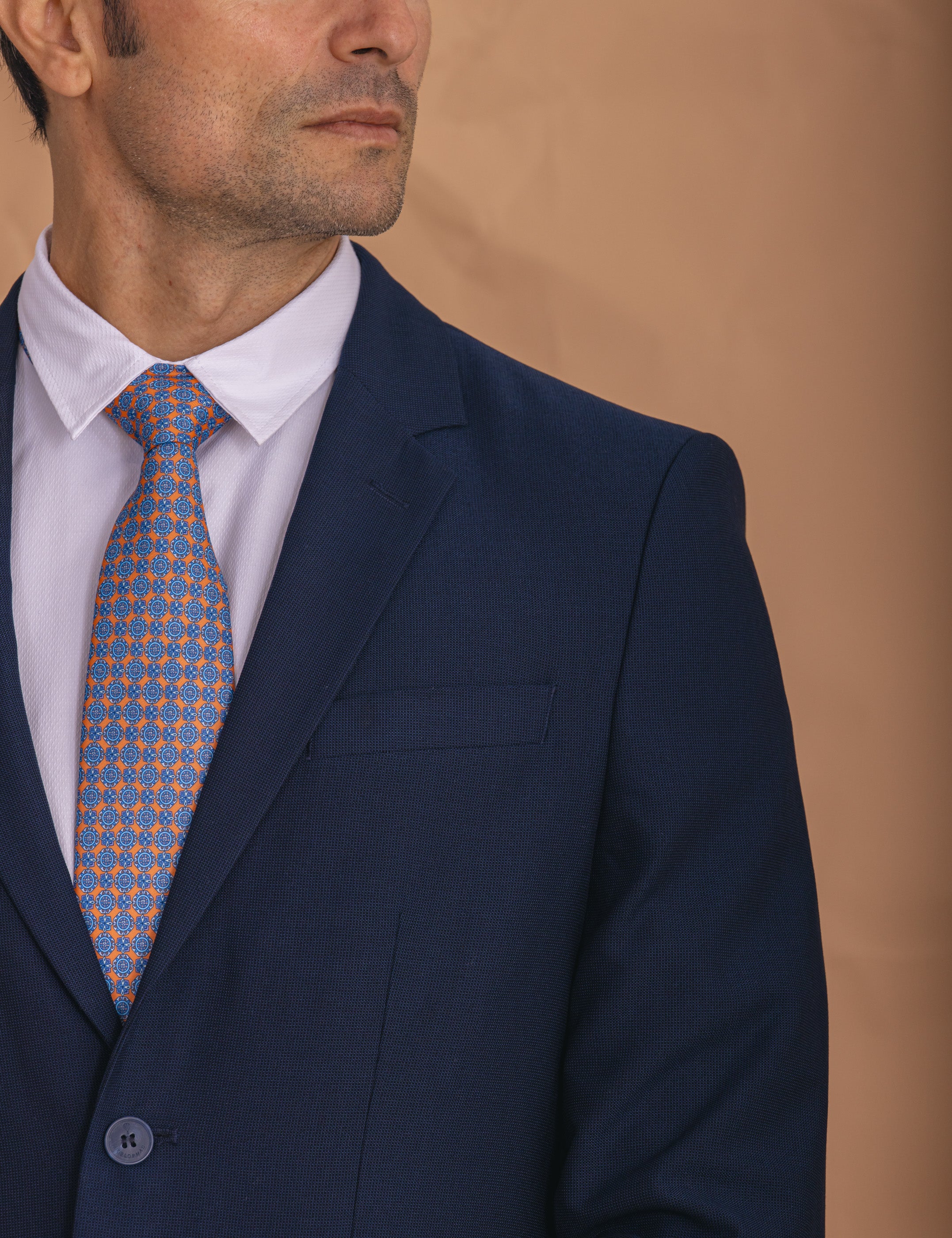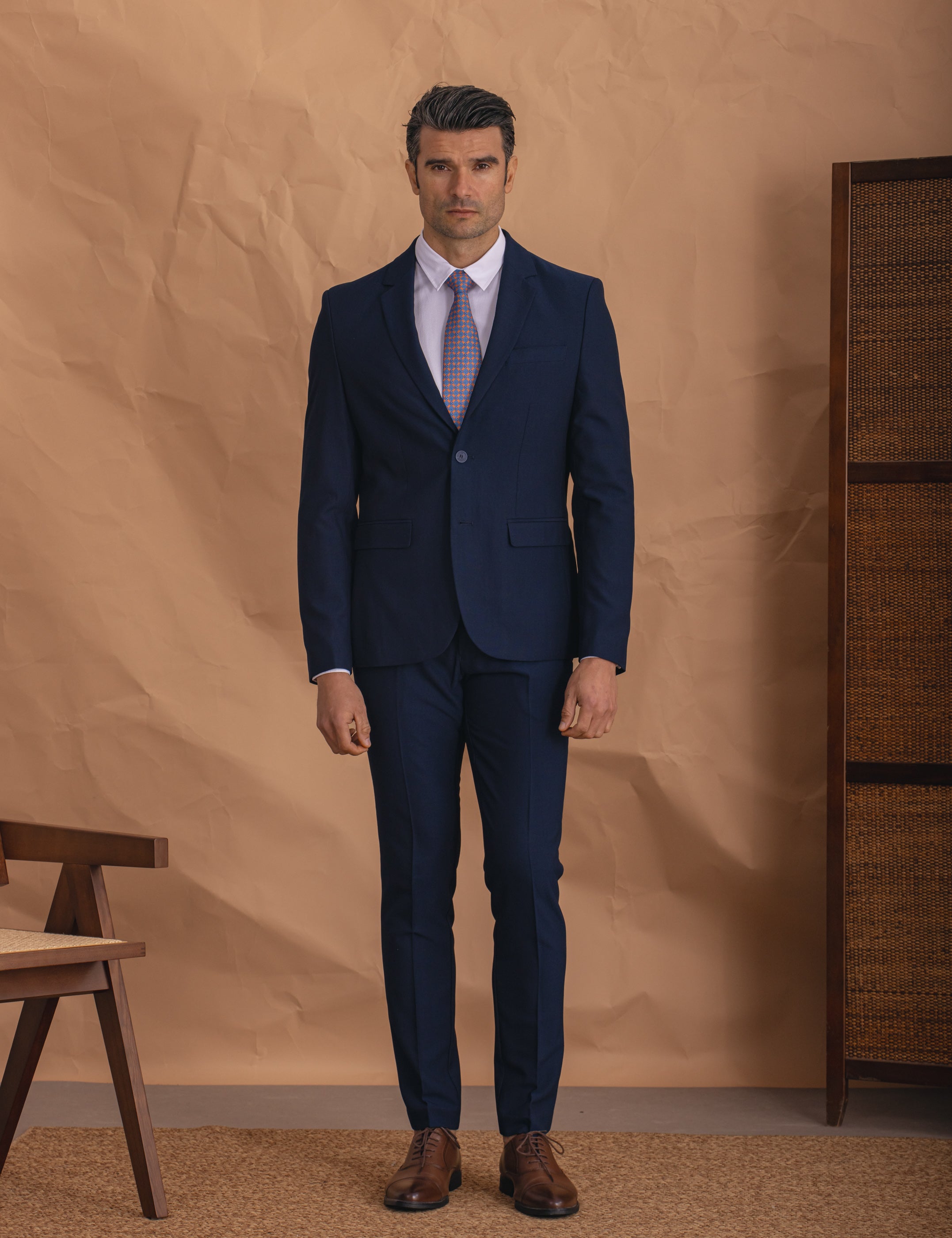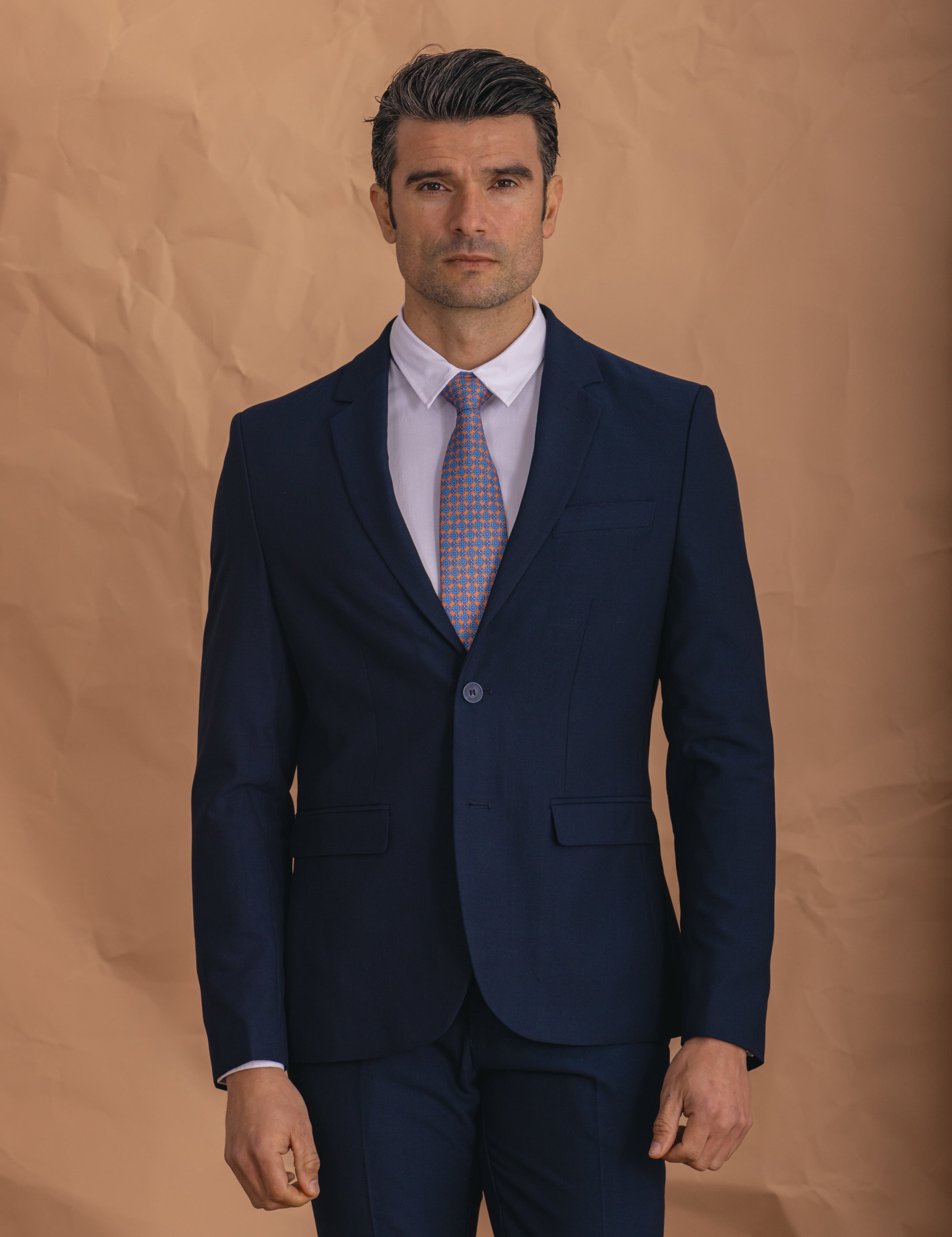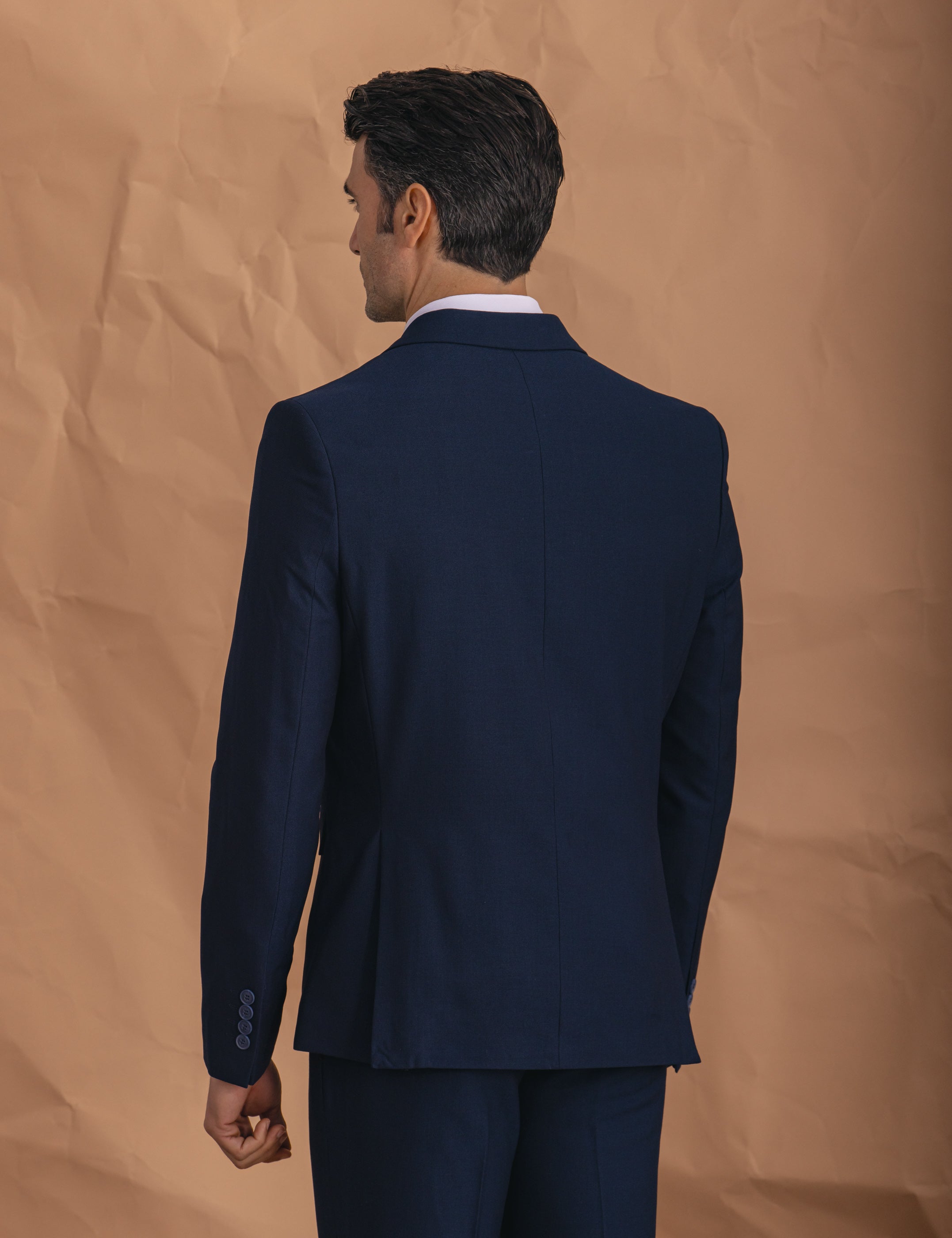Americana de traje para hombre en color azul con estructura en su tejido. Cierre central simple mediante botones y con cuello y solapa. Bolsillos de solapa en la cintura y puños con botones en su terminación. Interior forrado y con bolsillos.