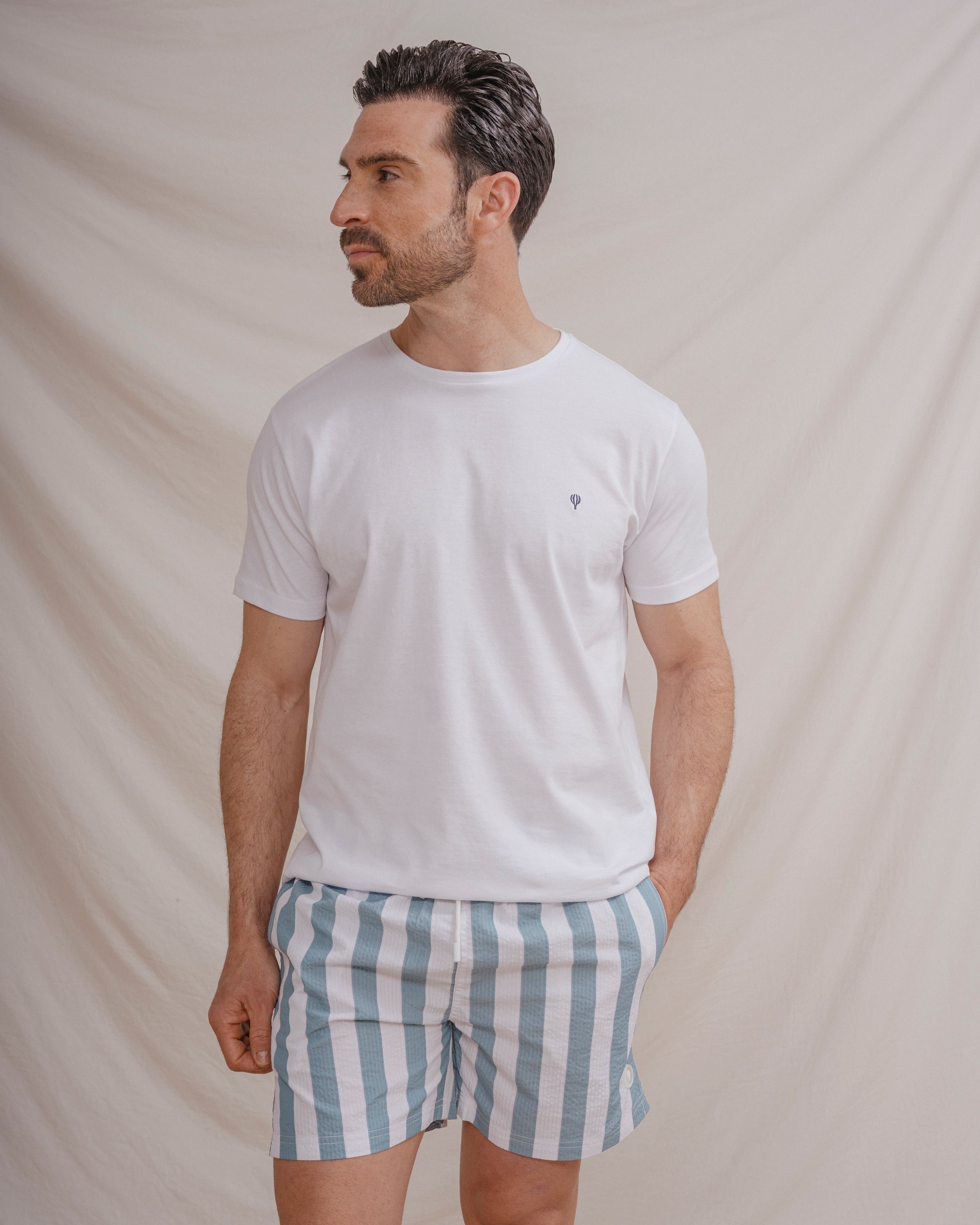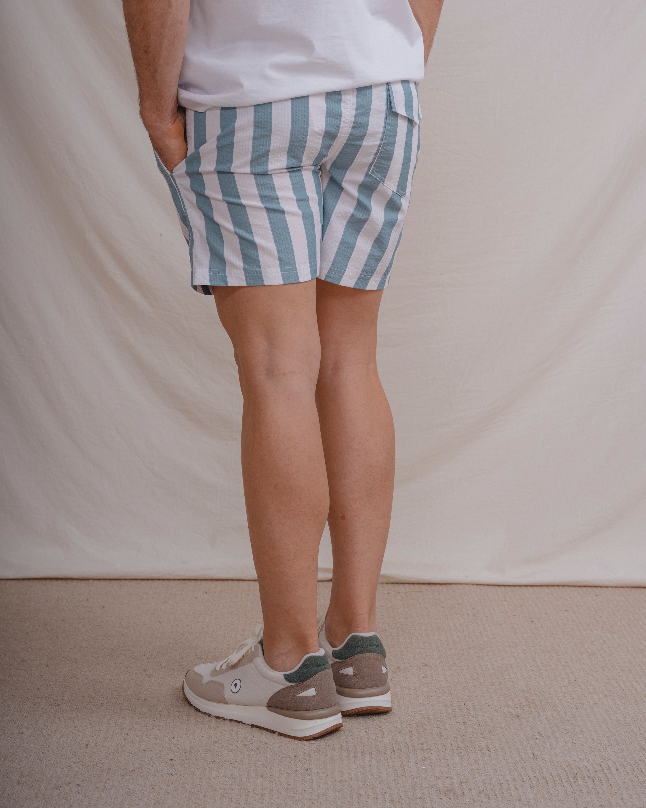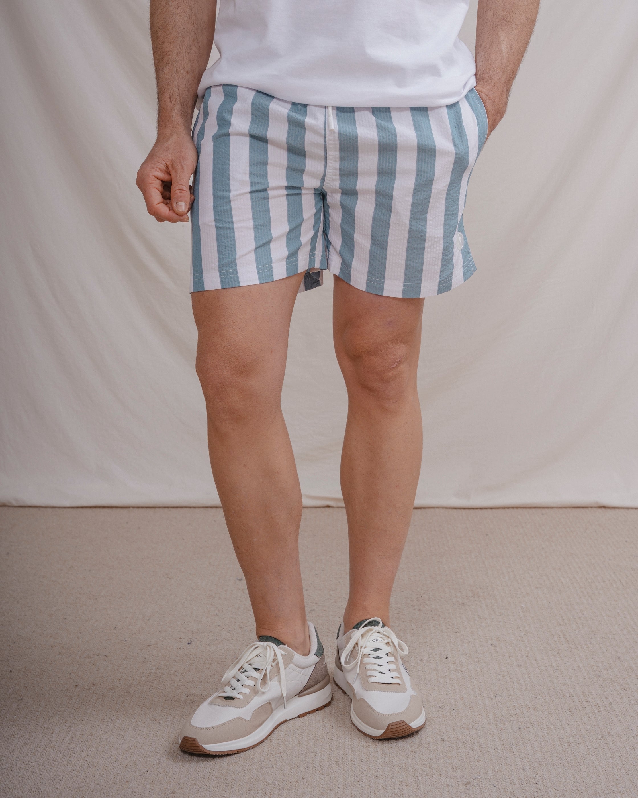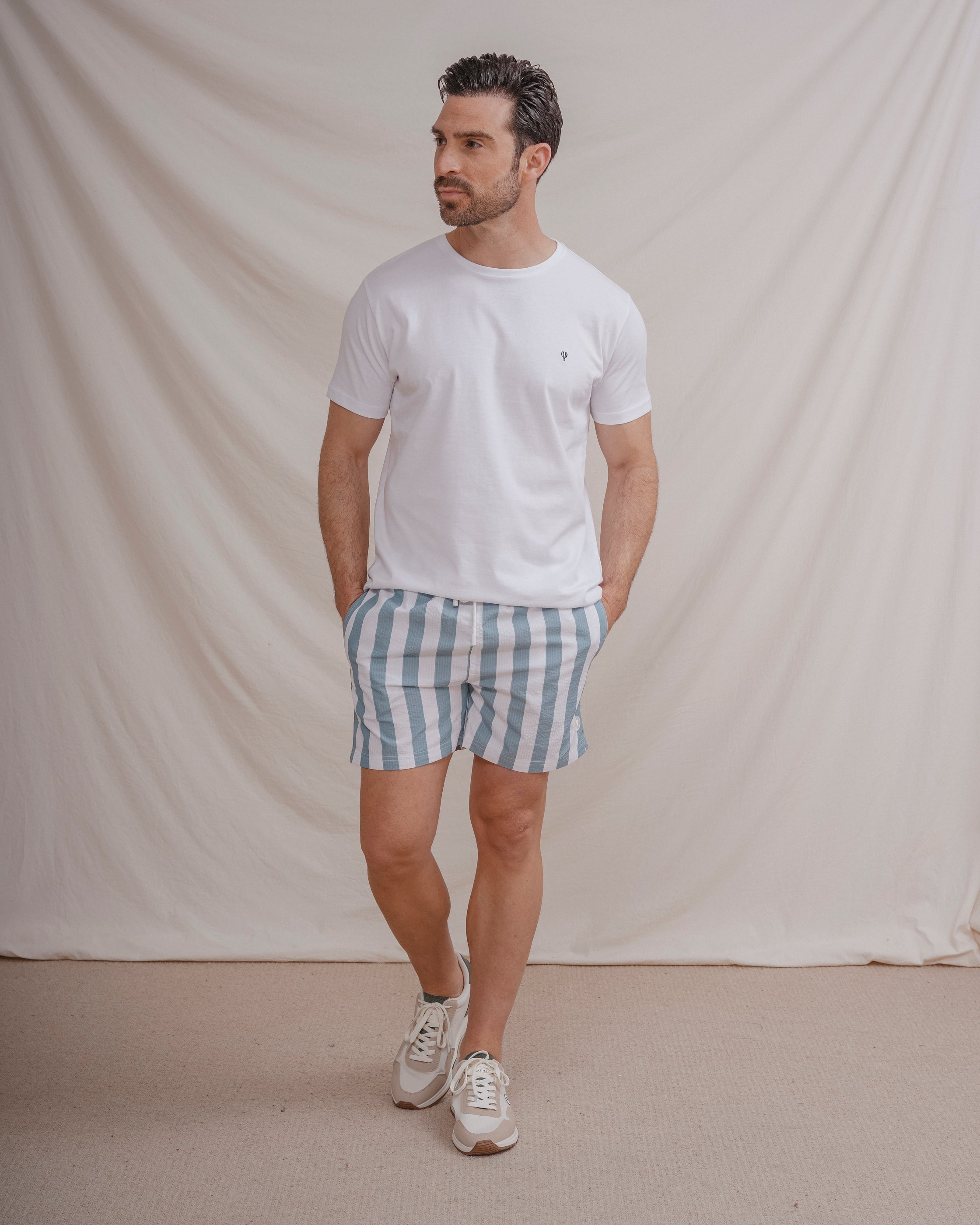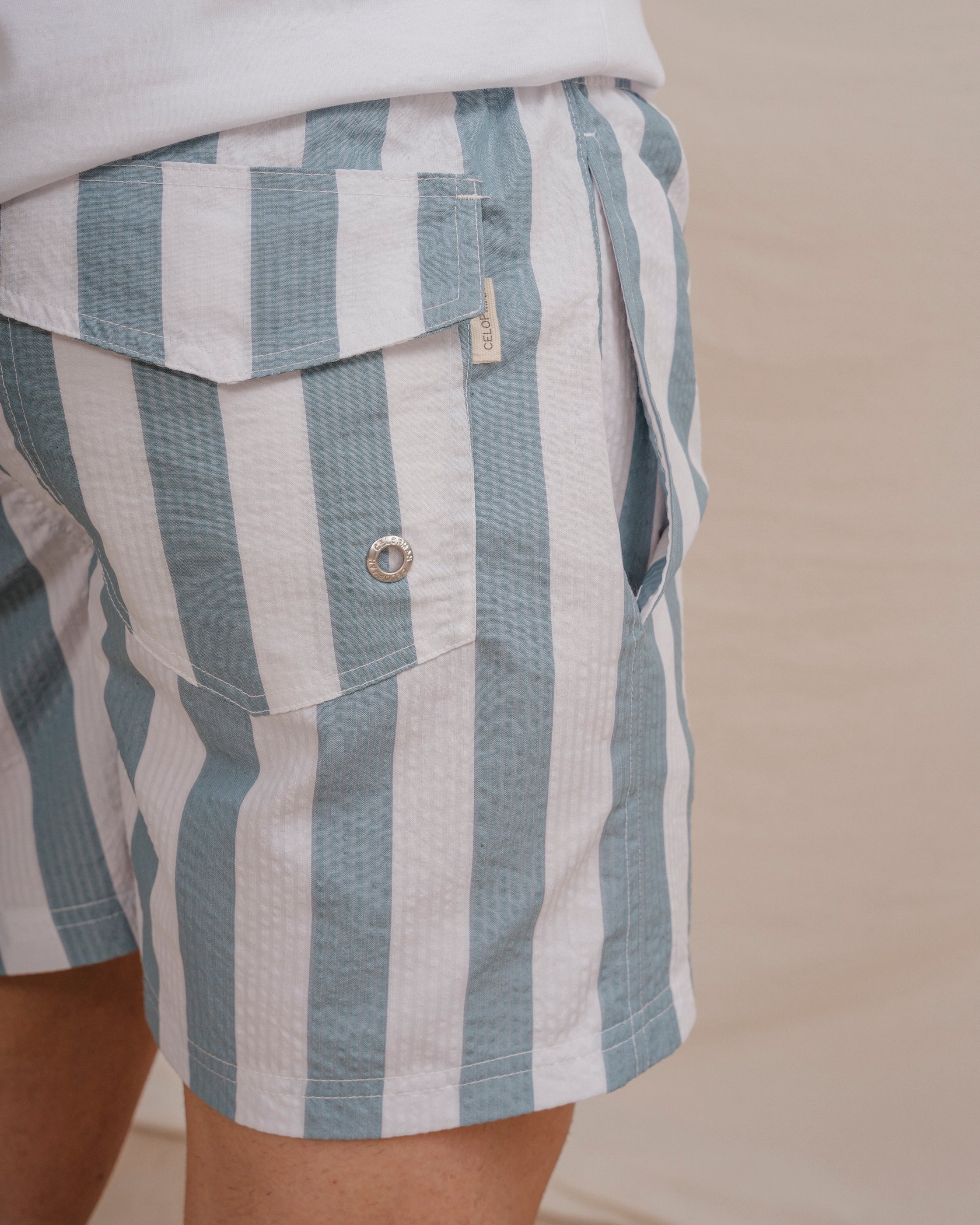 Bañador con rayas anchas y tejido seersucker a contraste con el fondo. Tiene dos bolsillos laterales y forro en el interior. Cintura elástica con cordones para mejor ajuste.