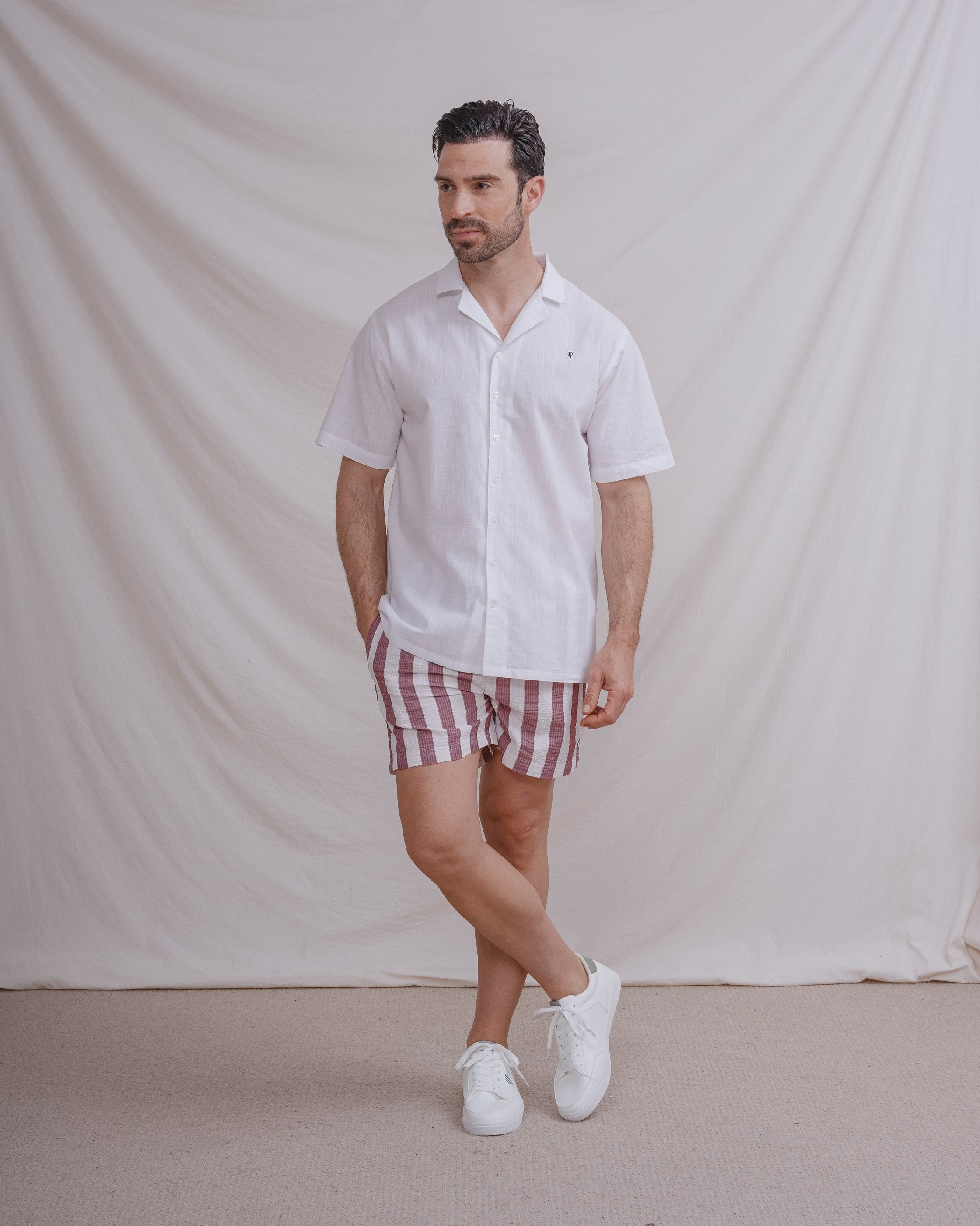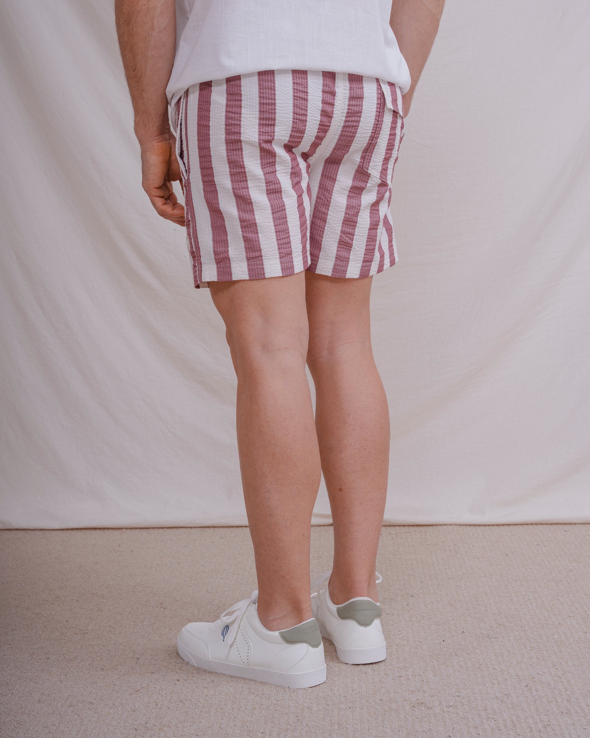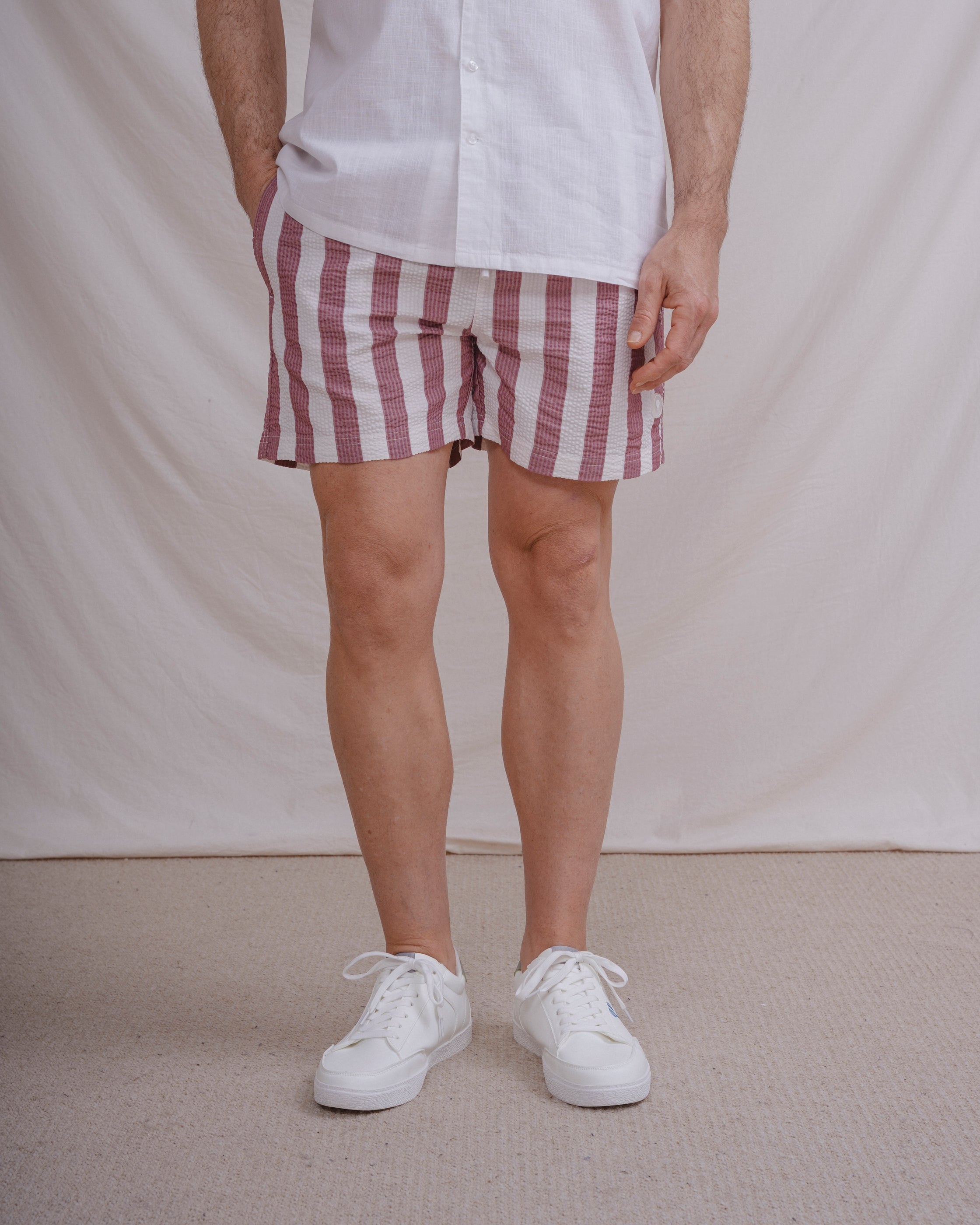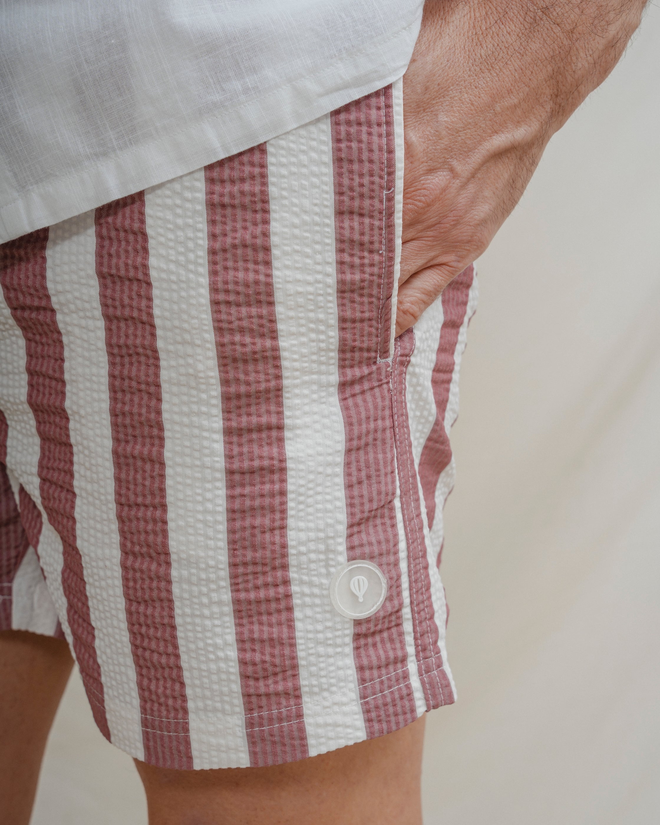 Bañador con rayas anchas y tejido seersucker a contraste con el fondo. Tiene dos bolsillos laterales y forro en el interior. Cintura elástica con cordones para mejor ajuste.
