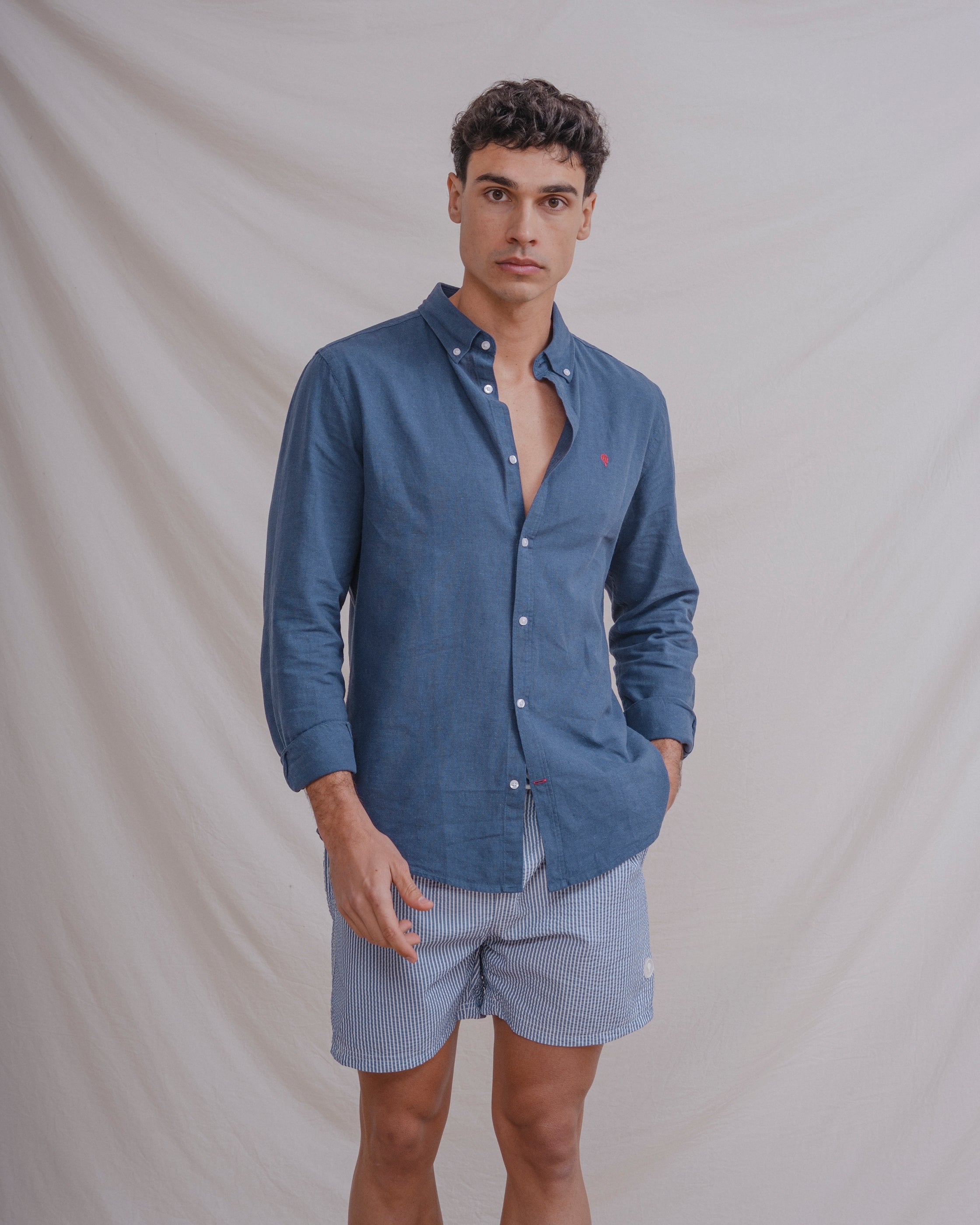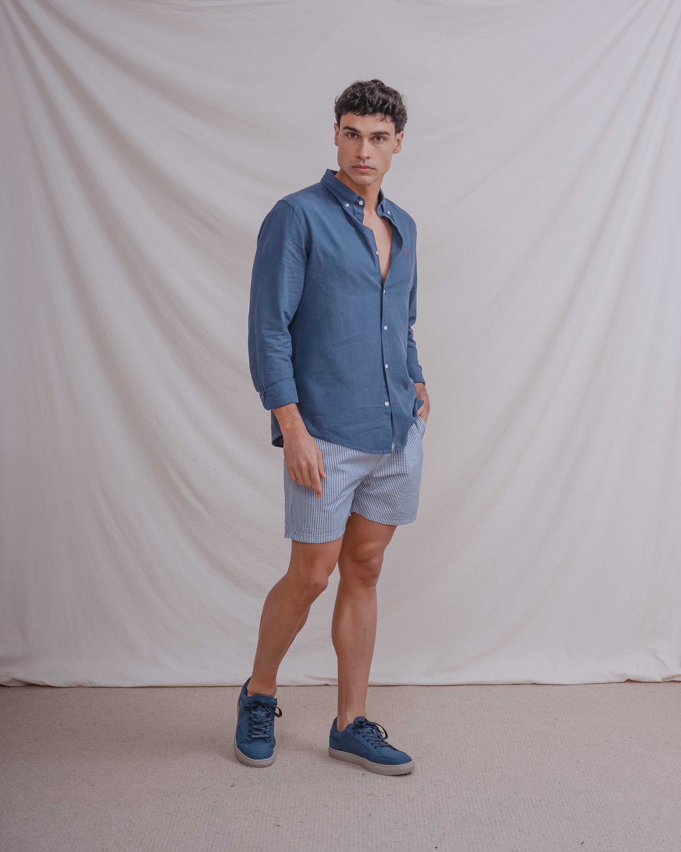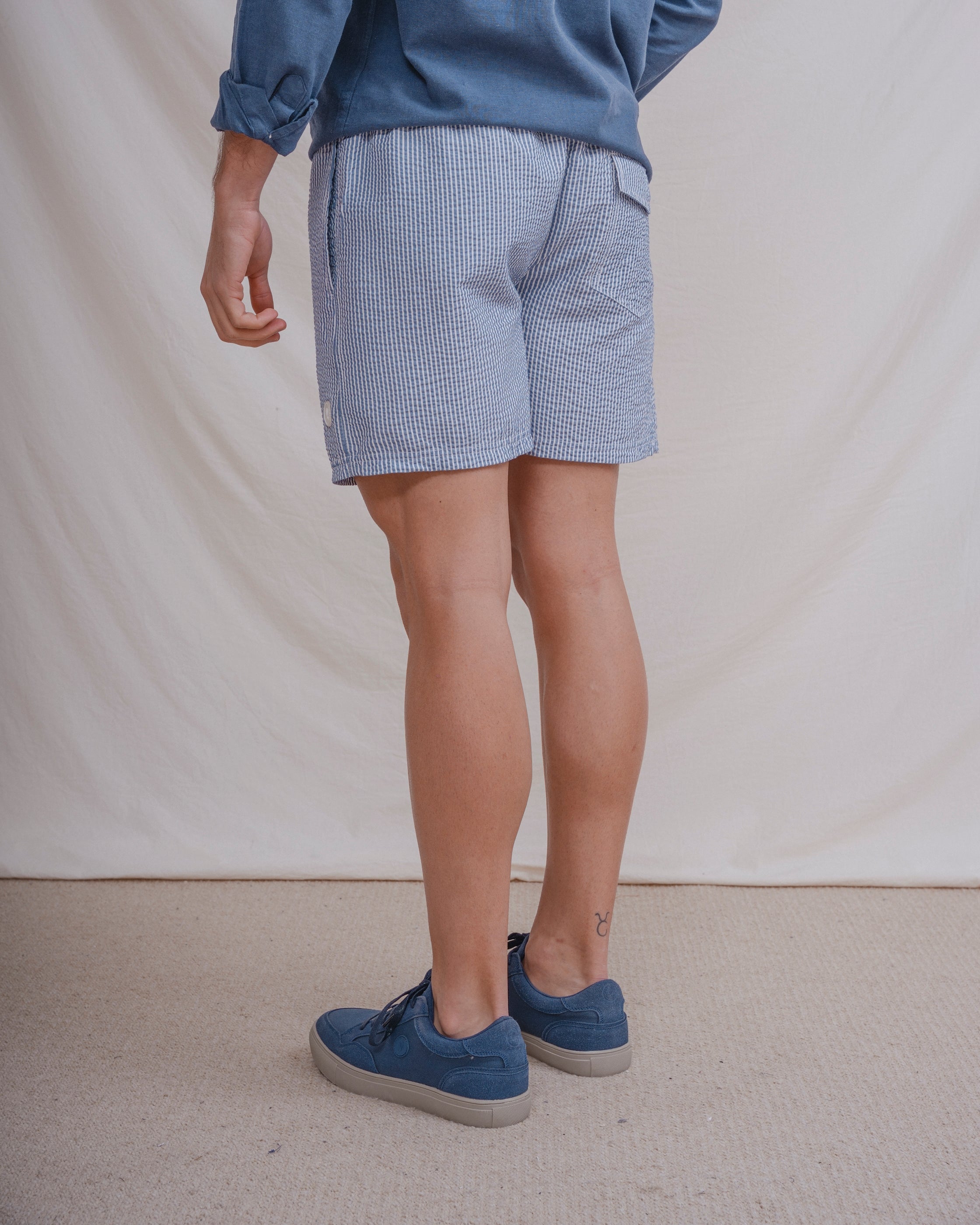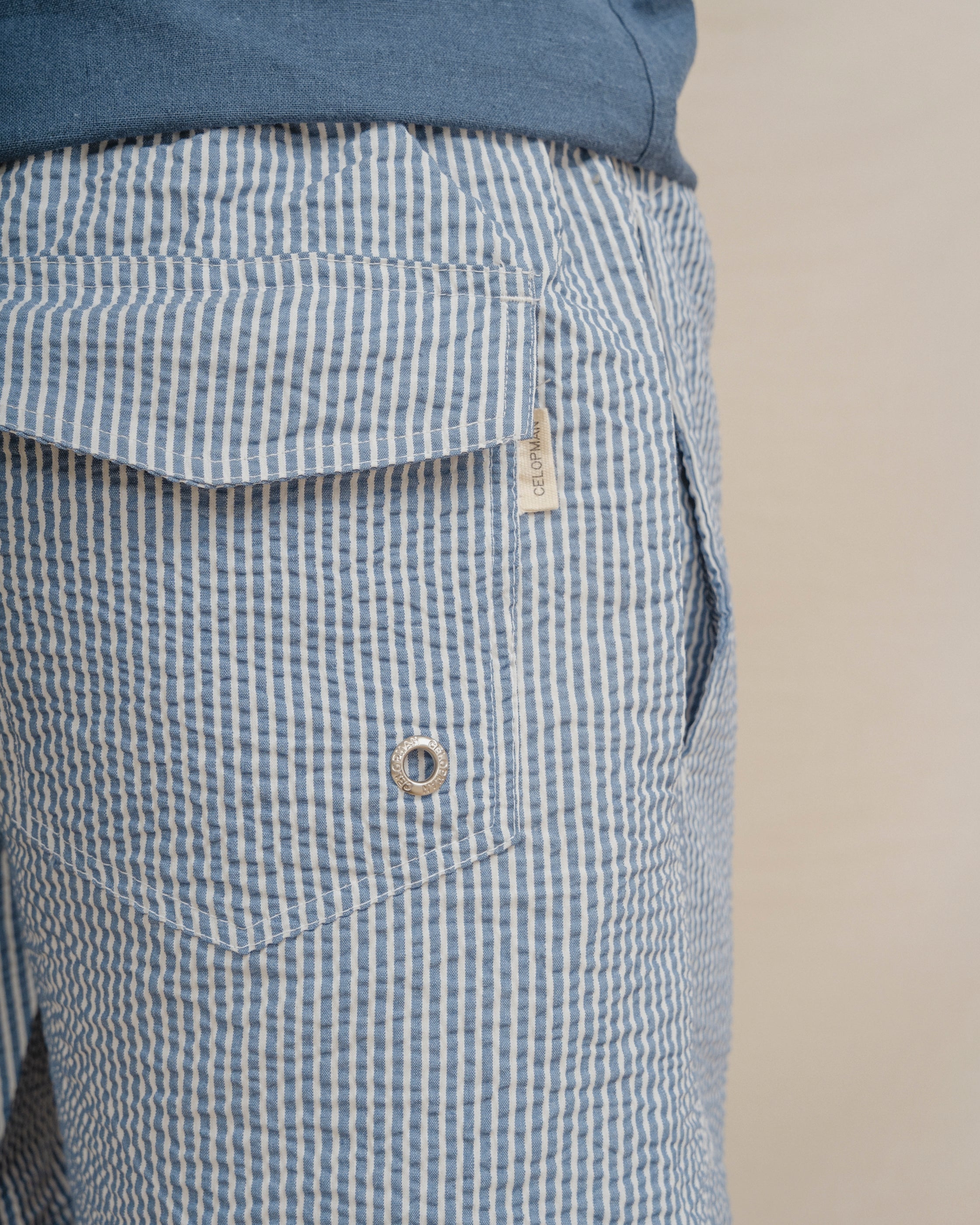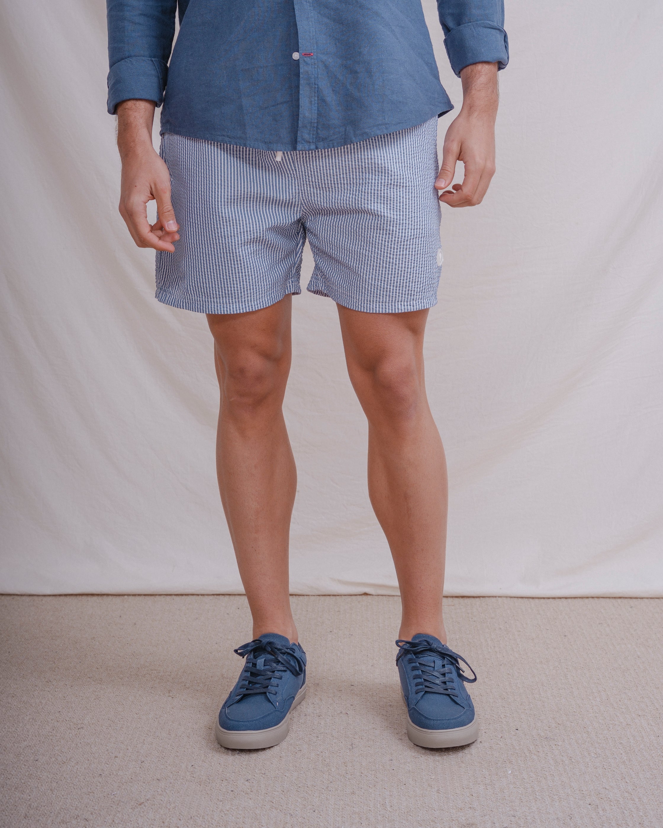 Bañador con rayas finas y tejido seersucker a contraste con el fondo. Tiene dos bolsillos laterales y forro en el interior. Cintura elástica con cordones para mejor ajuste.