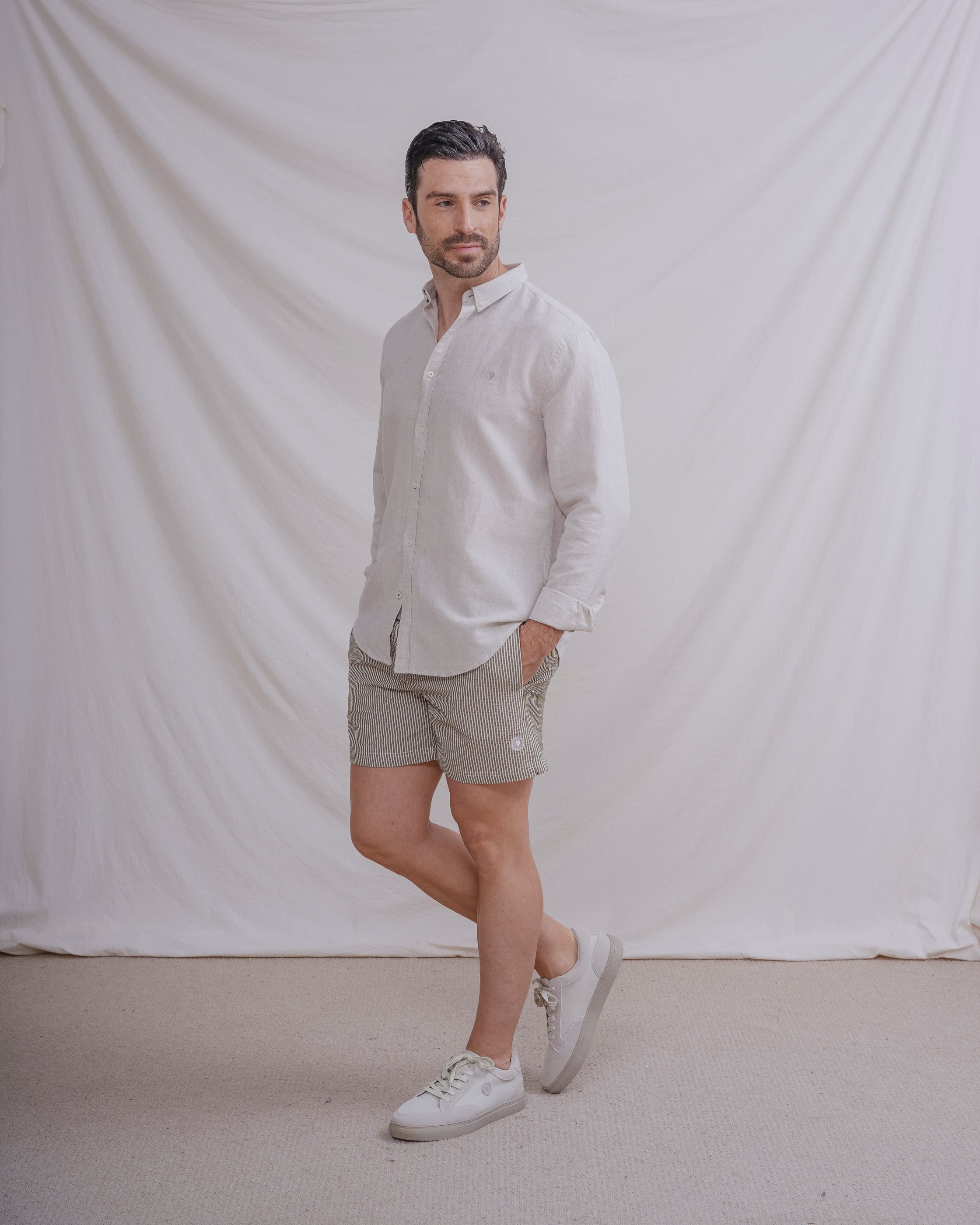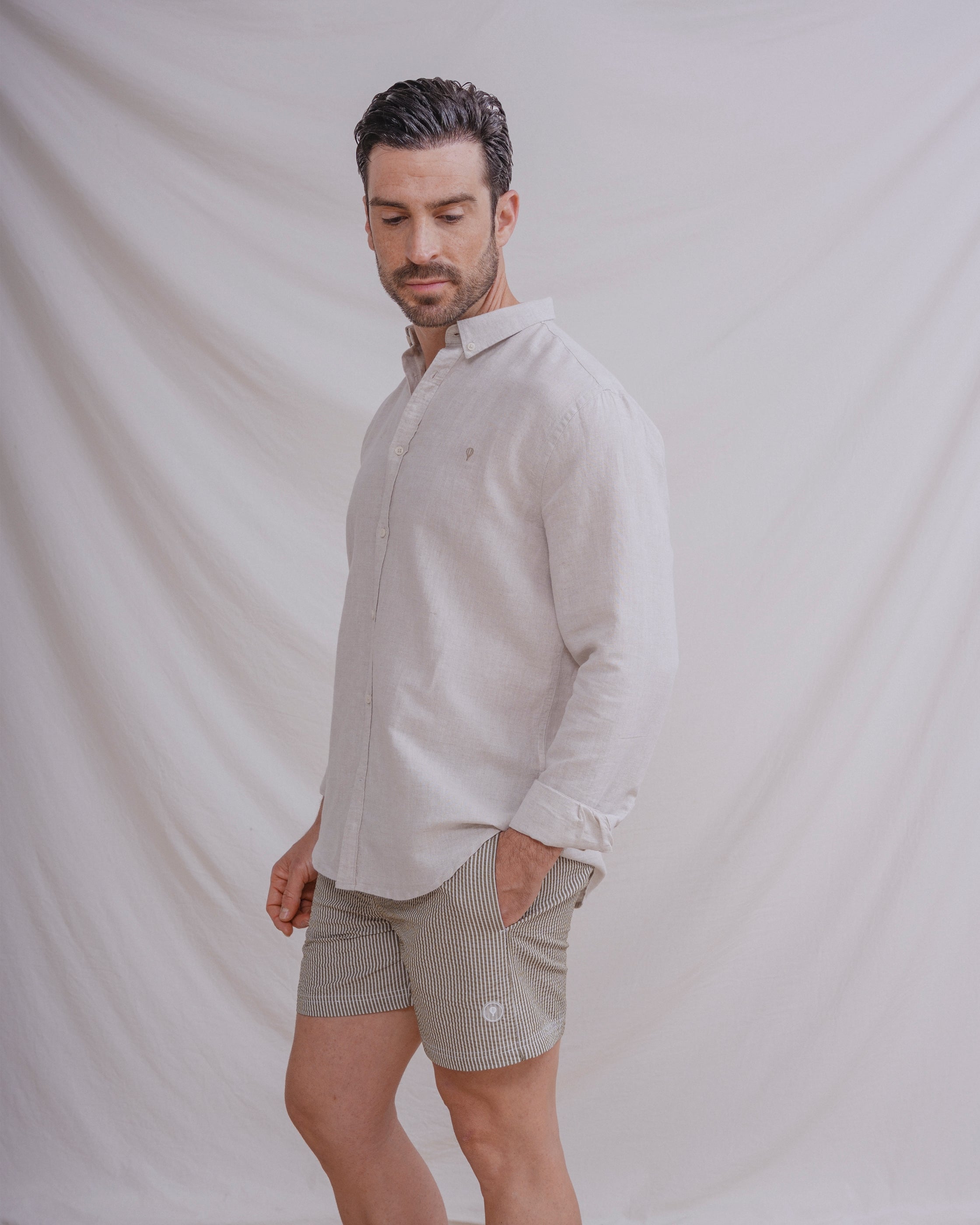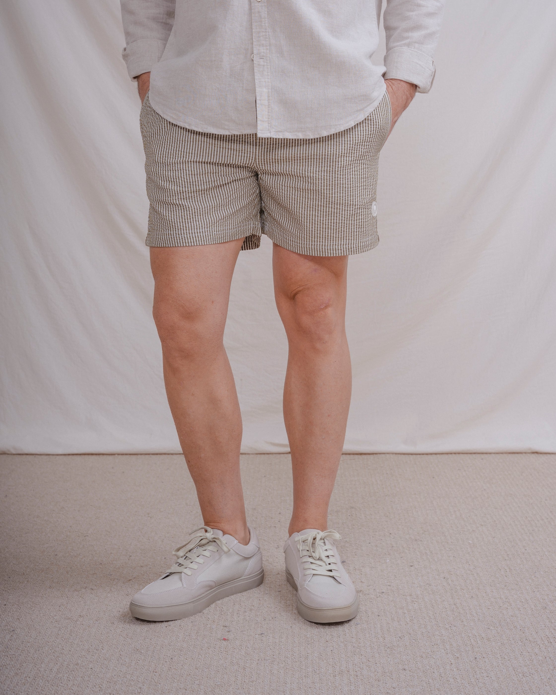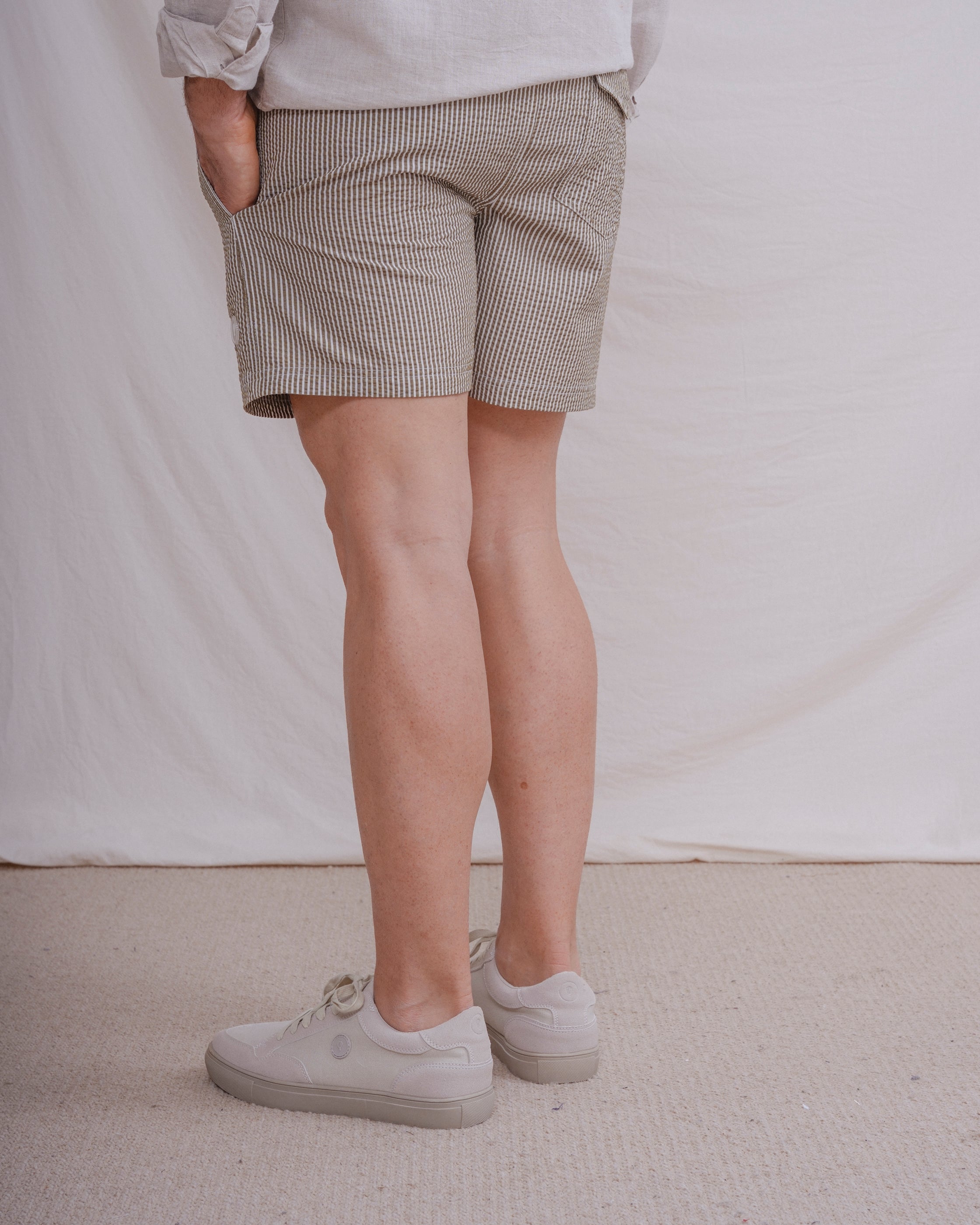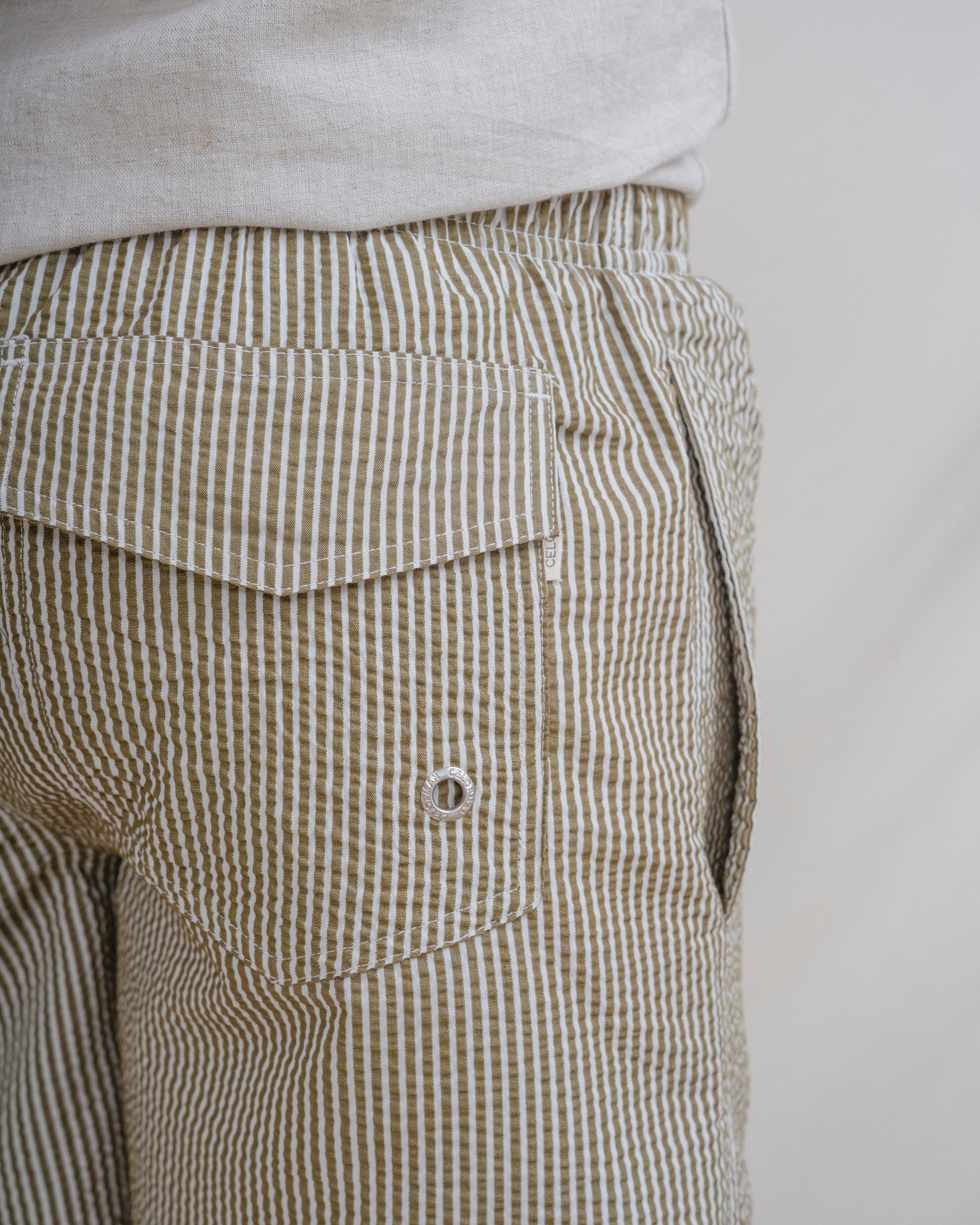 Bañador con rayas finas y tejido seersucker a contraste con el fondo. Tiene dos bolsillos laterales y forro en el interior. Cintura elástica con cordones para mejor ajuste.
