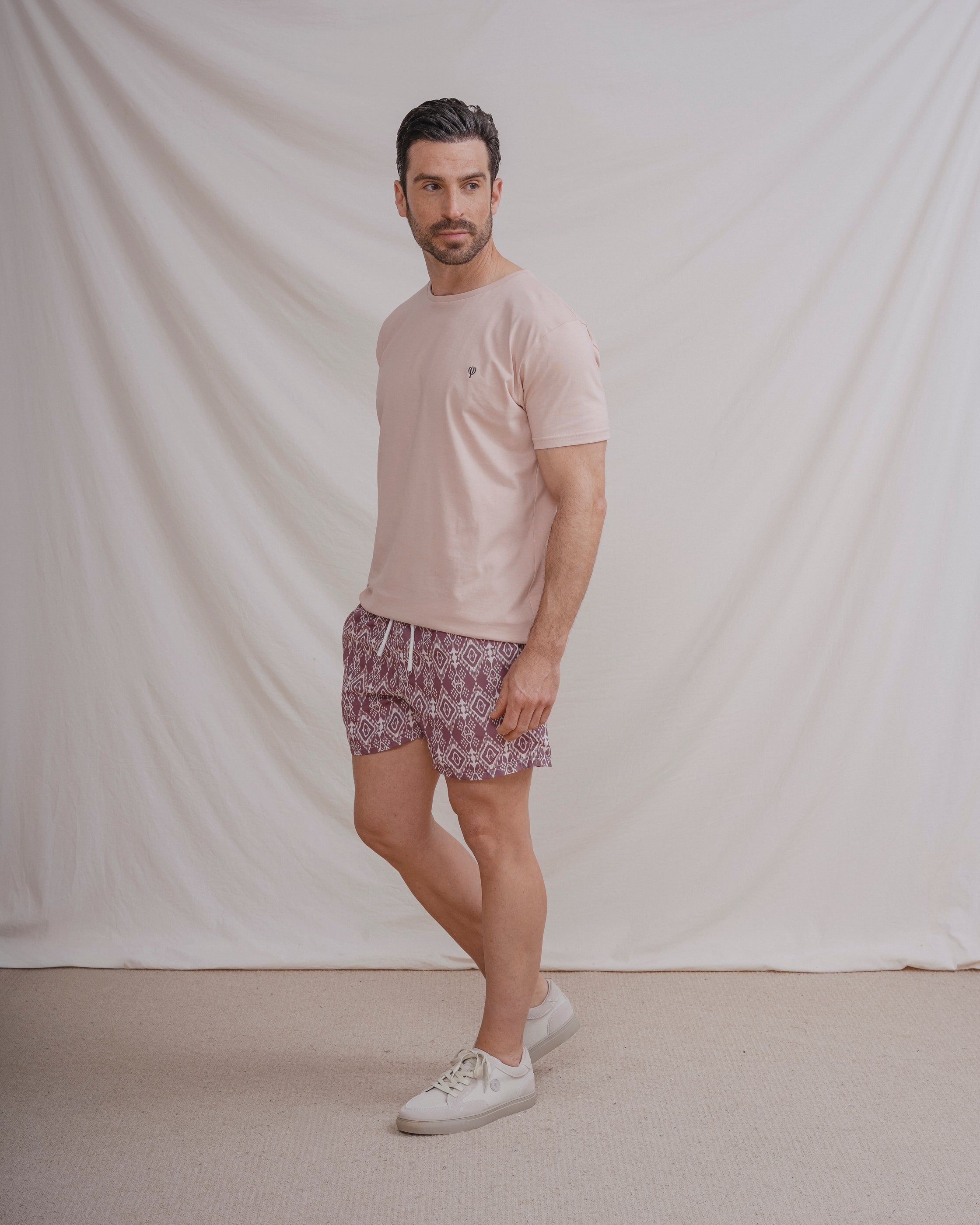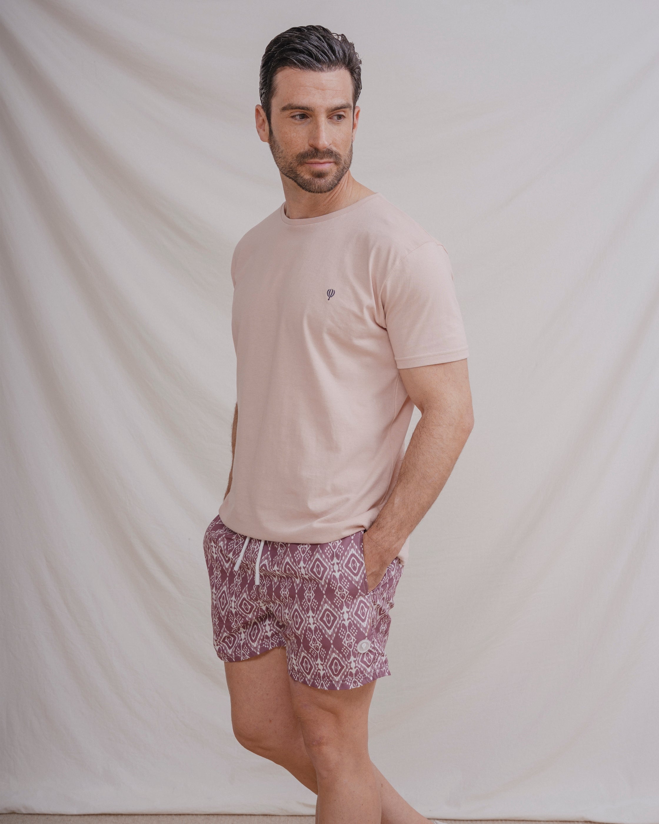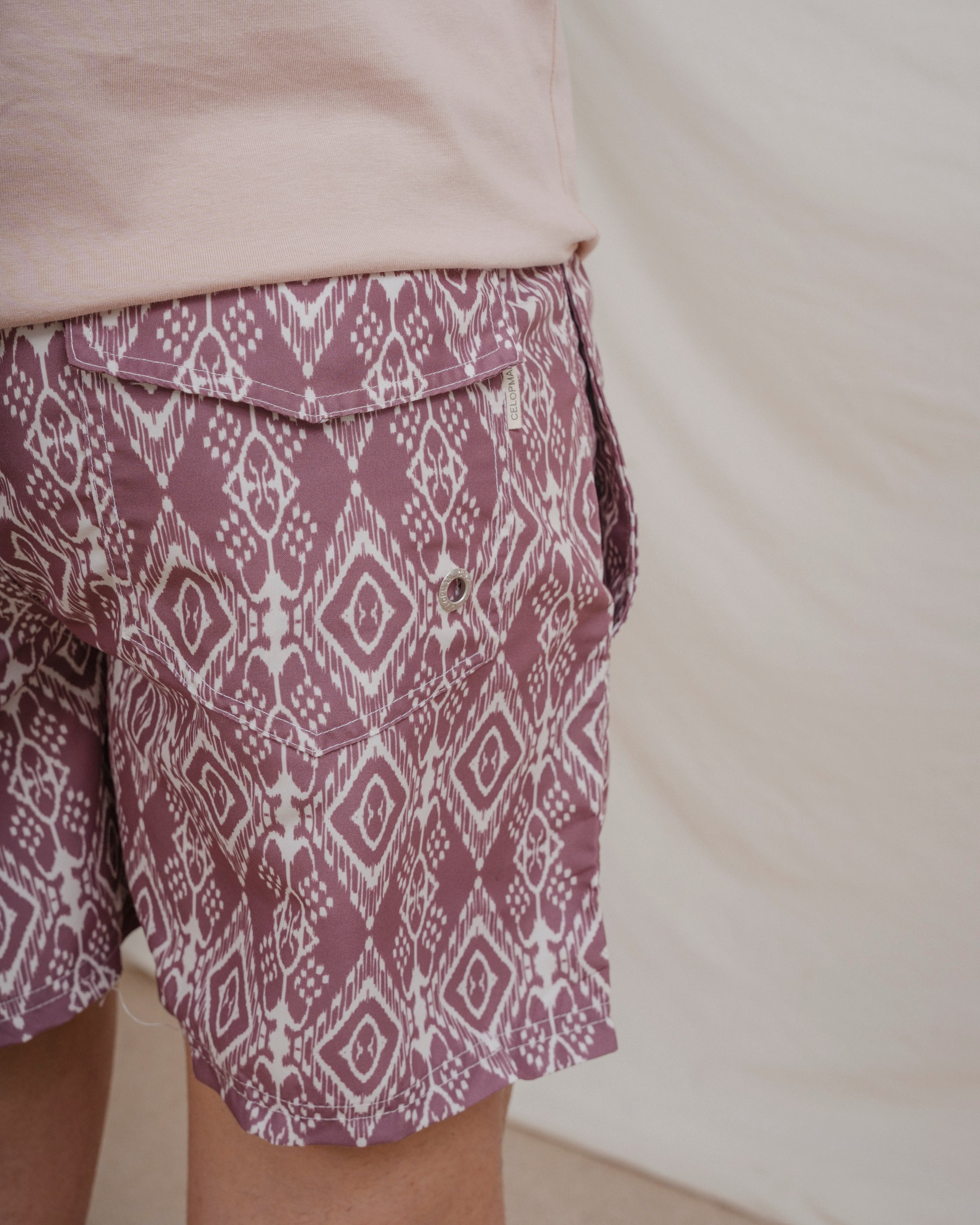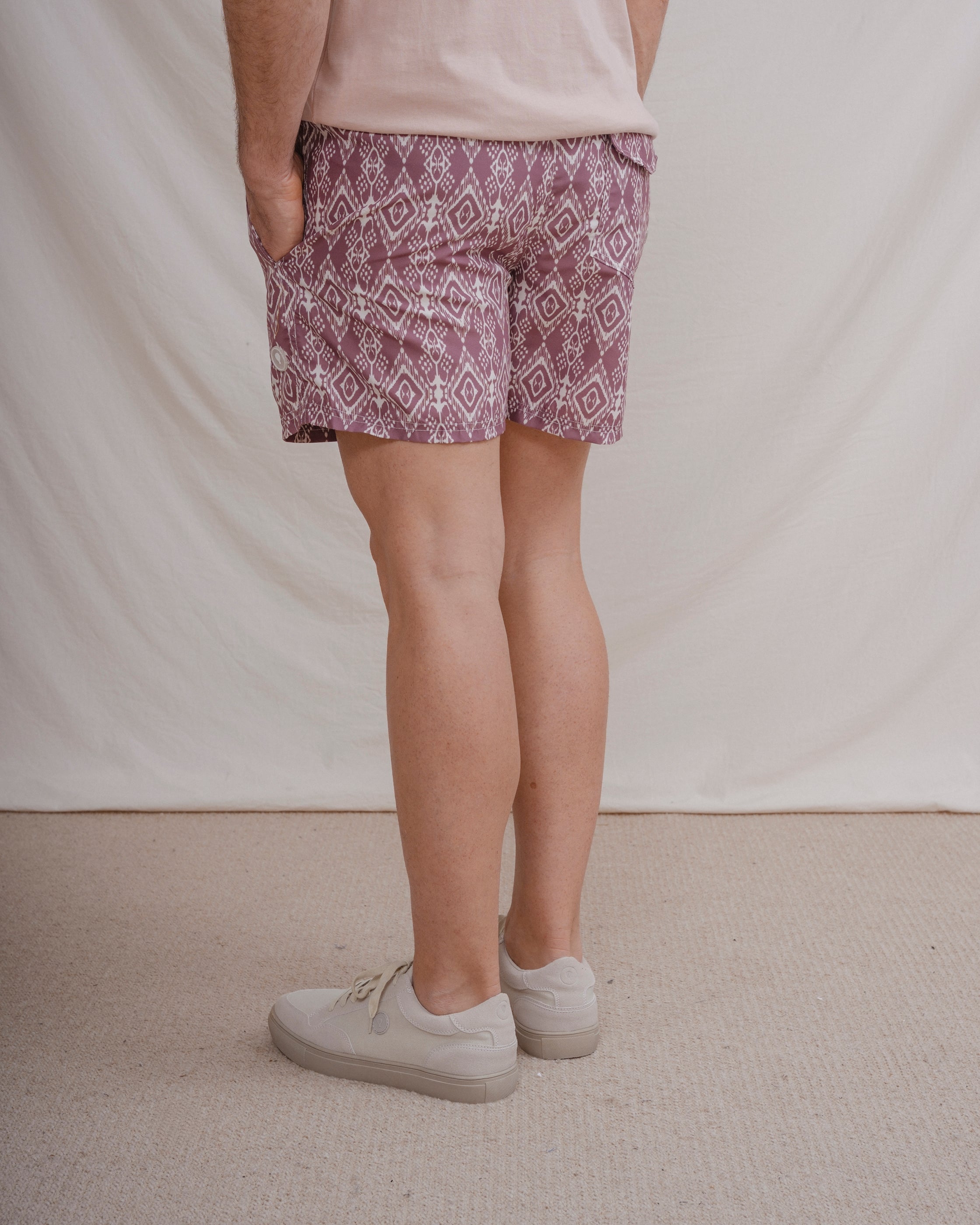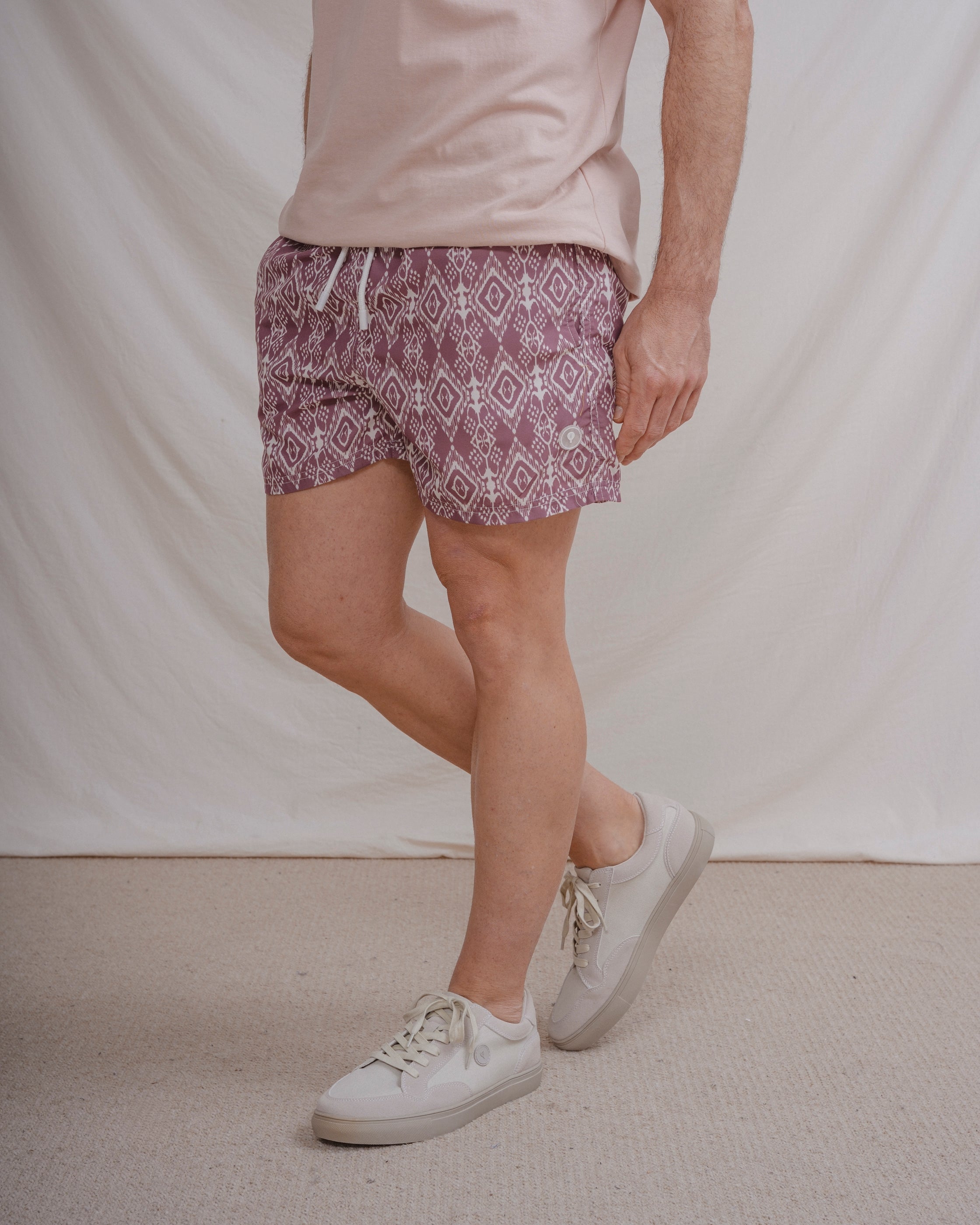 Bañador con diseño de rombos a contraste con el fondo. Tiene dos bolsillos laterales y forro en el interior. Cintura elástica con cordones para mejor ajuste.