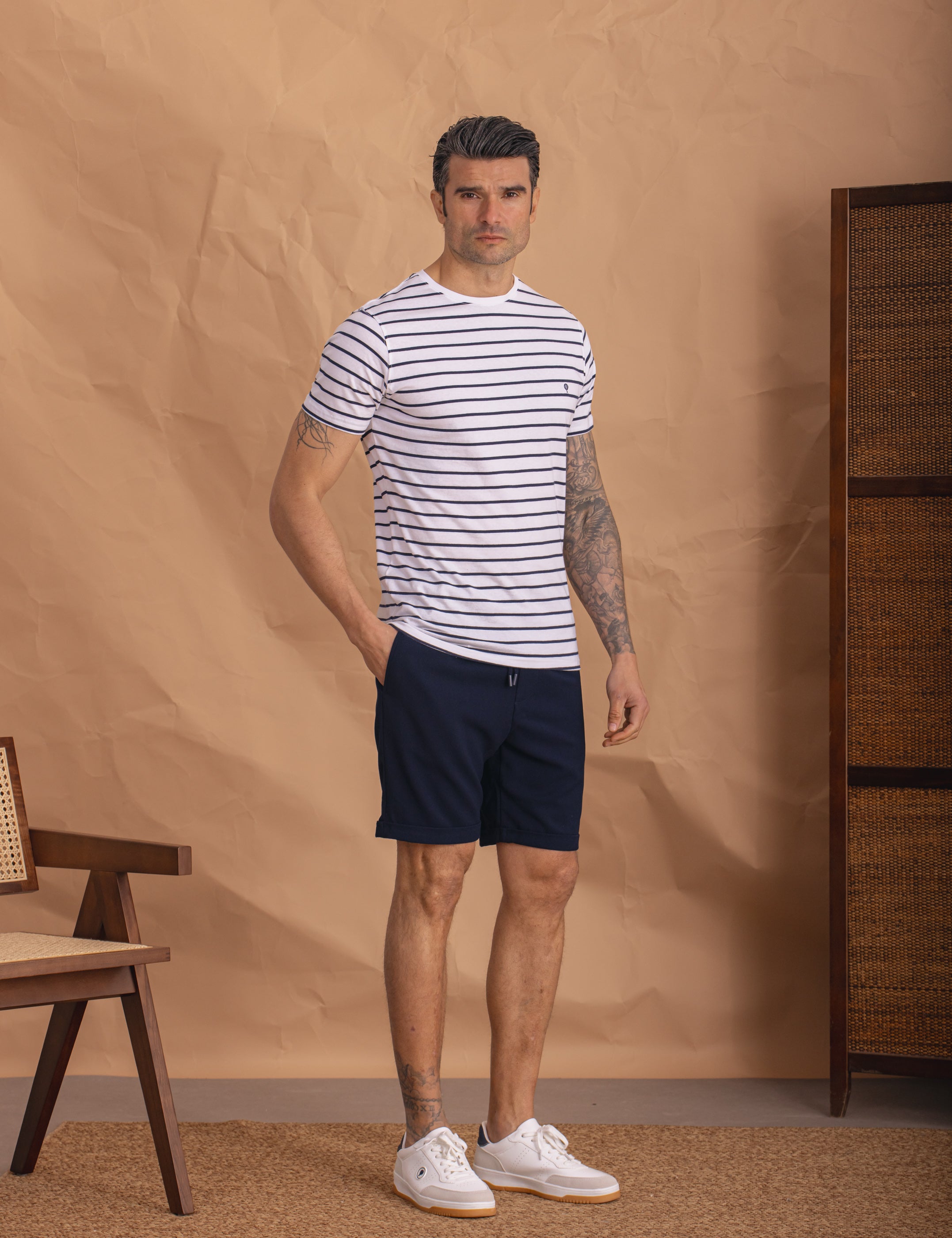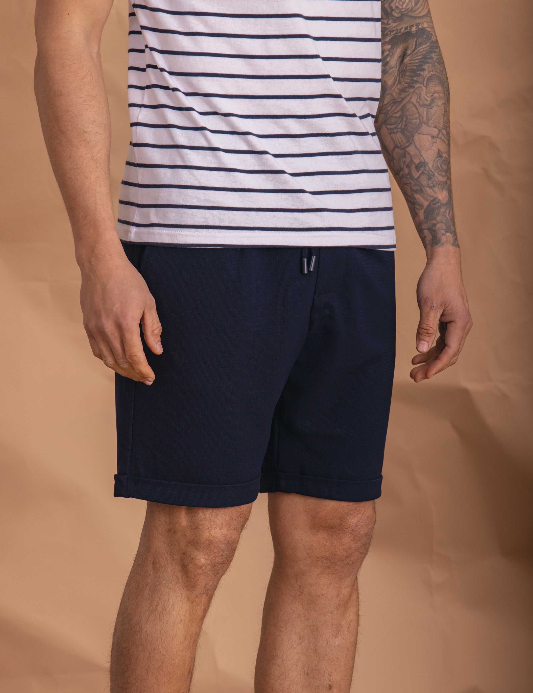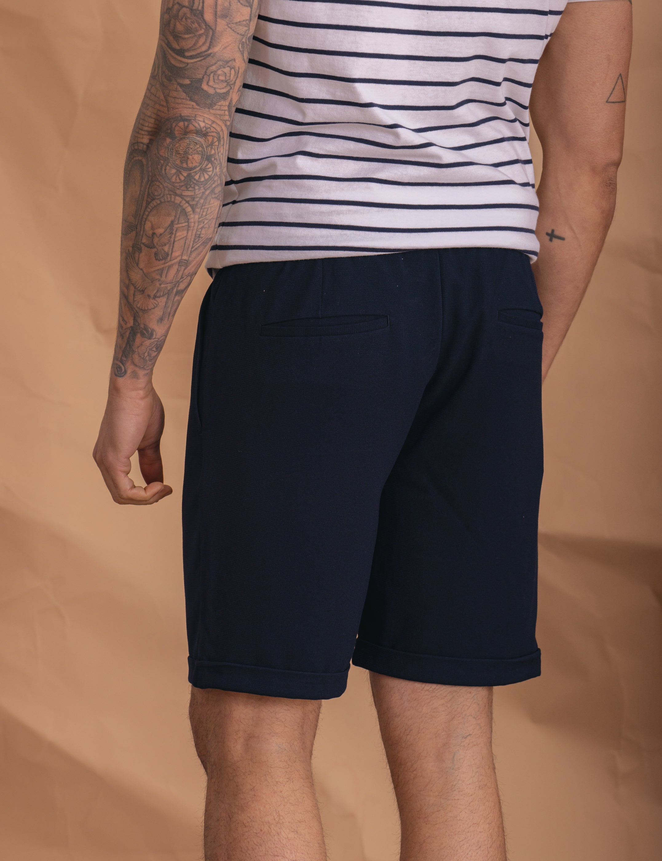 Bermuda casual para hombre en color marino de felpa con cintura elástica y cordones para mejor ajuste. Confeccionada en 70% poliester, 26% viscosa y 4% elastano para mayor comodidad. Dos bolsillos laterales y dos traseros.