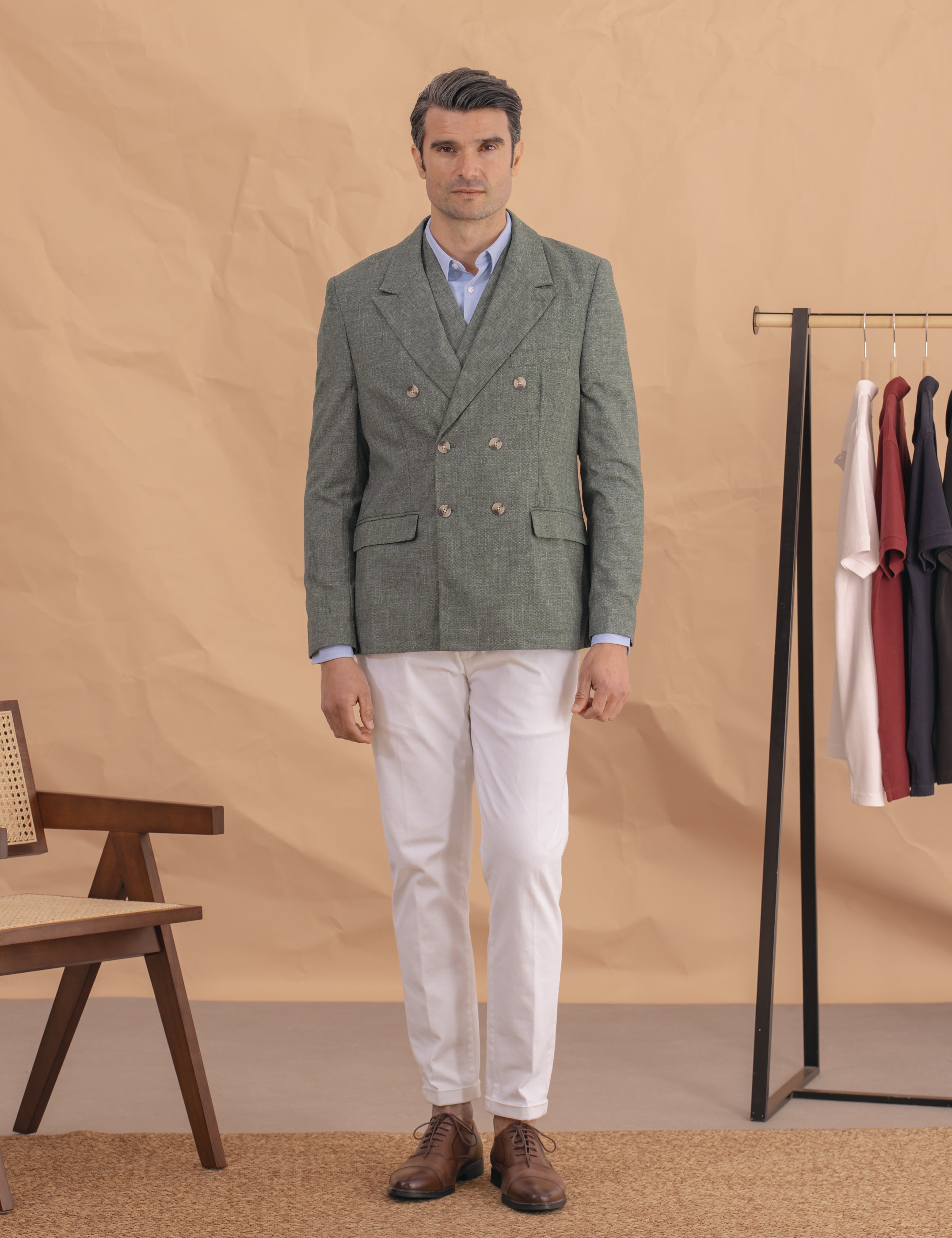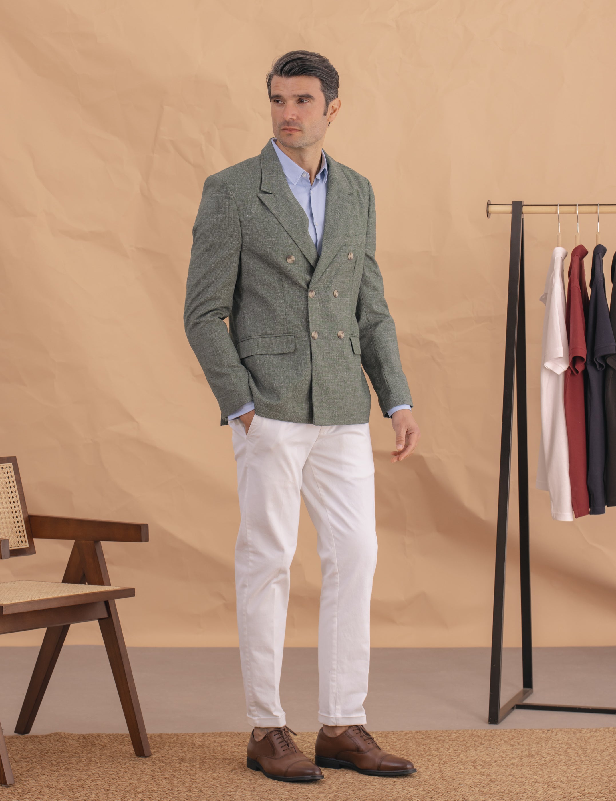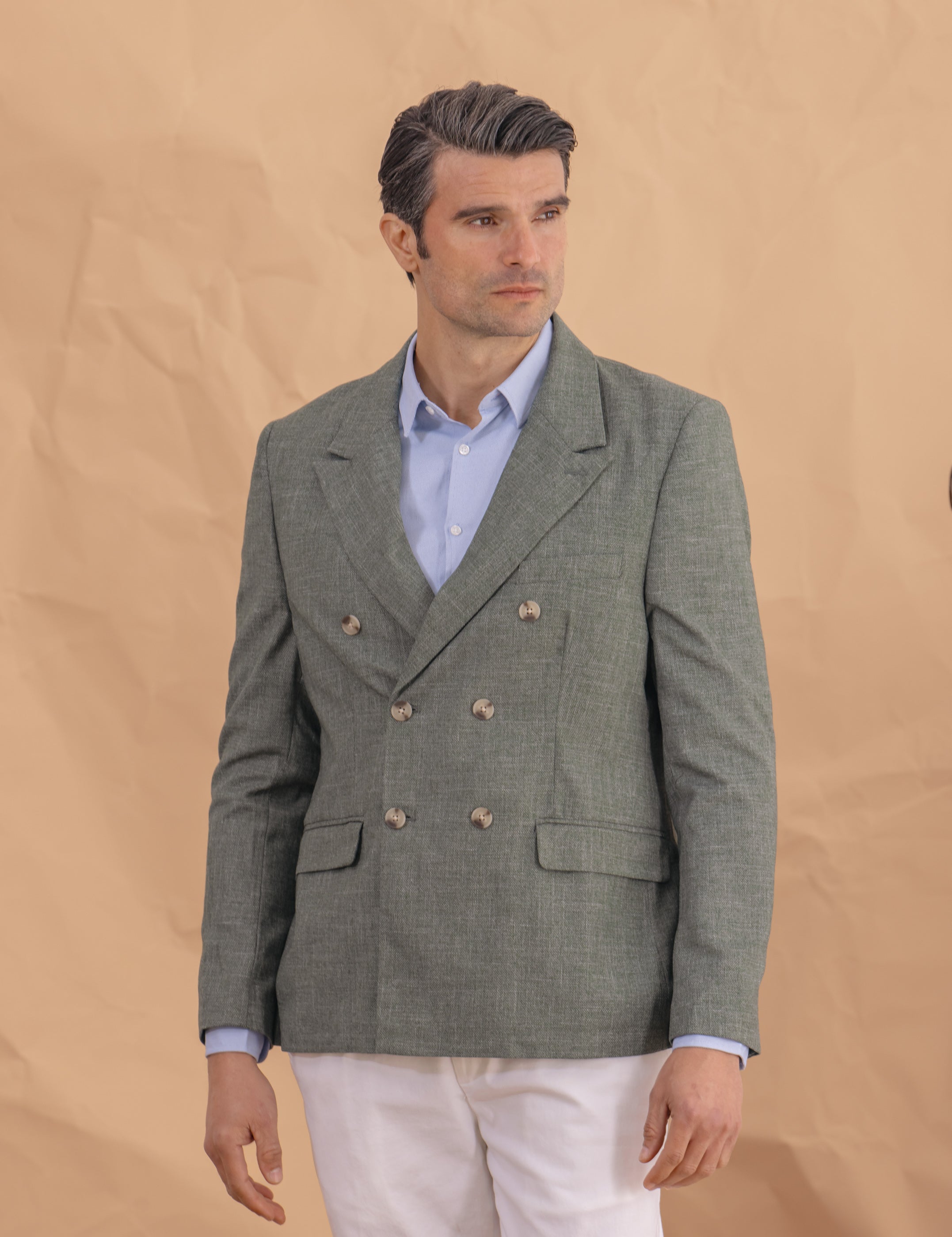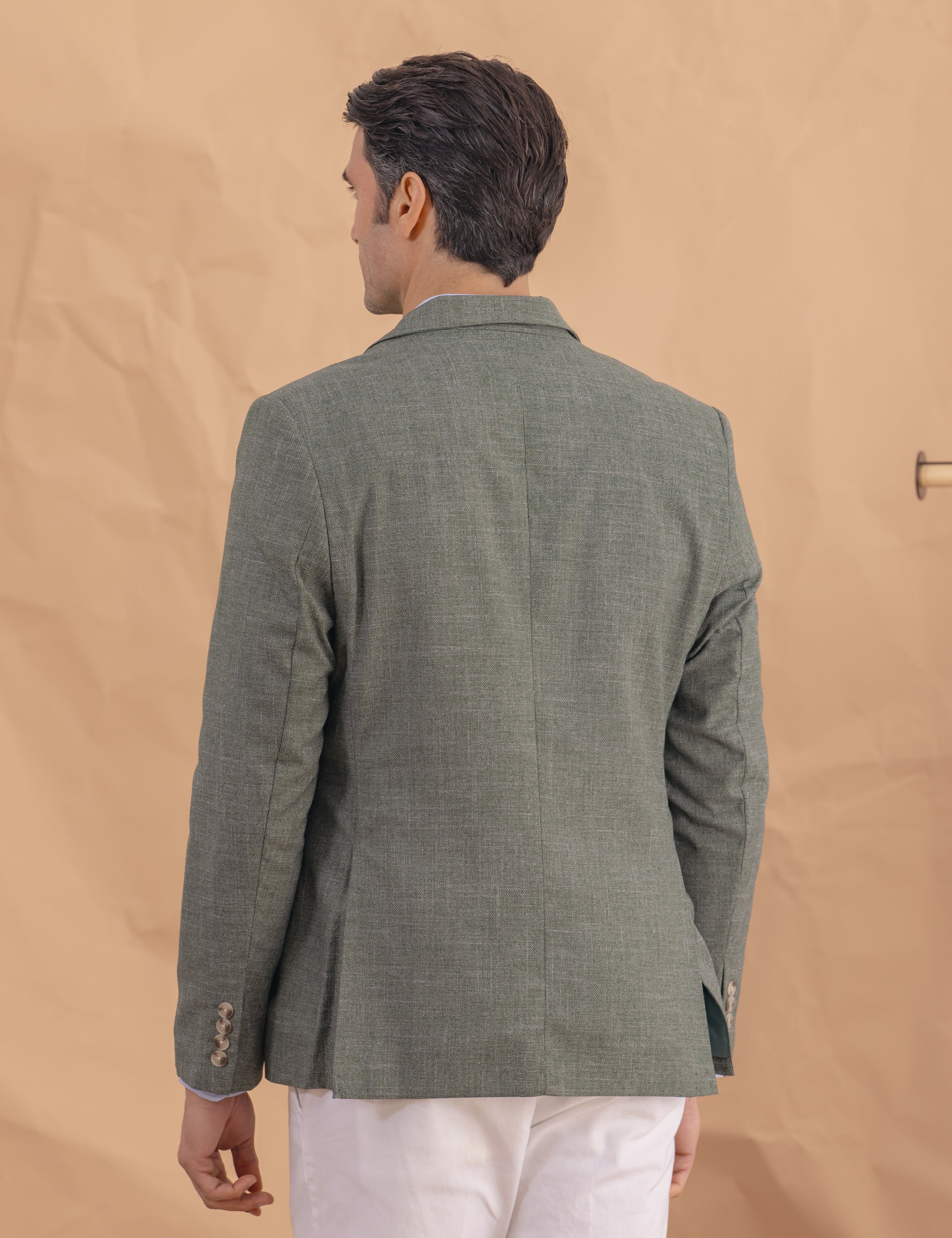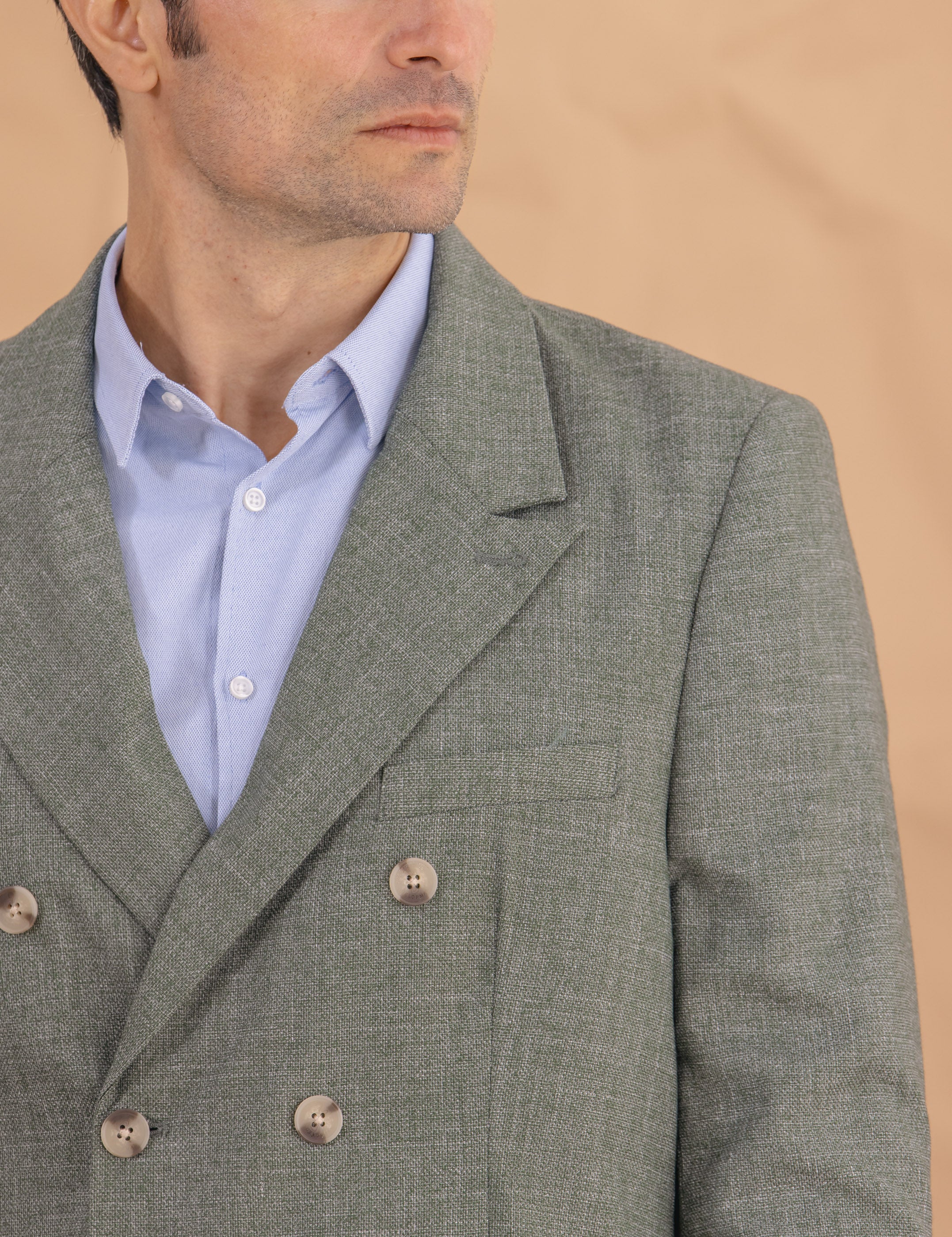 Blazer casual para hombre en color verde con cierre cruzado mediante botones y con cuello y solapa. Bolsillo en el pecho, dos bolsillos de solapa en la cintura y puños con botones en su terminación. Interior forrado y con bolsillos. |