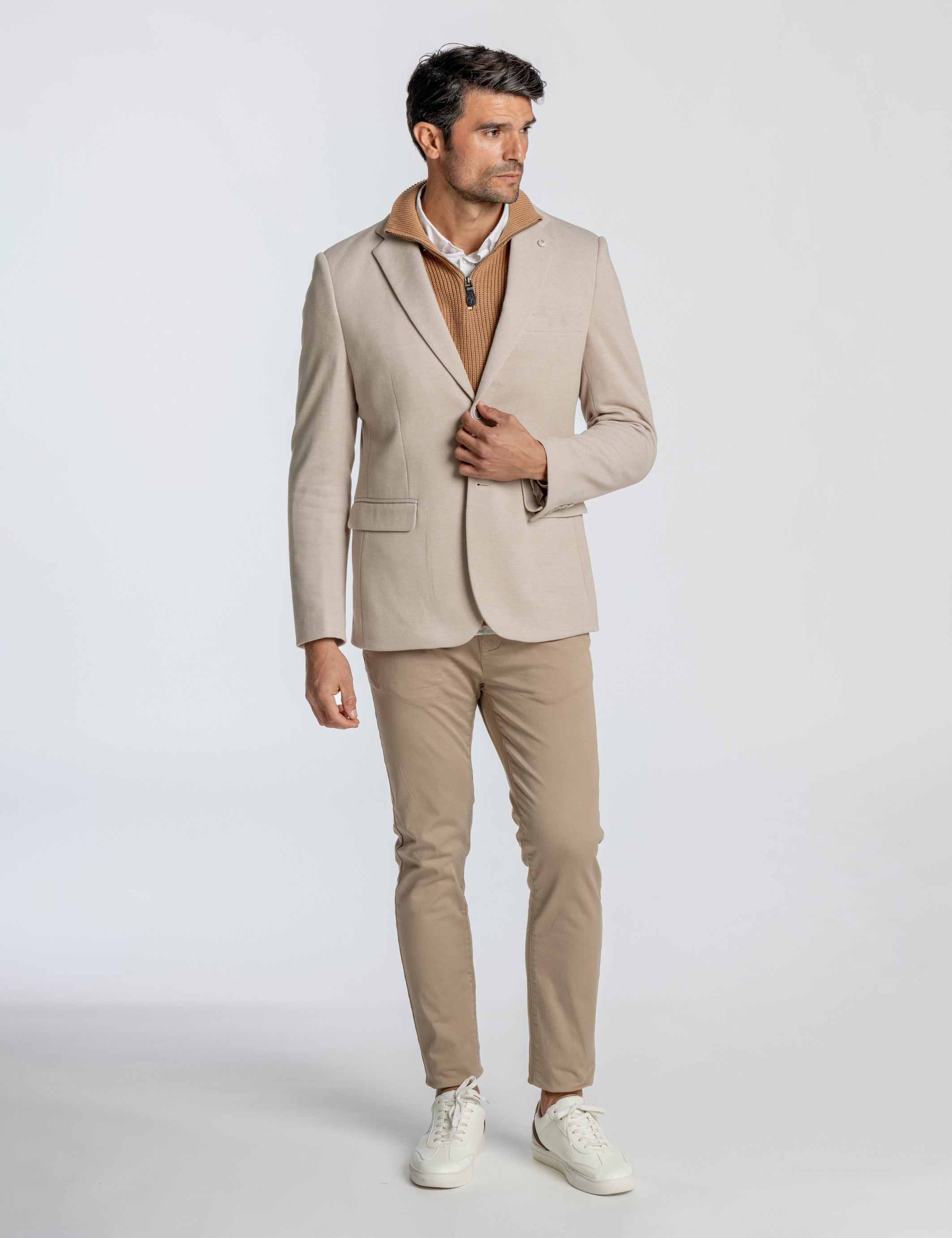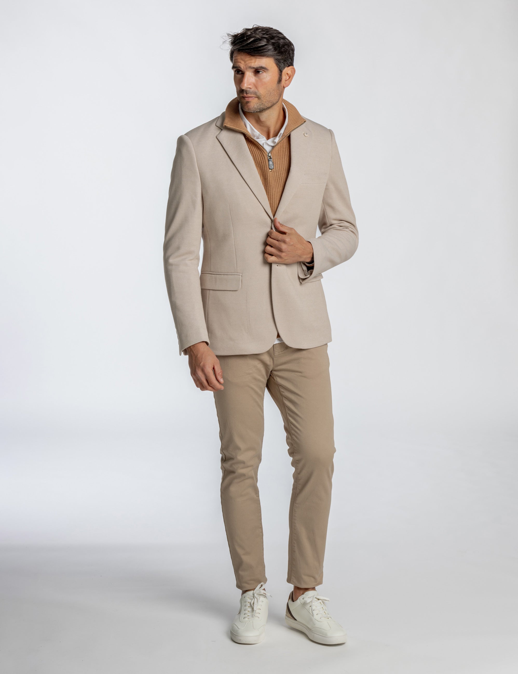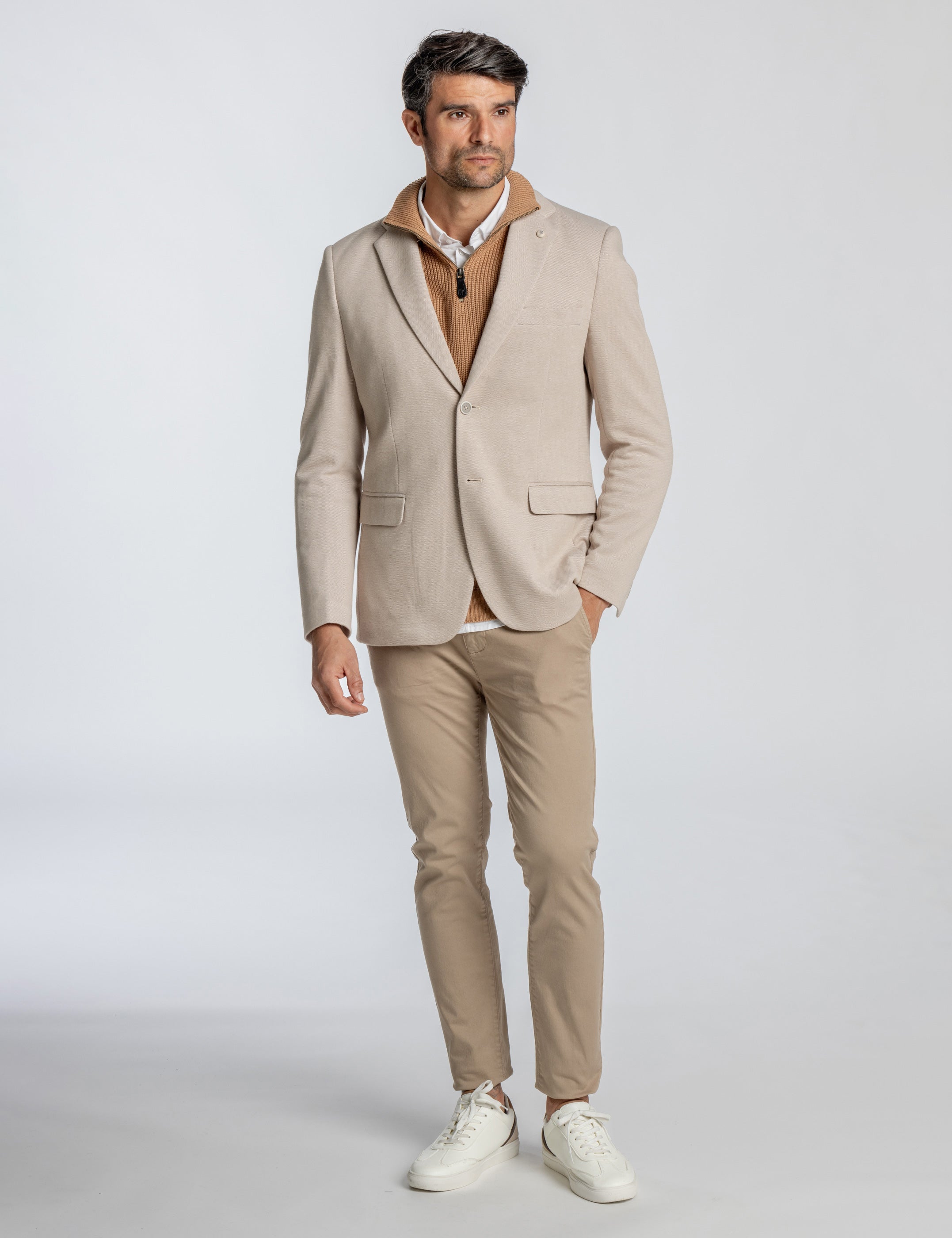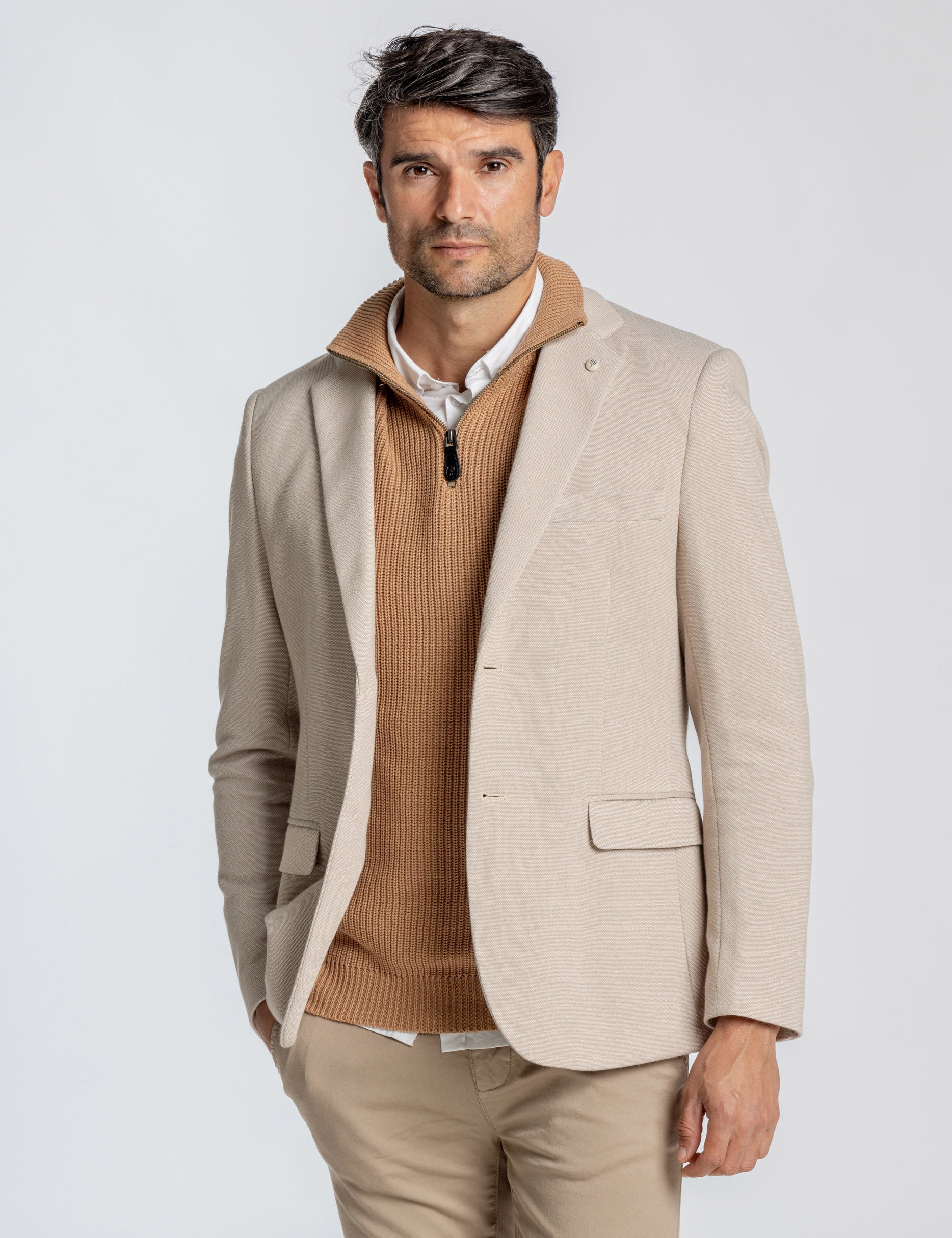 Blazer casual de punto para hombre en color beige con cierre central simple mediante botones y con cuello y solapa. Bolsillo de ojal en el pecho, dos bolsillos de solapa en la cintura y puños con botones en su terminación. Interior forrado y con bolsillos.