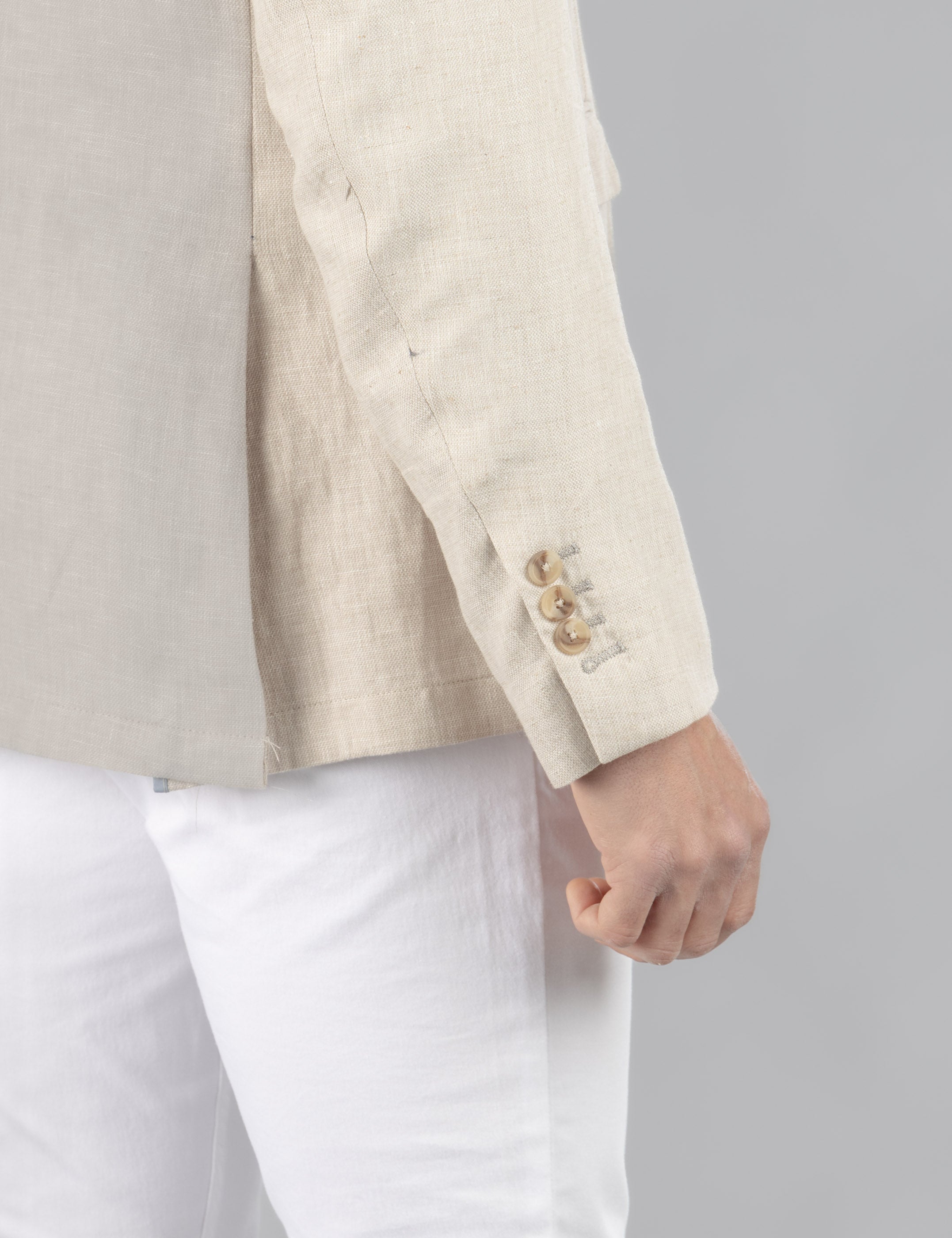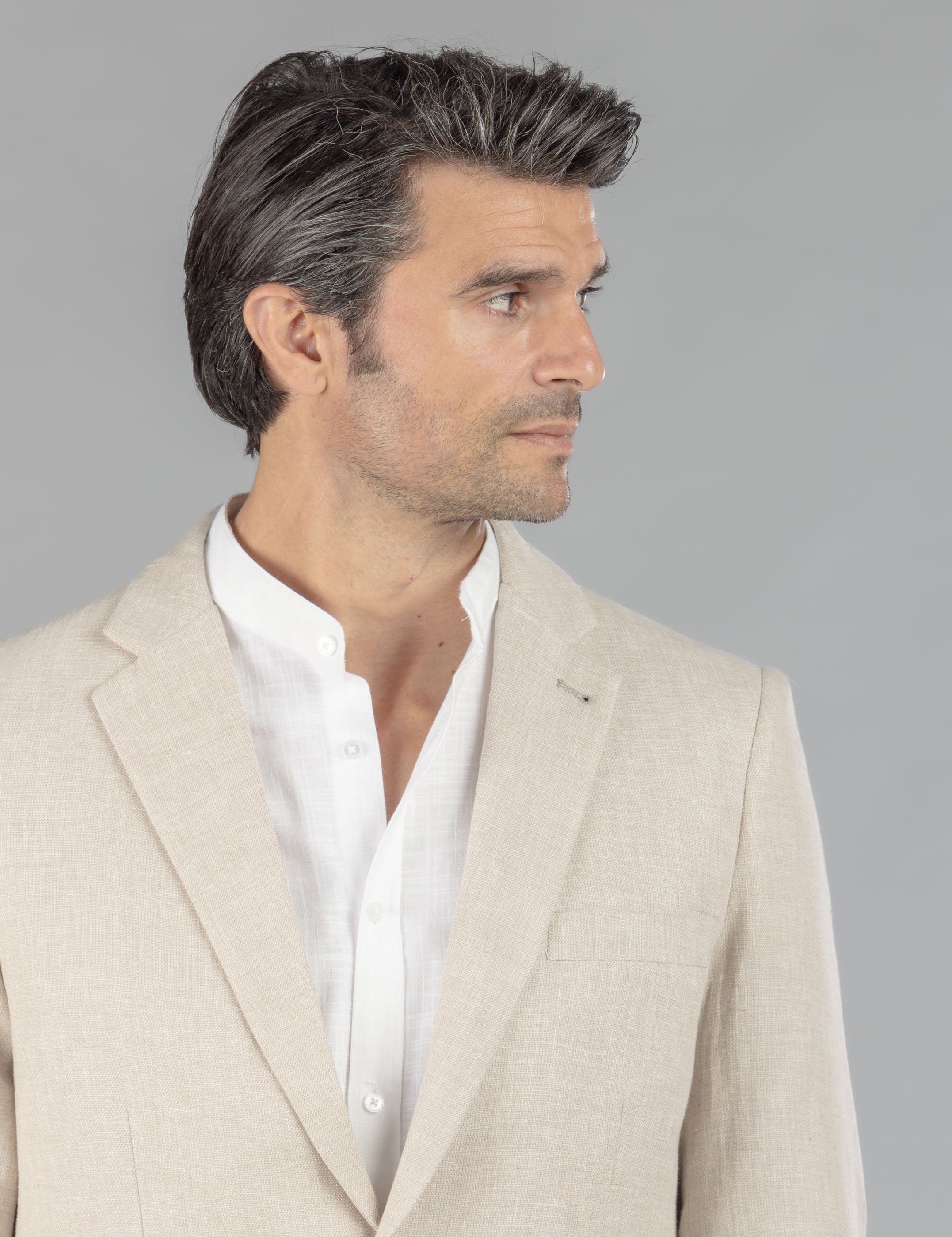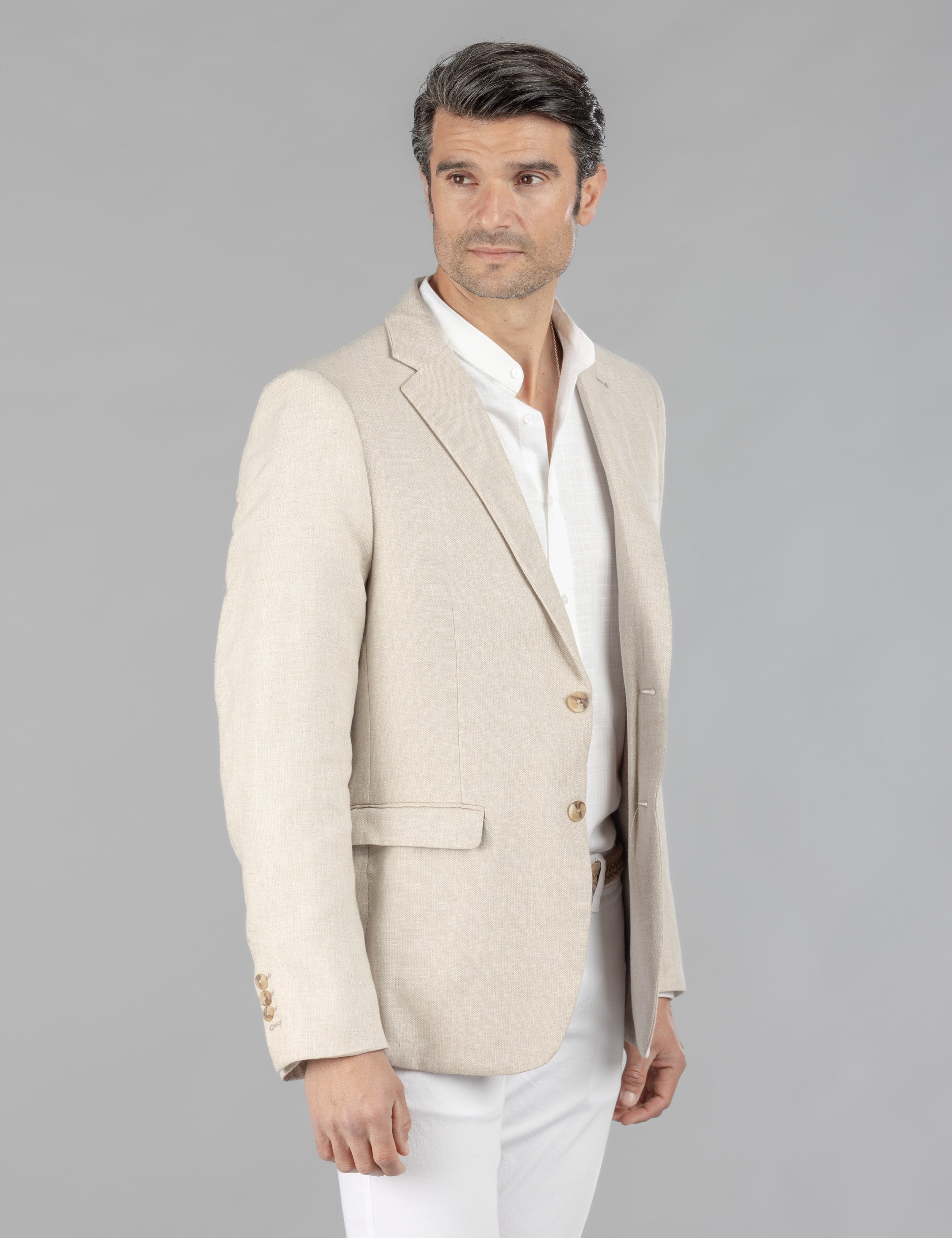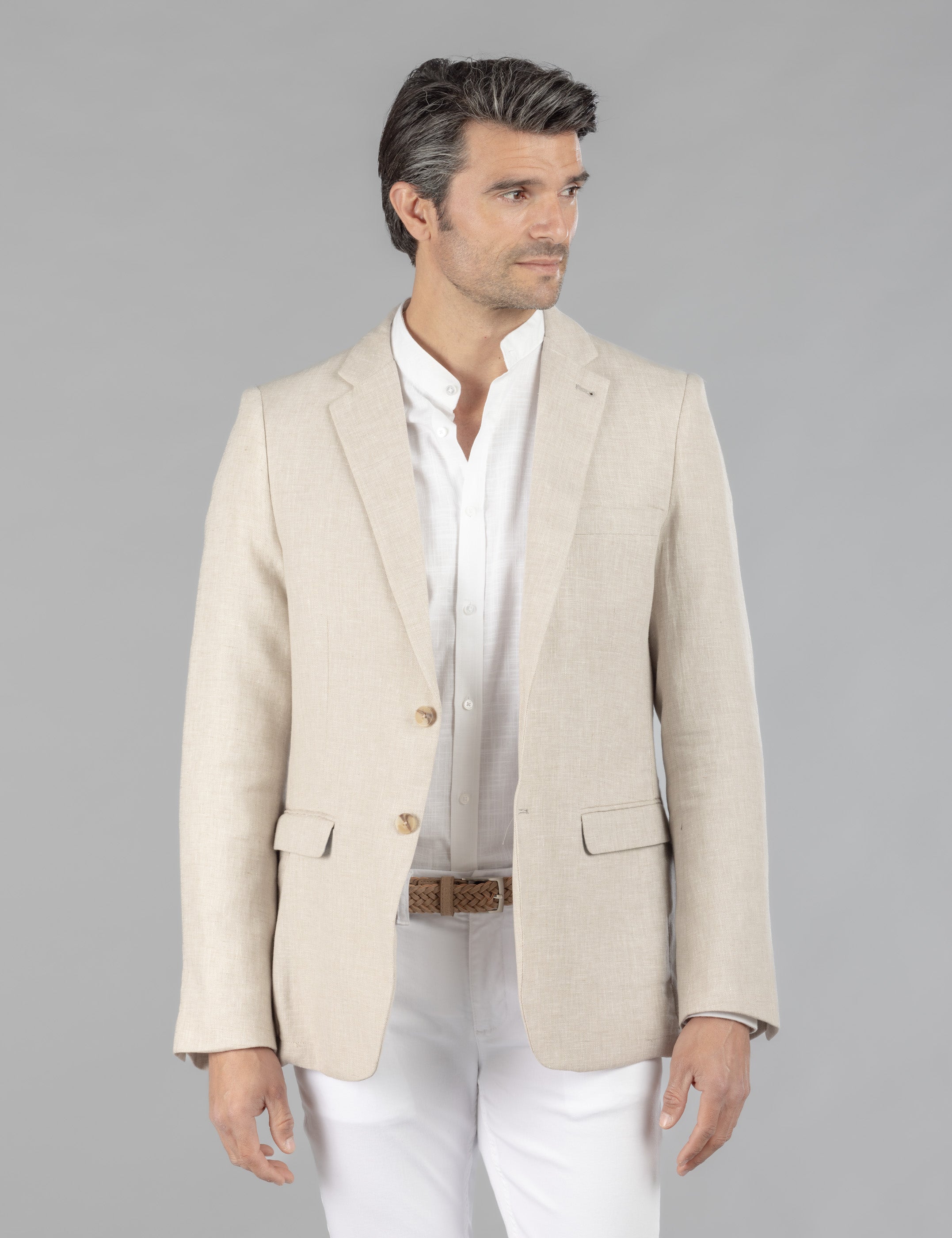 Chaqueta beige para hombre confeccionada en 55% lino y 45% algodón con cierre central simple mediante botones y con cuello y solapa. Dos bolsillos de solapa en la cintura y puños con botones en su terminación.