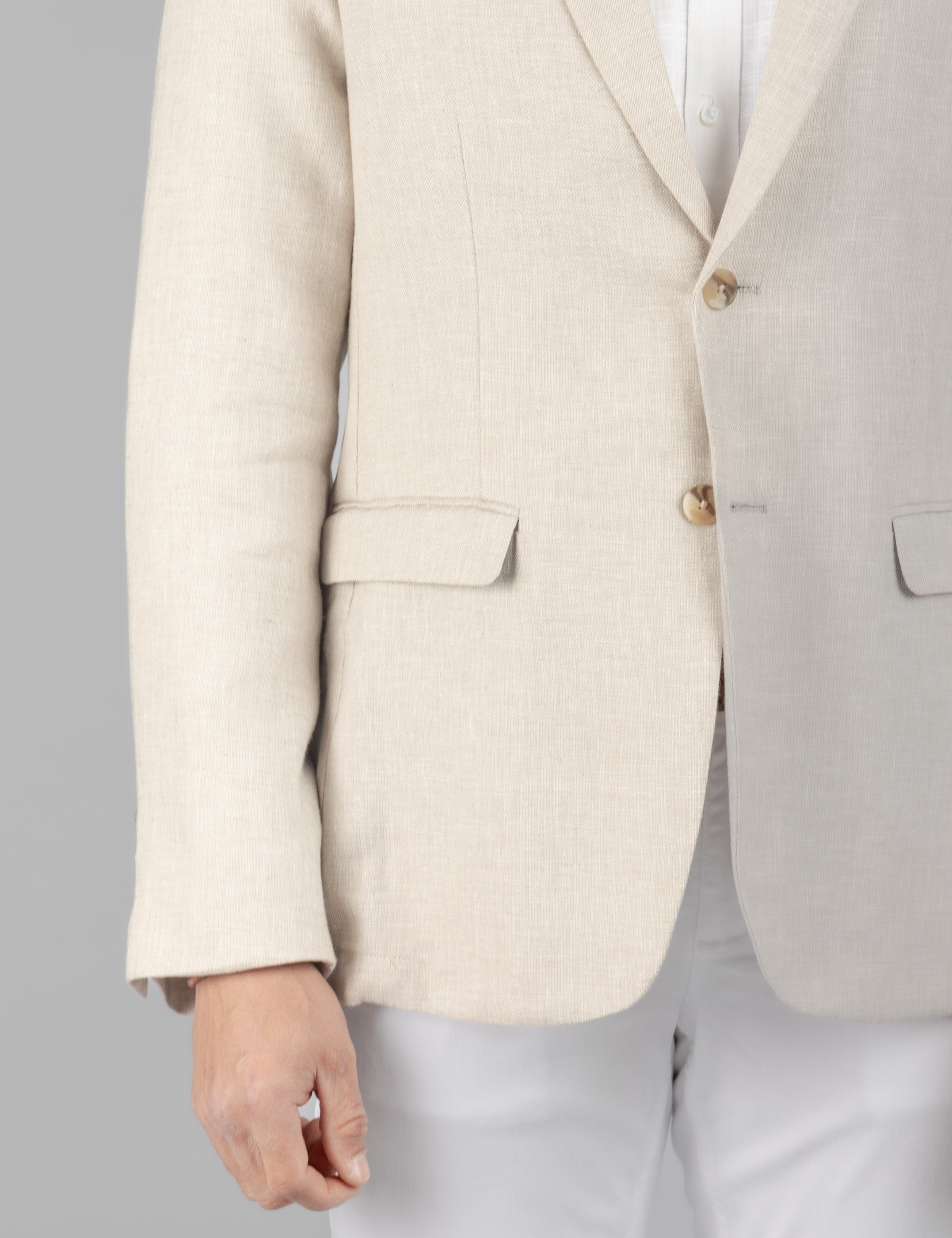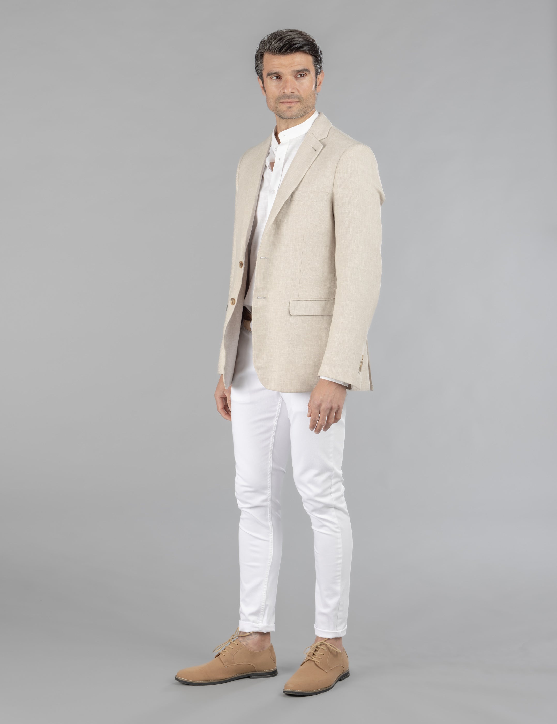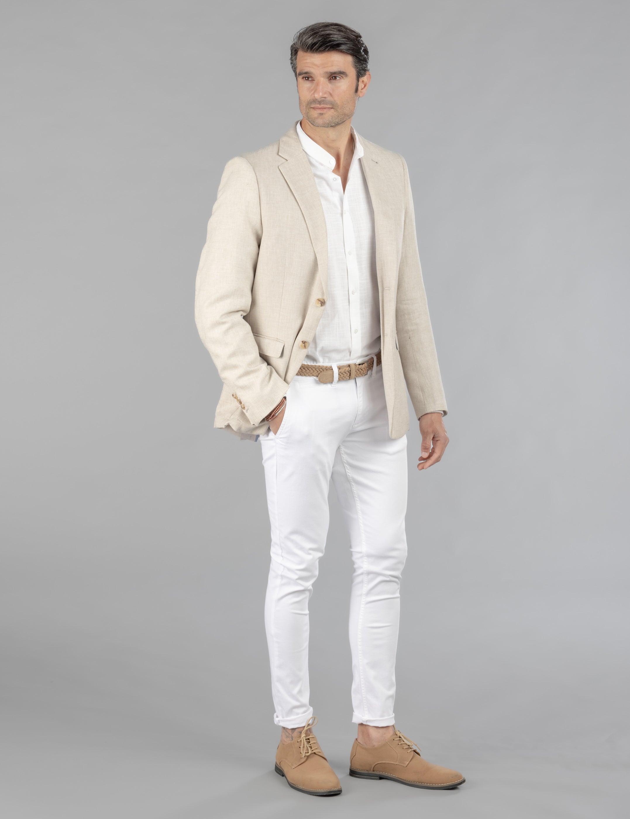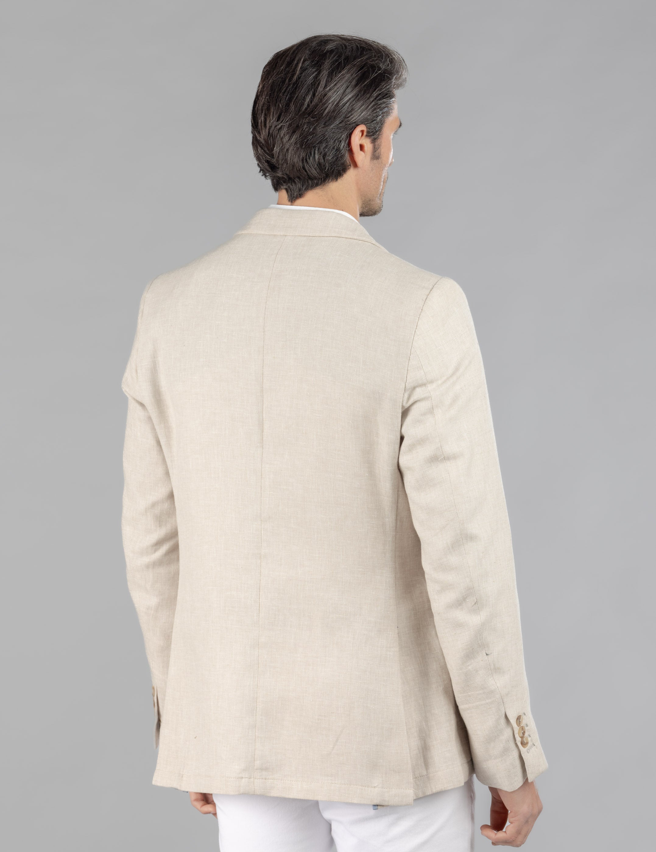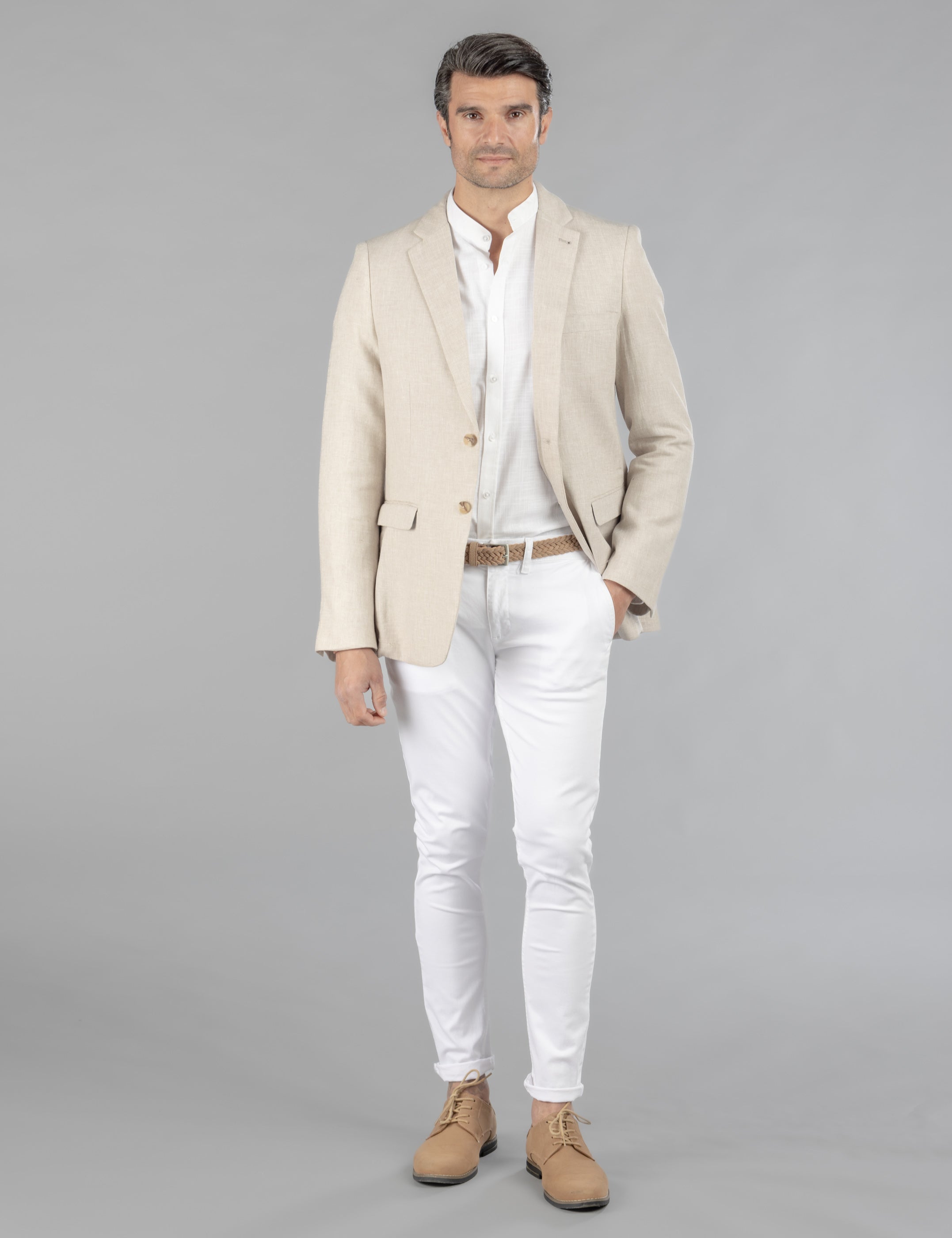 Chaqueta beige para hombre confeccionada en 55% lino y 45% algodón con cierre central simple mediante botones y con cuello y solapa. Dos bolsillos de solapa en la cintura y puños con botones en su terminación.