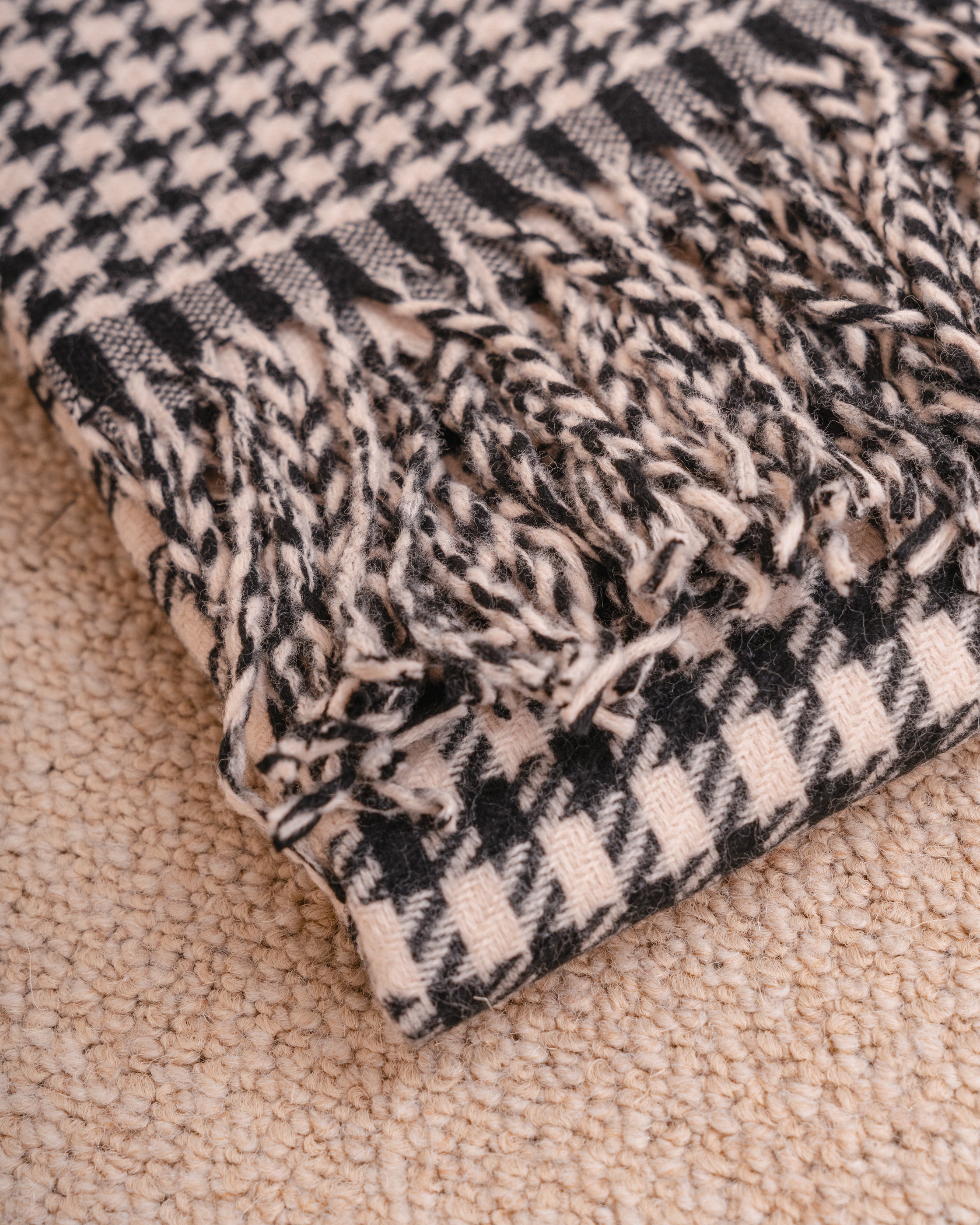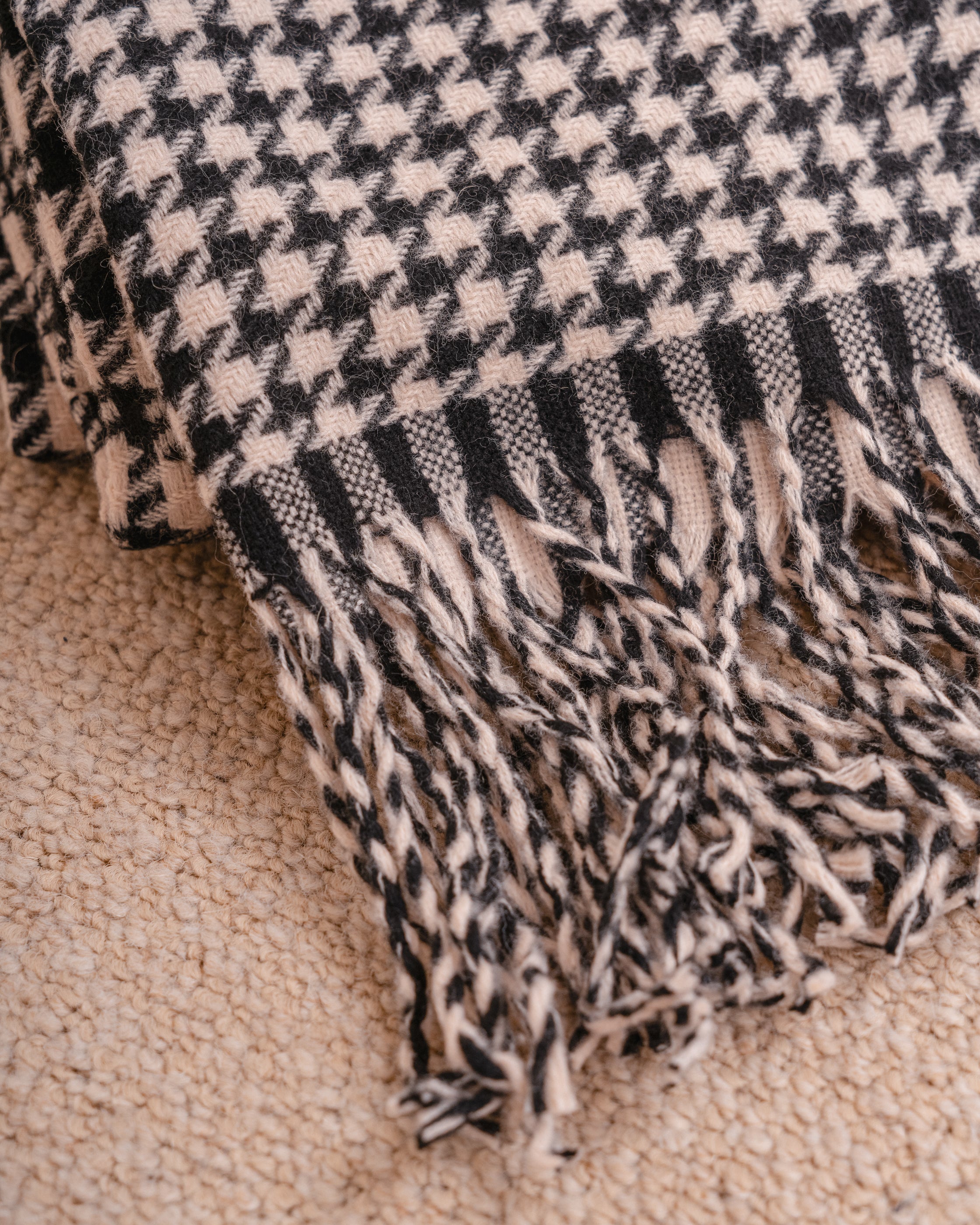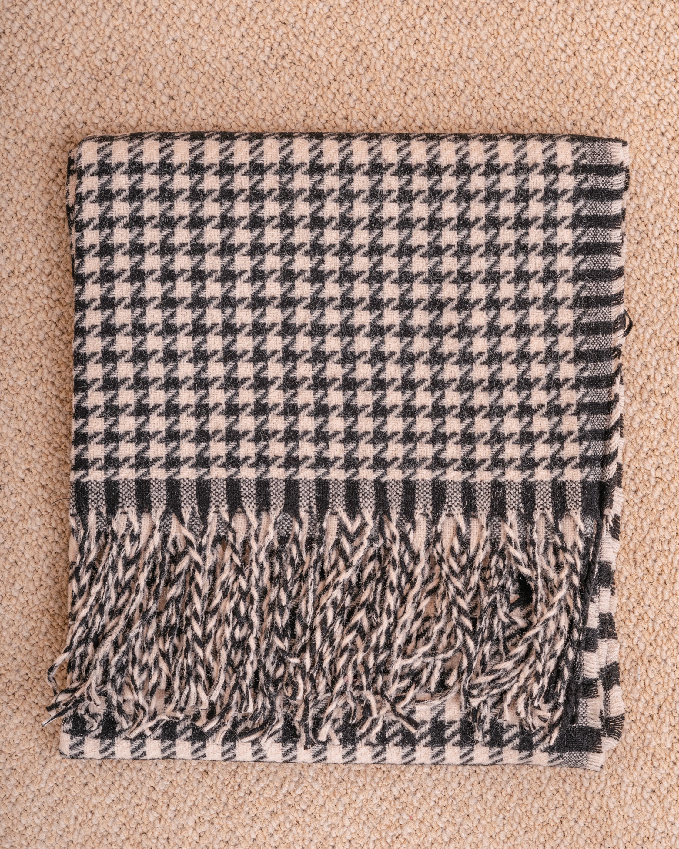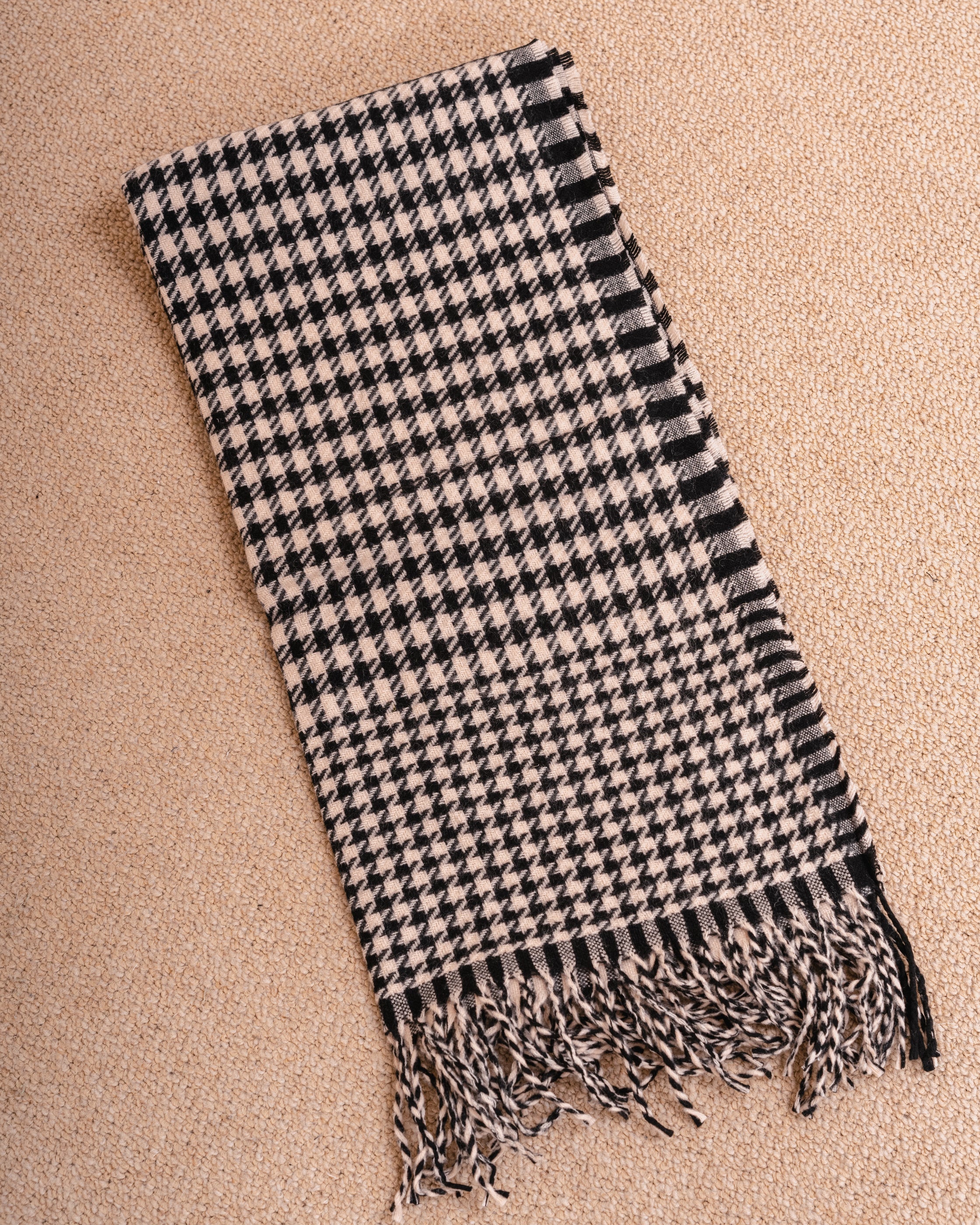 Bufanda en color blanco y negro con diseño a cuadros y flecos en los extremos.