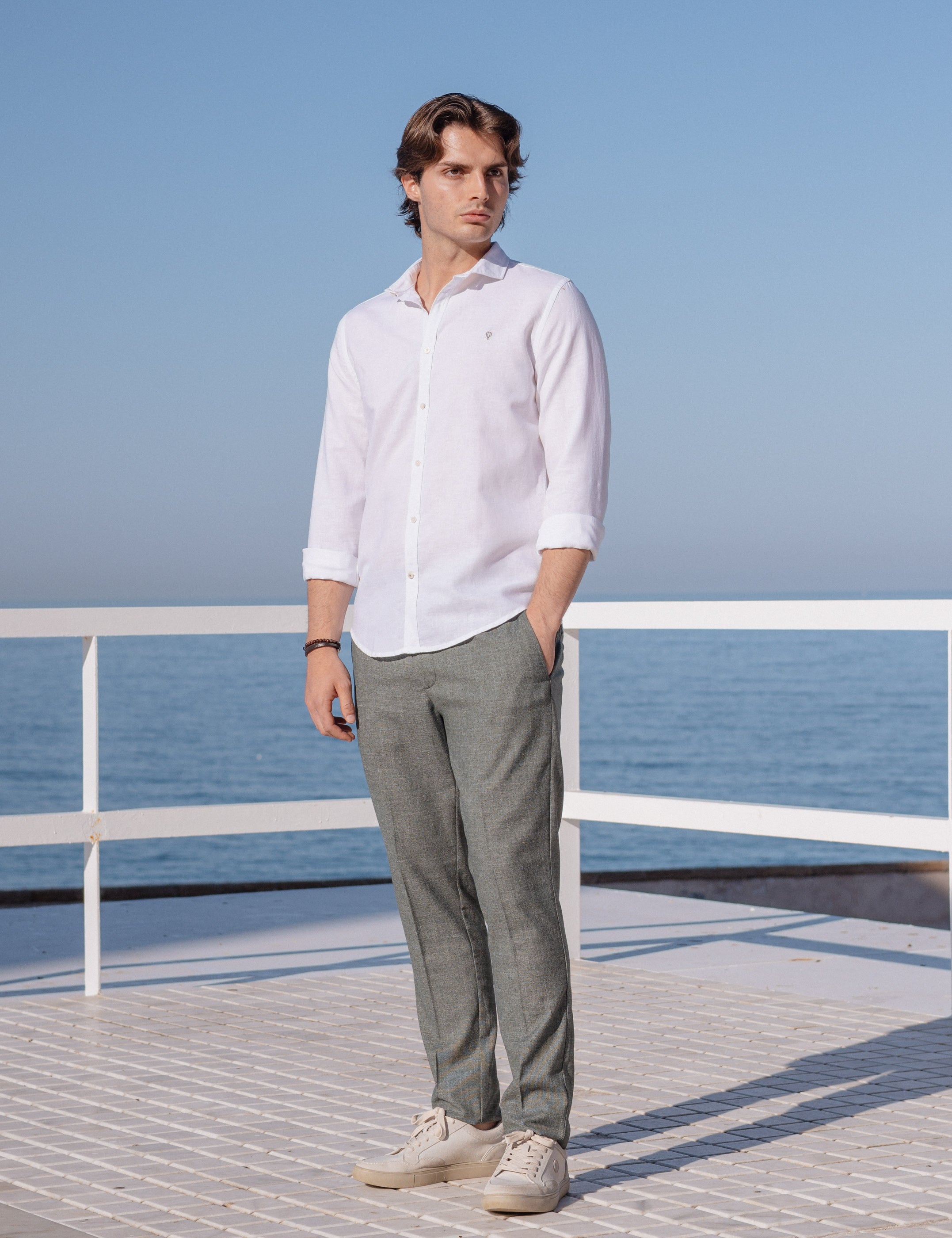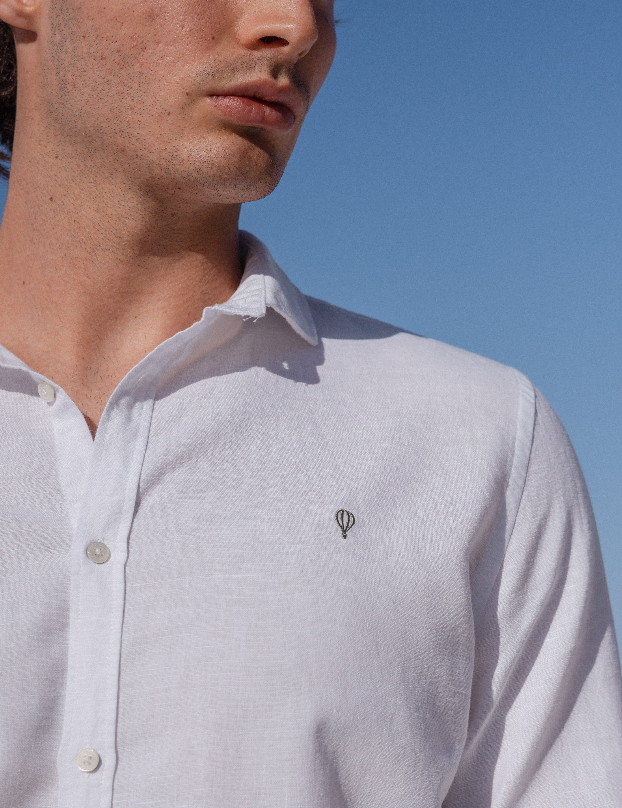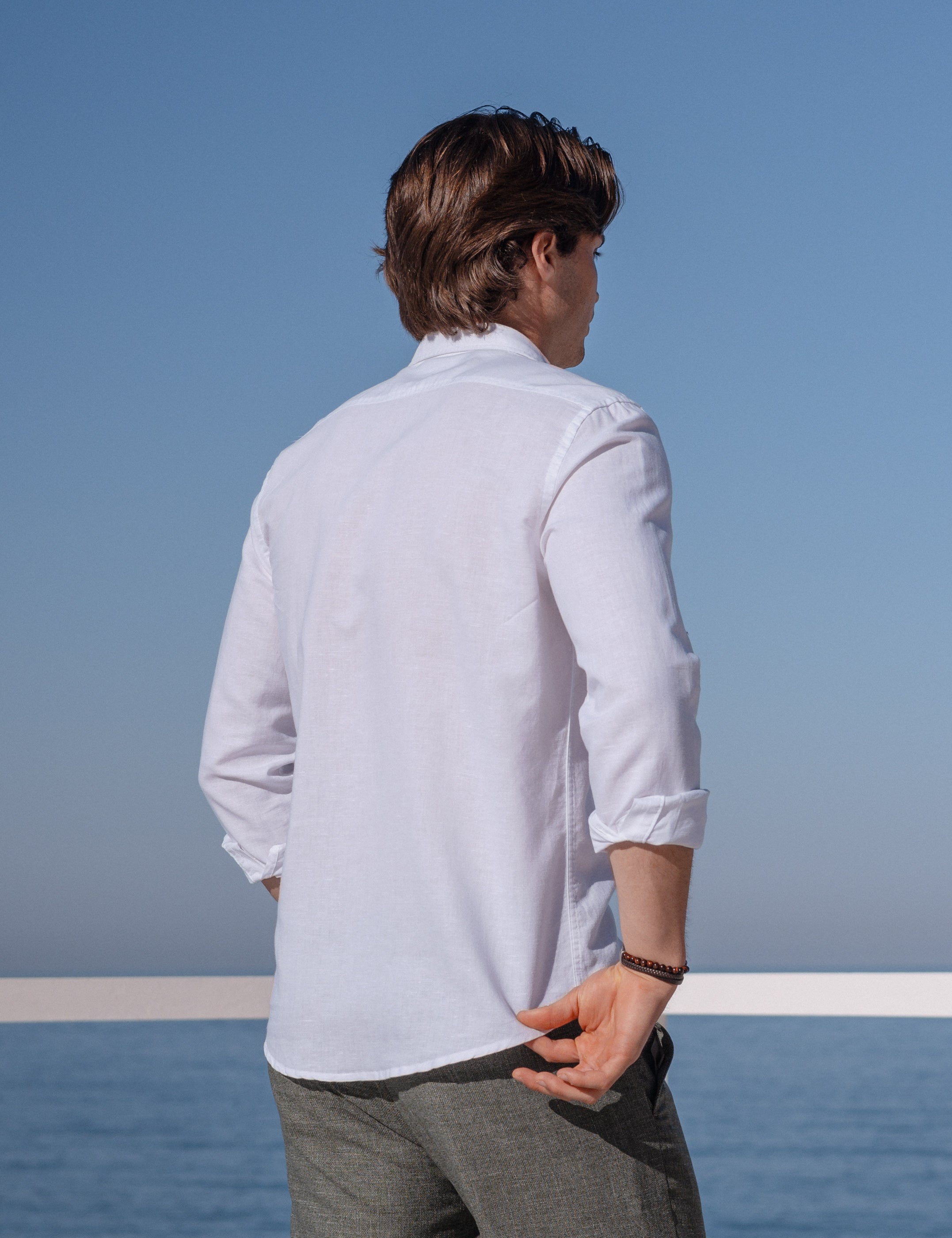Camisa lisa de color blanca para hombre confeccionada en 55% Lino 45% algodón. Cuello sin botón, mangas largas, puños simples y logo bordado a contraste en la parte frontal a la altura del pecho. Corte regular fit.