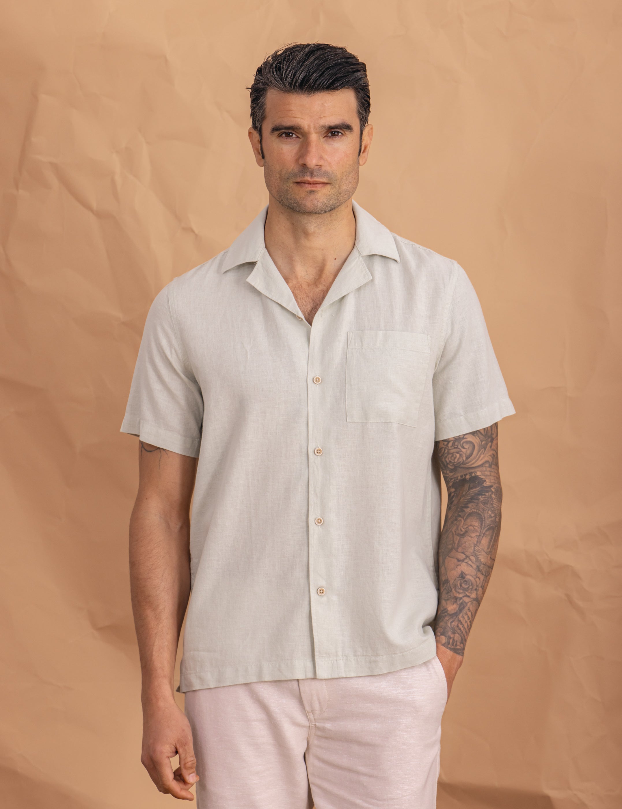 Camisa de color verde manzana para hombre confeccionada en 51% Lino 49% algodón. Cuello sin botón, mangas cortas y bolsillo en la parte frontal a la altura del pecho. Corte regular fit.