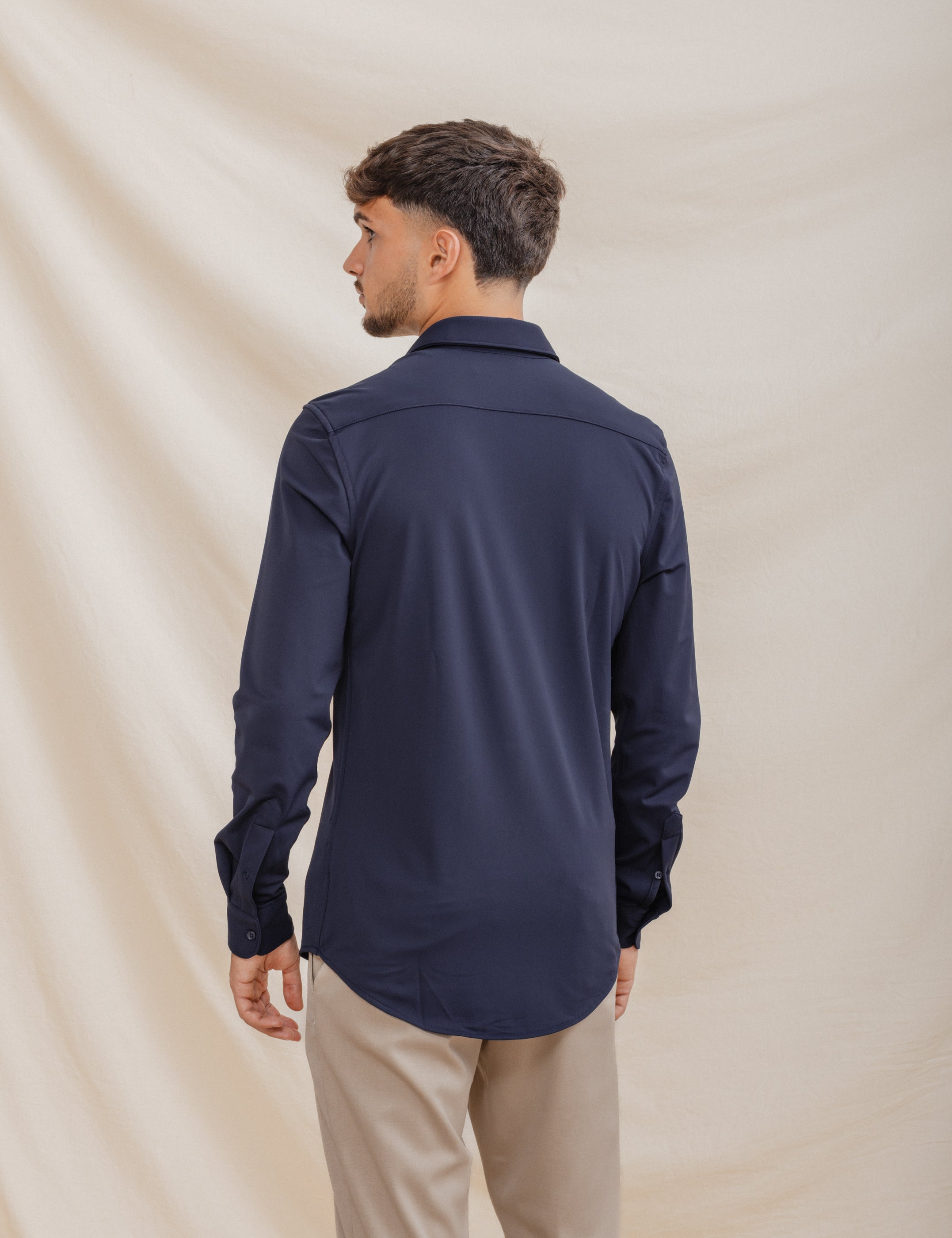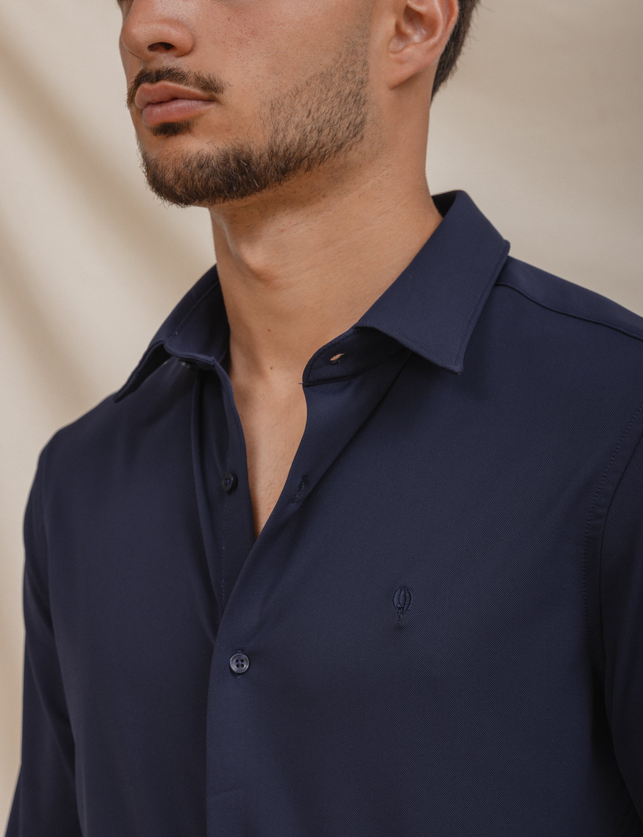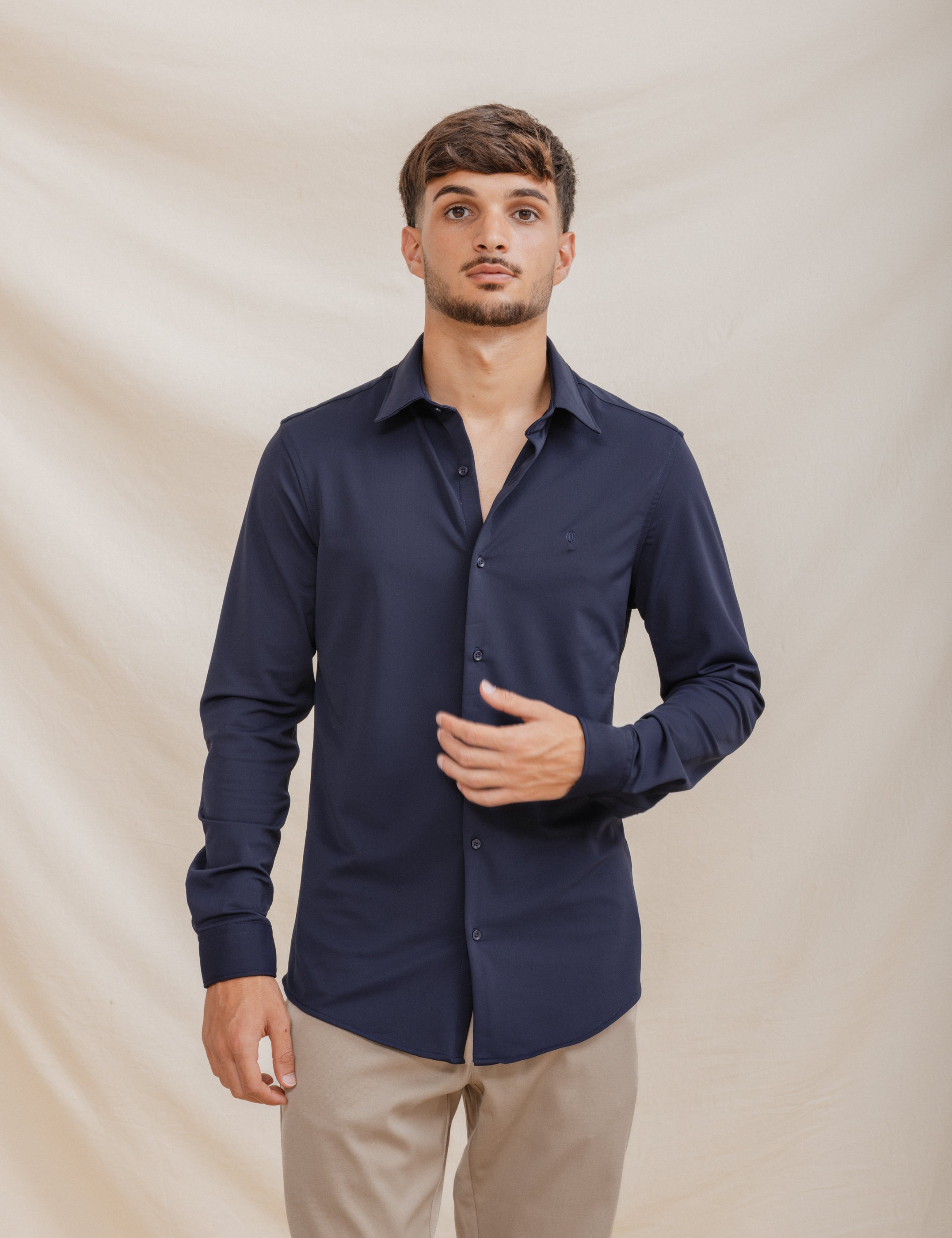 Camisa elástica para hombre en color azul confeccionada en 88% poliamida y 12% elastano . Camisa de mangas largas y puños simples y cuello sin botón. Corte regular fit. Logo al tono a la altura del pecho.