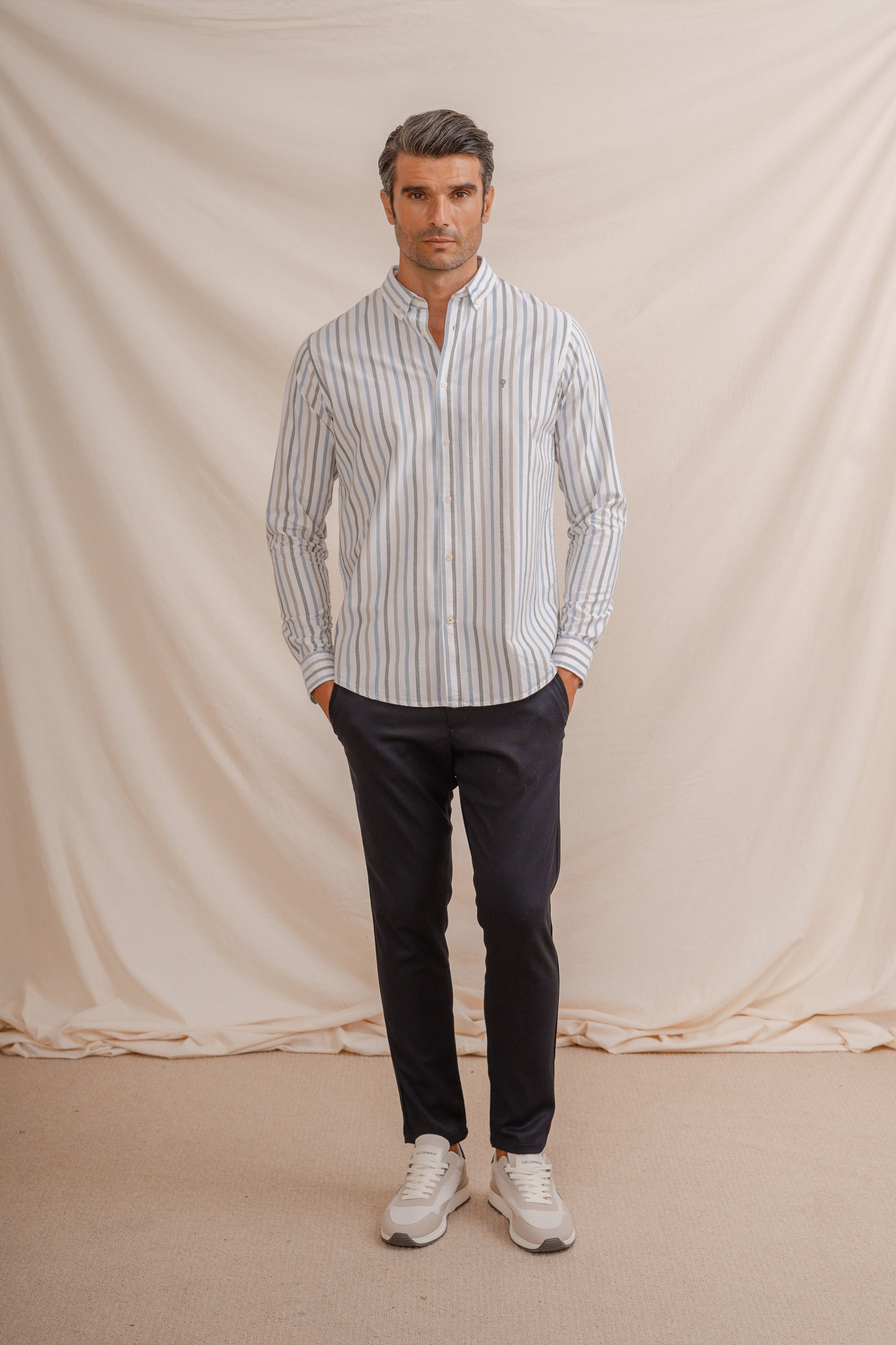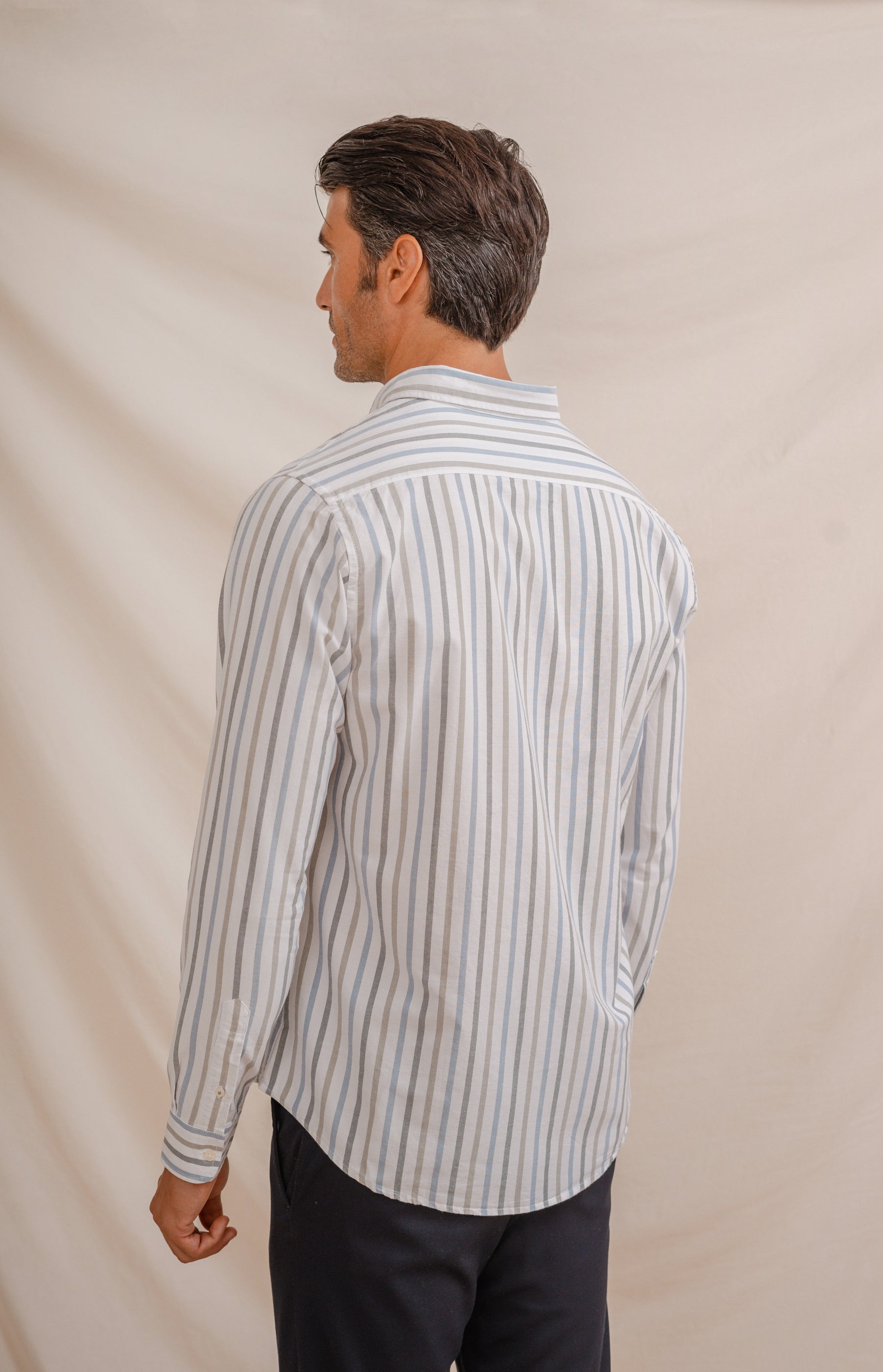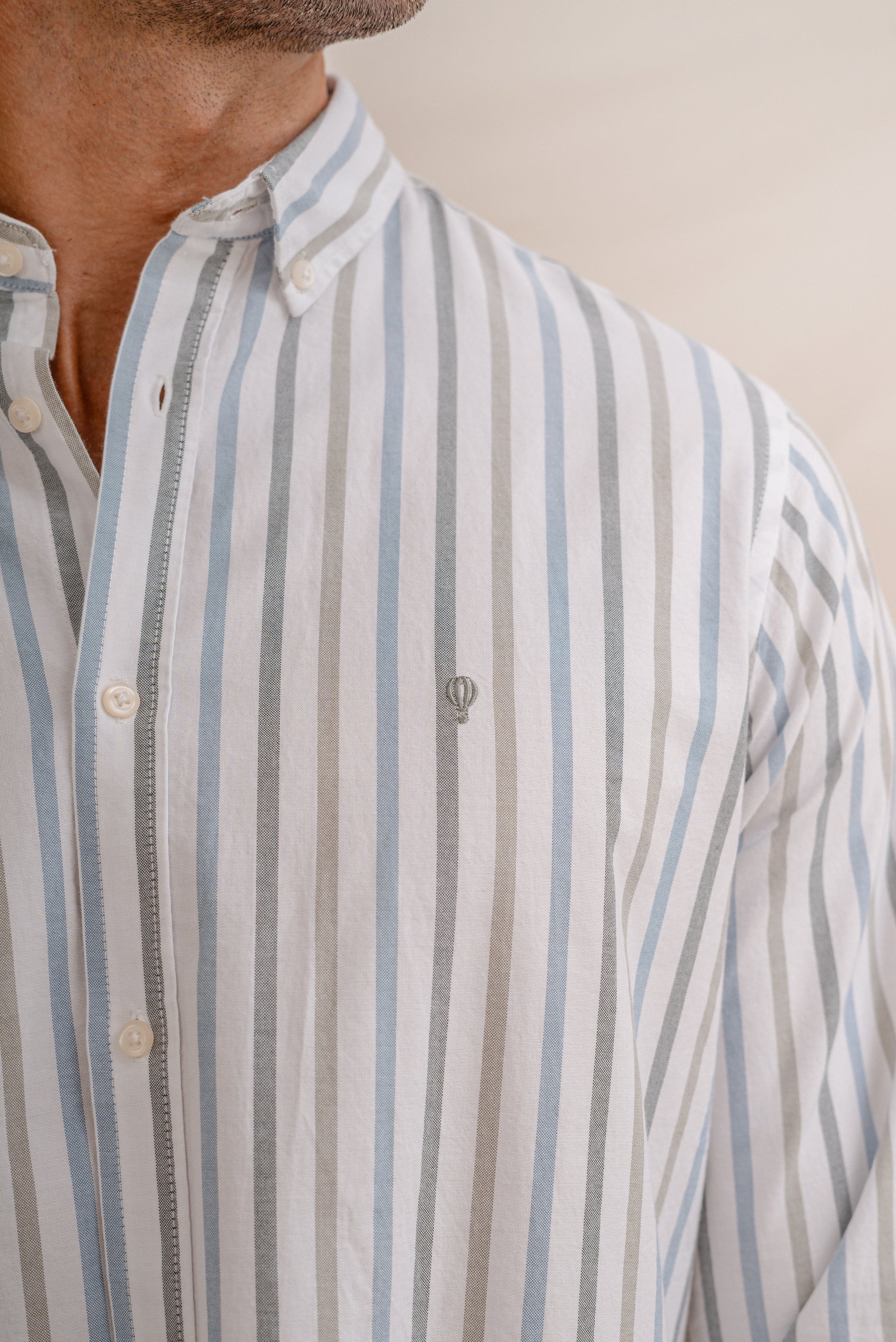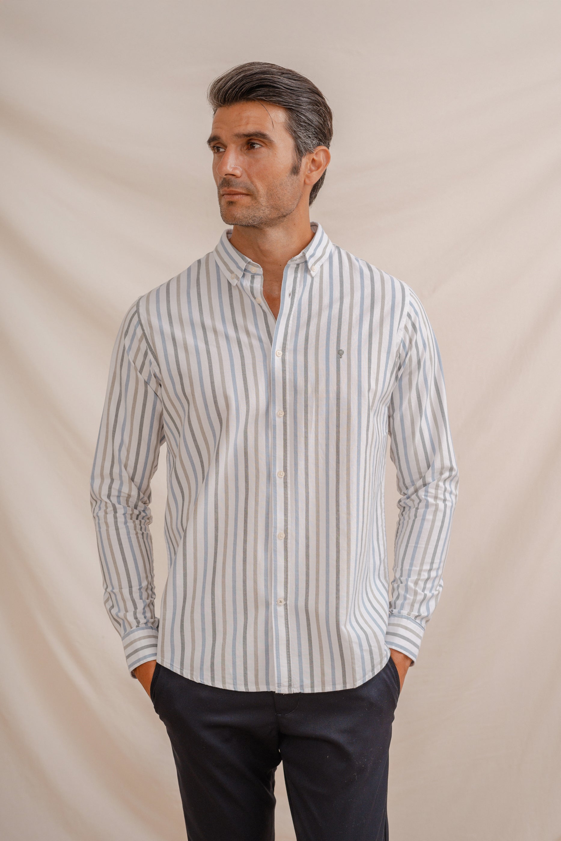 Camisa de hombre con rayas diplomáticas en tonos verdes, confeccionada en 100% algodón. Cuello con botón, manga larga y puños simples. Logo bordado a la altura del pecho. Corte regular fit.