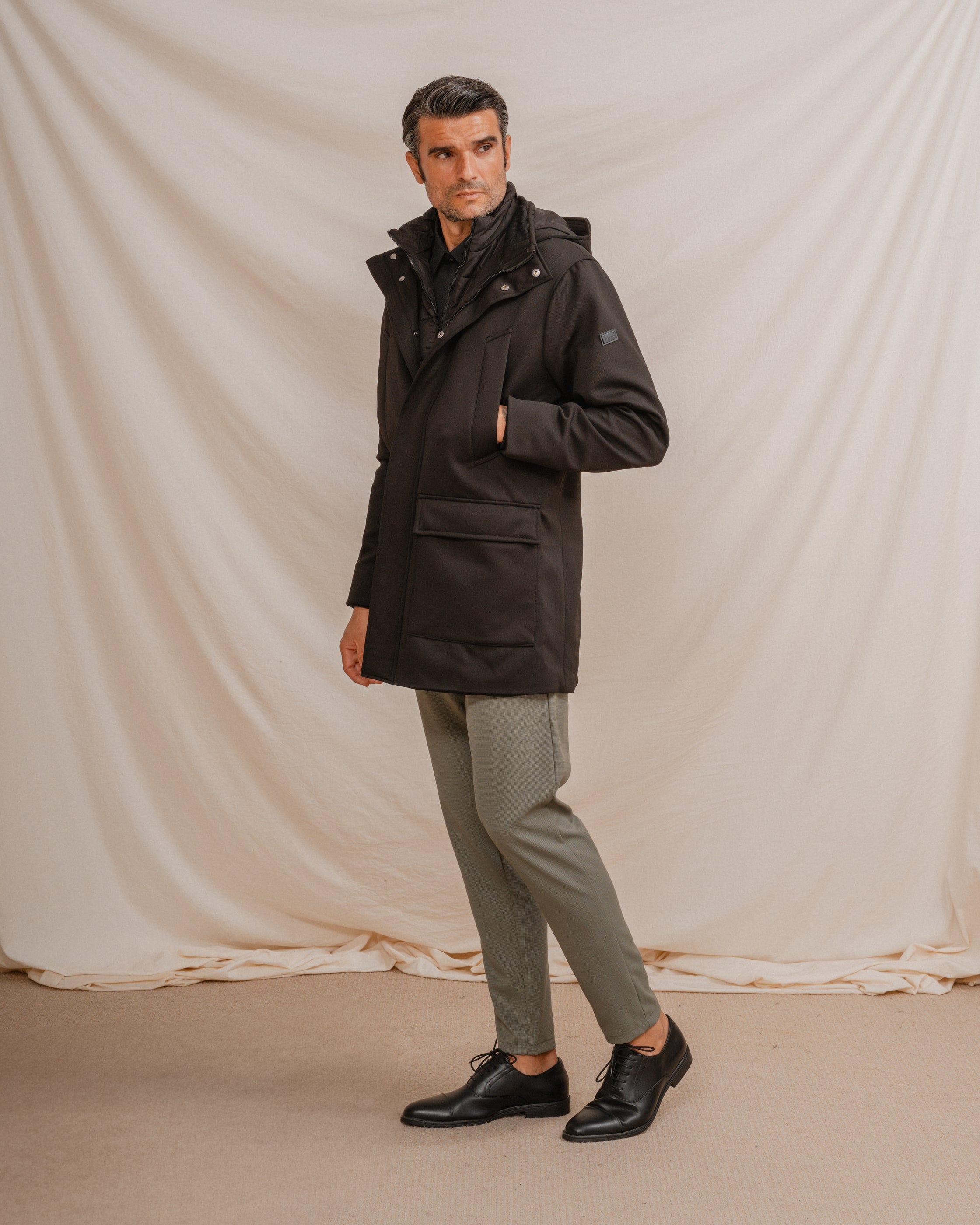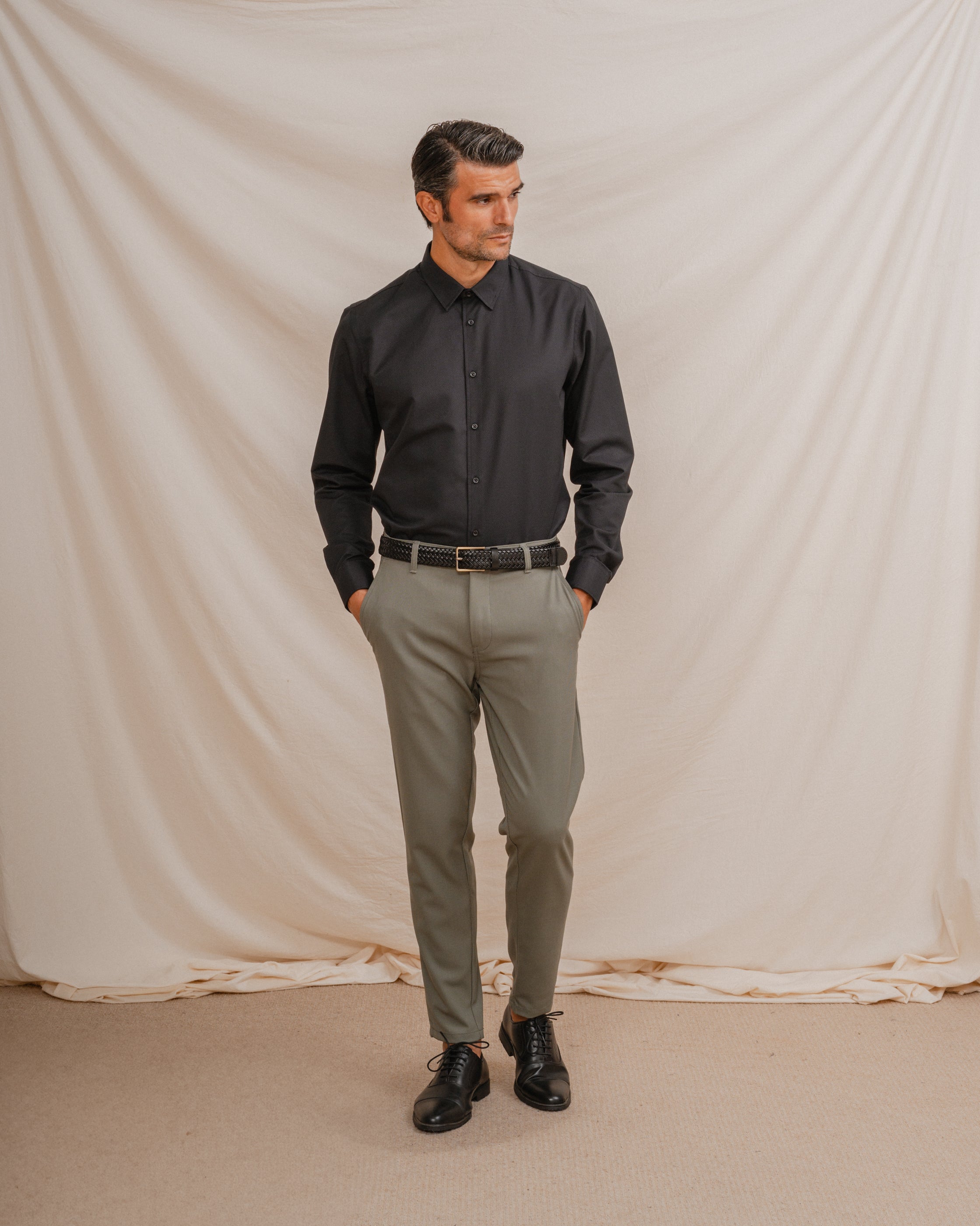 Camisa de vestir para hombre en color negra confeccionada en 62% algodón y 38% poliester. Camisa de mangas largas y puños simples y cuello sin botón. Corte regular fit.