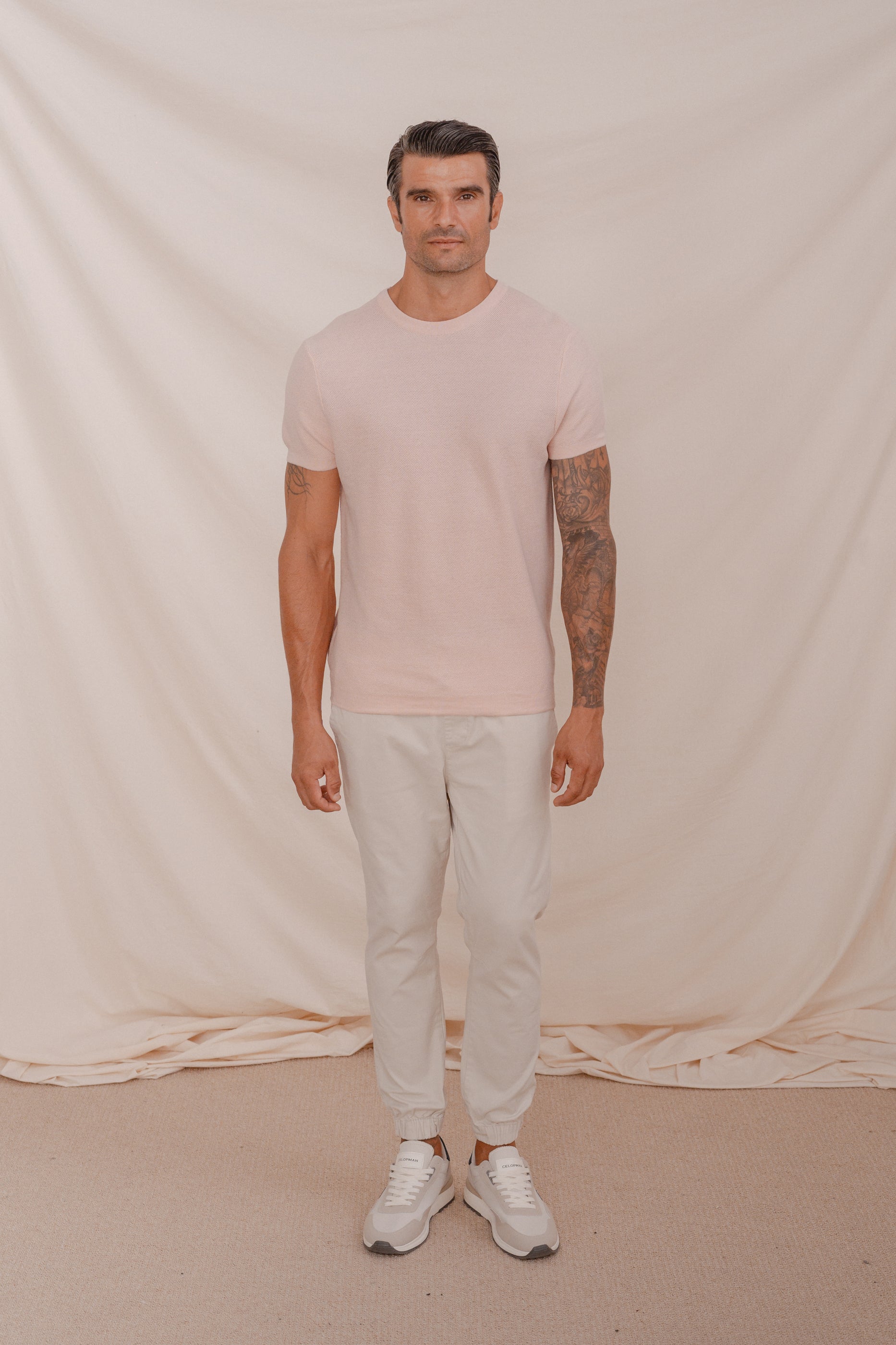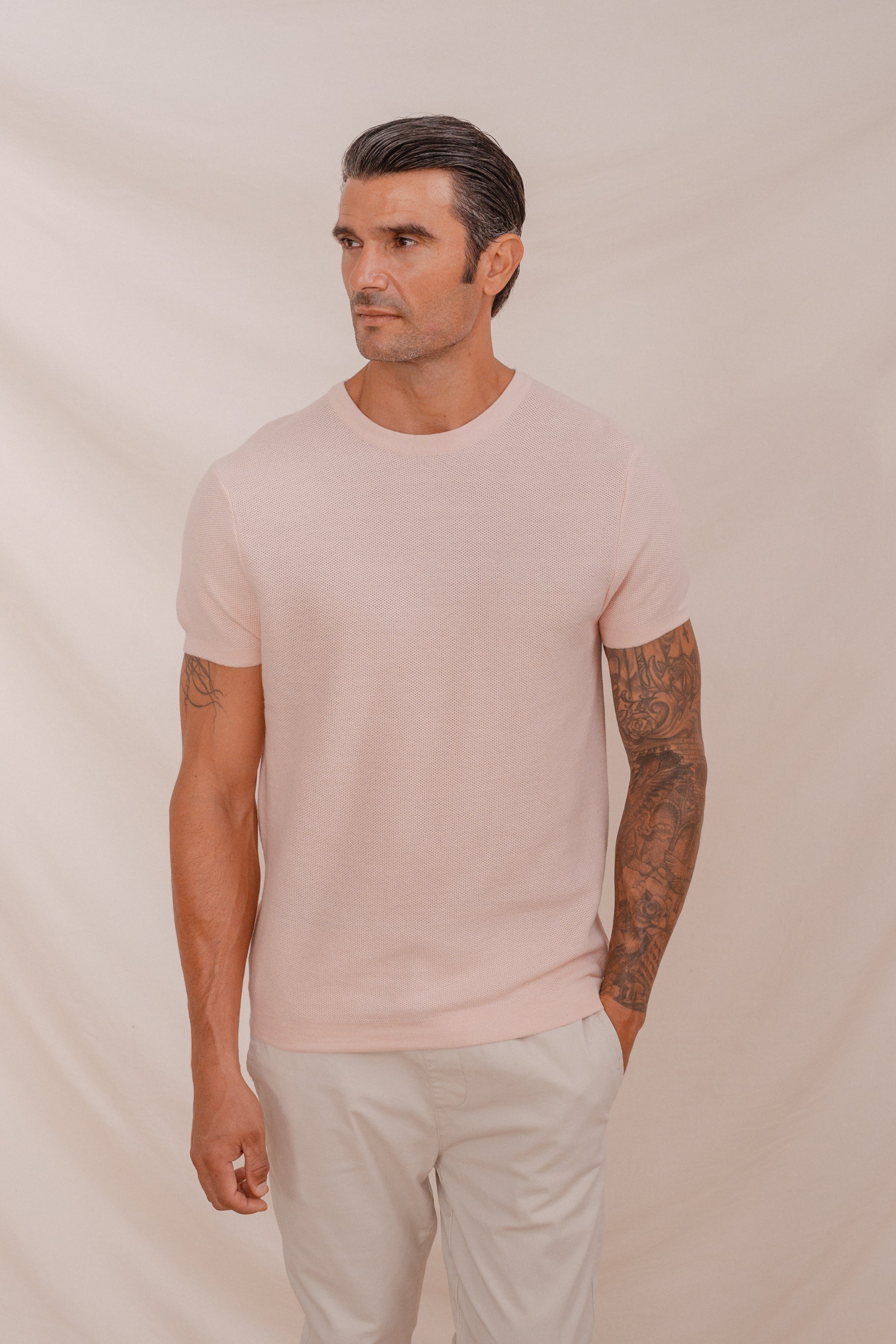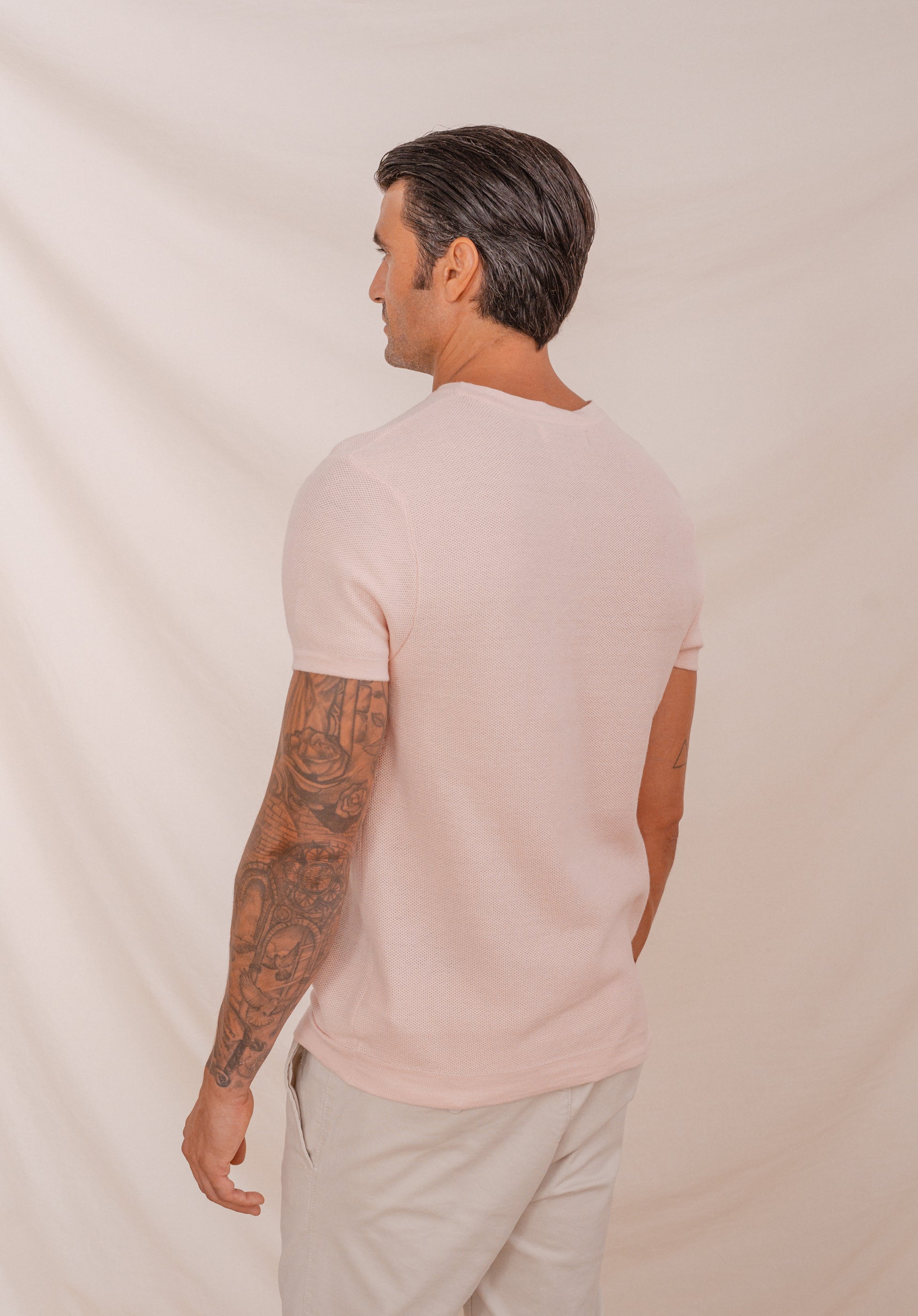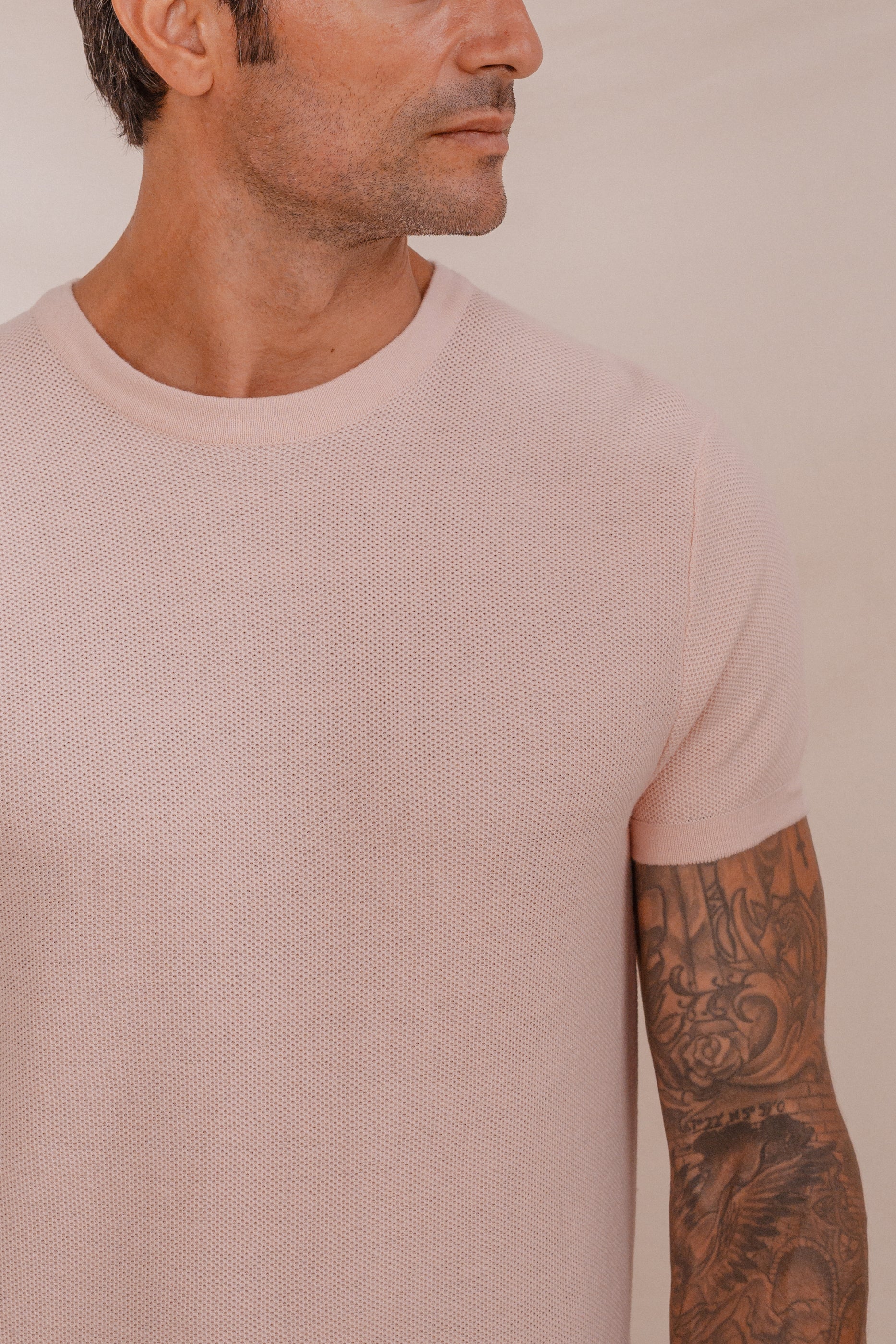 Camiseta tricot con estructura rosa para hombre. Cuello a la caja y manga corta. Corte regular fit.