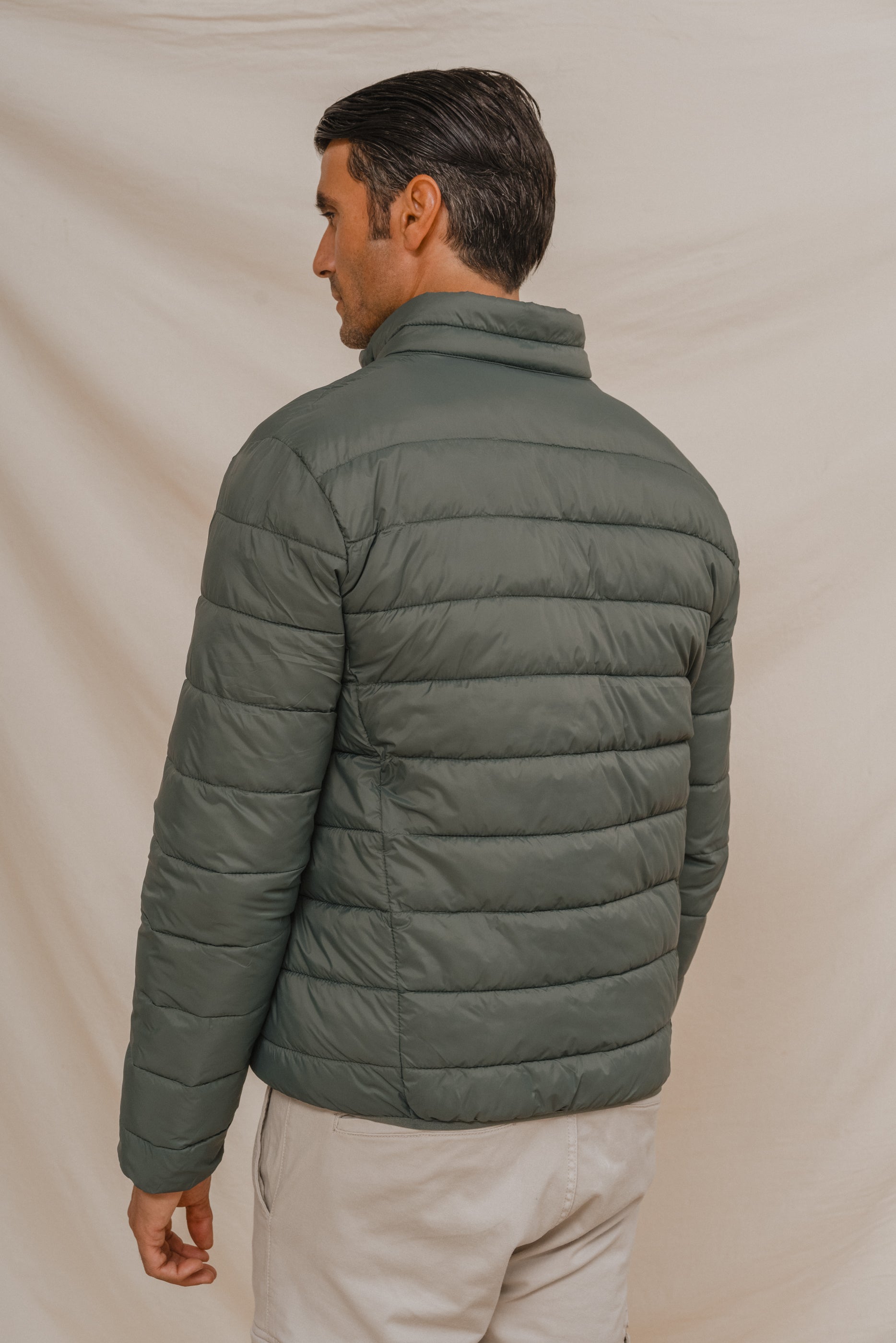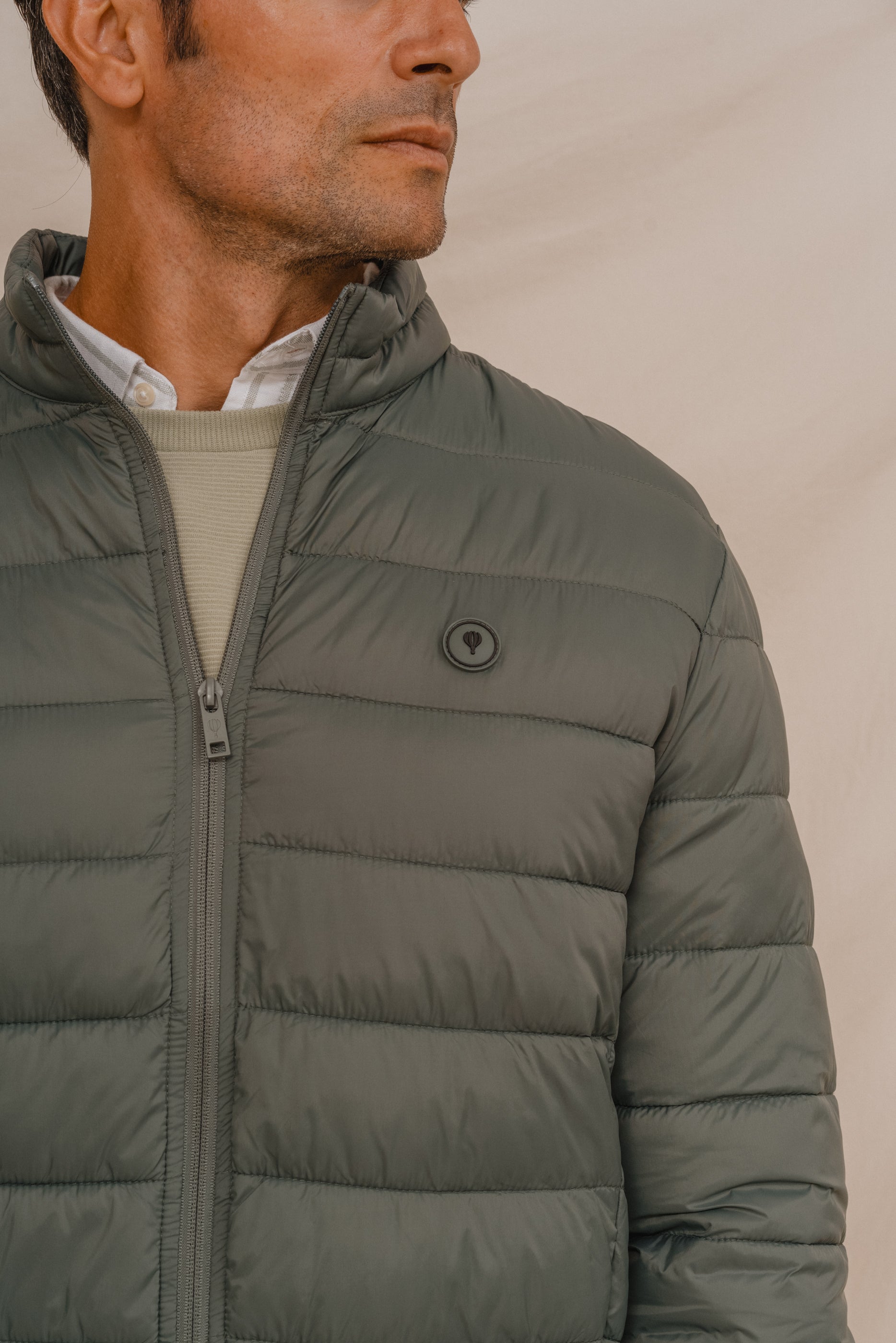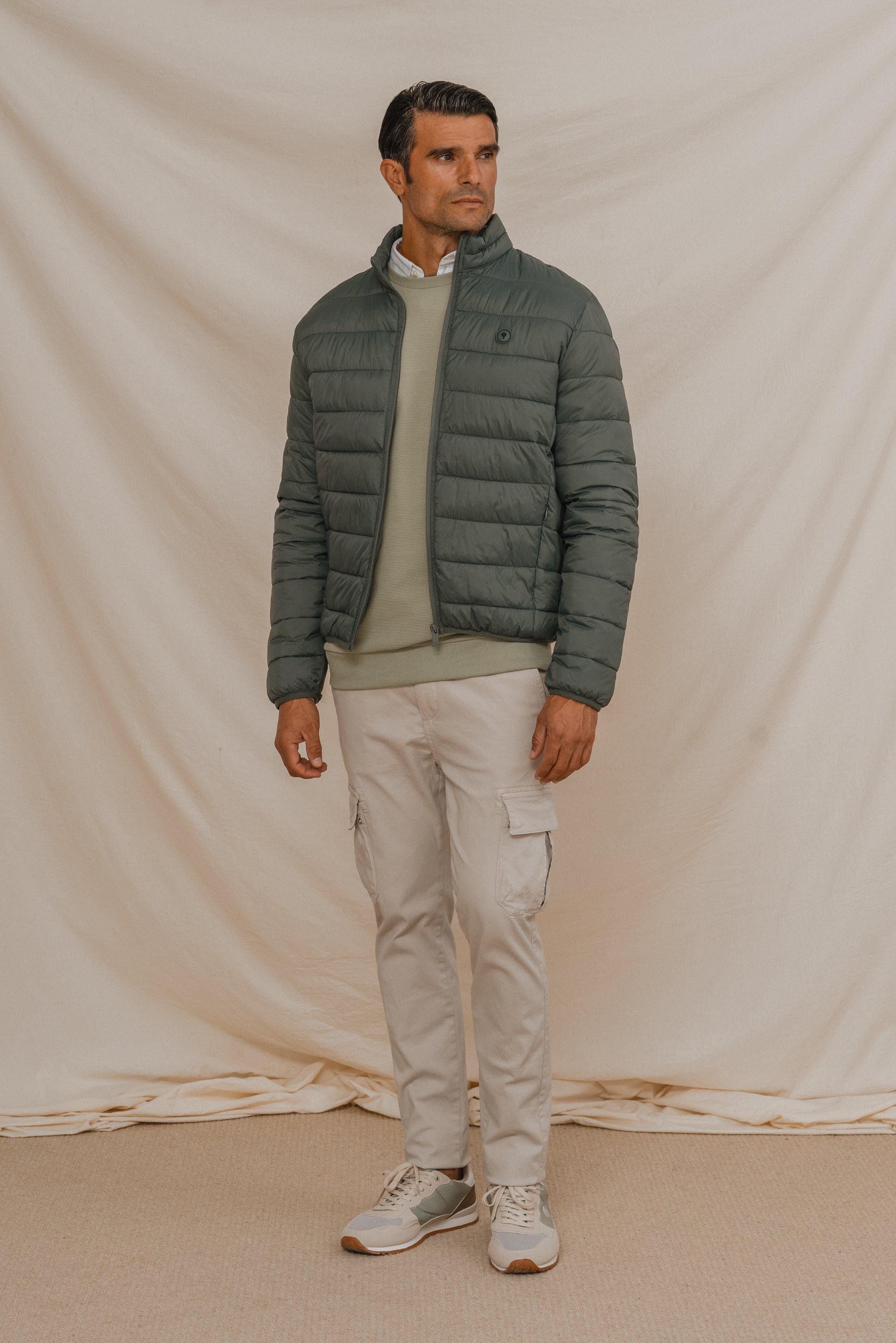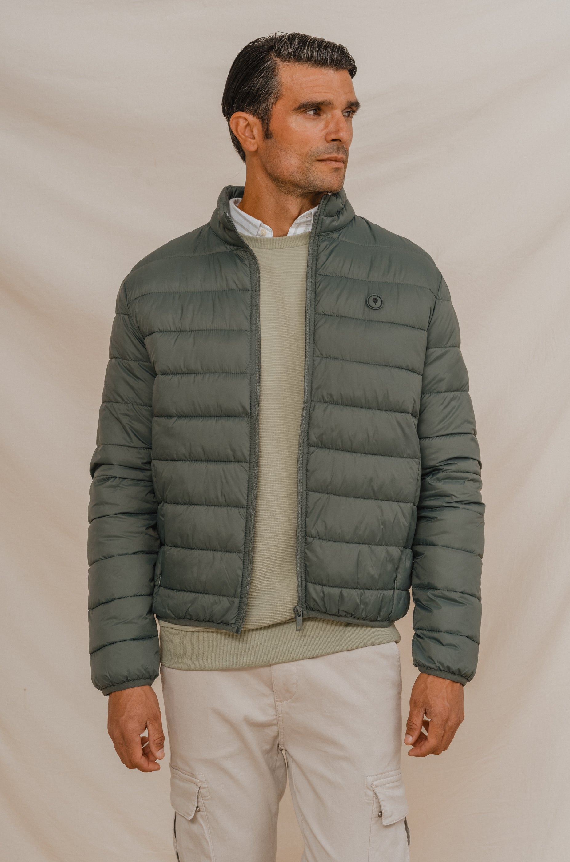 Cazadora acolchada para hombre en color celeste. Cuello chimenea y cierre central mediante cremallera. Dos bolsillos laterales y logo de la marca a la altura del pecho.