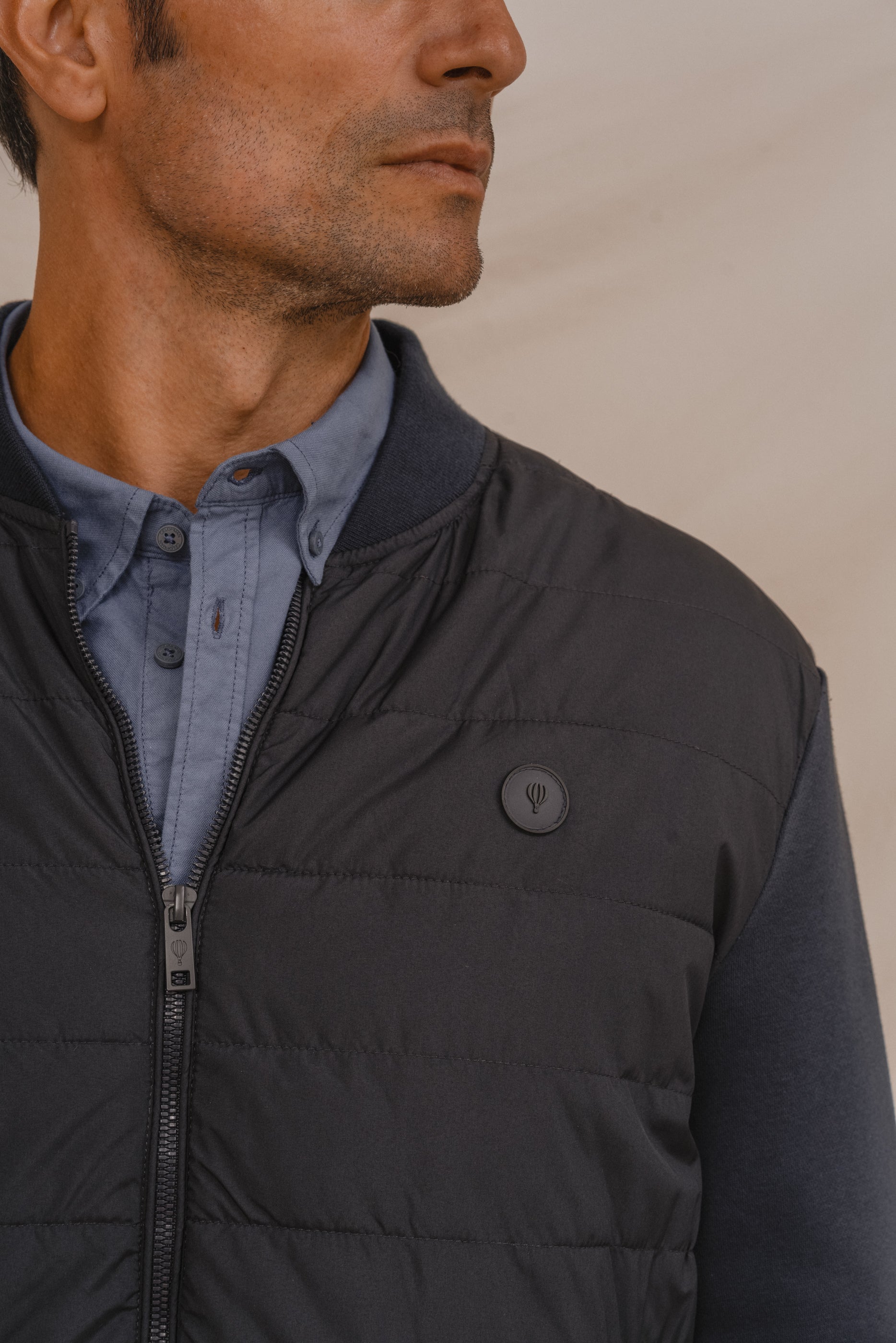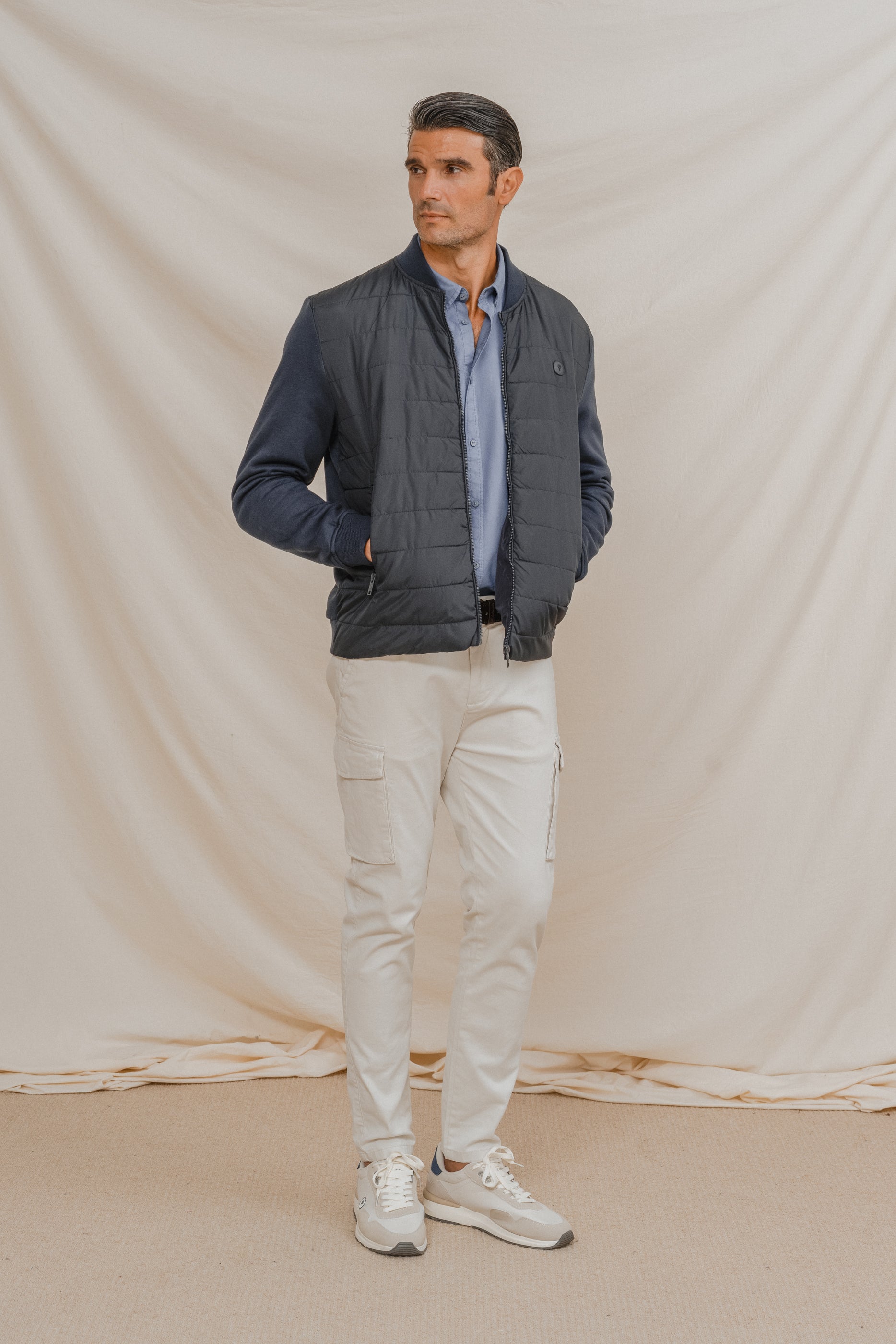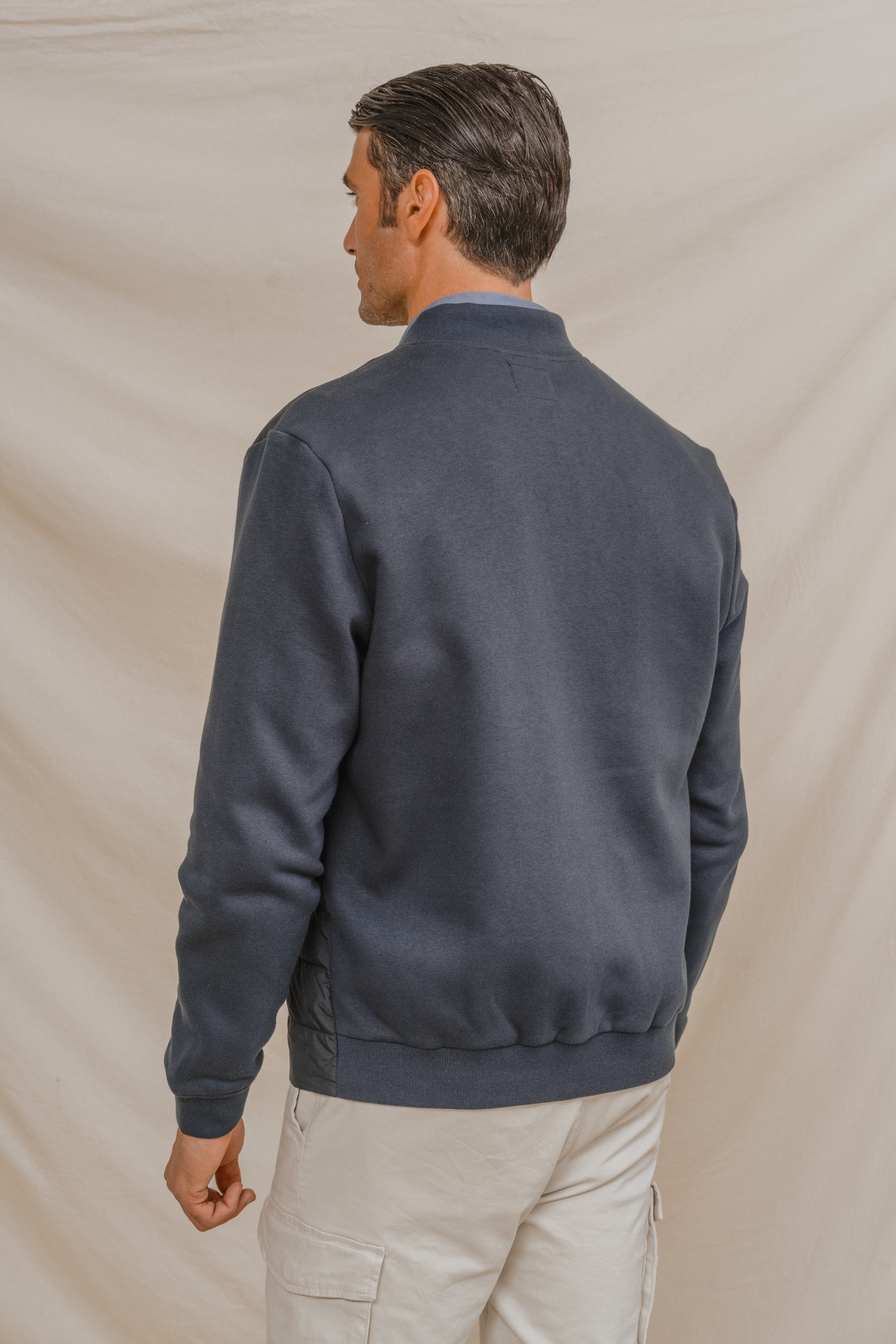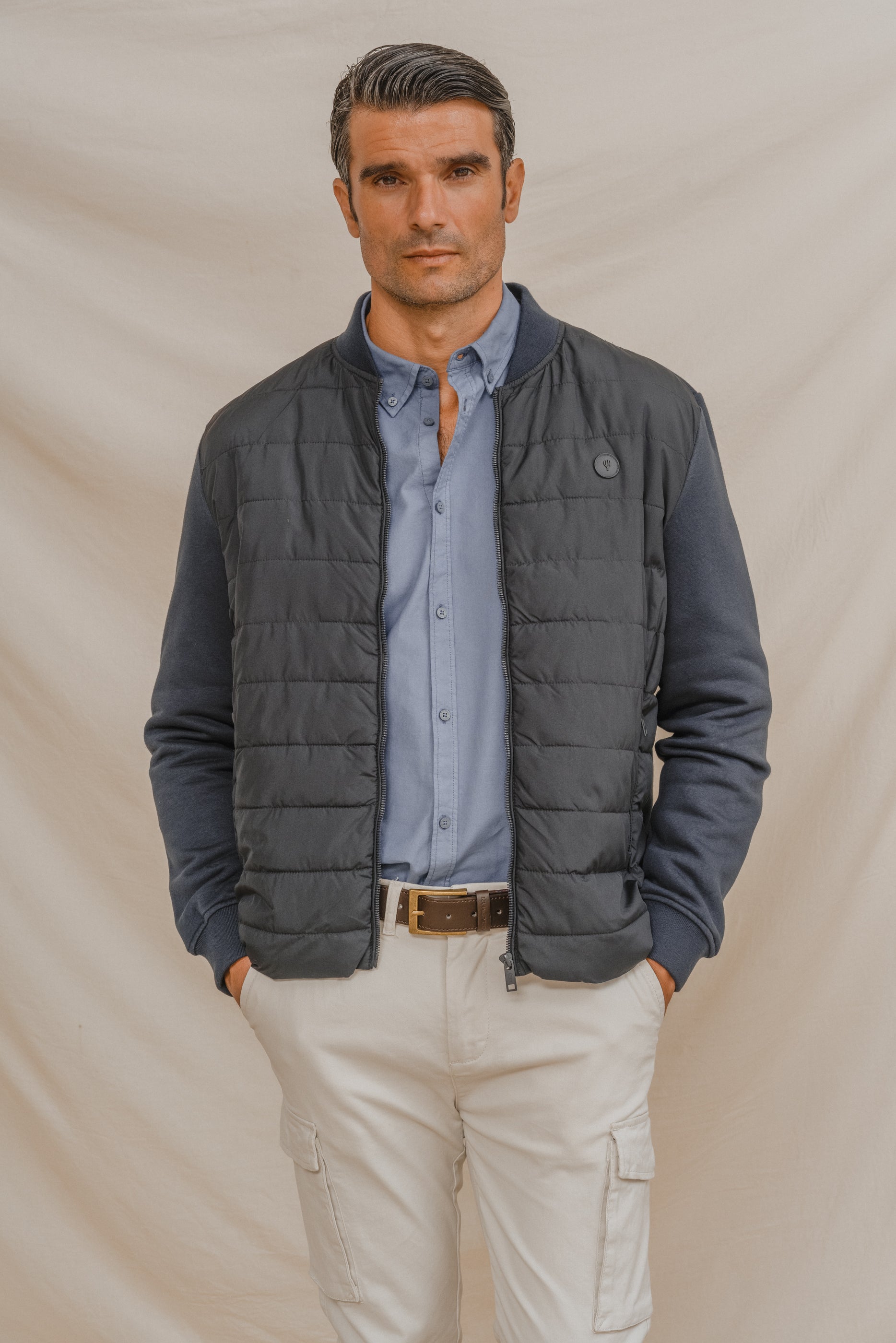 Cazadora para hombre tipo bomber. Cierre central mediante cremallera. Puños y cintura en rib para mayor comodidad. Dos bolsillos laterales. Corte slim. Tejidos combinados y logo en la parte frontal a la altura del pecho.