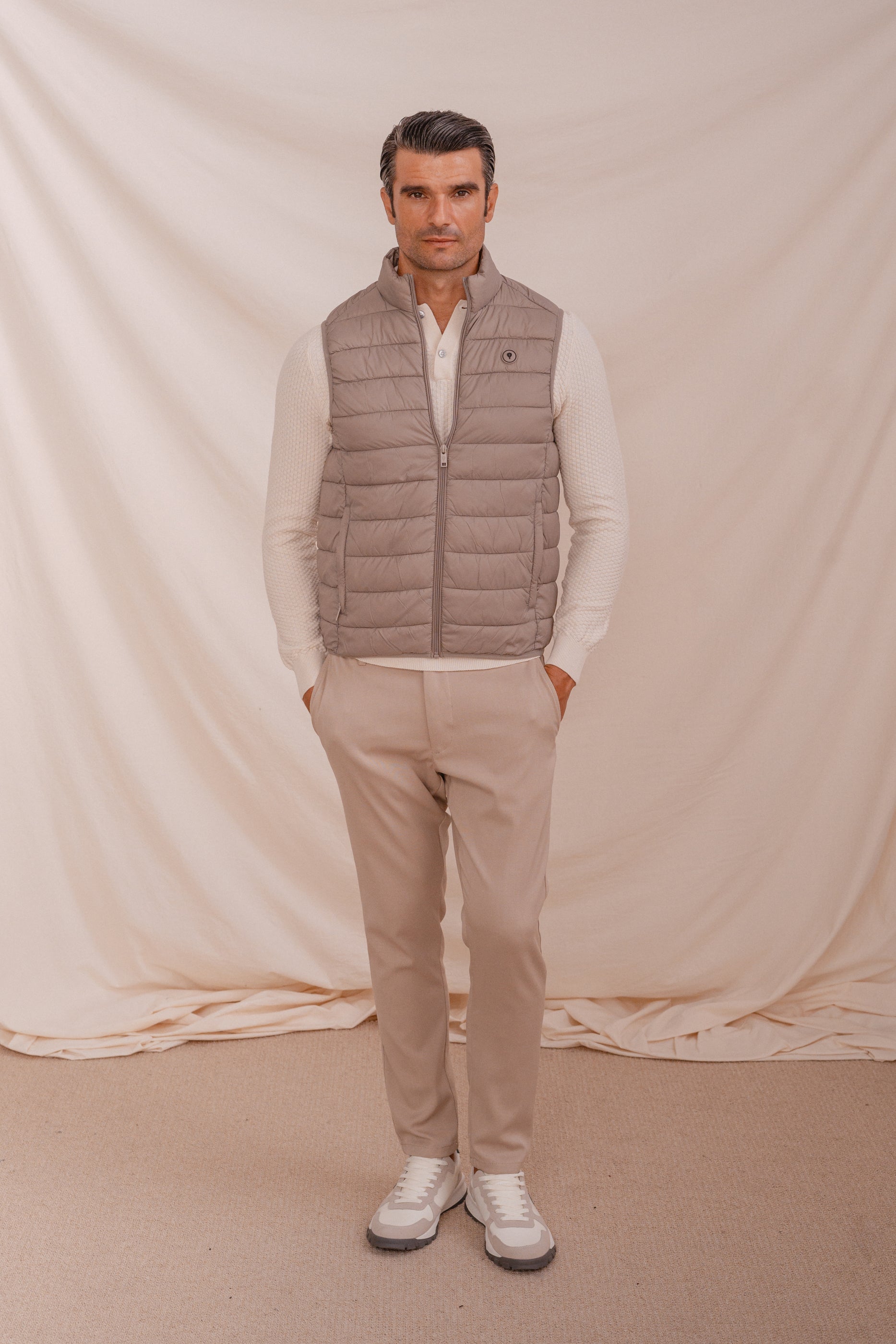 Chaleco acolchado en beige con cuello subido y cierre central mediante cremallera, dos bolsillos a la altura de la cintura y logo de la marca en el frontal. Corte regular fit.