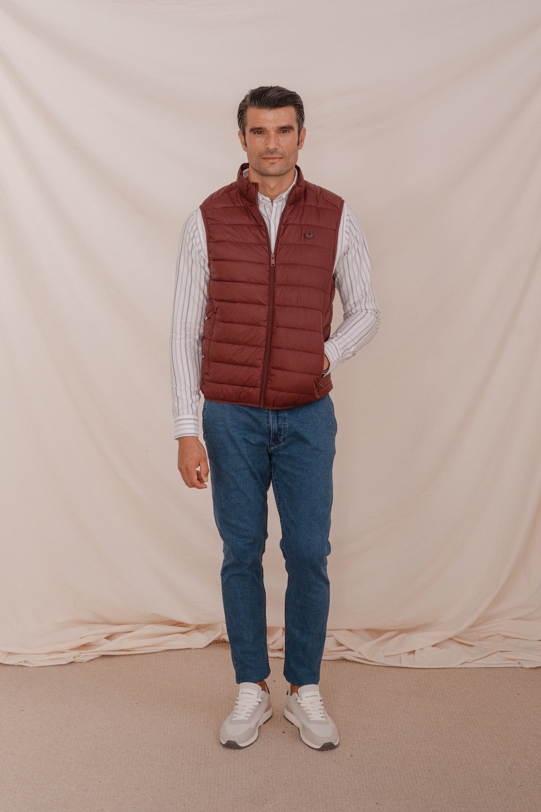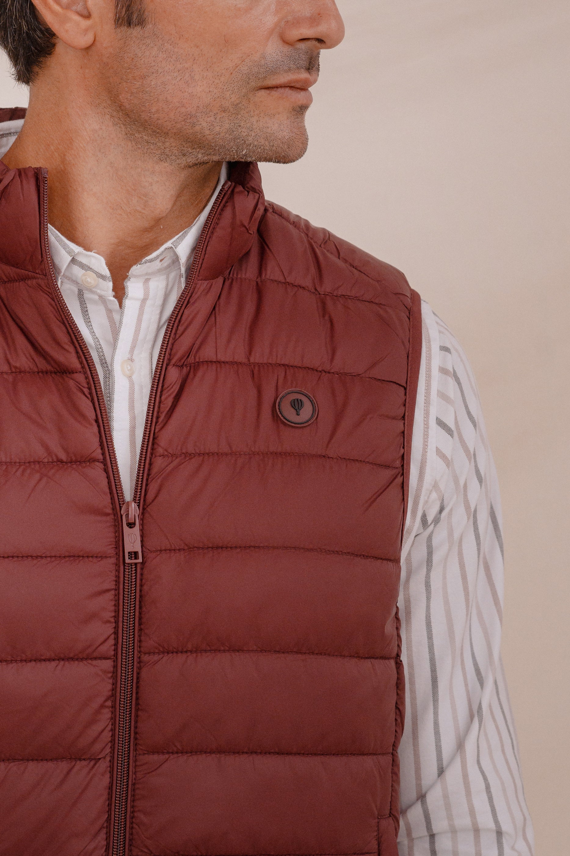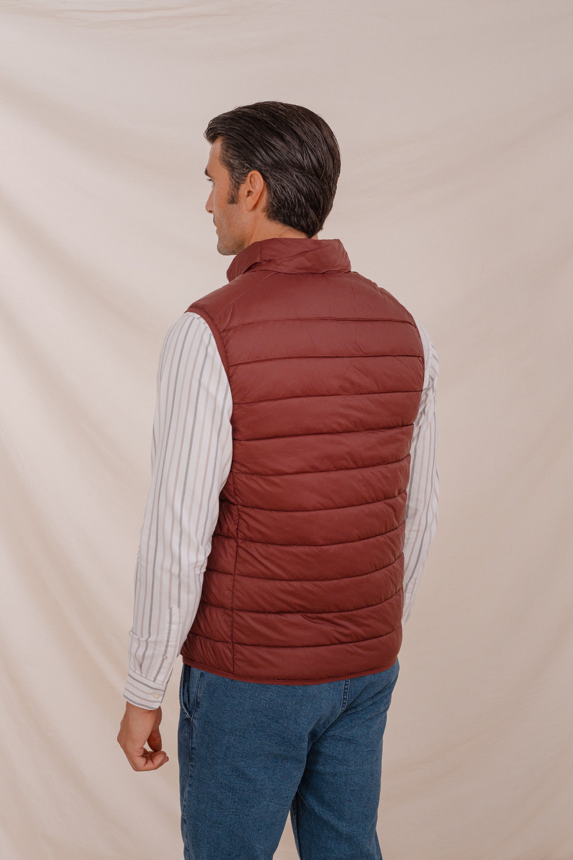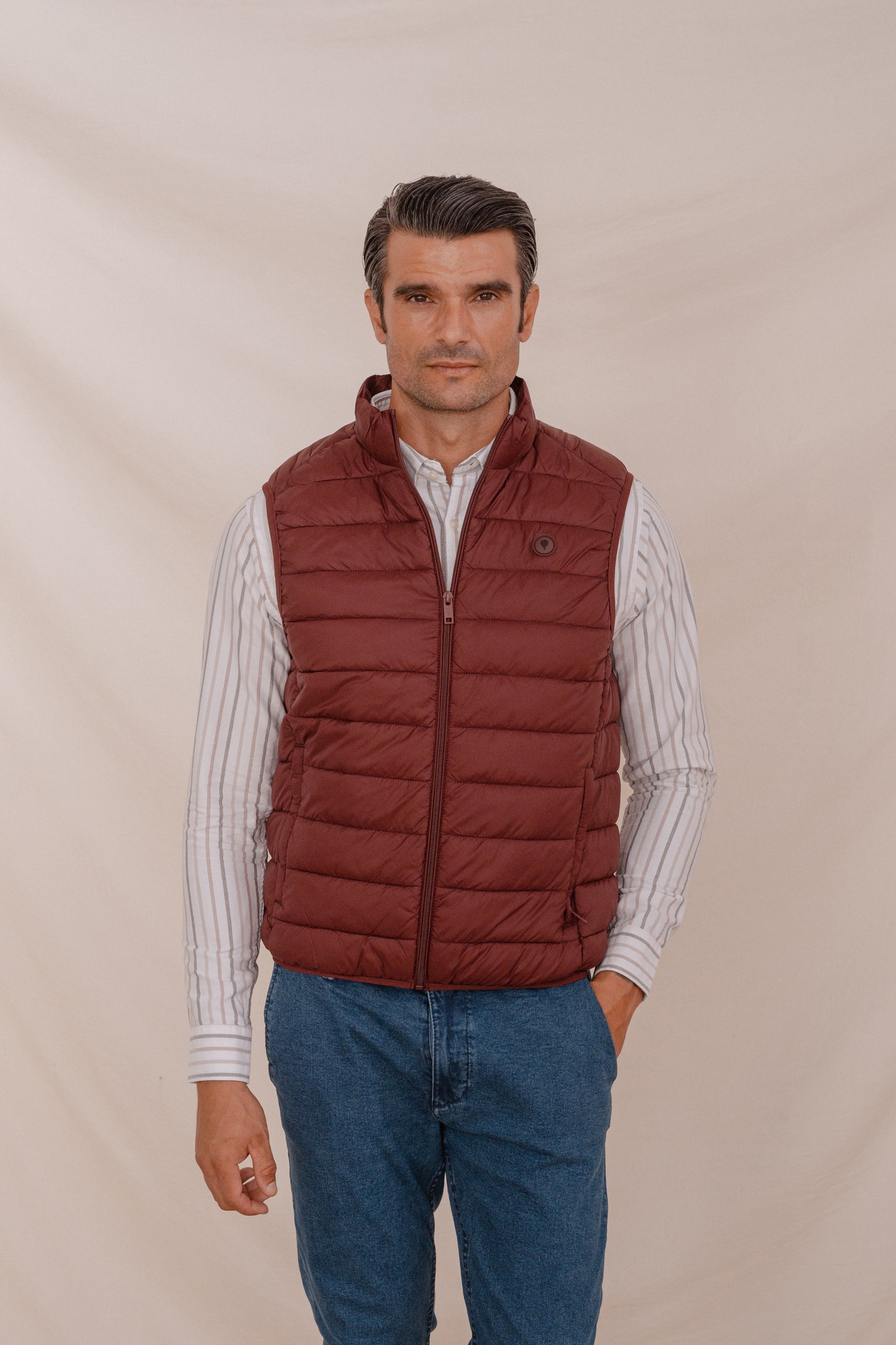 Chaleco acolchado en rojo con cuello subido y cierre central mediante cremallera, dos bolsillos a la altura de la cintura y logo de la marca en el frontal. Corte regular fit.