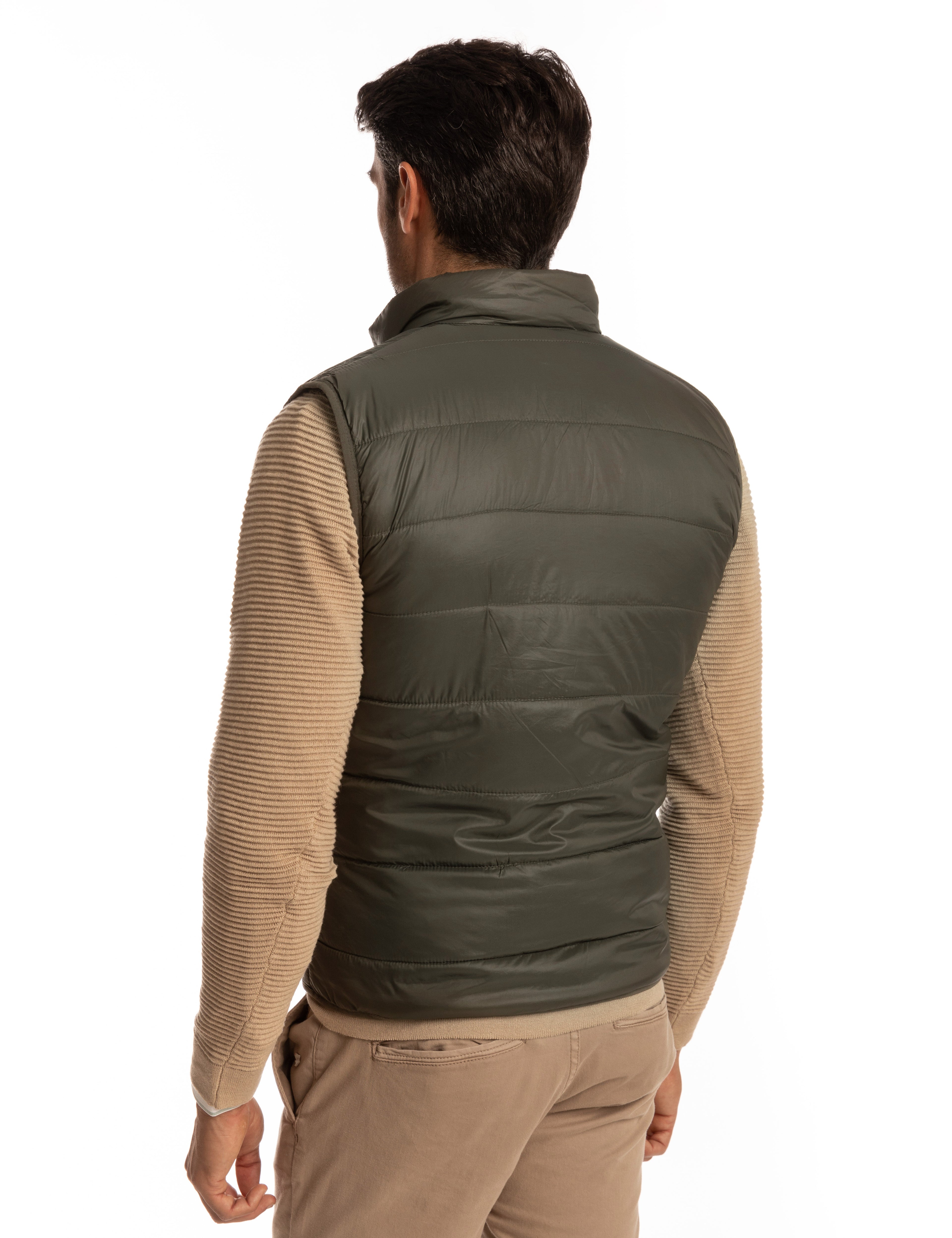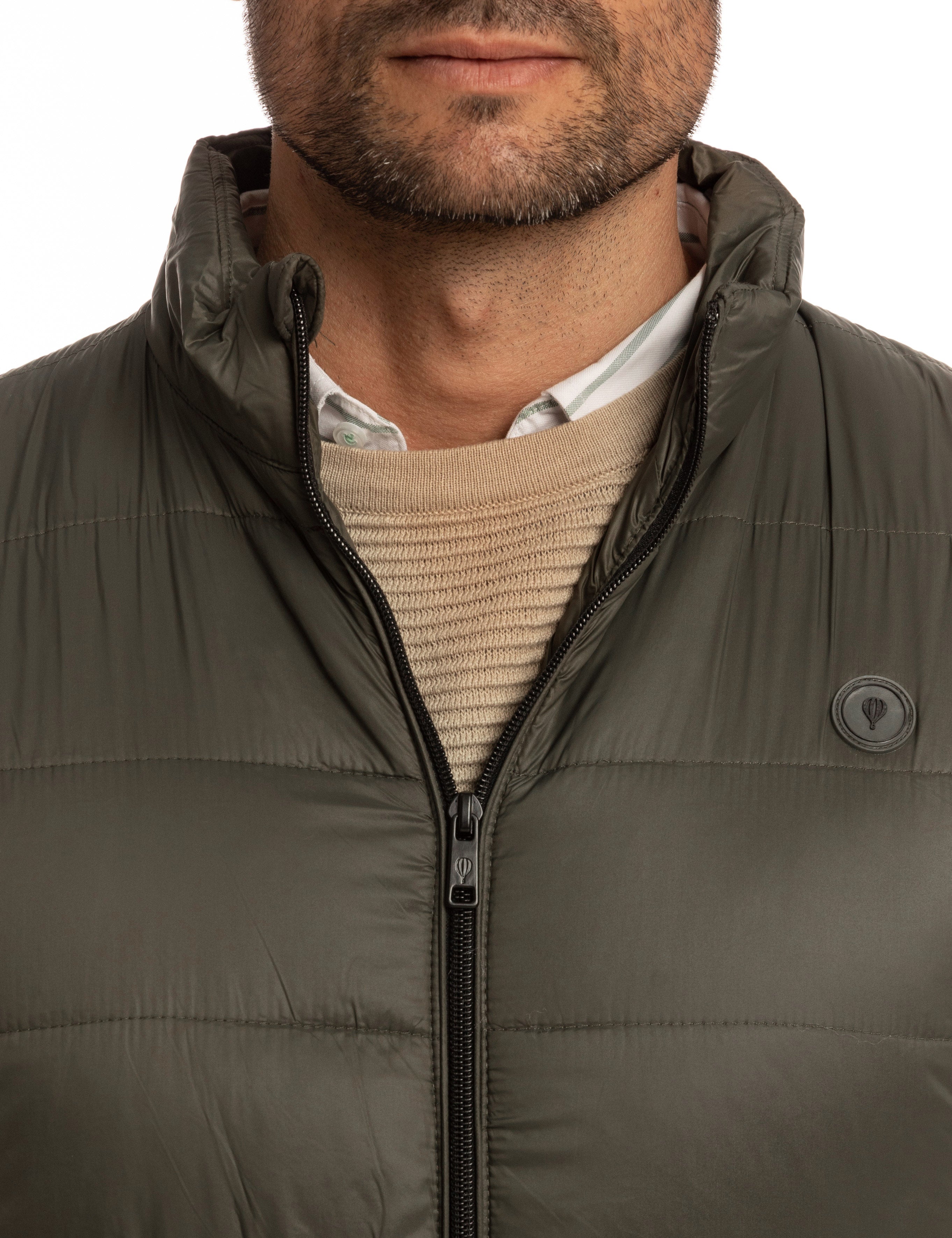 Chaleco acolchado en color verde con cuello subido y cierre central mediante cremallera, dos bolsillos a la altura de la cintura y logo de la marca en el frontal. Corte regular fit.