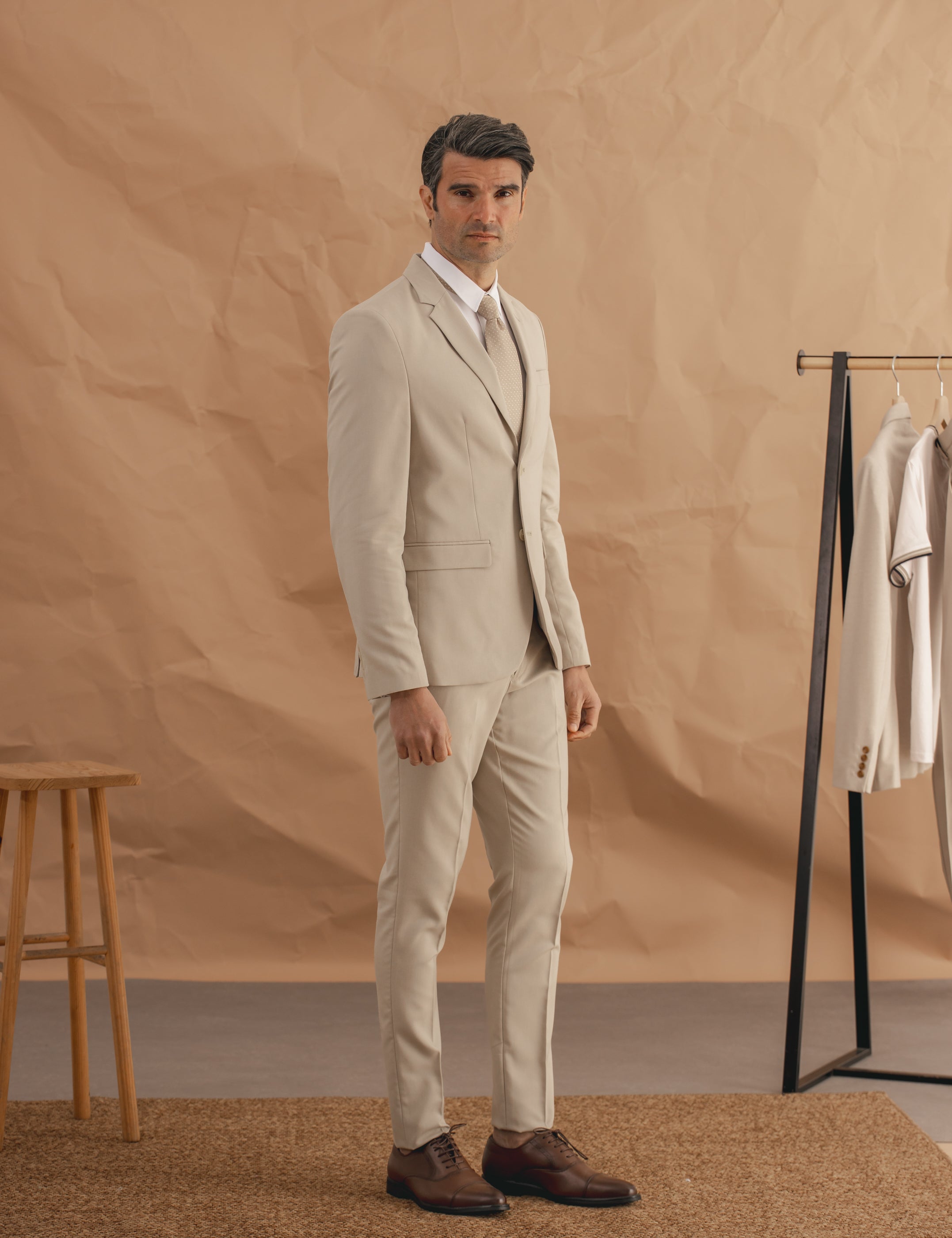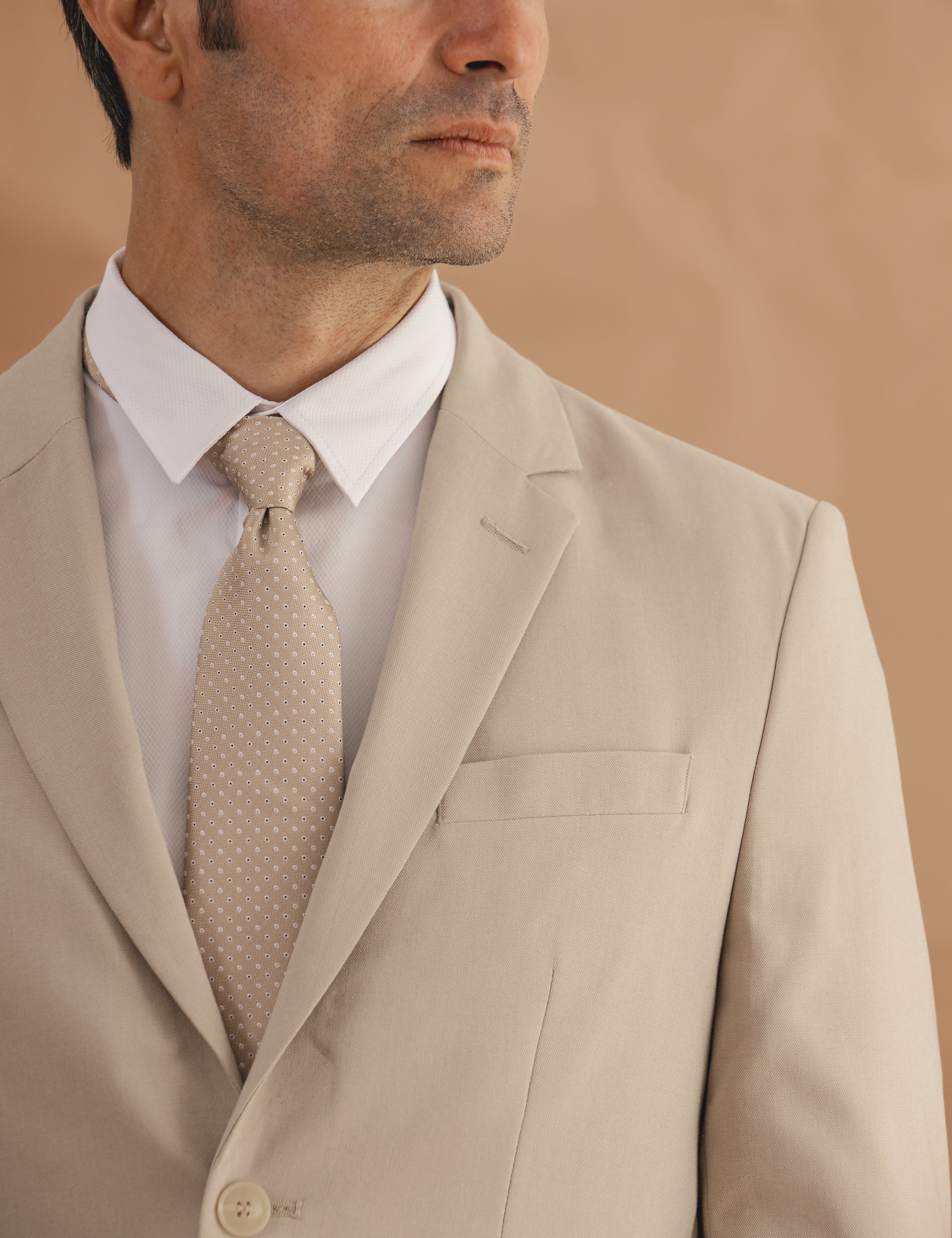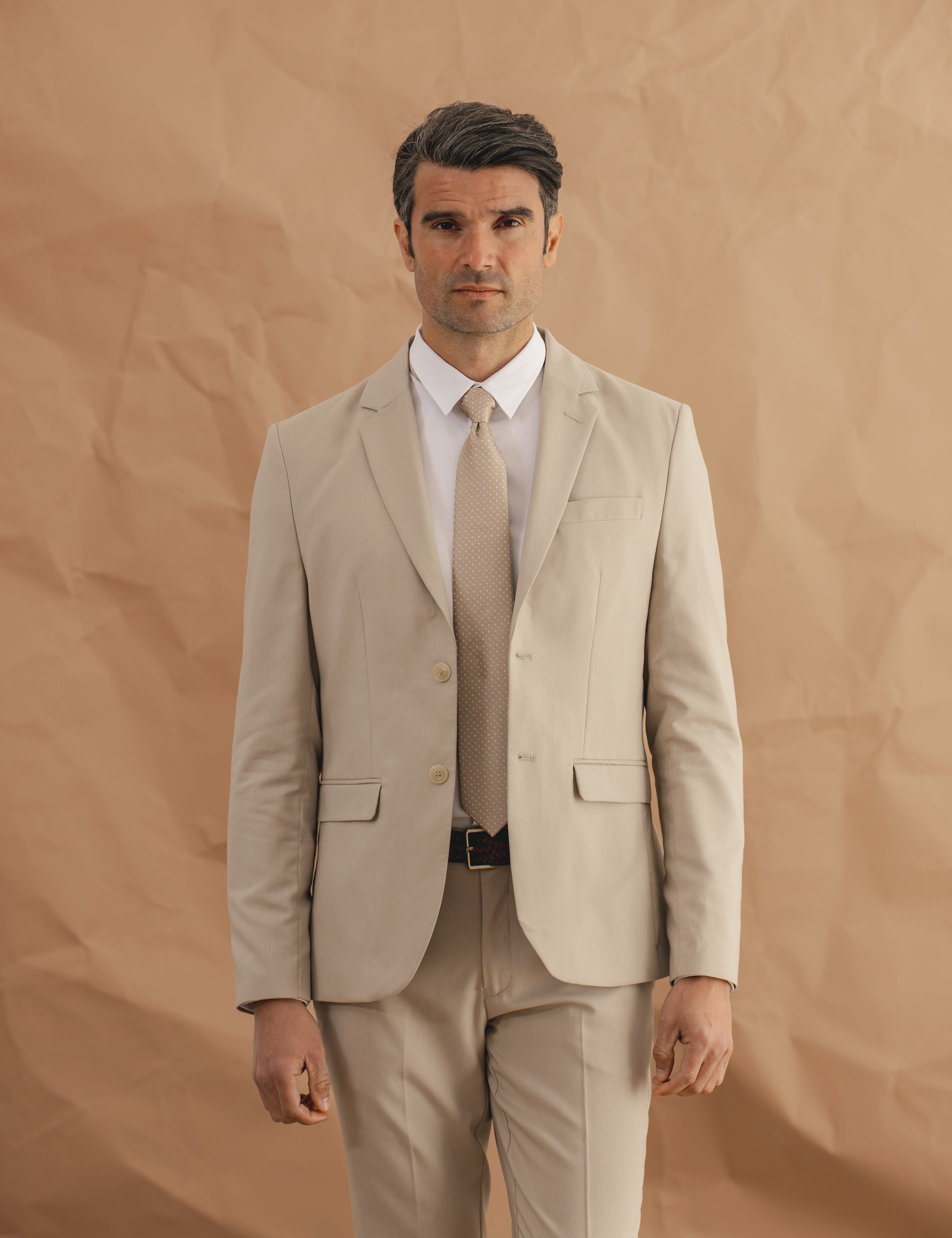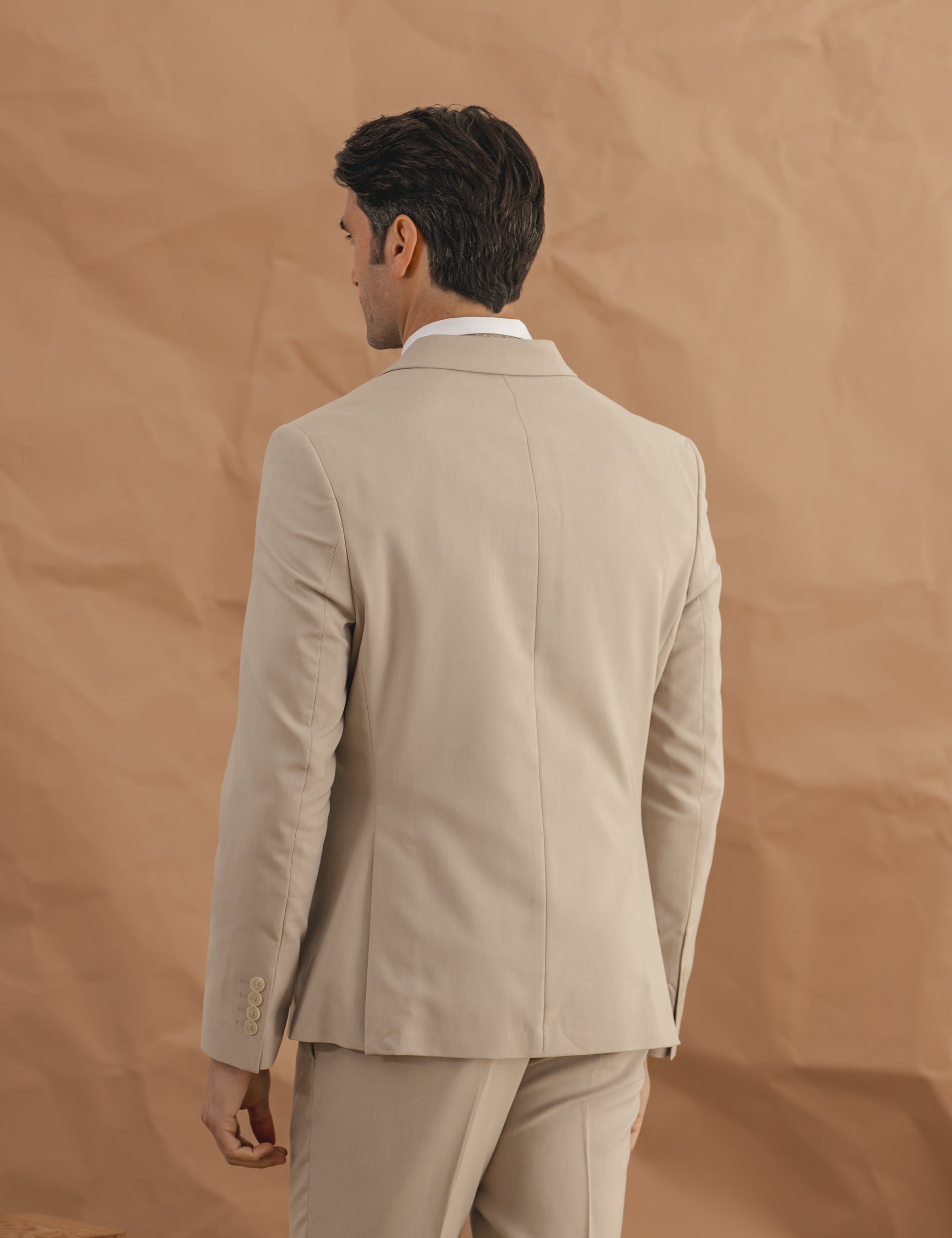 Americana beige de traje con cierre central simple mediante botones y con cuello y solapa. Dos bolsillos de solapa en la cintura y puños con botones en su terminación. Pinzas en el delantero. Interior forrado y con bolsillos.