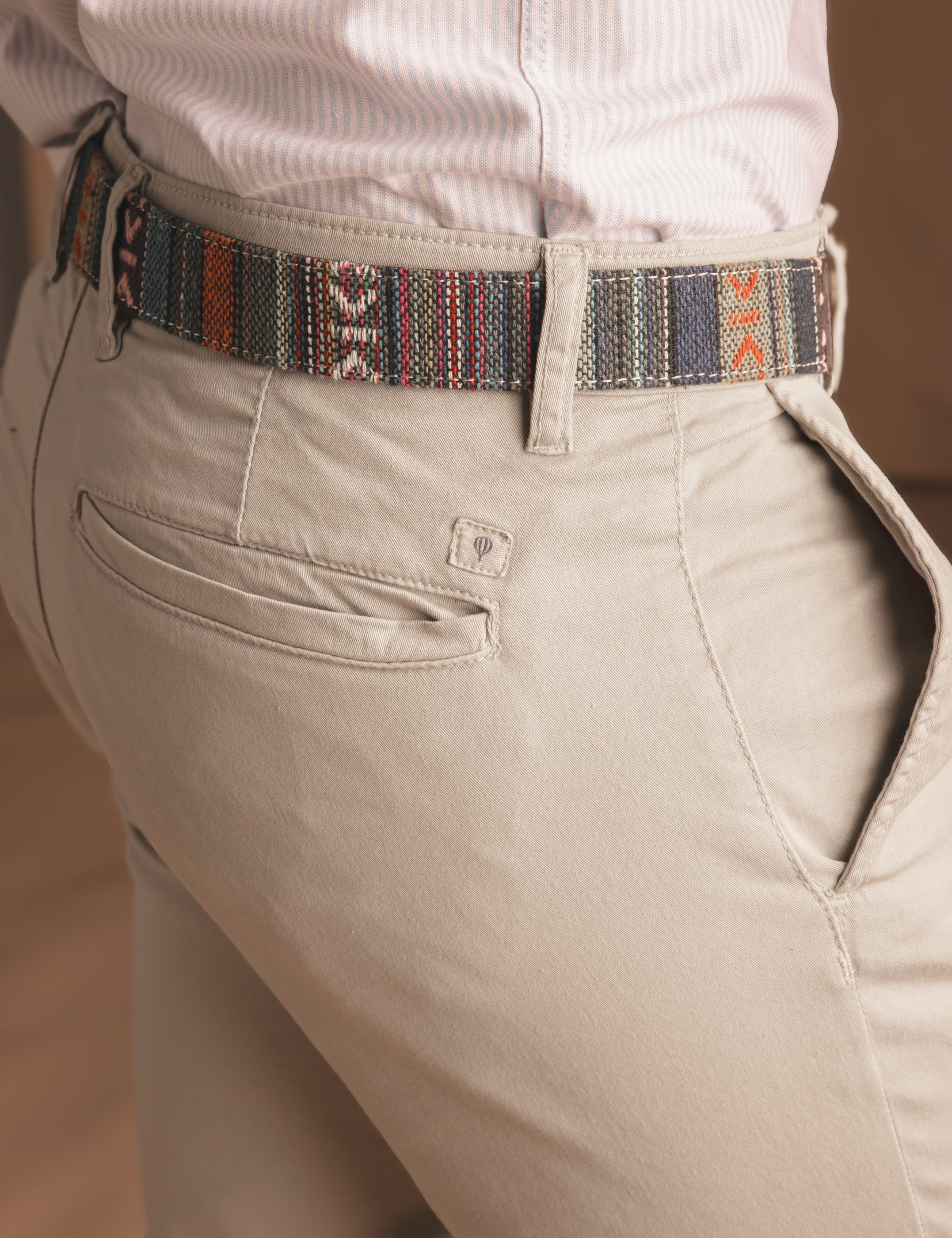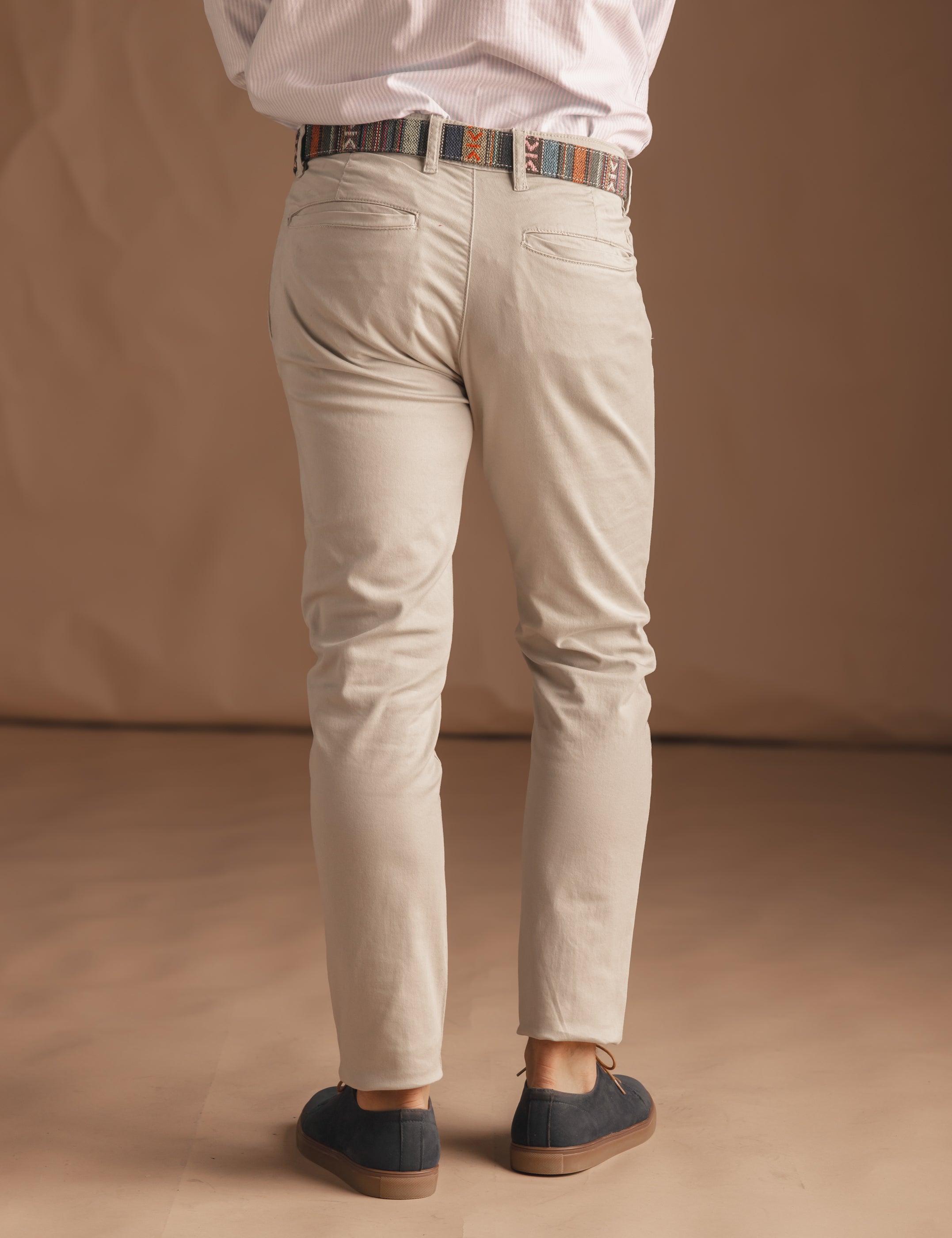 Pantalón beige estilo chino. Corte slim, detalle personalizado sobre un bolsillo trasero y cierre delantero mediante botón y cremallera. Tejido con elastano para mejorar su confort