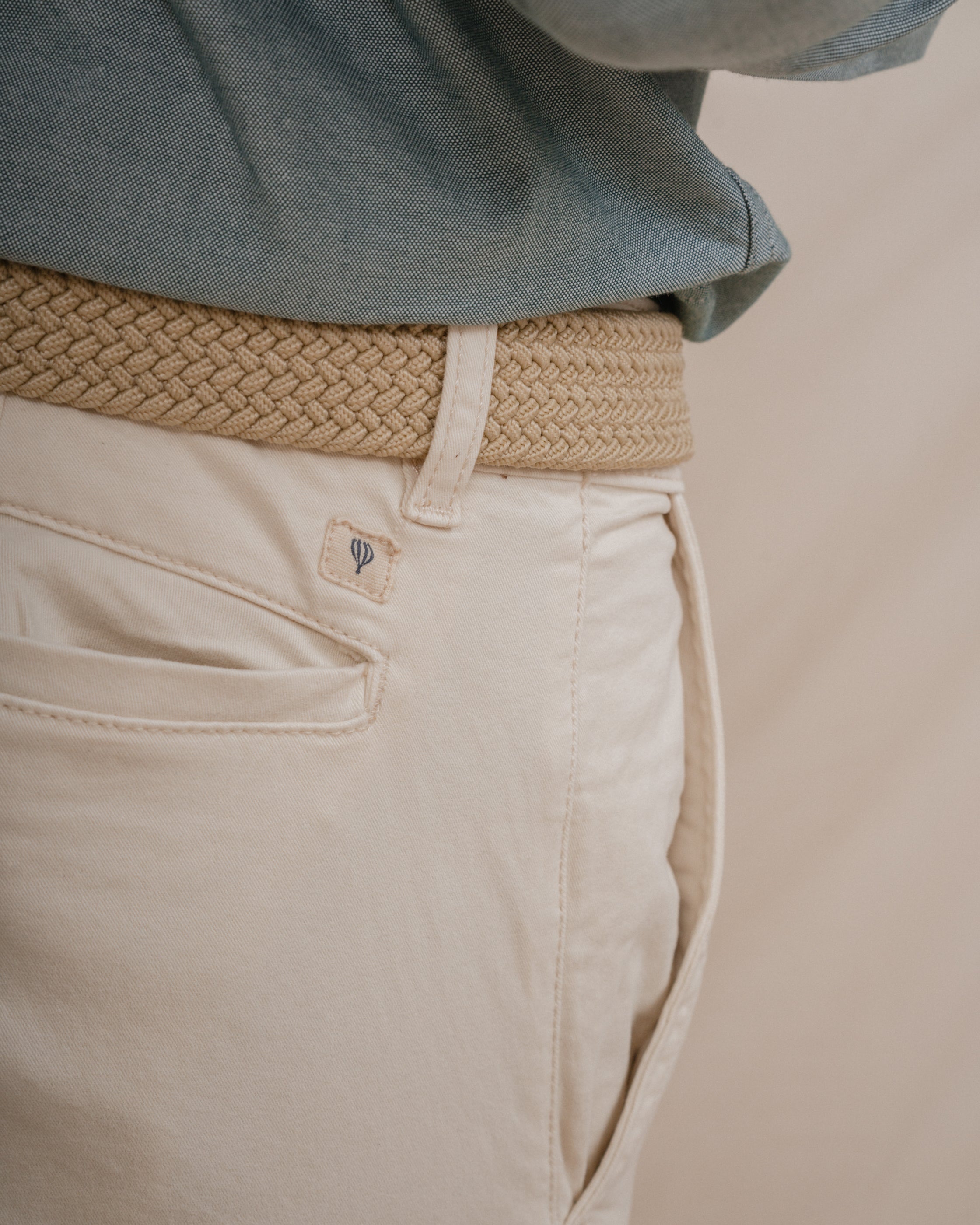 Pantalón beige claro estilo chino. Corte slim, detalle personalizado sobre un bolsillo trasero y cierre delantero mediante botón y cremallera. Tejido con elastano para mejorar su confort