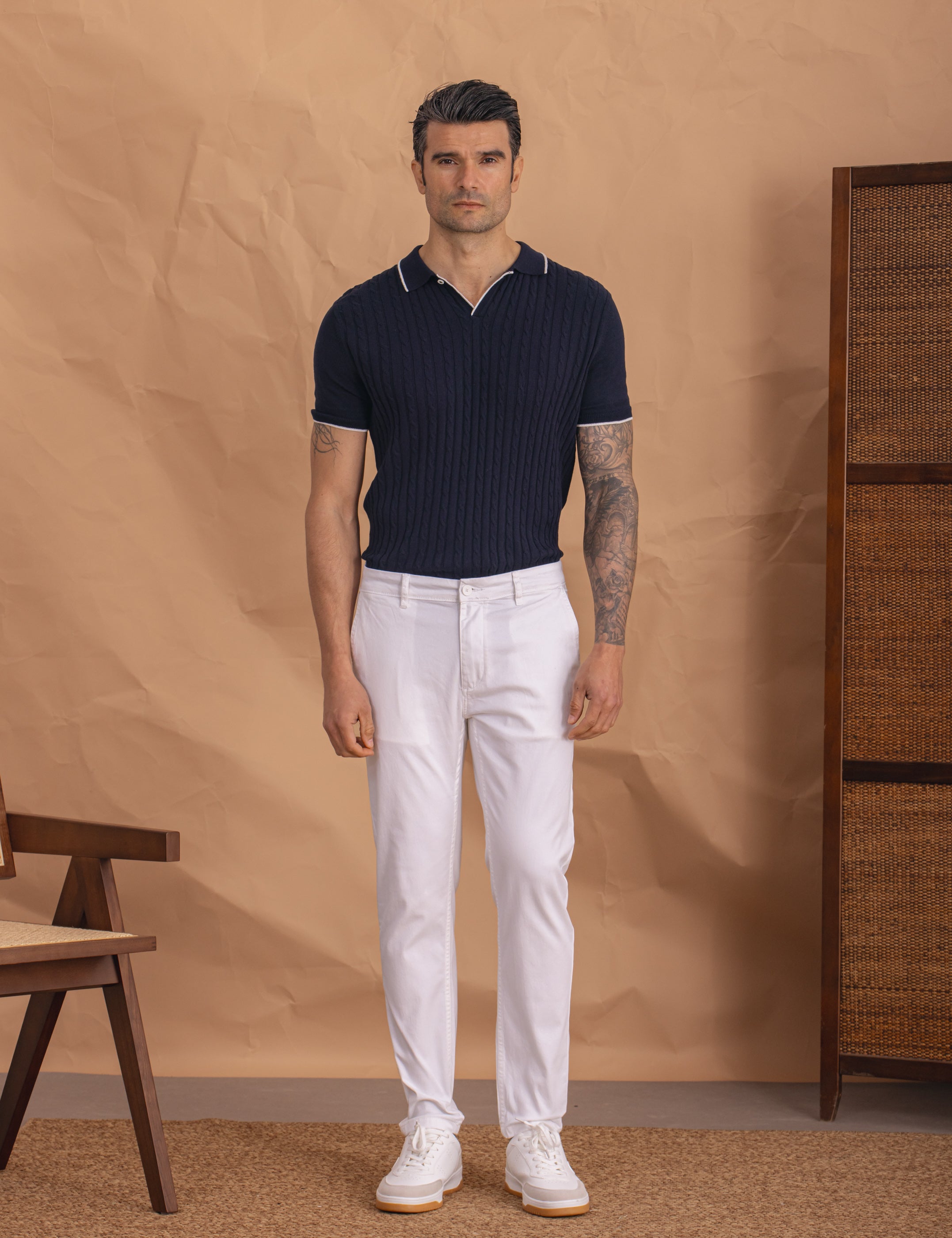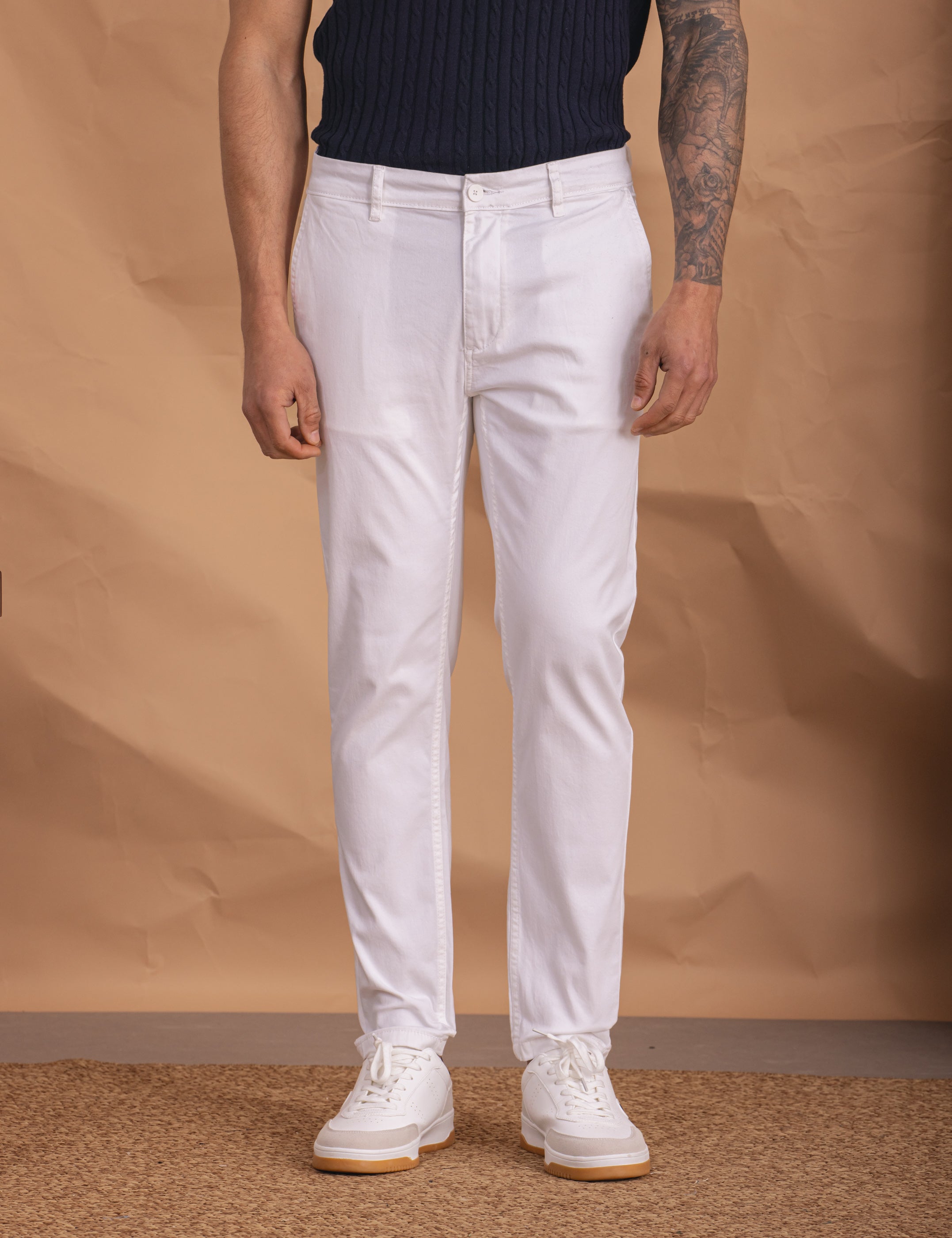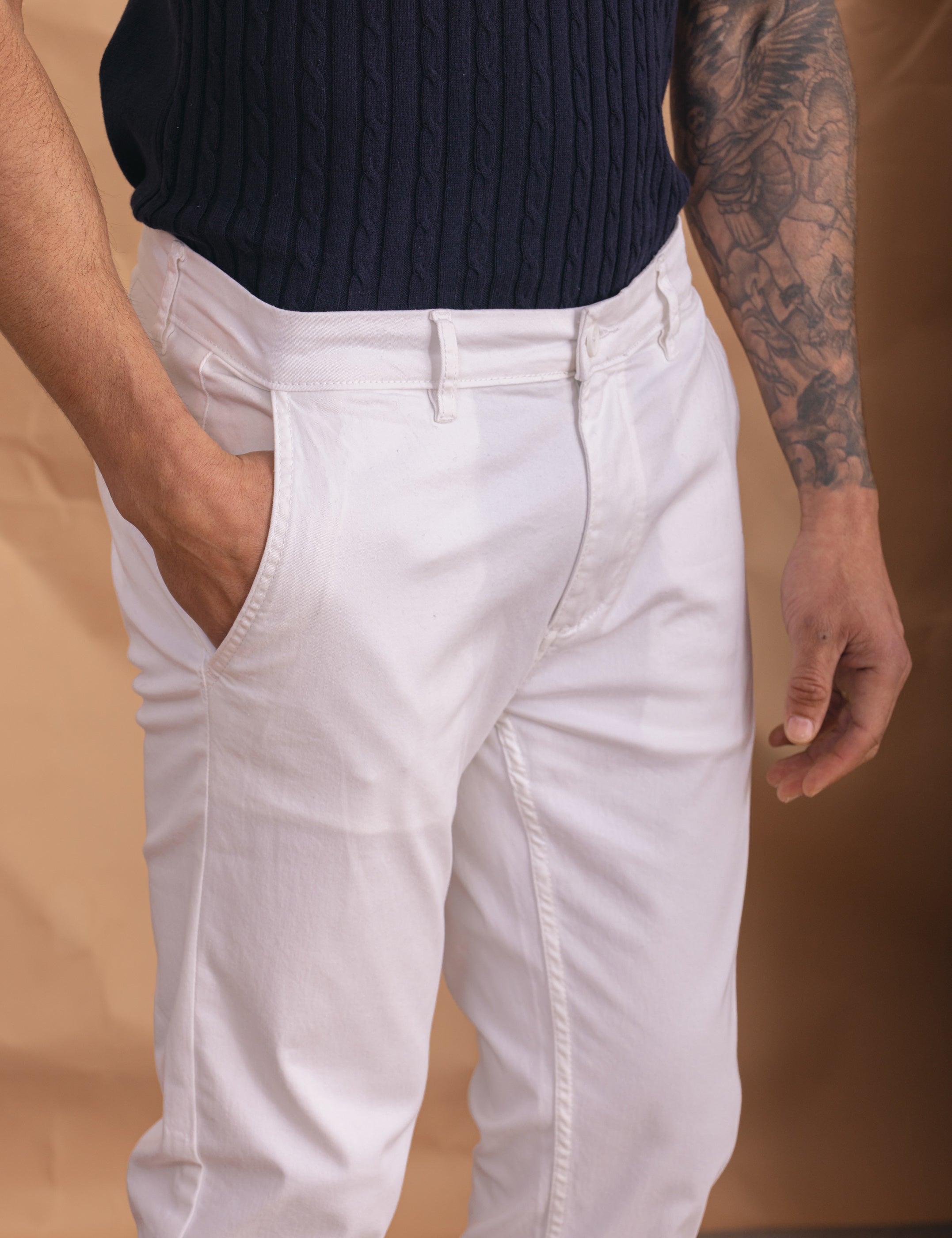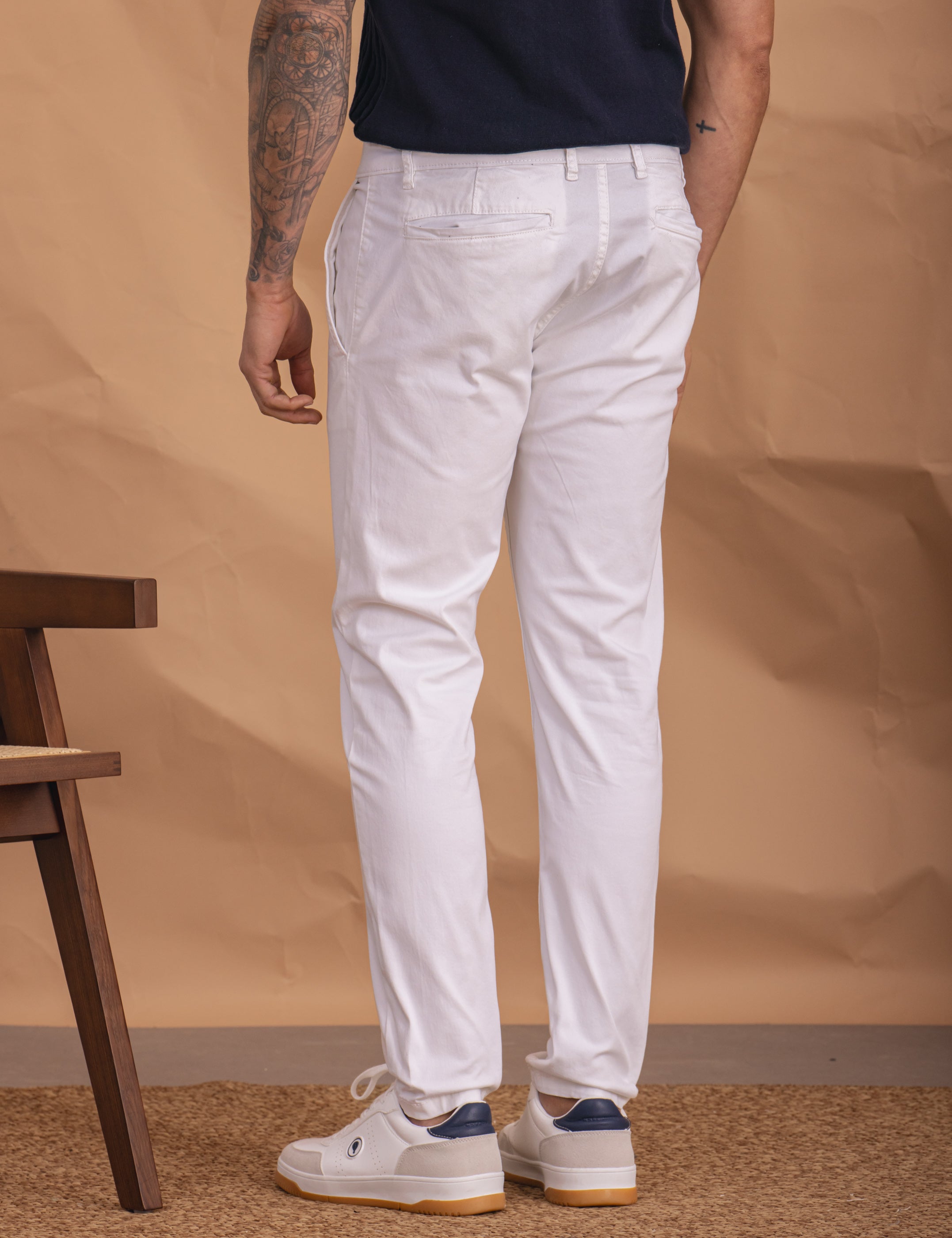 Pantalón blanco estilo chino. Corte slim, detalle personalizado sobre un bolsillo trasero y cierre delantero mediante botón y cremallera. Tejido con elastano para mejorar su confort