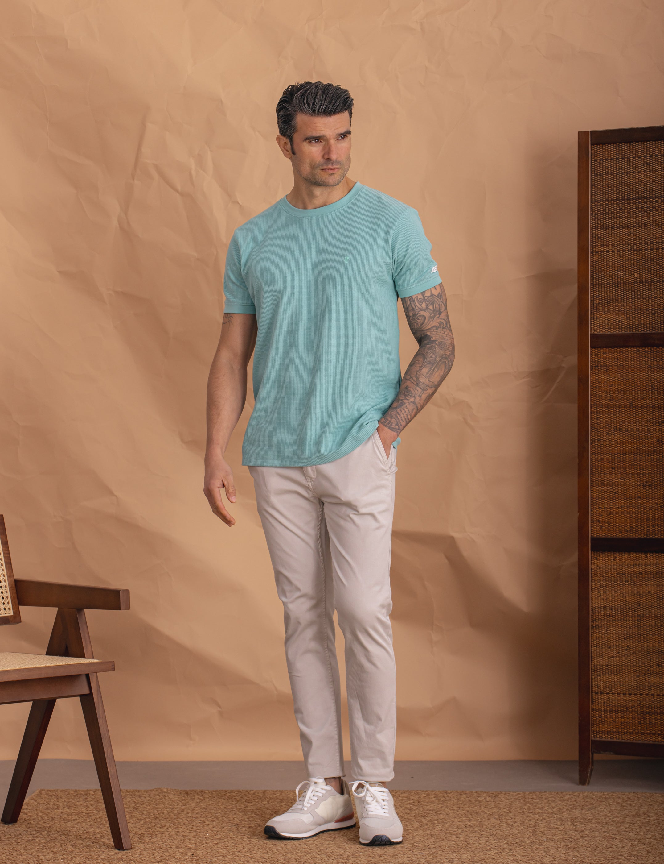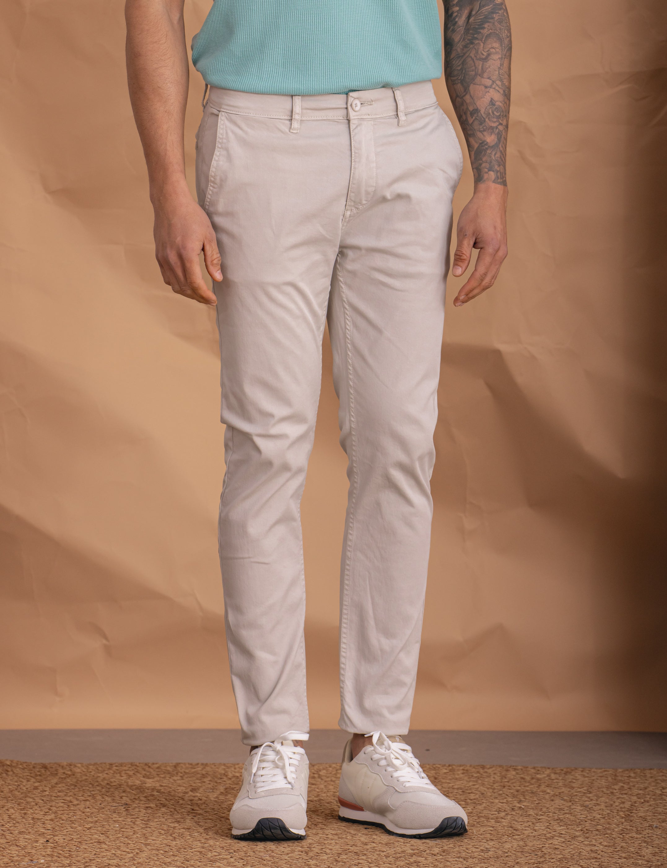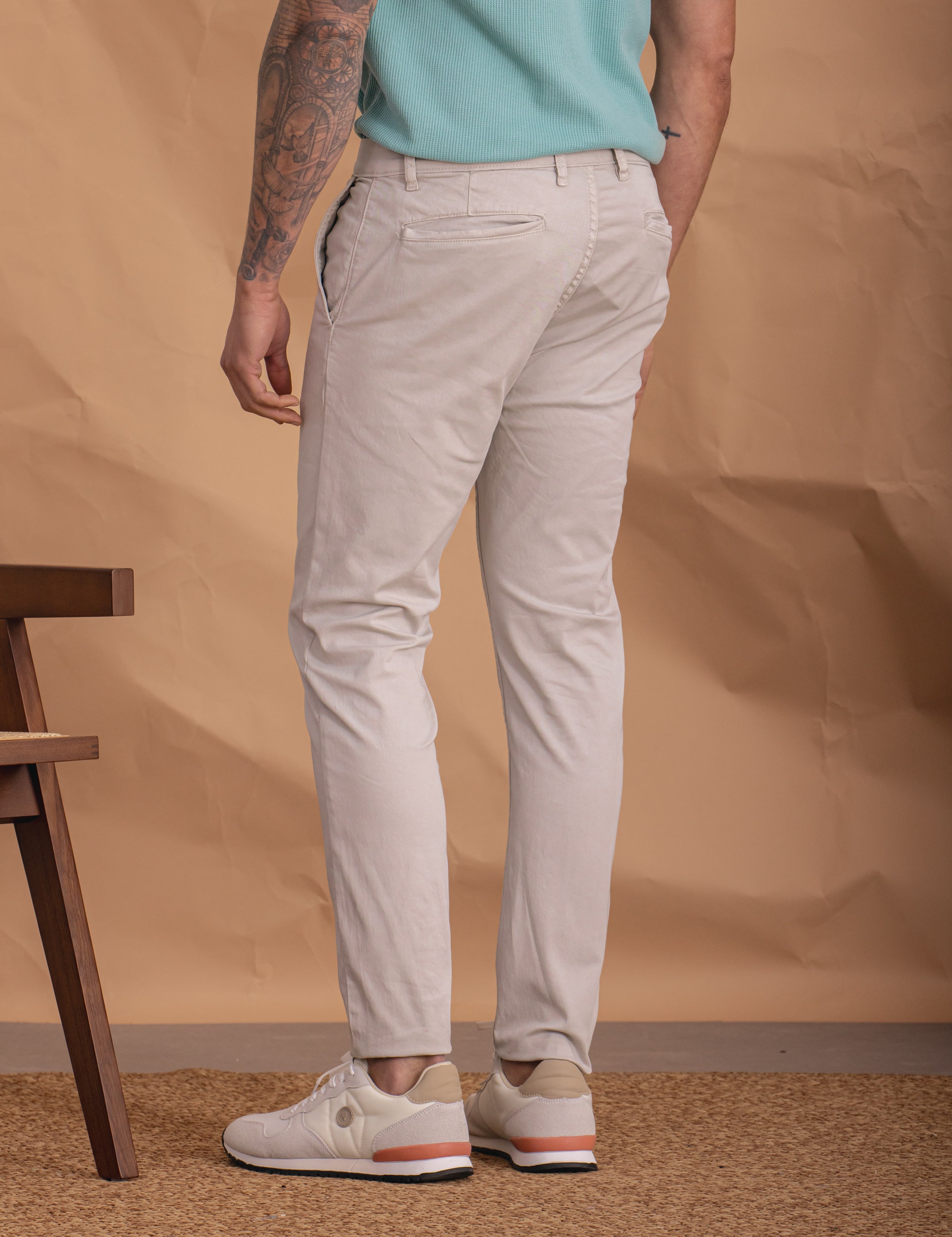 Pantalón grís estilo chino. Corte slim, detalle personalizado sobre un bolsillo trasero y cierre delantero mediante botón y cremallera. Tejido con elastano para mejorar su confort