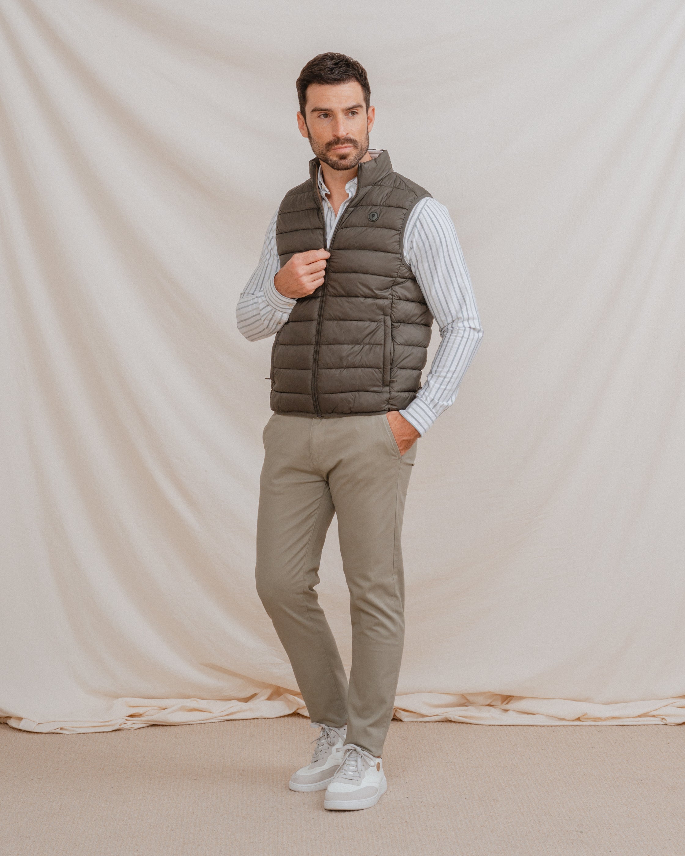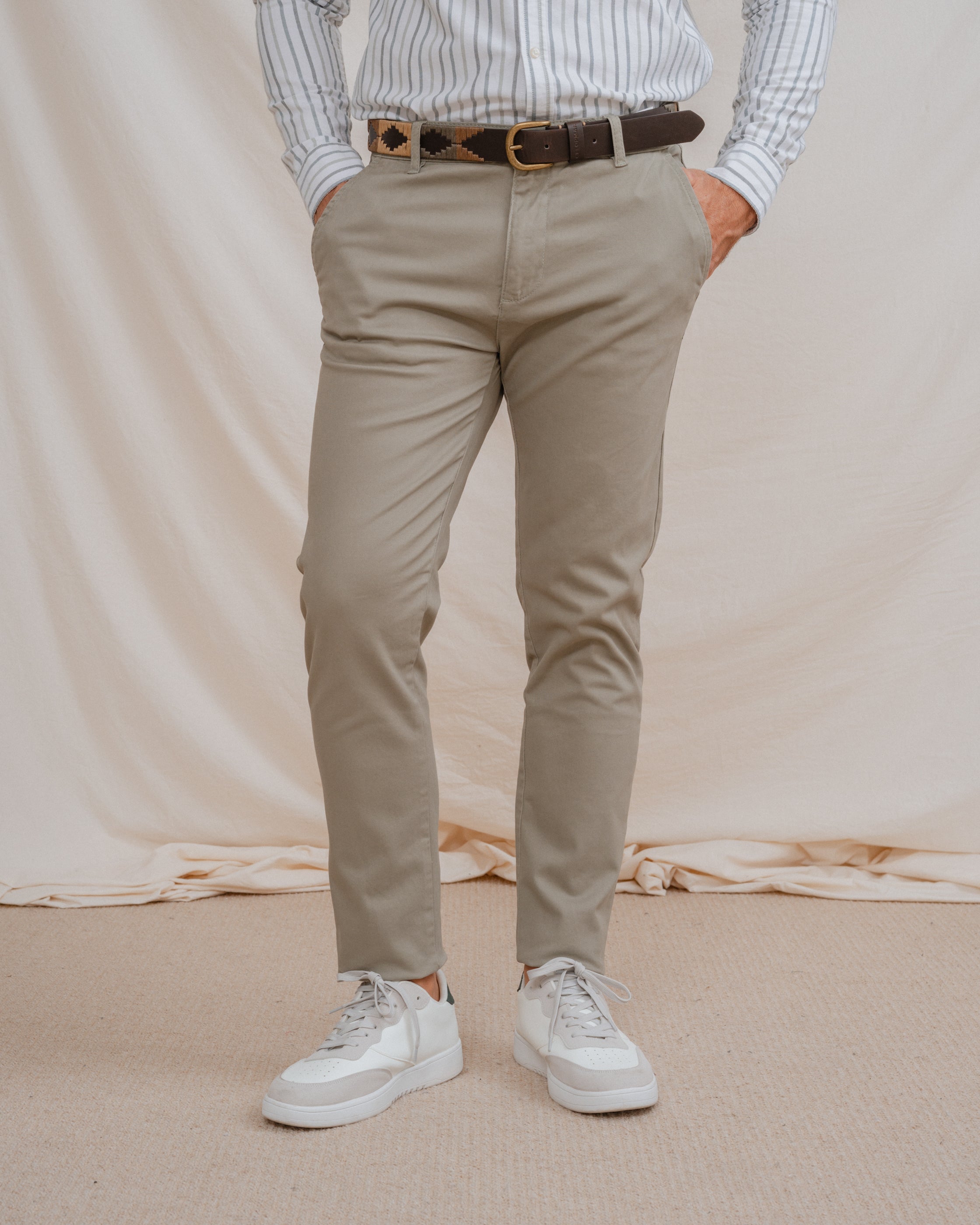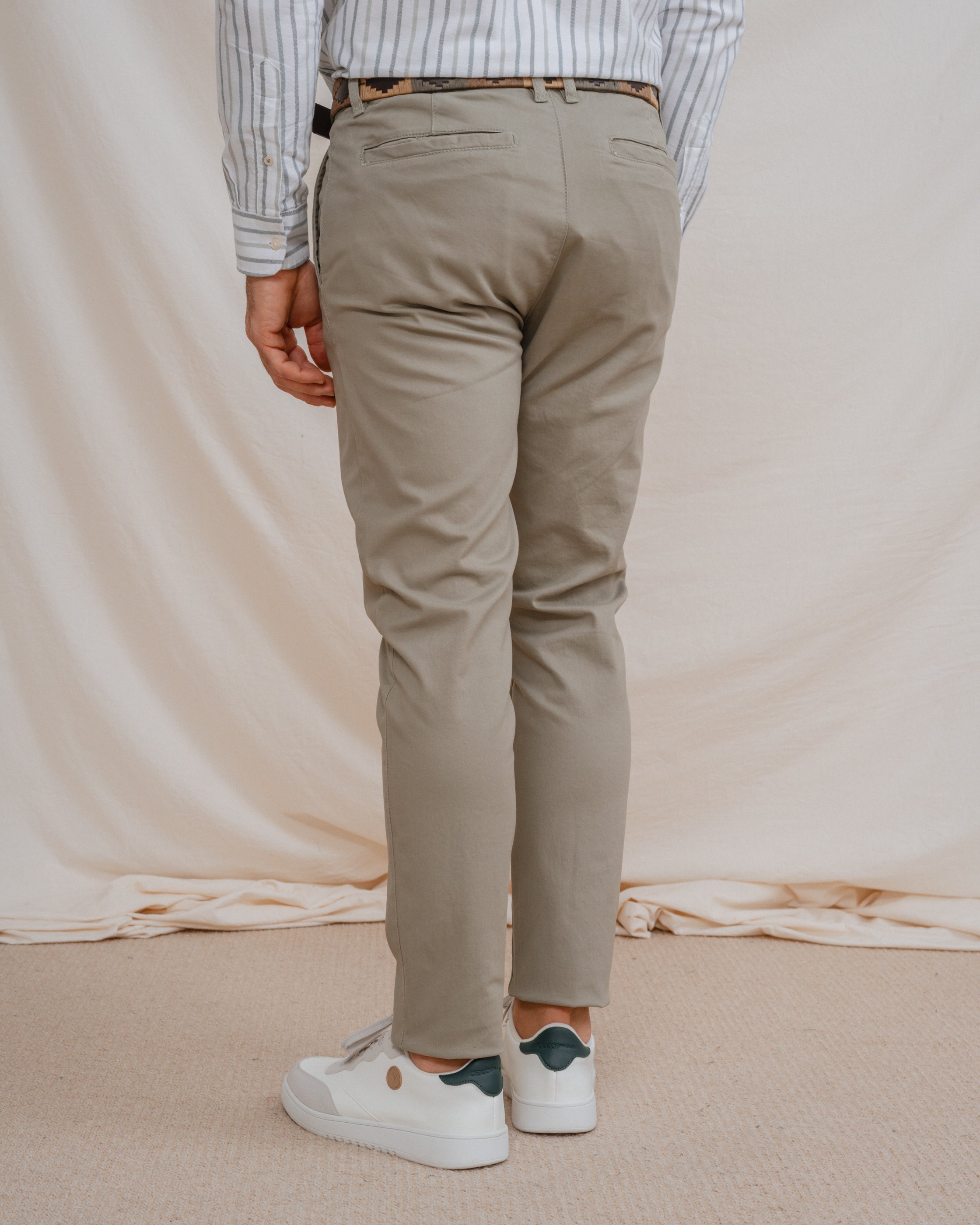 Pantalón verde estilo chino. Corte slim, detalle personalizado sobre un bolsillo trasero y cierre delantero mediante botón y cremallera. Tejido con elastano para mejorar su confort