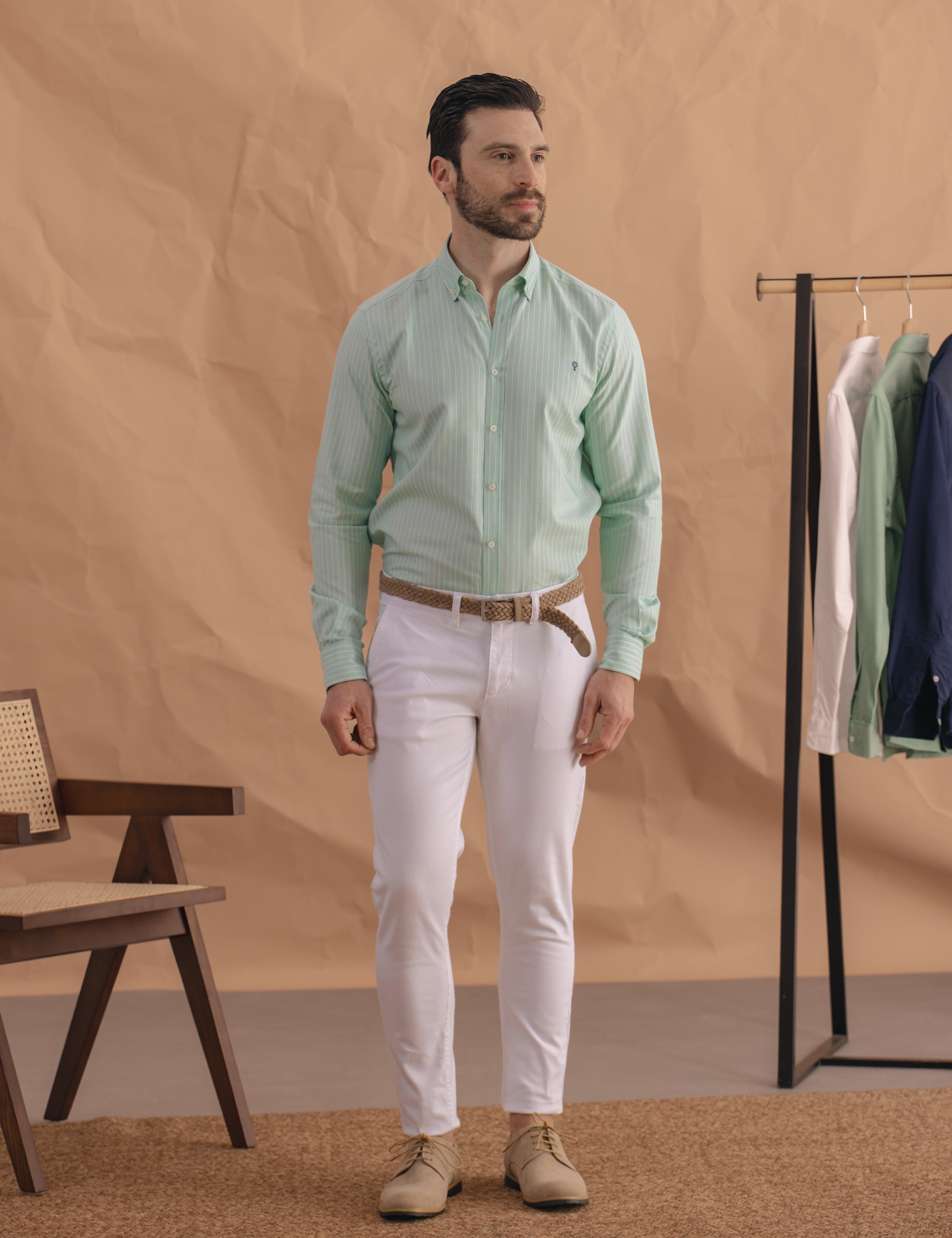Pantalón blanco estilo chino que presenta tejido con estructura. Corte skinny, detalle personalizado sobre un bolsillo trasero y cierre delantero mediante botón y cremallera. Tejido con elastano para mejorar su confort.