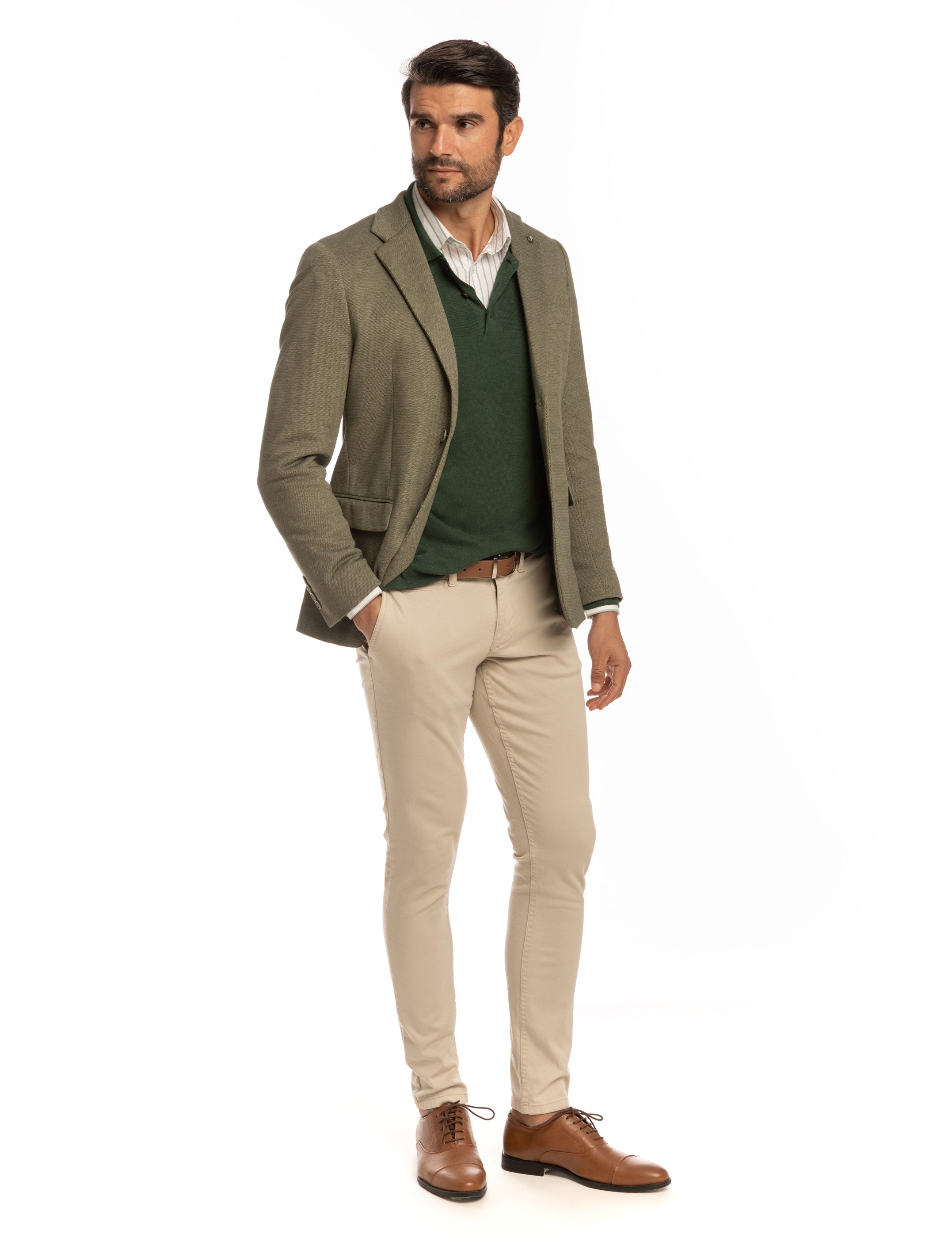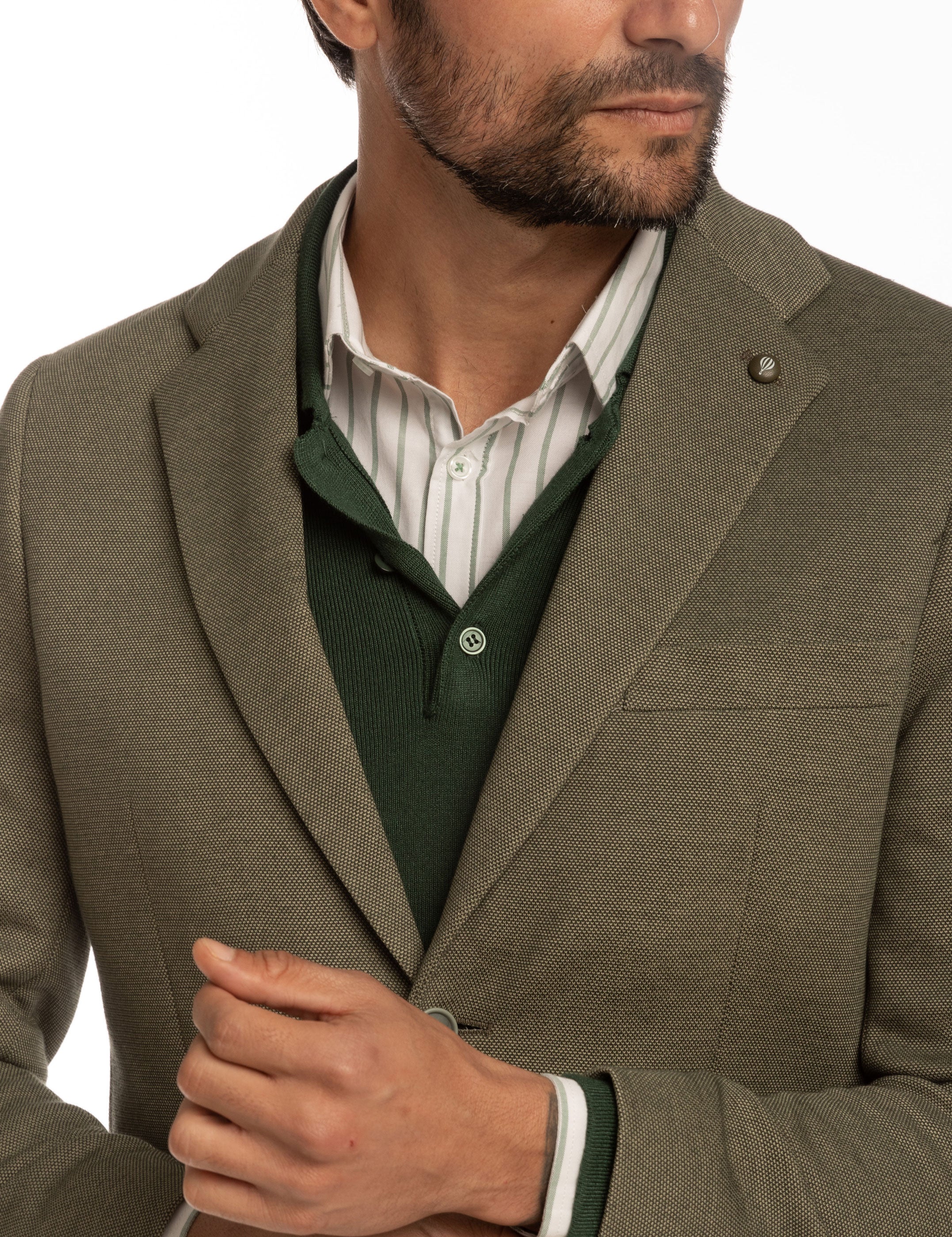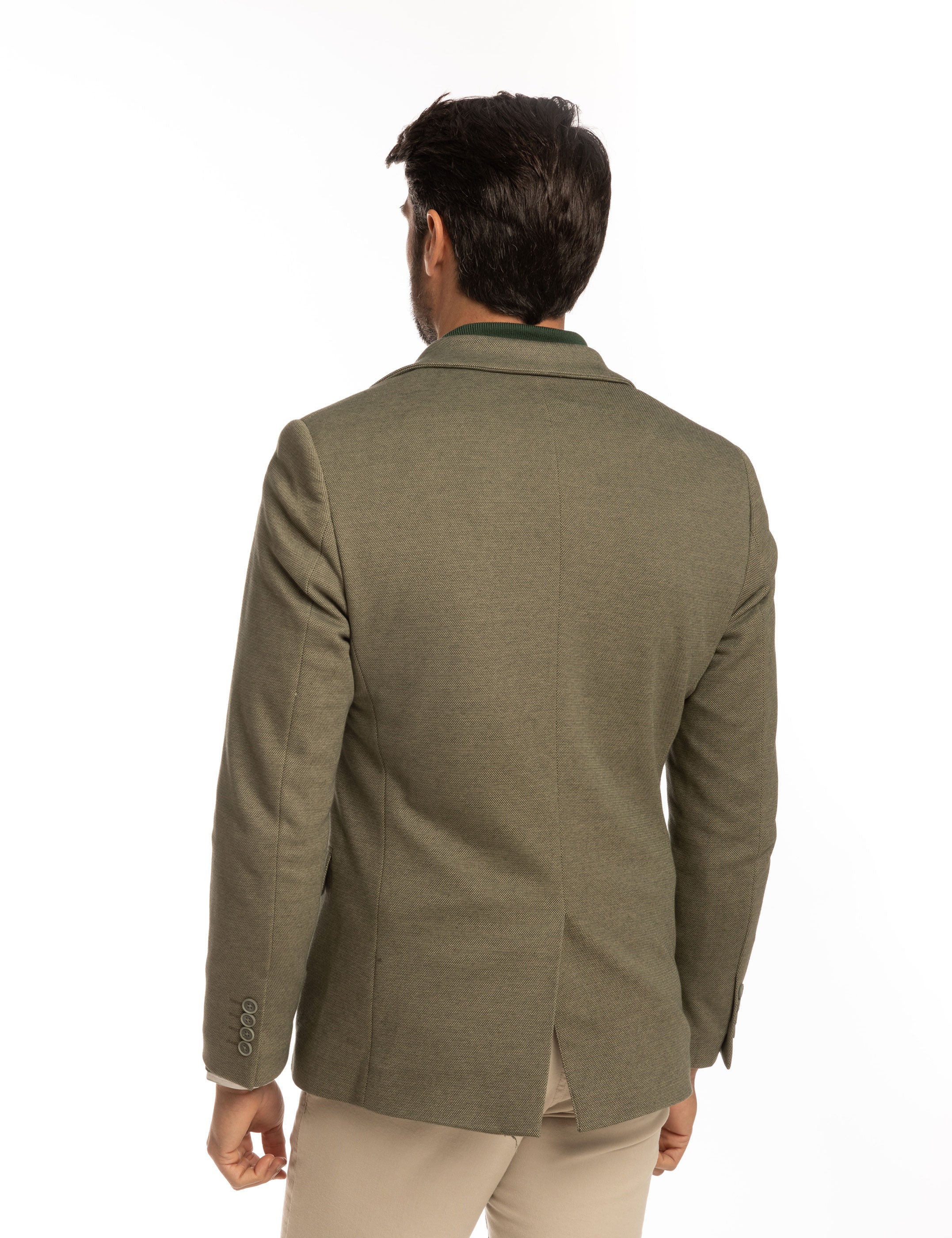 Blazer casual de punto para hombre en color verde con cierre central simple mediante botones y con cuello y solapa. Bolsillo de ojal en el pecho, dos bolsillos de solapa en la cintura y puños con botones en su terminación. Interior forrado y con bolsillos.