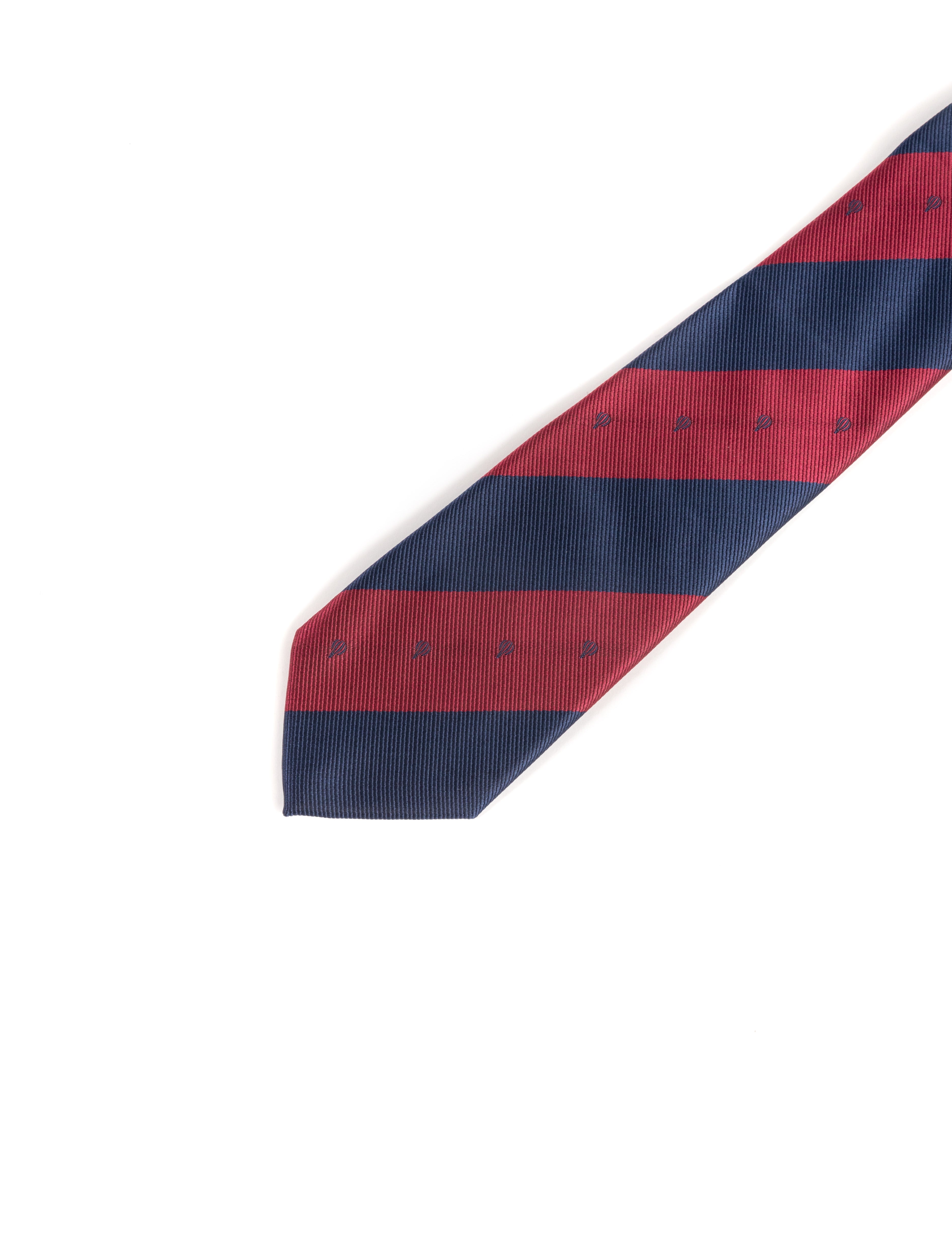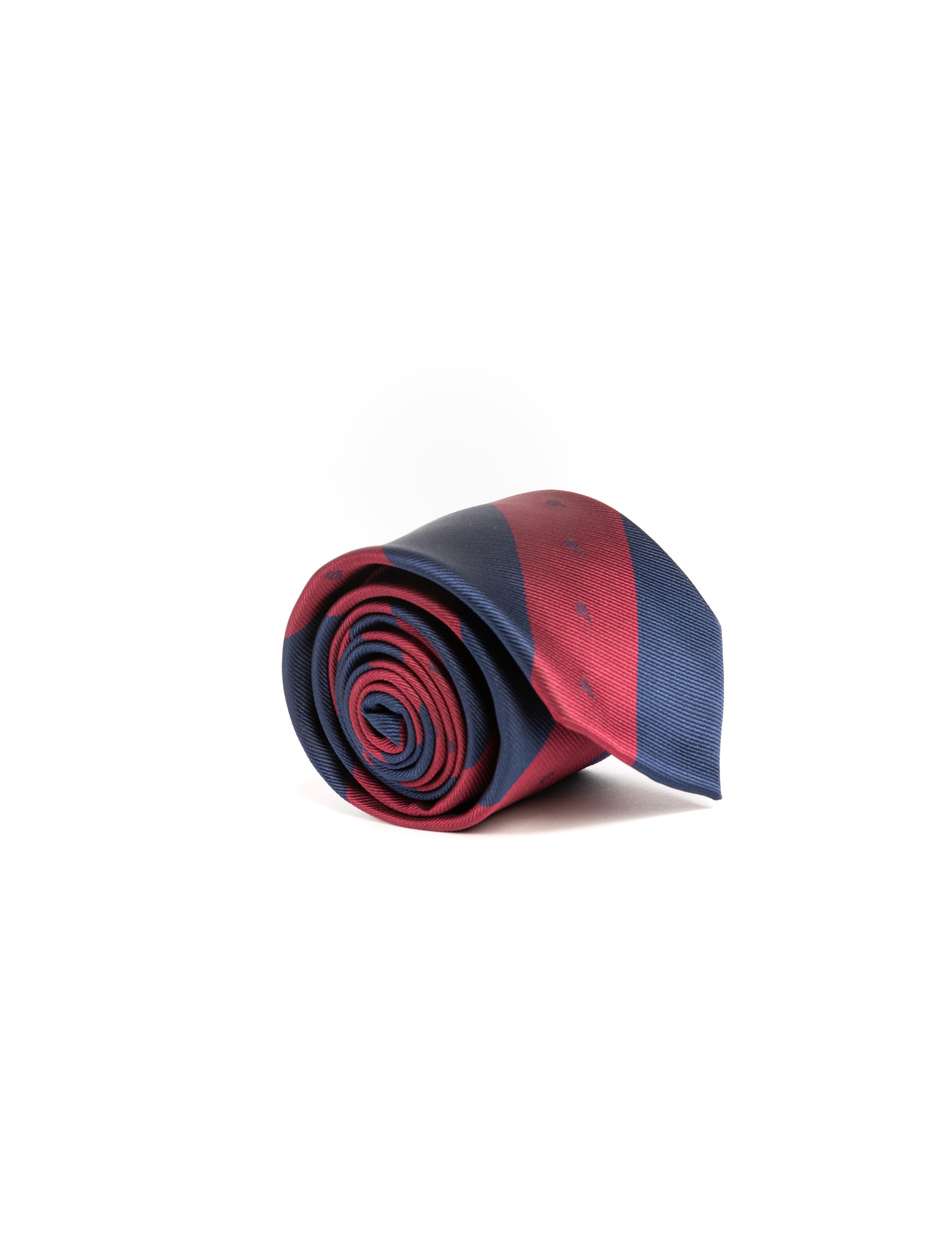 Corbata azul con rayas a contraste en burdeos confeccionada en 95% algodón y 5% viscosa.