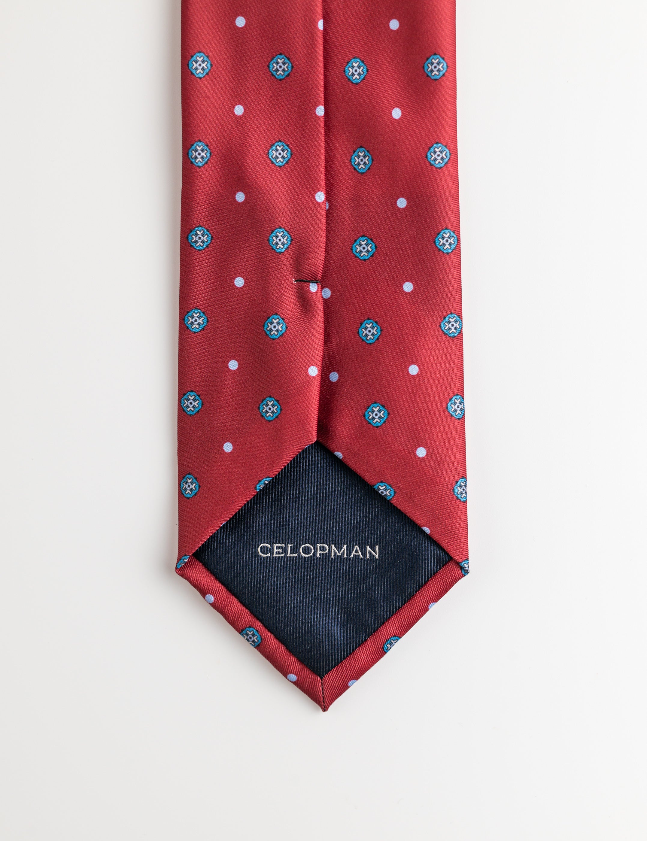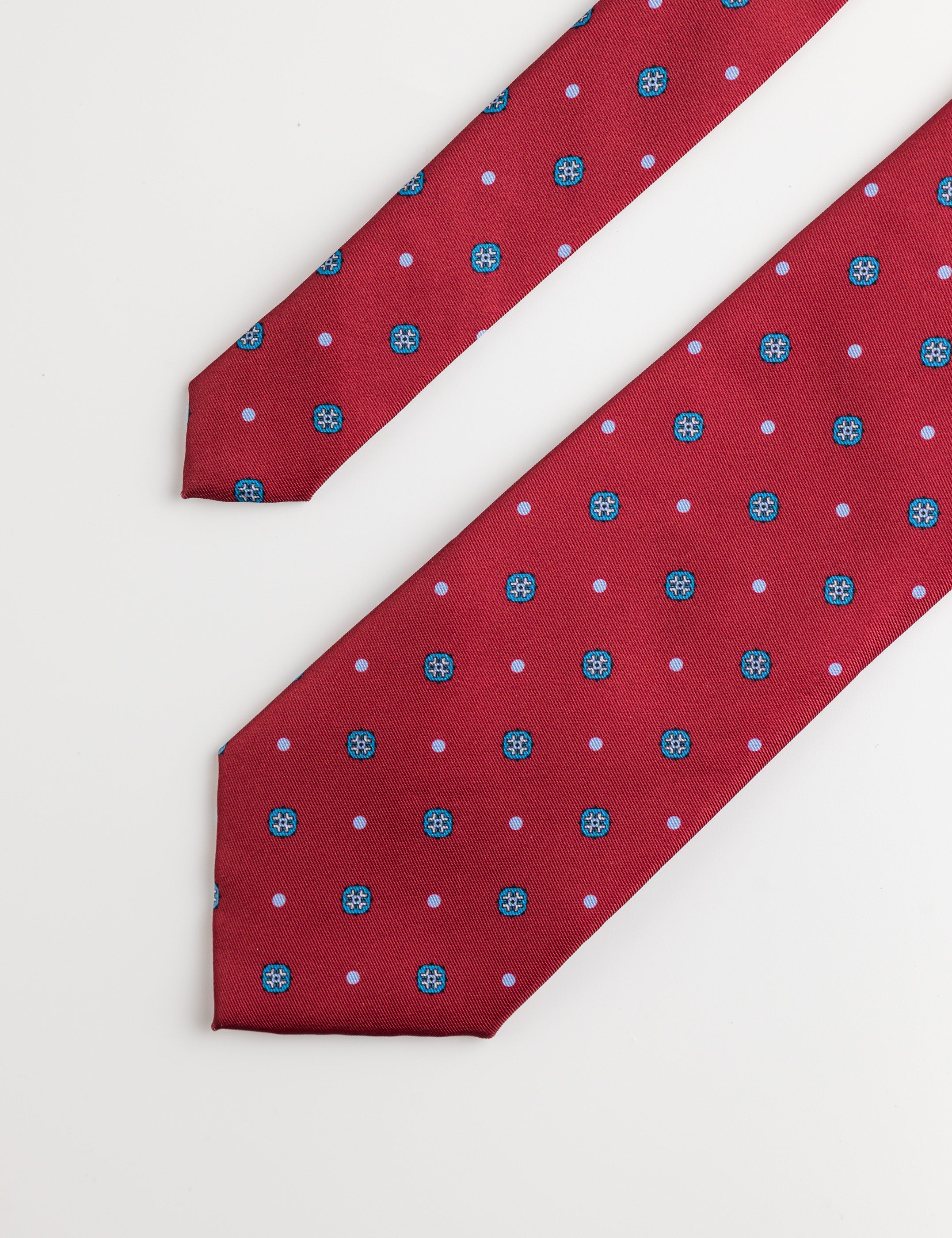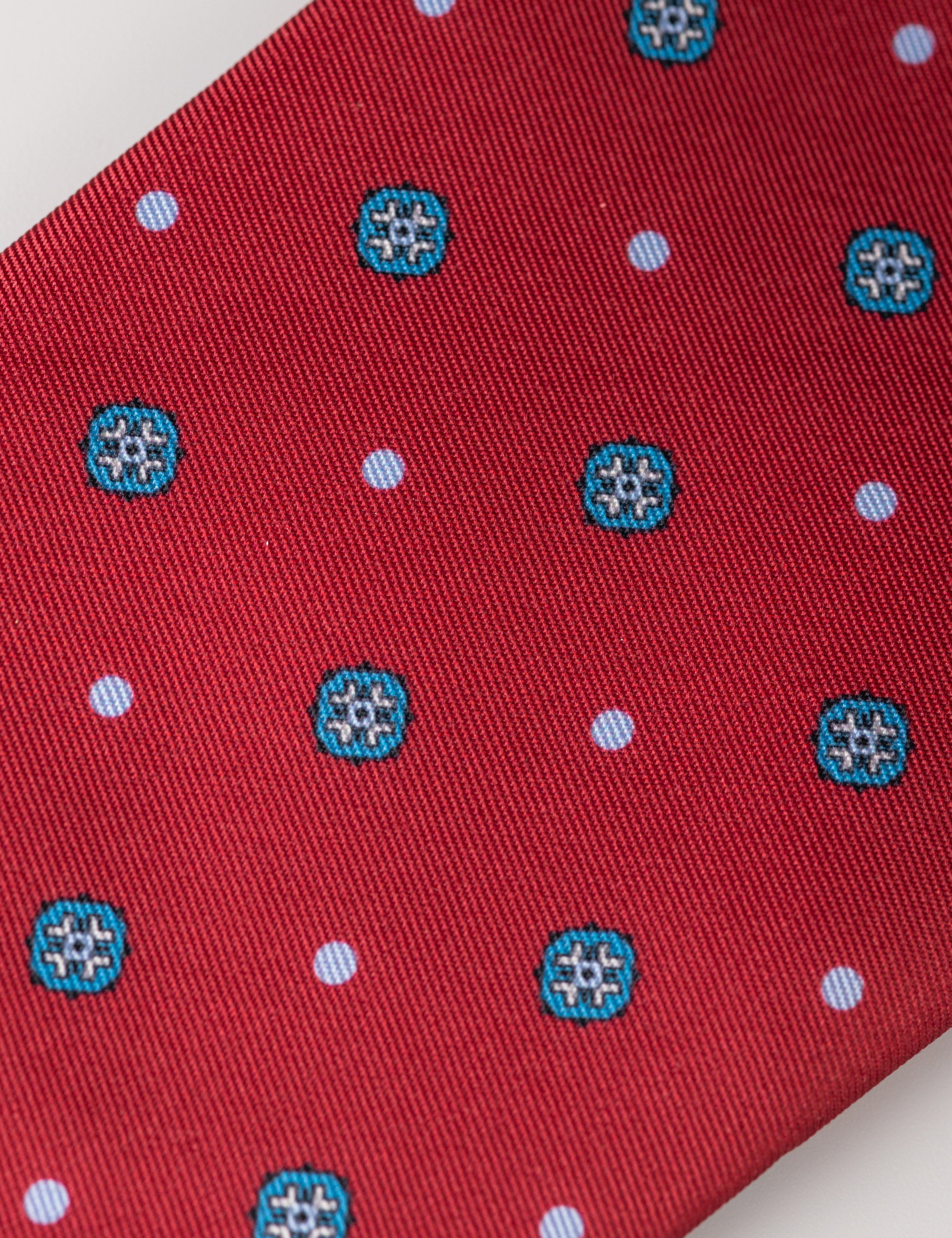 Corbata con fondo rojo y topos y dibujos a contraste.
