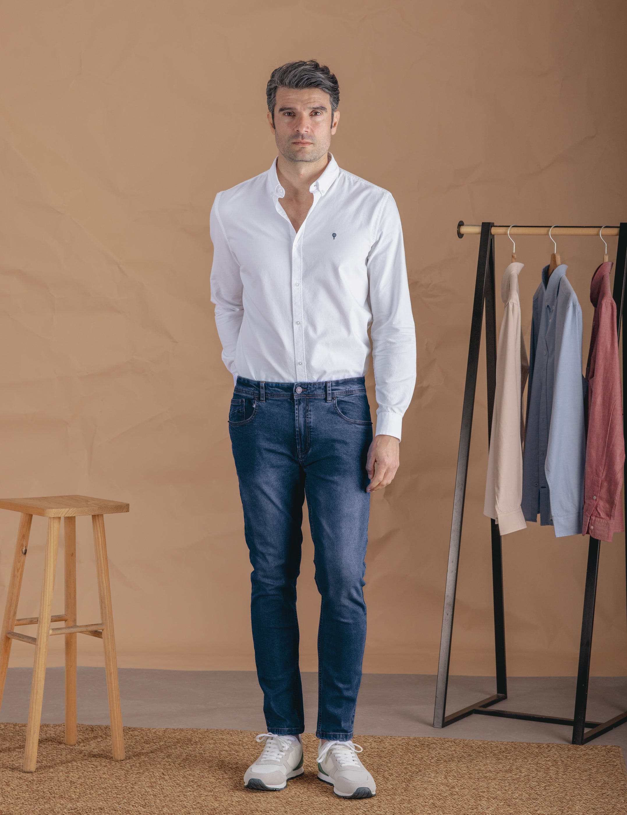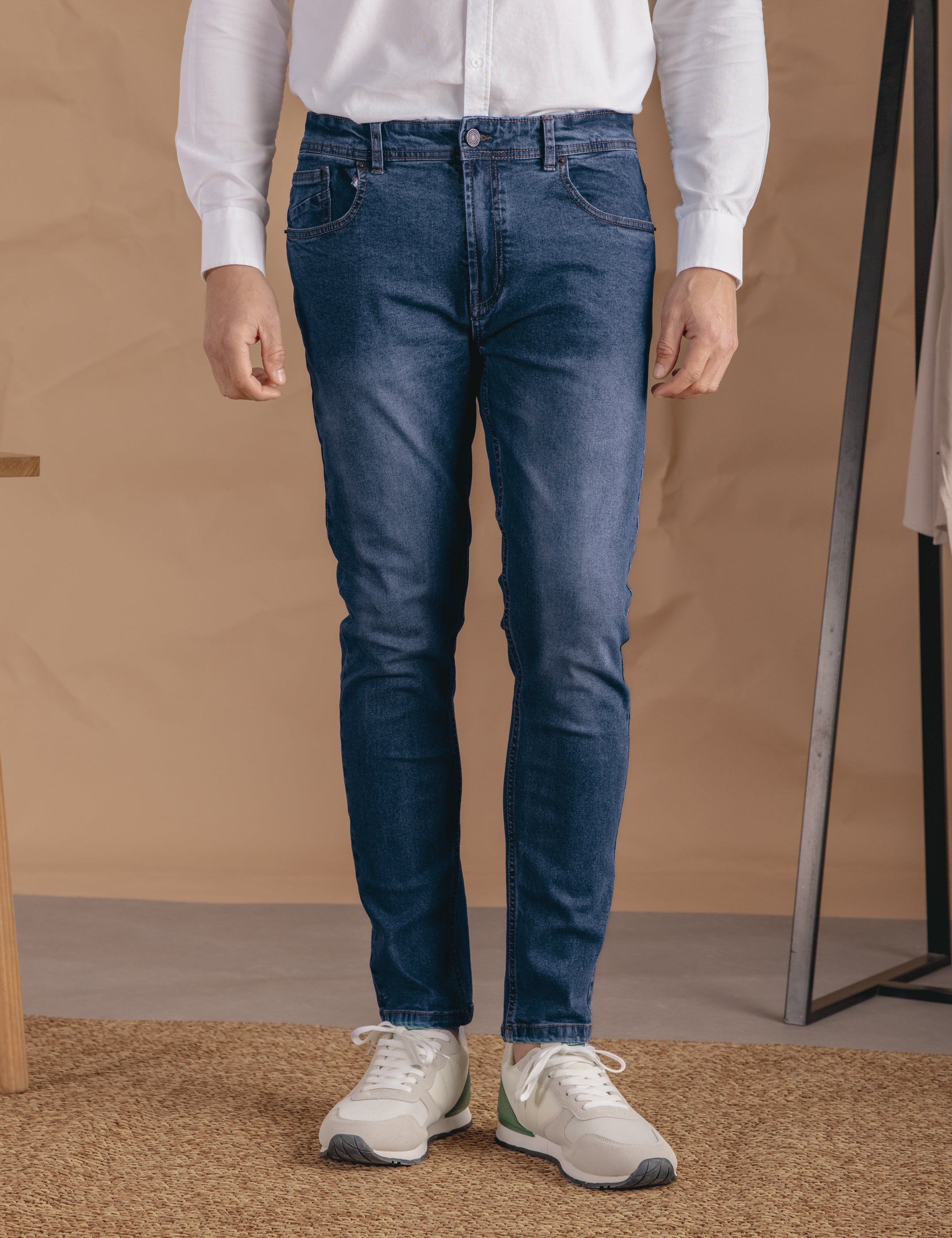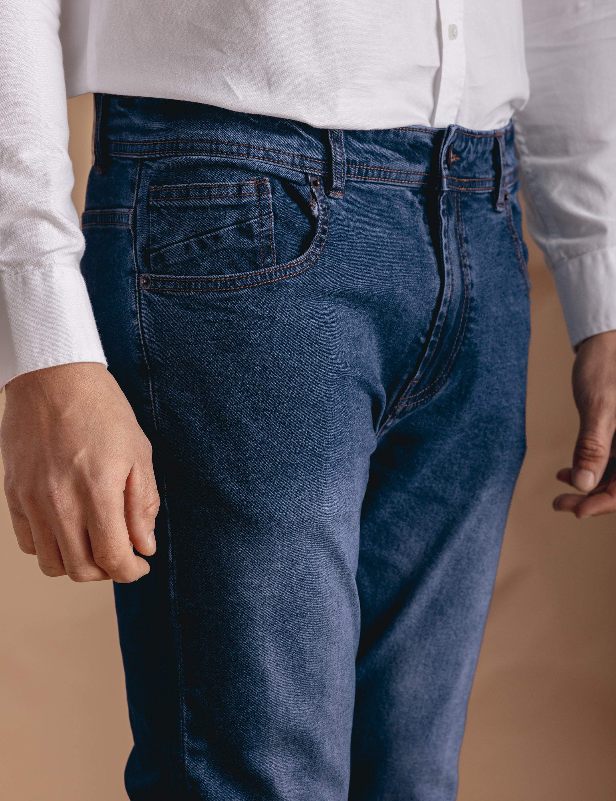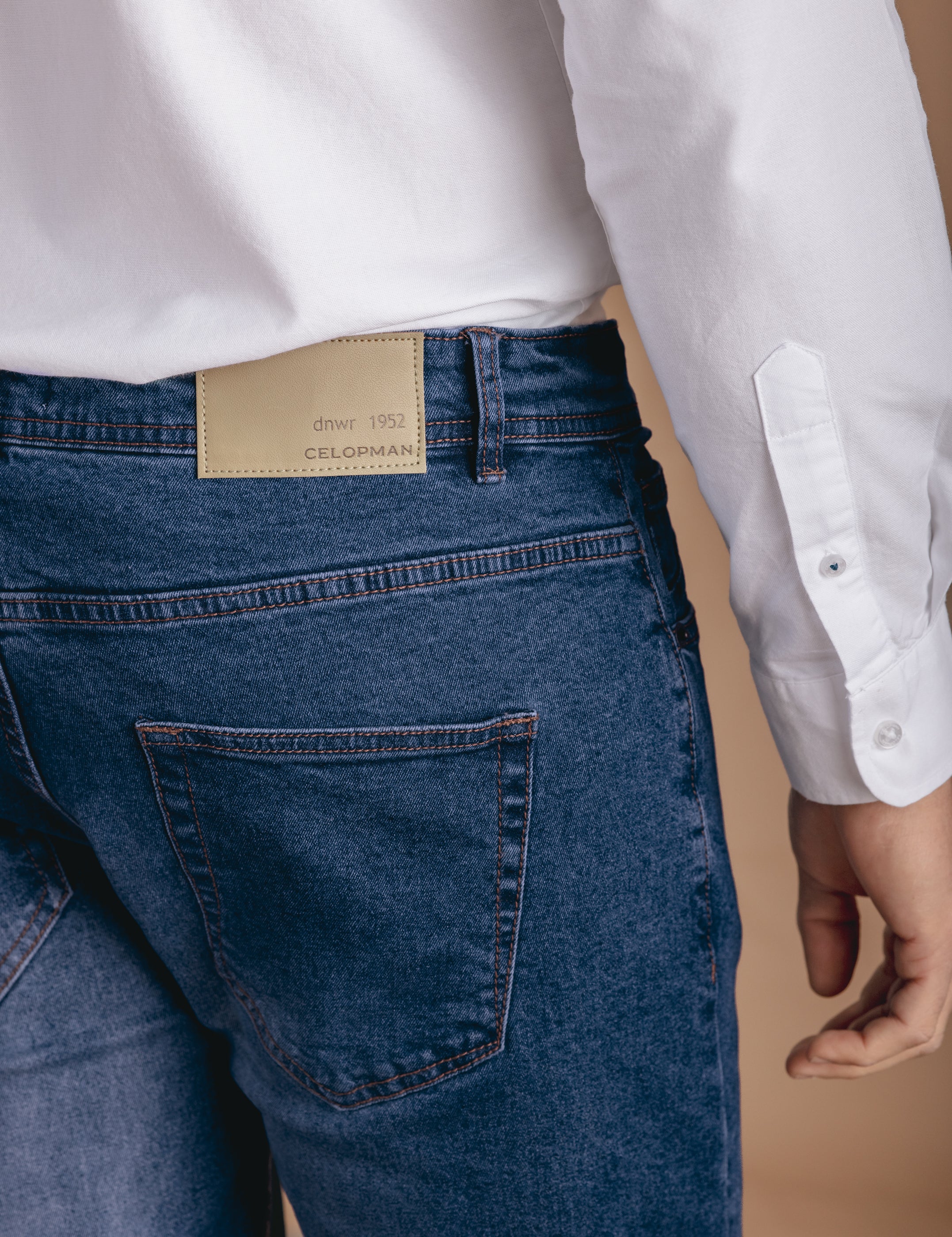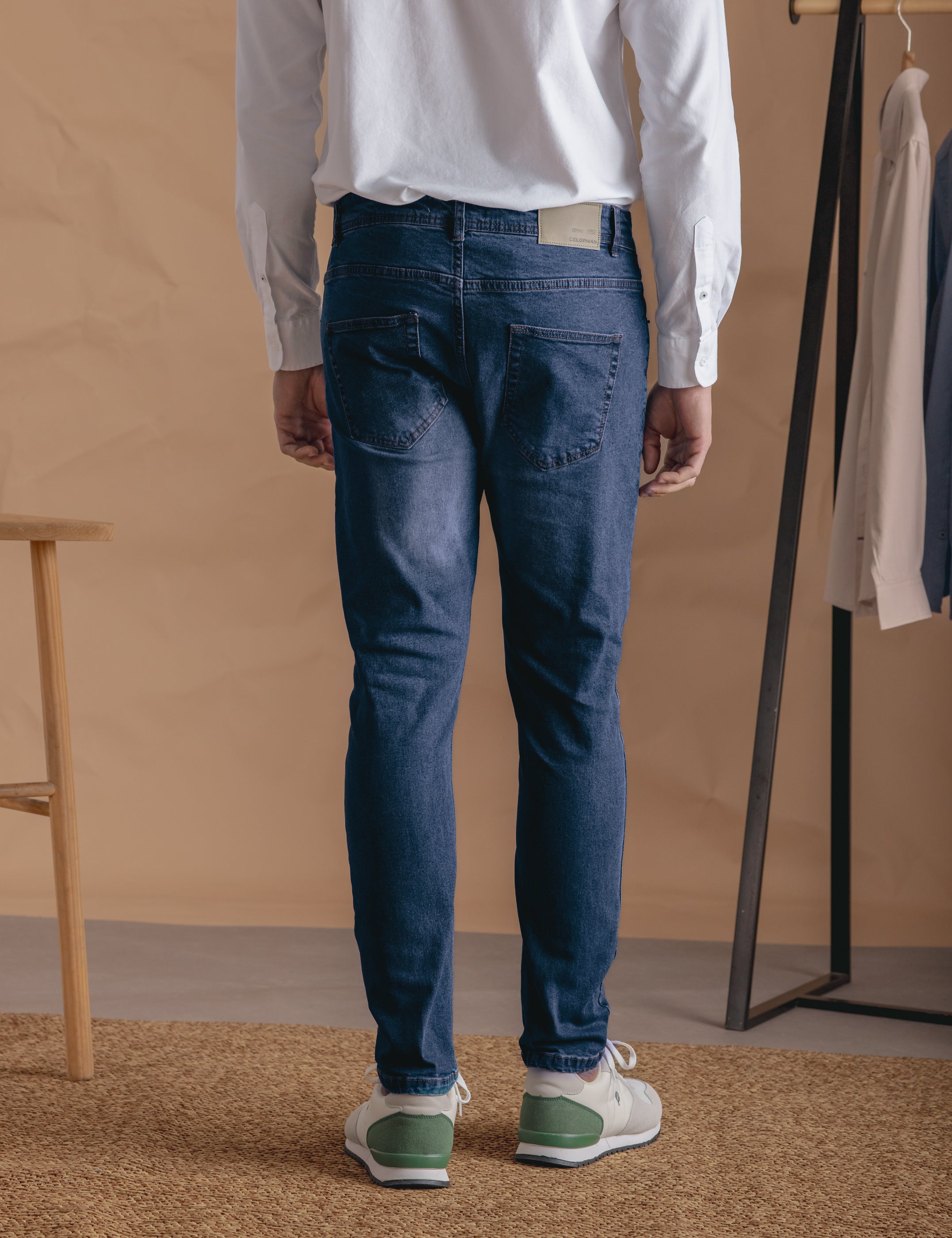 Pantalón denim de corte slim fit con cinco bolsillos y cierre central mediante botón y cremallera, pespuntes en color camel, y etiqueta en efecto piel en la cinturilla. Lleva elastano para mayor comodidad.