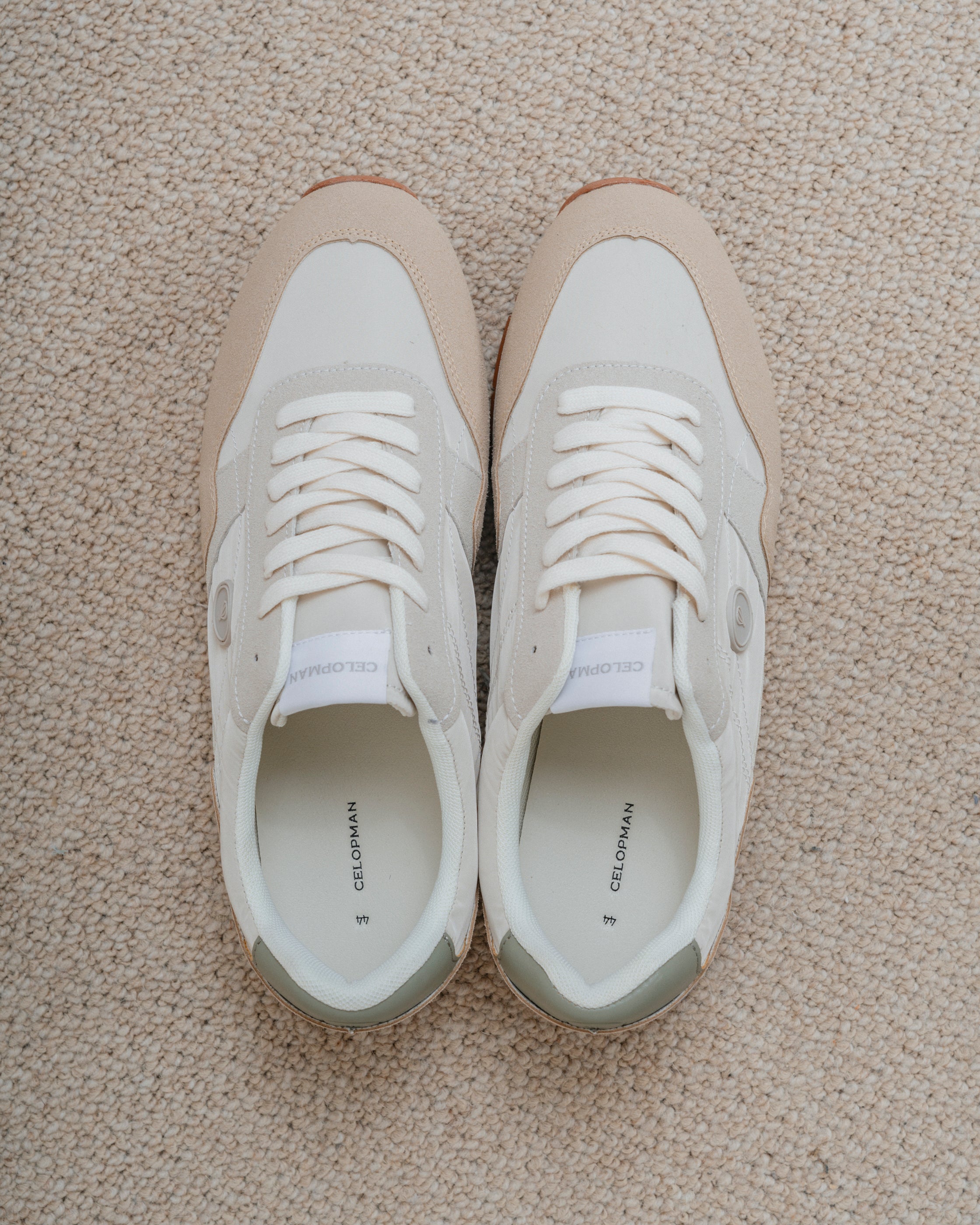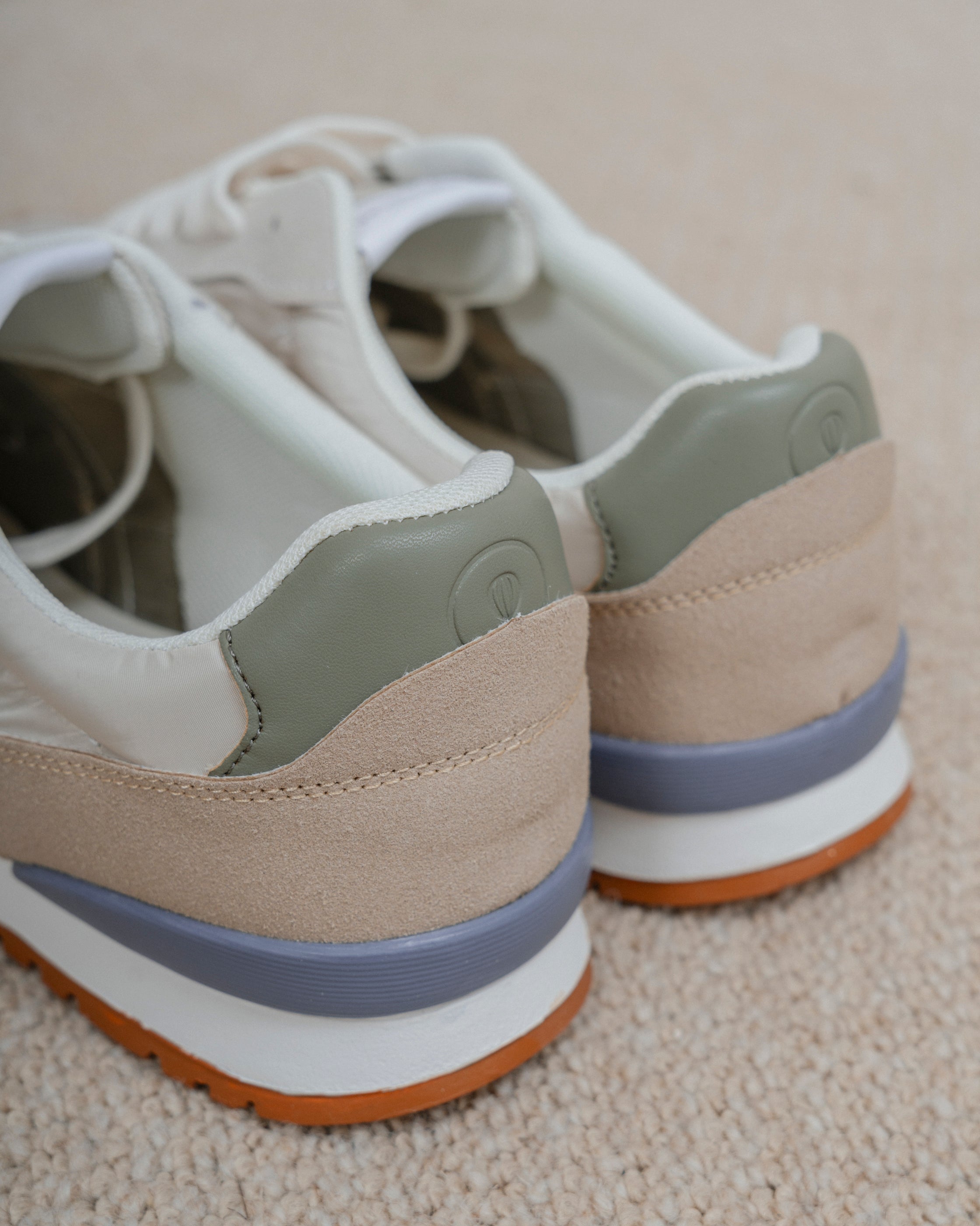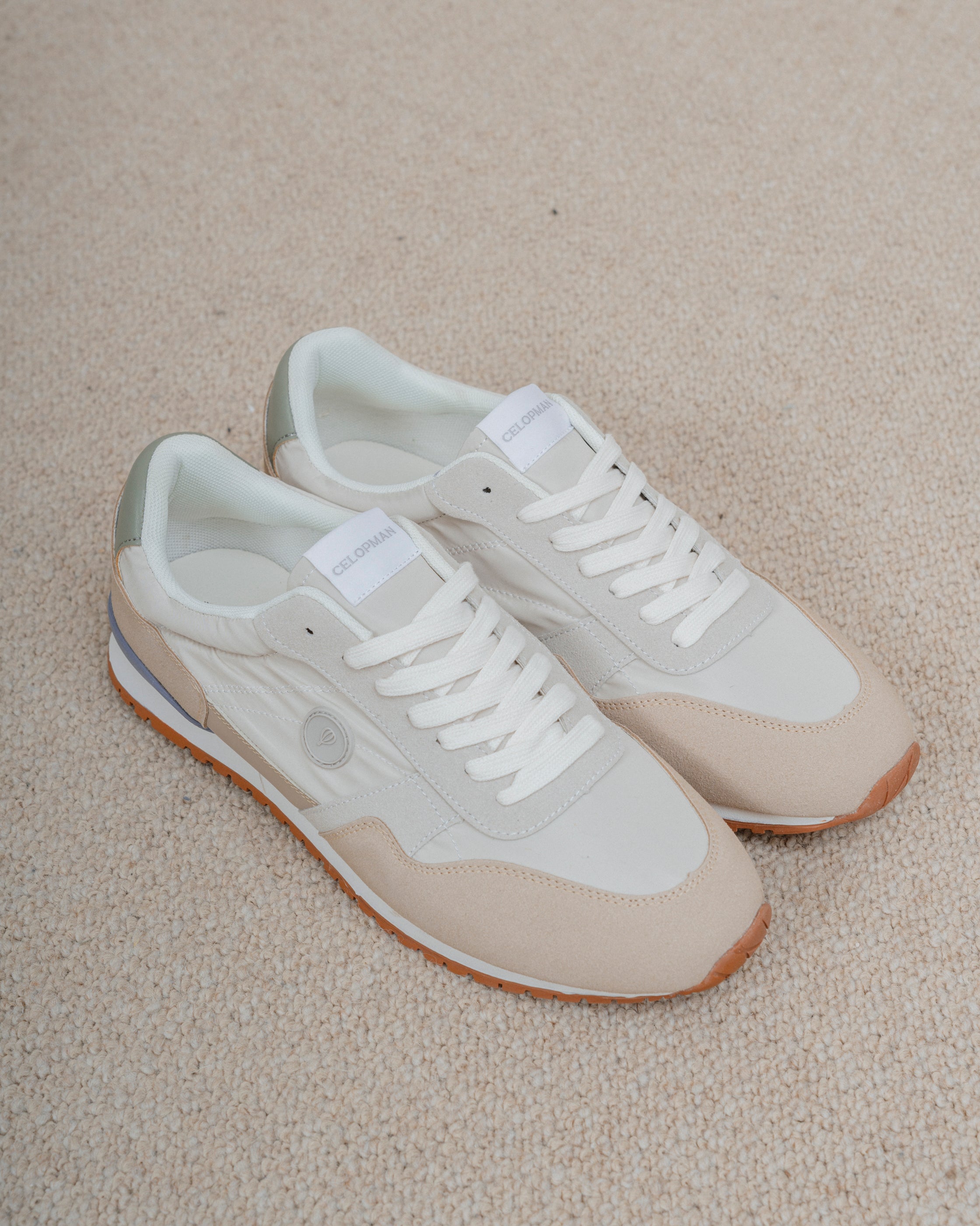 Zapato deportivo en color beige, con zonas en contraste en color y tejido y logo de la marca en el lateral exterior. Suela de goma y cordones en blanco.