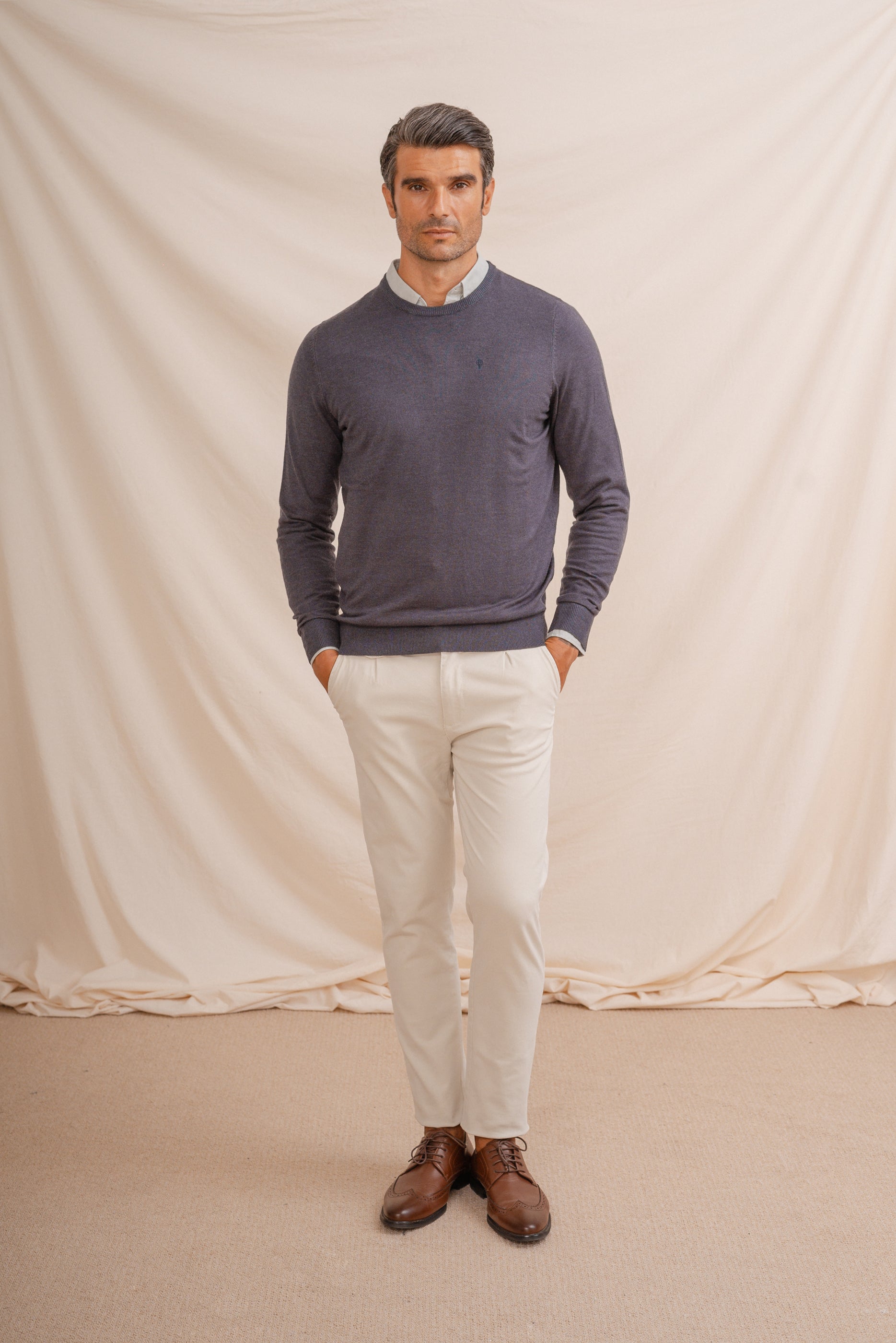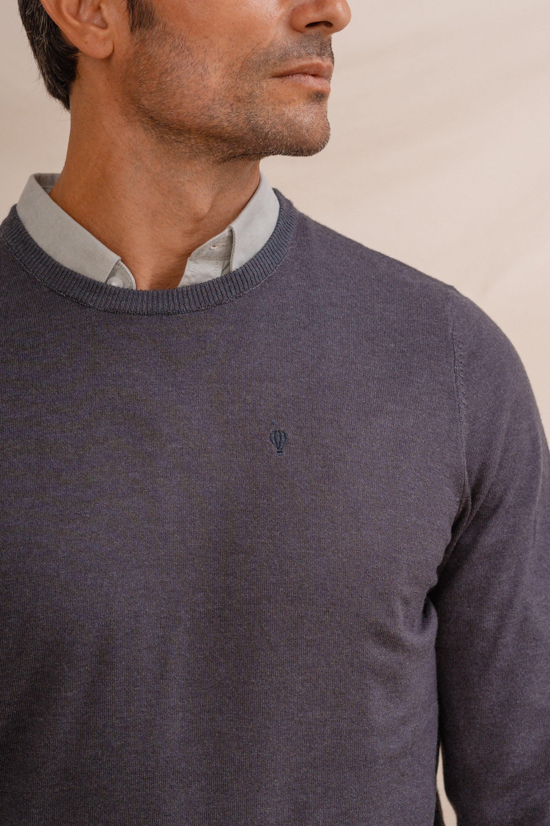 Jersey de punto fino básico con cuello a la caja. Bajo, puños y cuello en ribs de punto elástico para mayor comodidad. Logo bordado al tono a la altura del pecho.