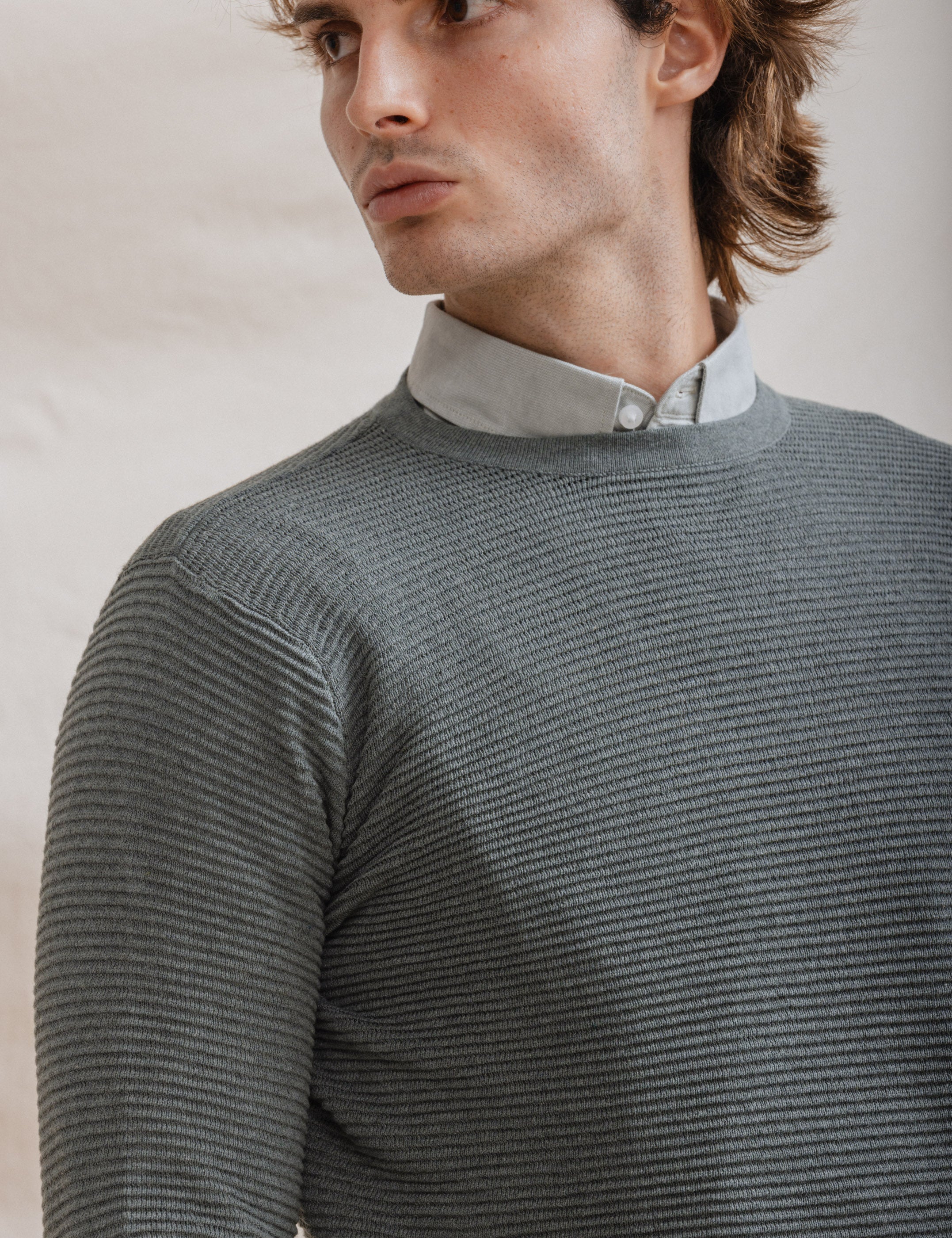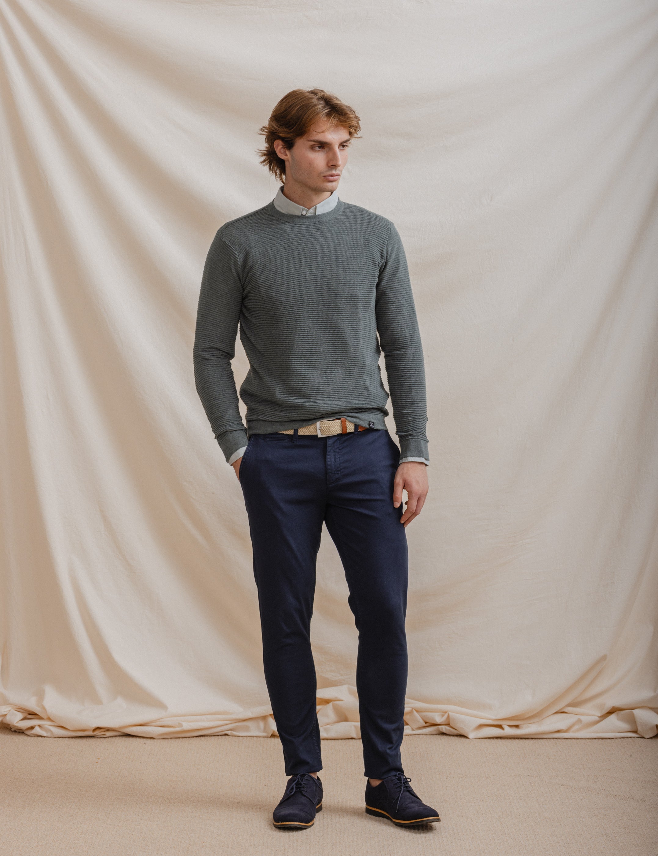 Jersey básico de punto ottoman en color verde y cuello a la caja. Bajo, puños y cuello en ribs de punto elástico para mayor comodidad.