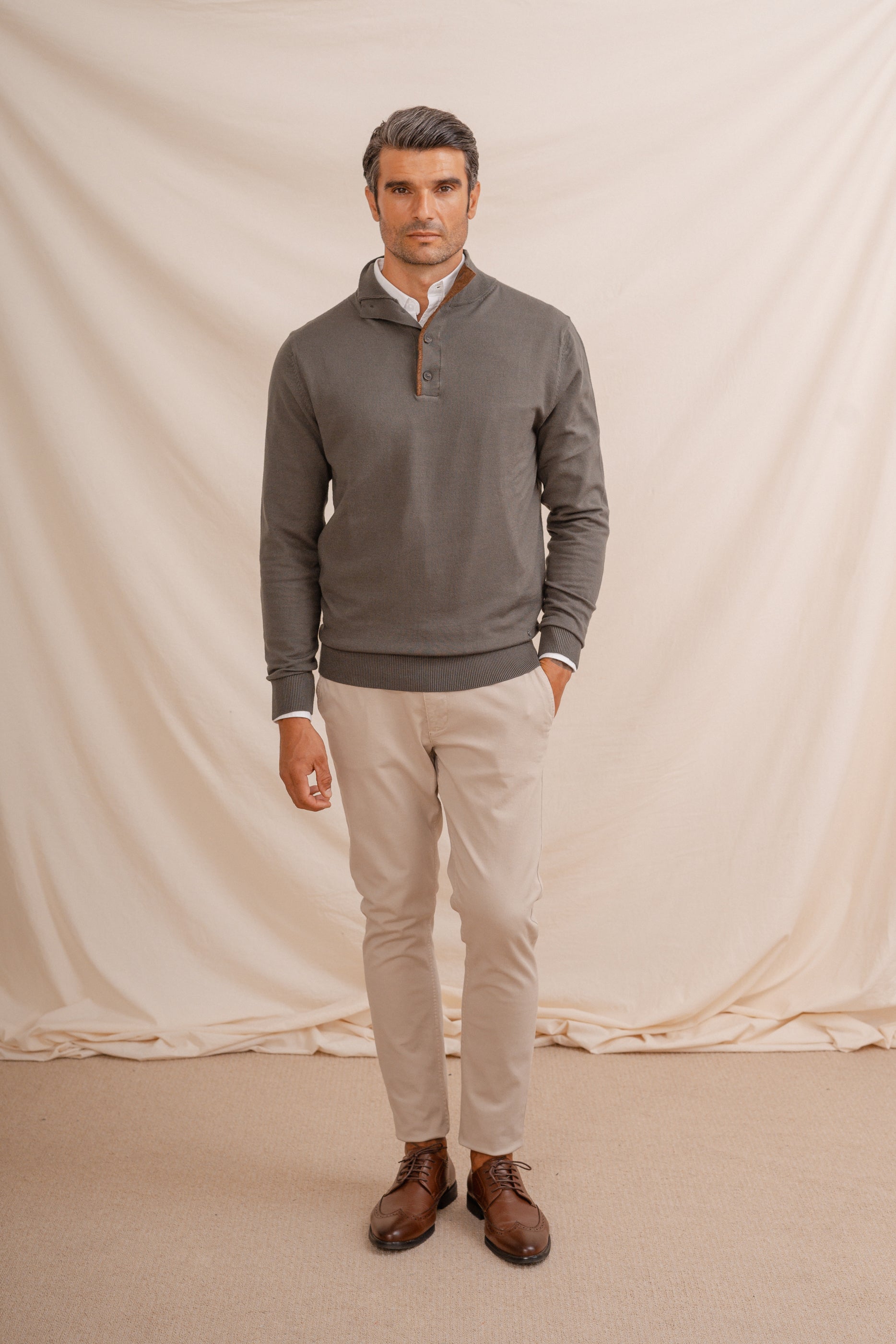 Jersey para hombre en color verde con cuello perkins tipo polo con botones y vivo en color a contraste. Manga larga y corte regular fit