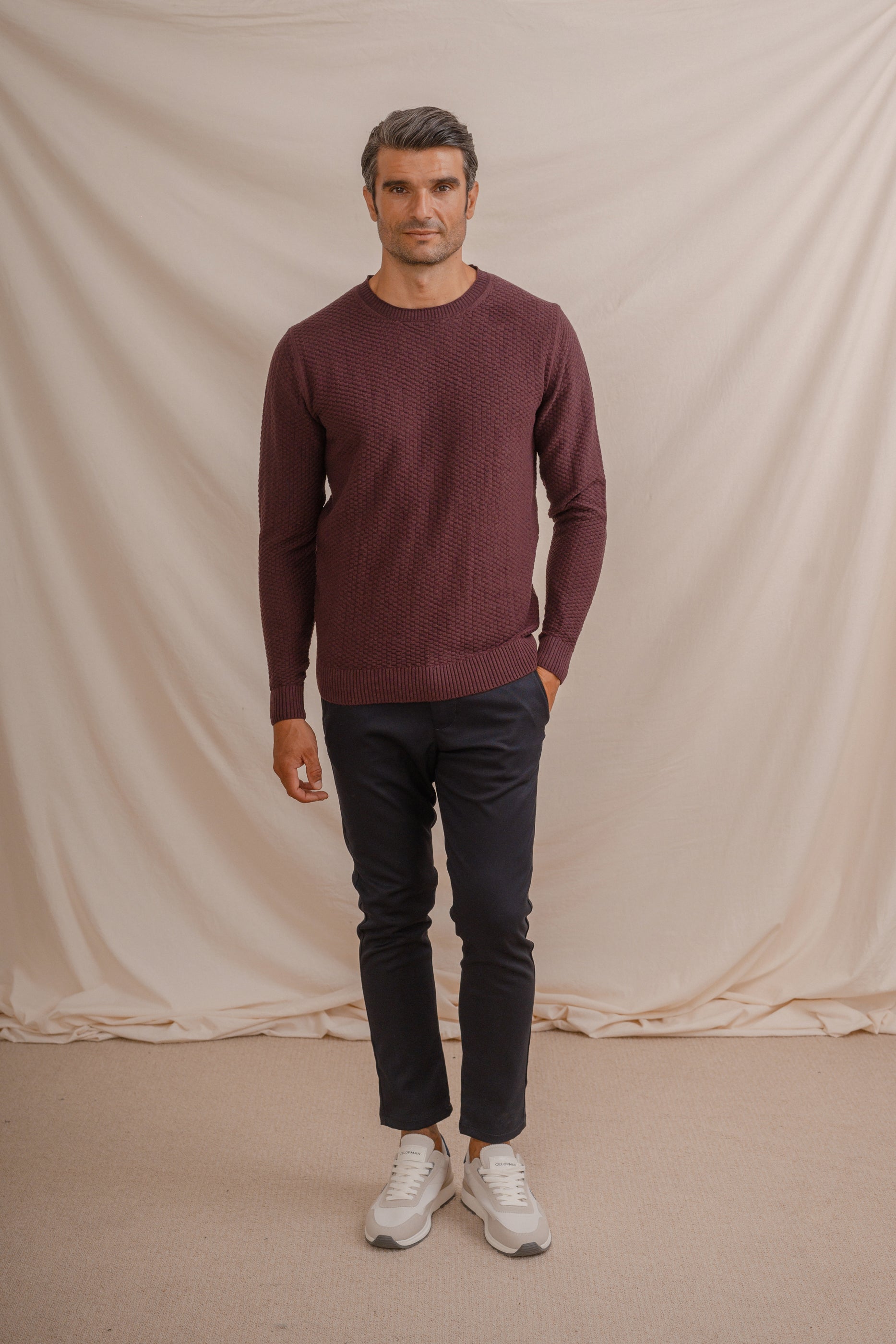 Jersey de punto con estructura en color burdeo y cuello a la caja. Bajo, puños y cuello en ribs de punto elástico para mayor comodidad.