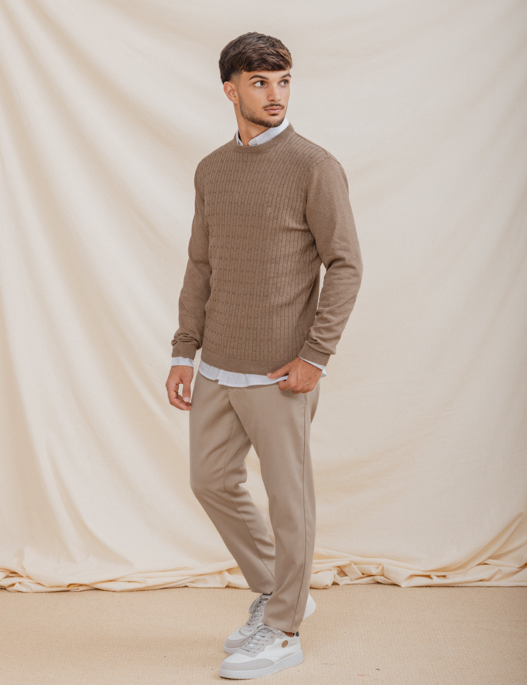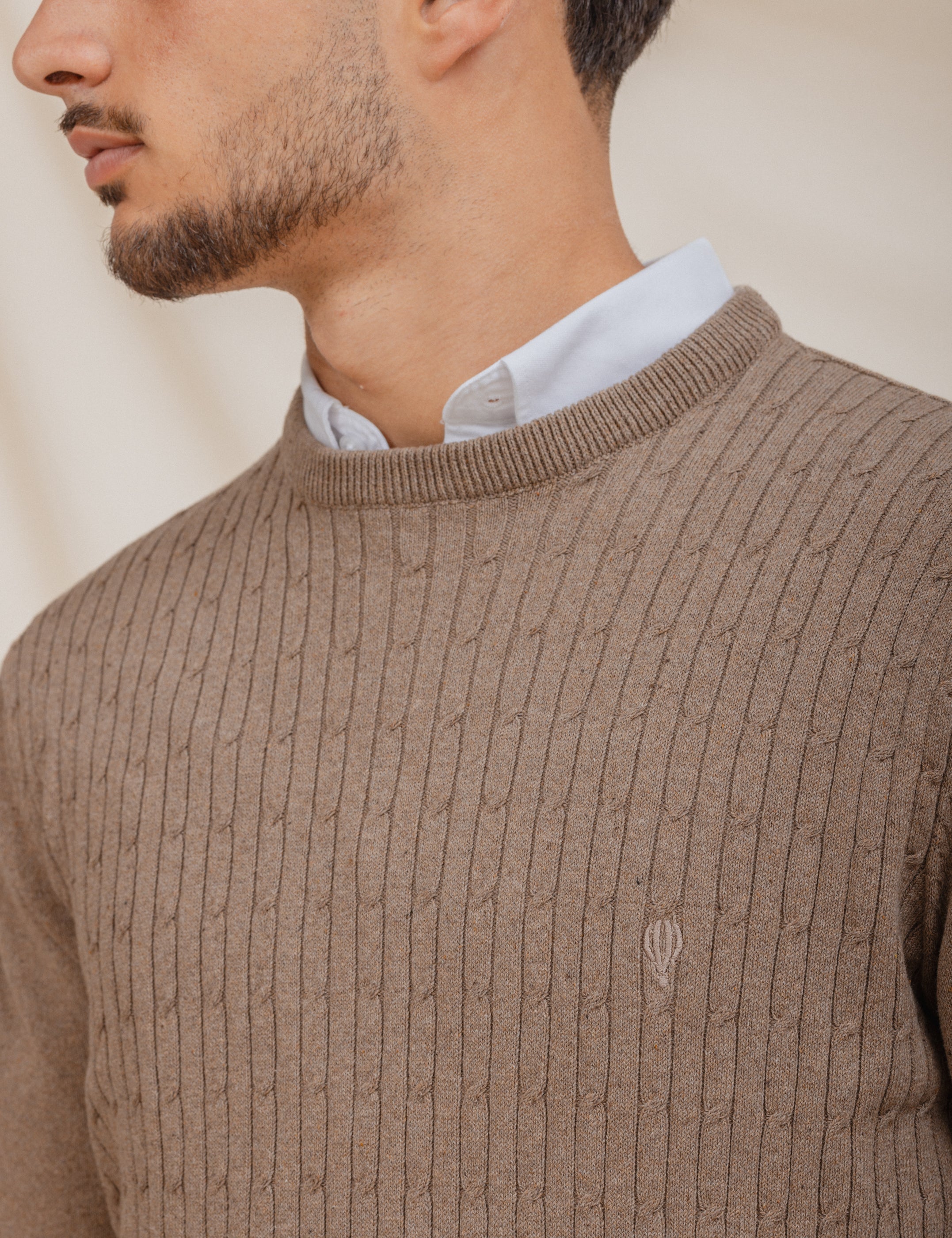 Jersey de punto para hombre con estructura en forma de nudos en color beige. Cuello a la caja y mangas largas.