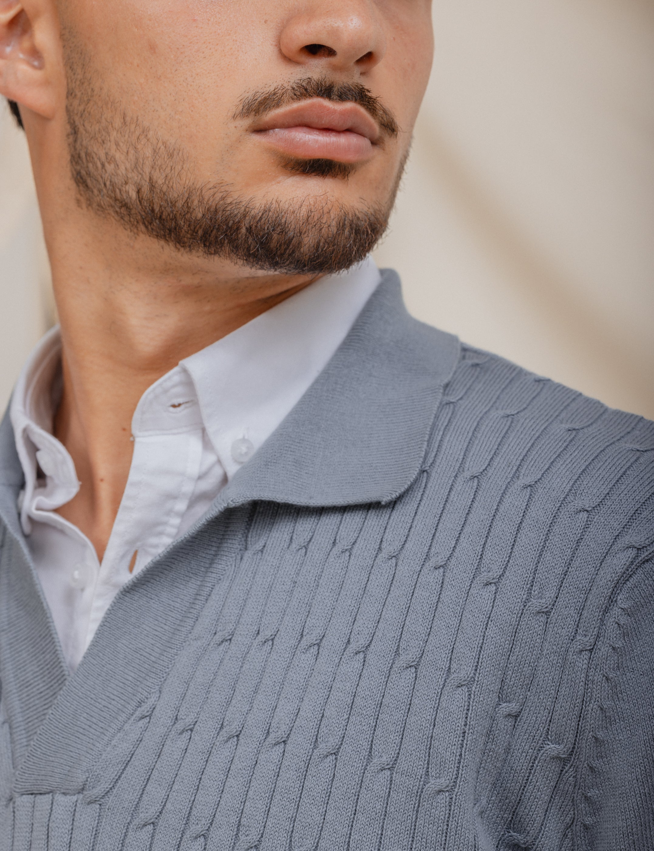 Jersey básico de punto con cuello tipo polo y estructura en forma de nudos en color celeste. Bajo, puños y cuello en ribs de punto elástico para mayor comodidad. Confeccionado en 70% algodón y un 30% nylon.