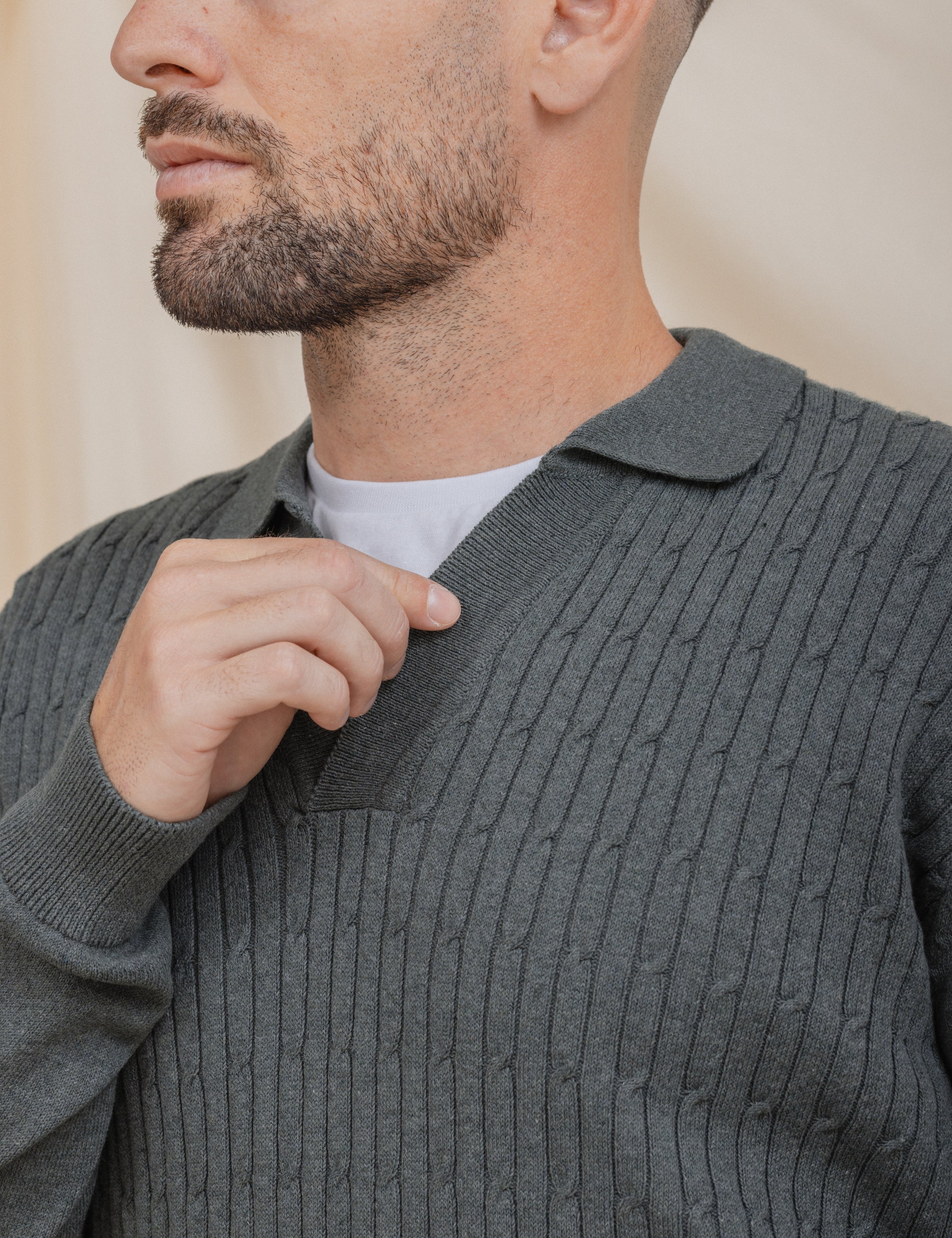 Jersey básico de punto con cuello tipo polo y estructura en forma de nudos en color verde. Bajo, puños y cuello en ribs de punto elástico para mayor comodidad. Confeccionado en 70% algodón y un 30% nylon.