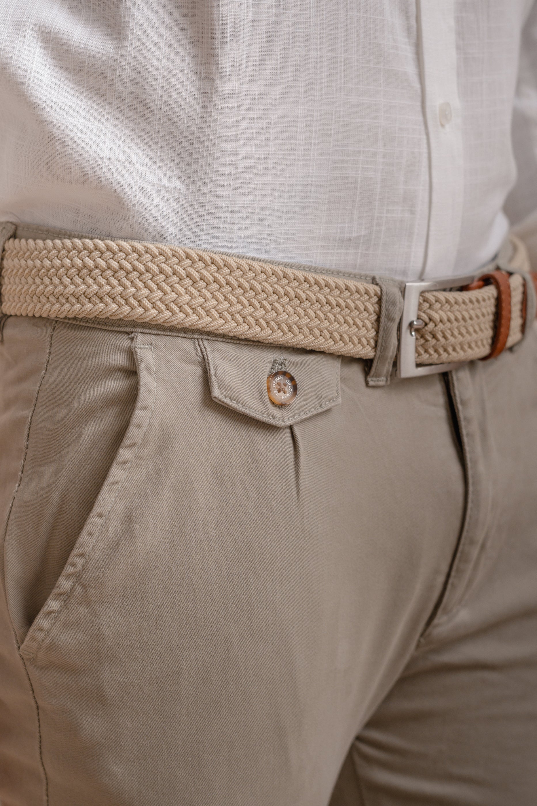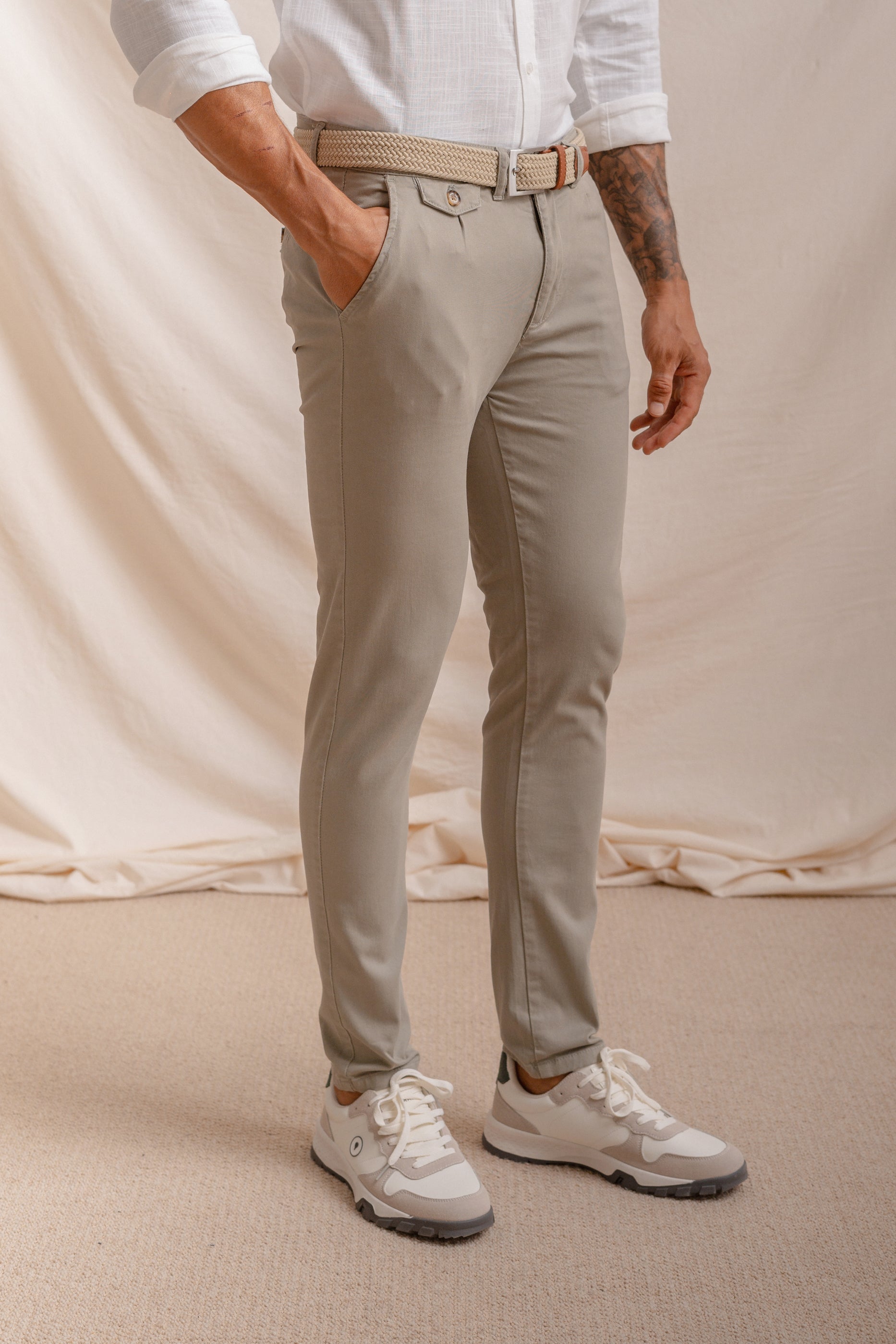 Pantalón casual verde estilo chino. Corte con pinzas slim. Dos bolsillos laterales en cadera y dos bolsillos traseros. Cierre delantero mediante botón y cremallera. Tejido de algodón con elastano para mejorar su confort