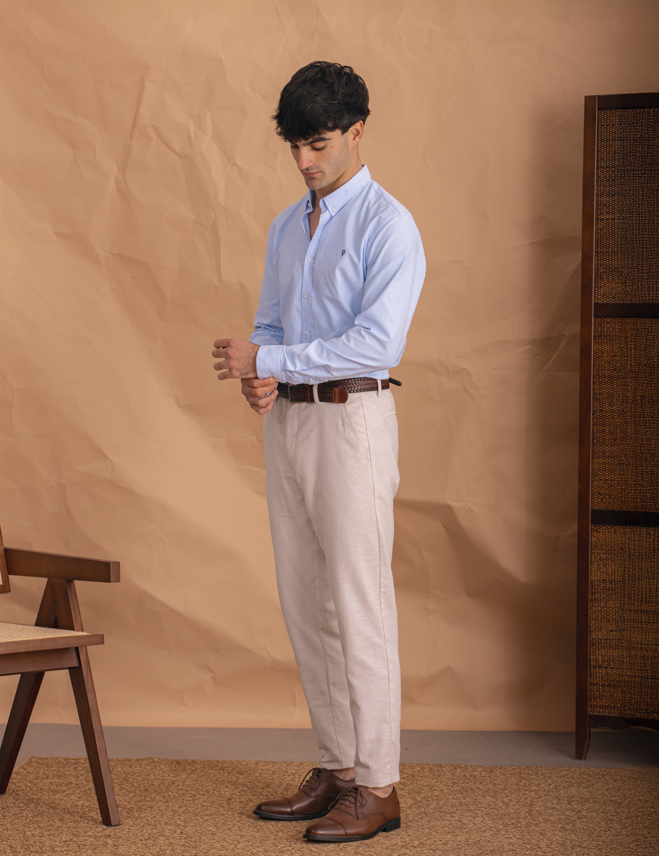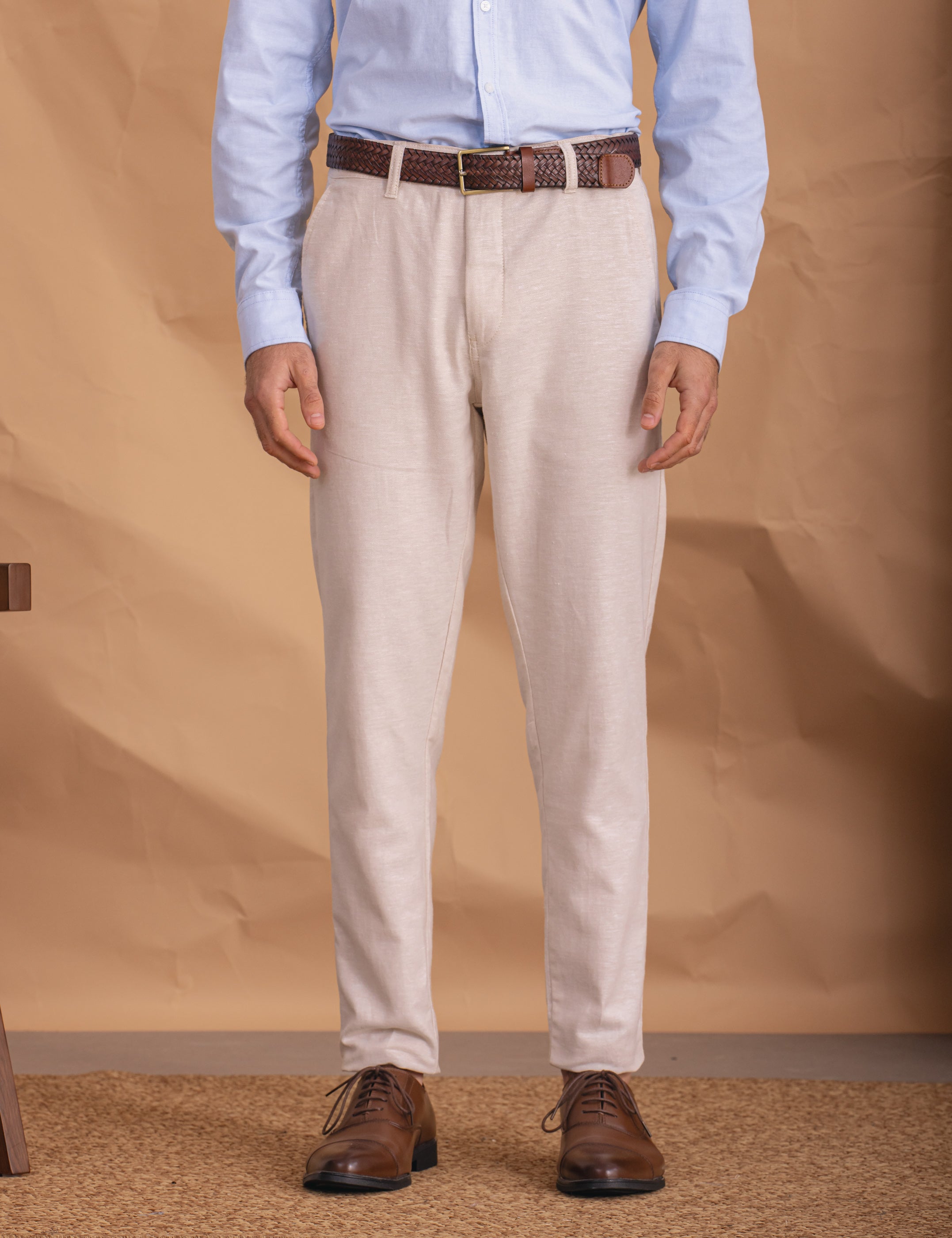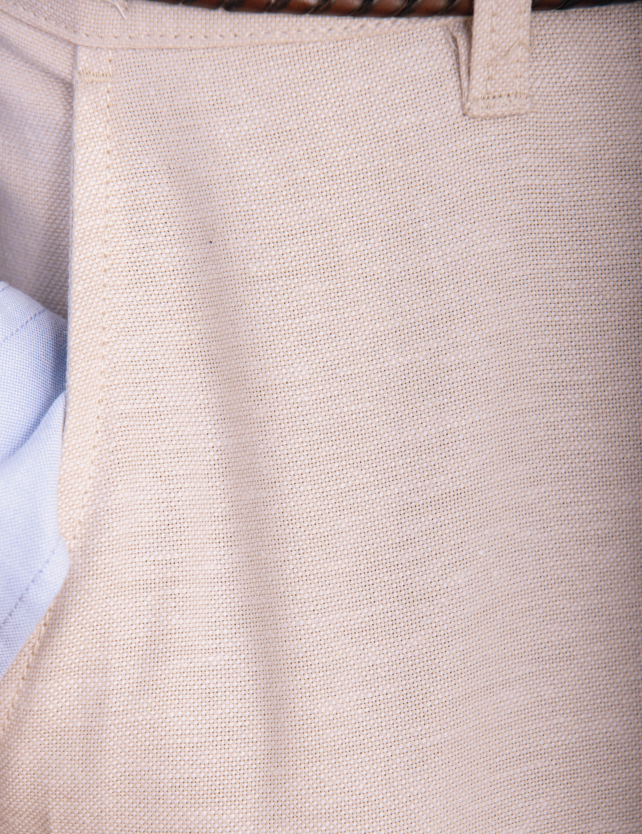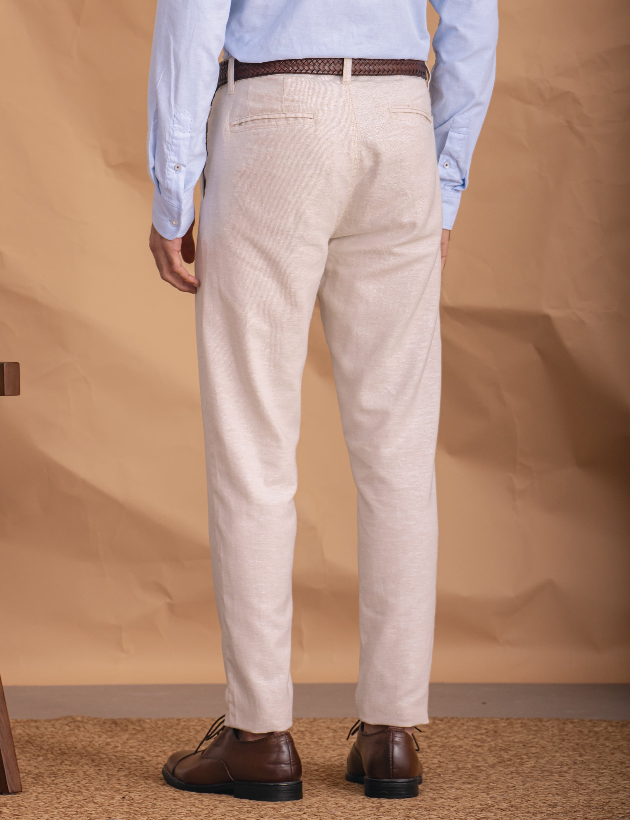Pantalón casual estilo chino confeccionado en un 74% algodón y 26% lino. Cintura con cierre en botón y cremallera. Dos bolsillos laterales abiertos y dos bolsillos en la parte trasera. Corte regular fit.