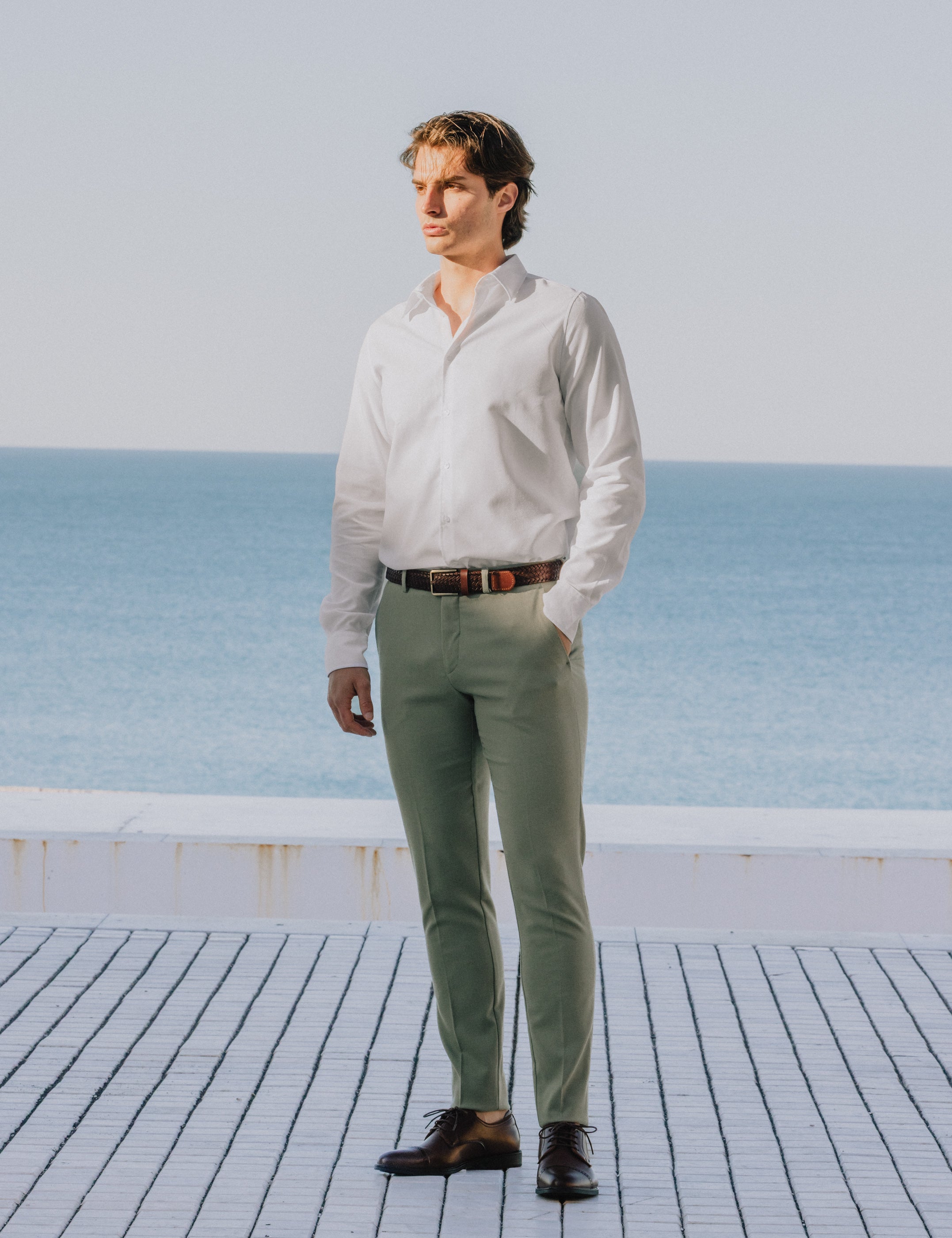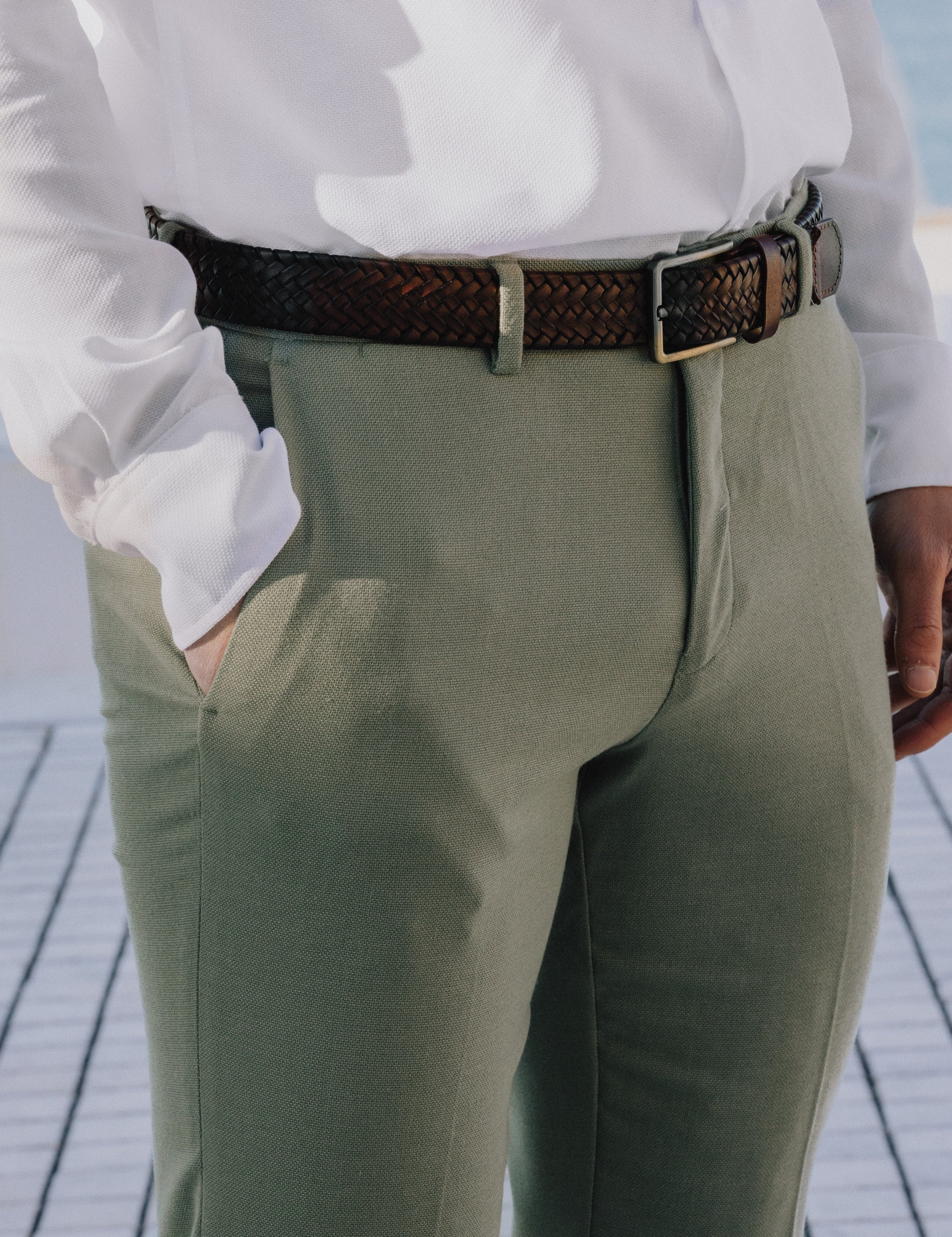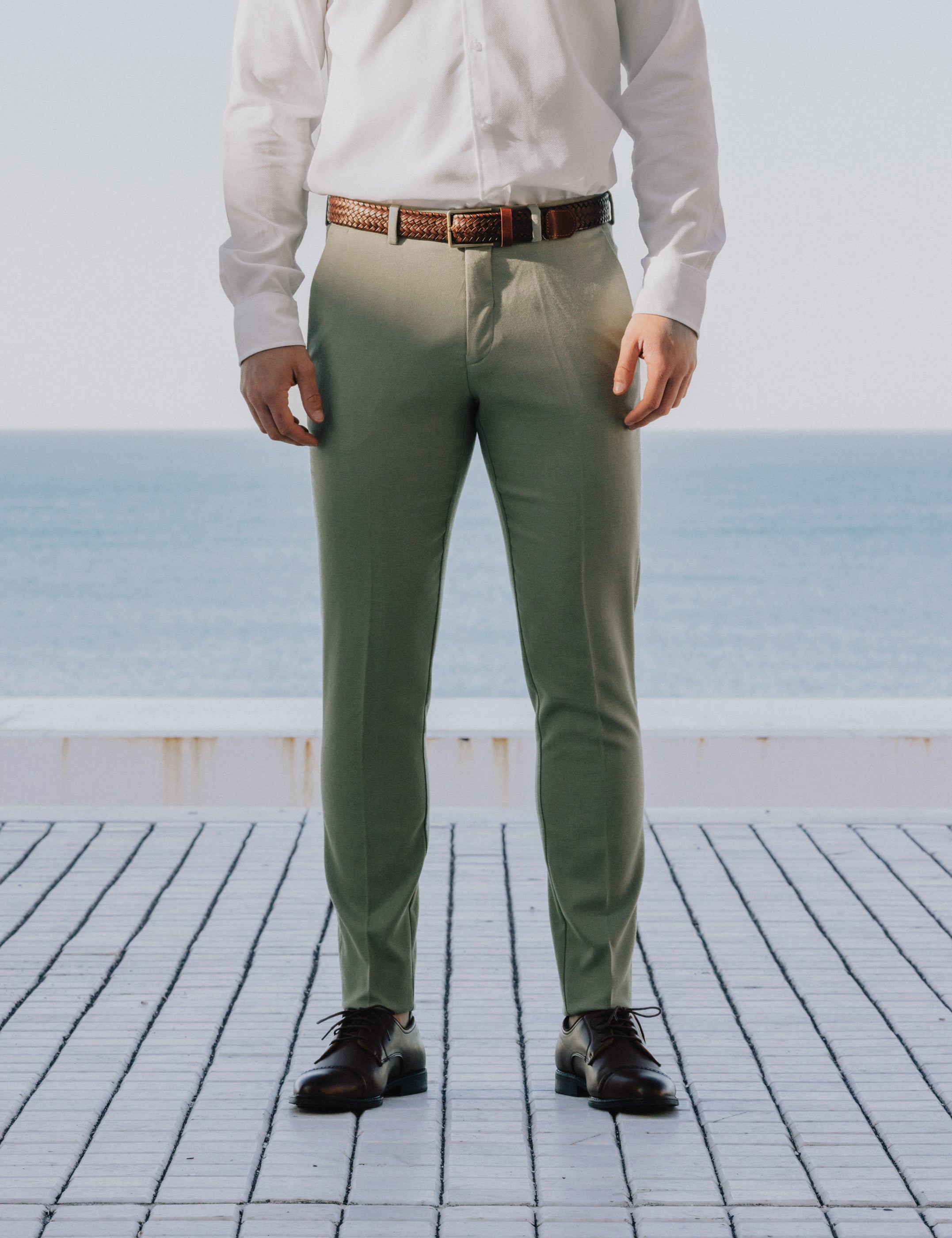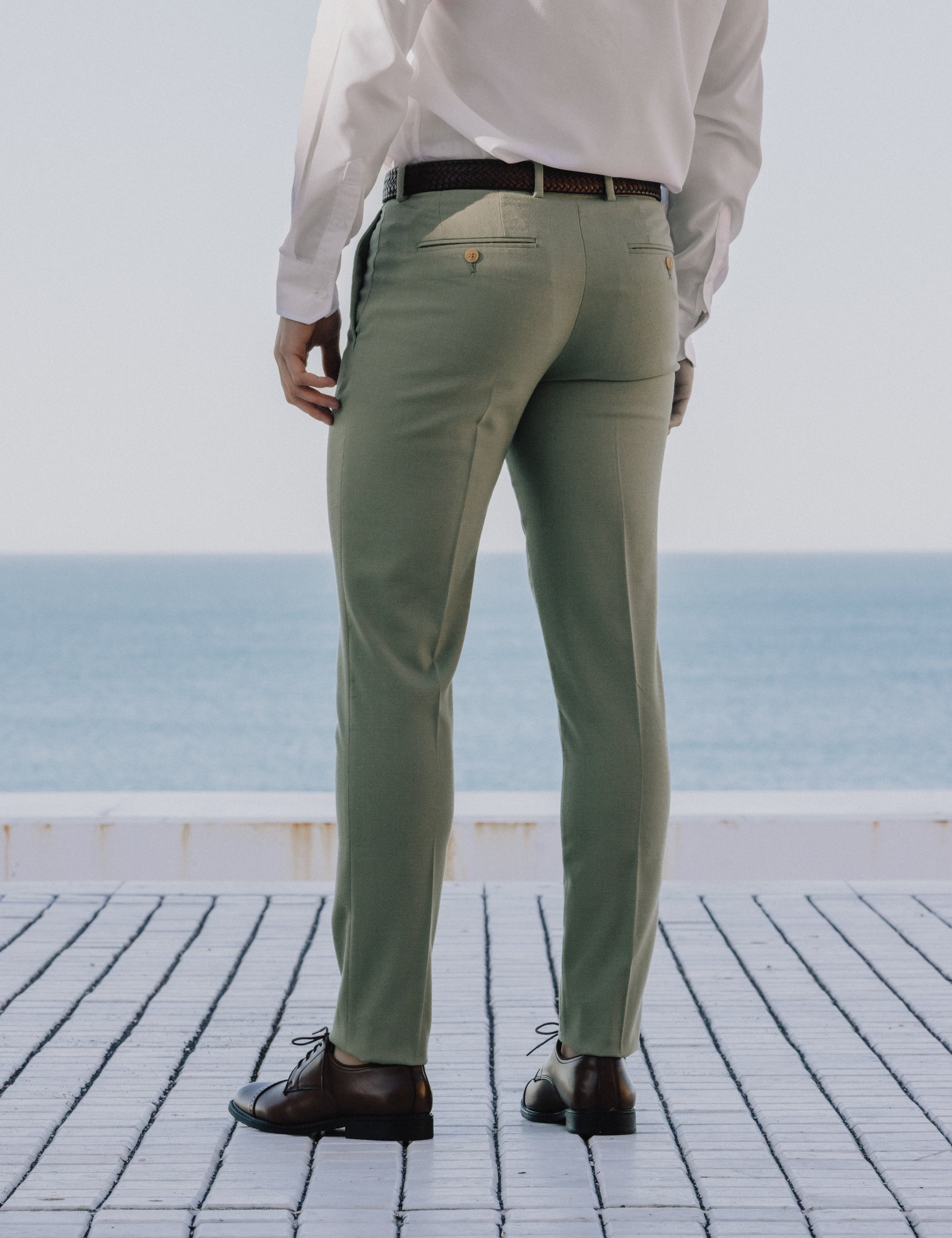 Pantalón de traje en color verde. Cierre frontal de cremallera y botones, dos bolsillos en la parte delantera y dos bolsillos traseros. Forrado en su interior