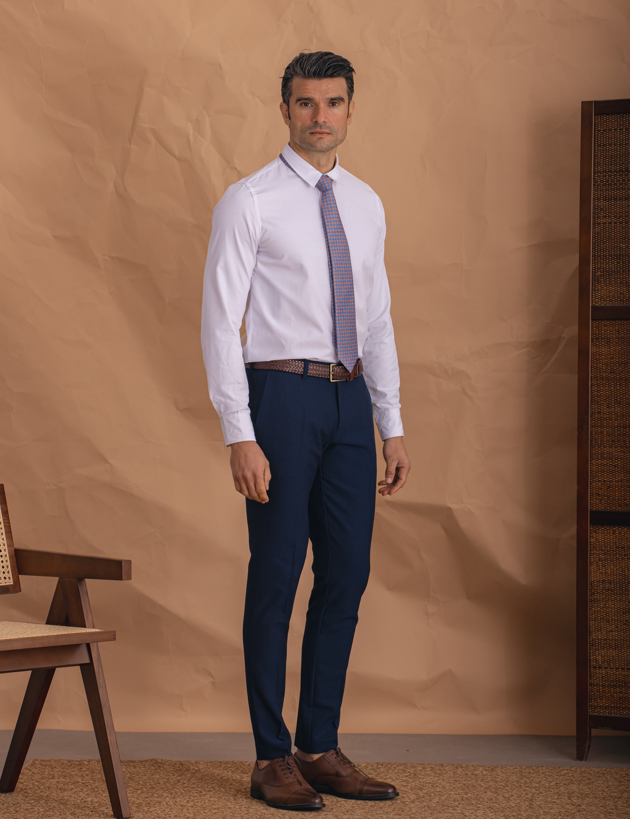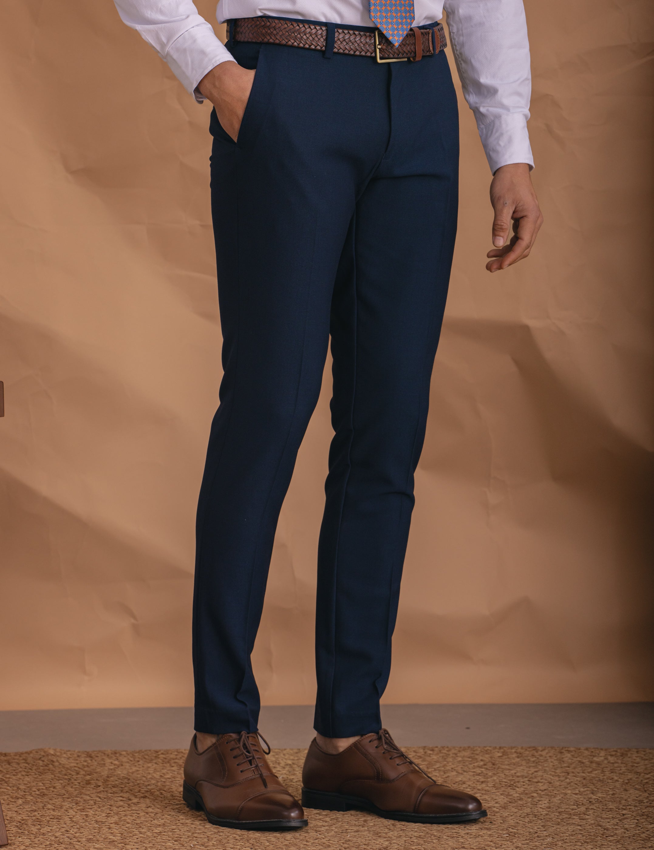 Pantalón azul de traje con estructura en su tejido. Cierre frontal de cremallera y botones, dos bolsillos en la parte delantera y dos bolsillos traseros con cierre mediante botón. Forrado en su interior.